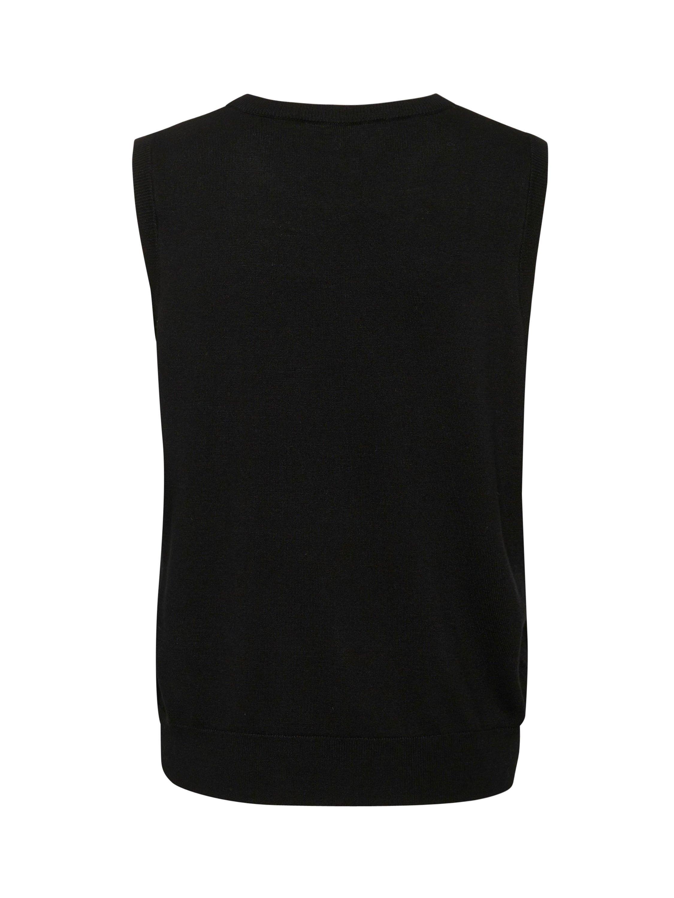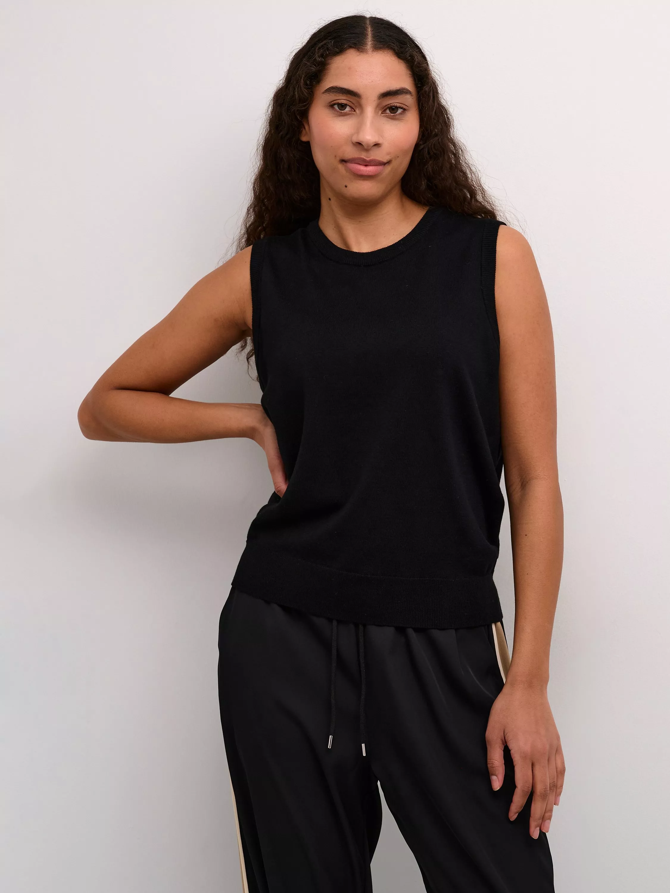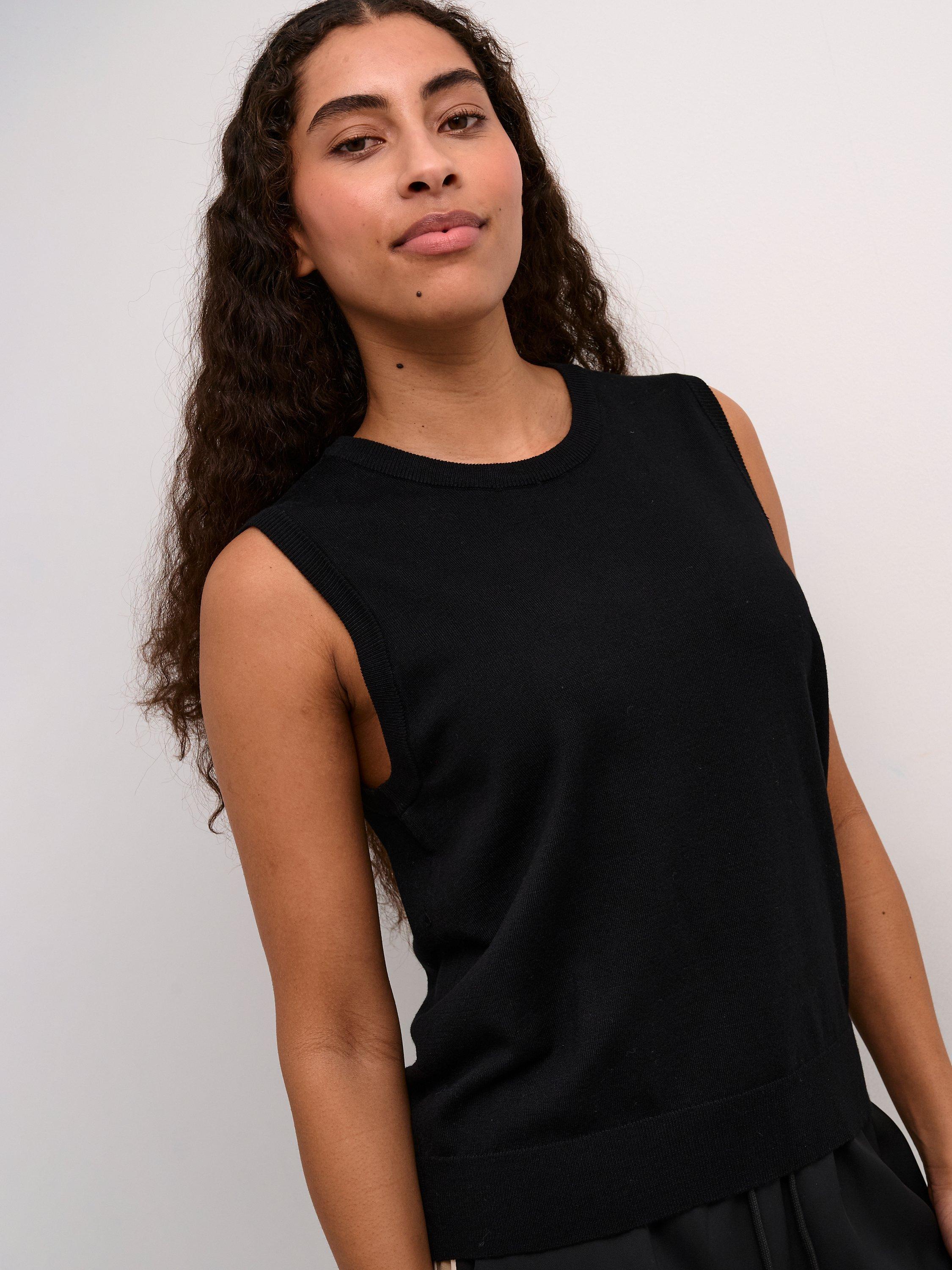 The lizza pullover is a simple and soft style, that will add a cosy touch to any outfit. It is sleeveless with a round neck, and it is made in a tight knit fabric. The pullover has a regular fit and is cut at the hips, and the edges are finished with a rib knit.