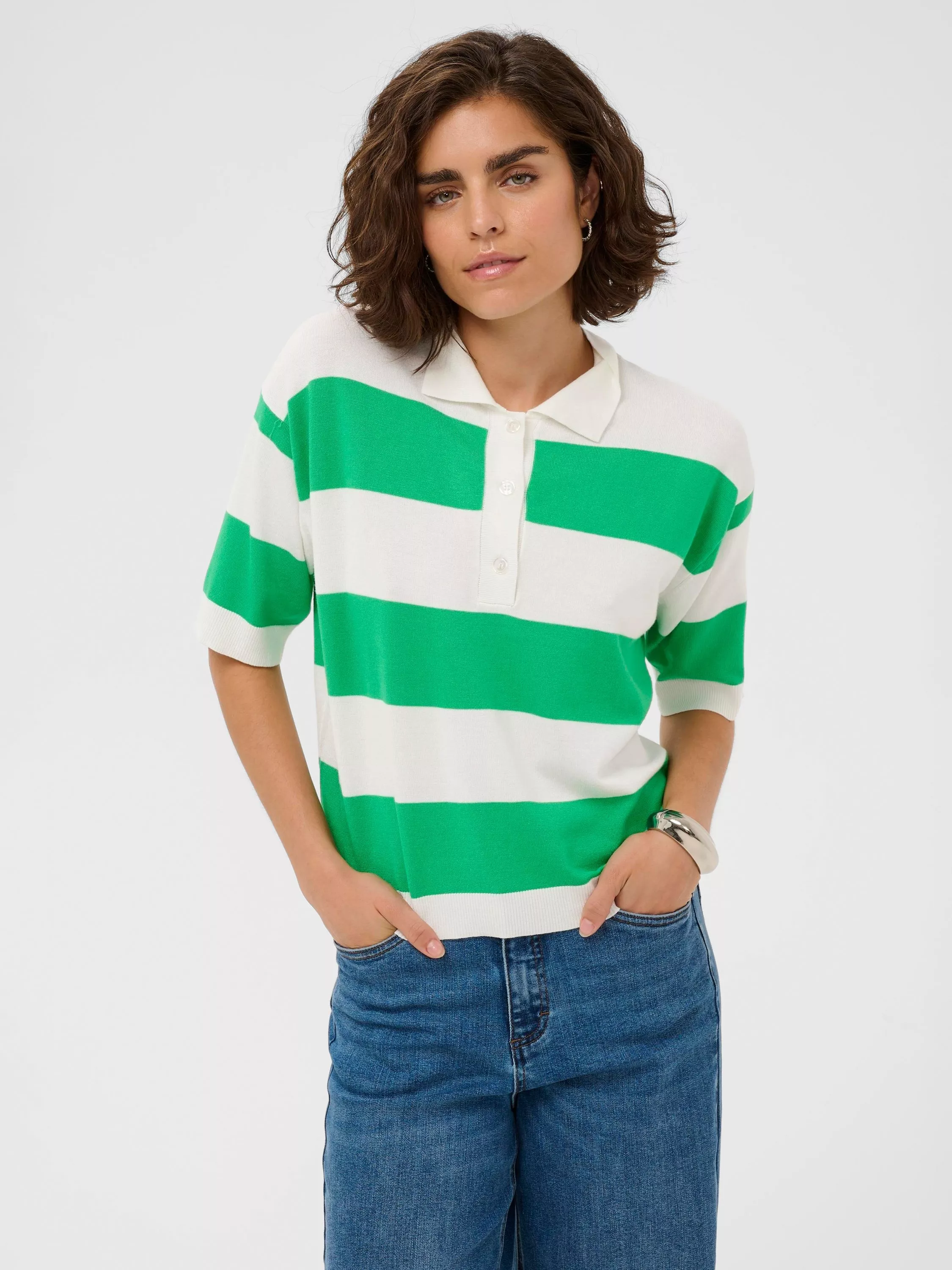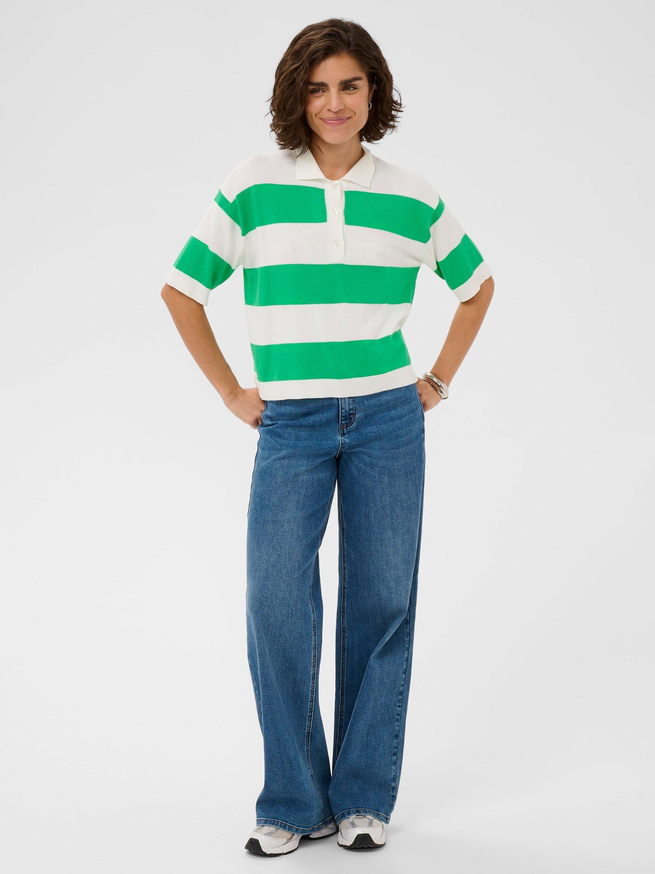 A sporty-inspired striped polo shirt, crafted in a breathable viscose blend. With a loose fit and button neck, it invites fresh style and relaxed comfort to any occasion.