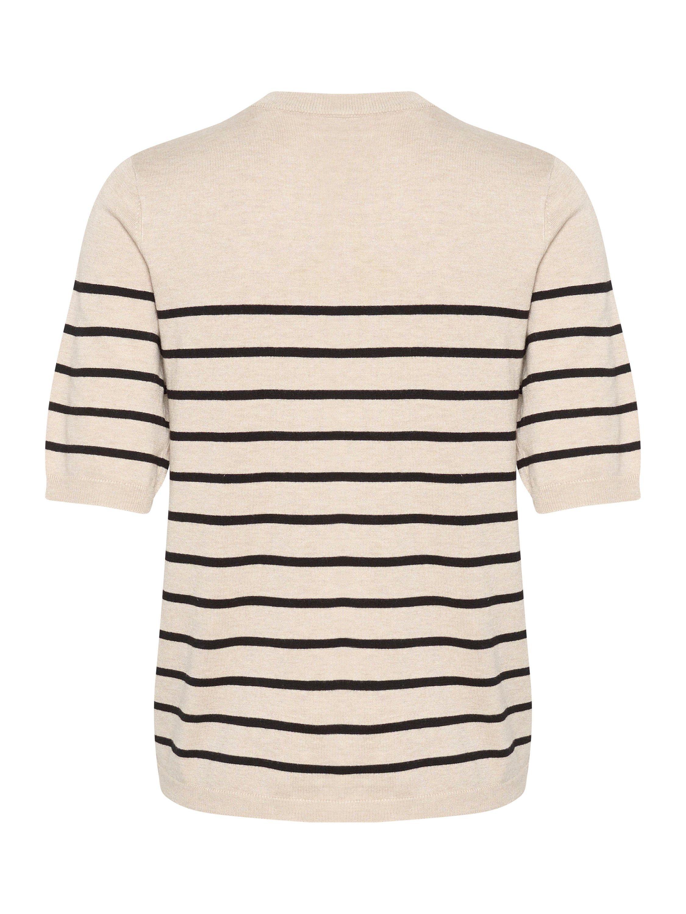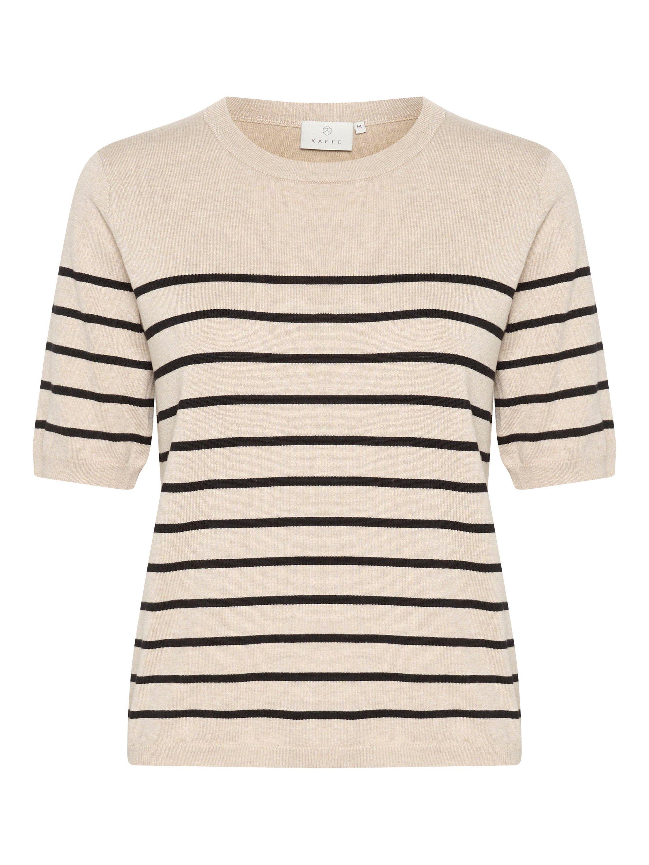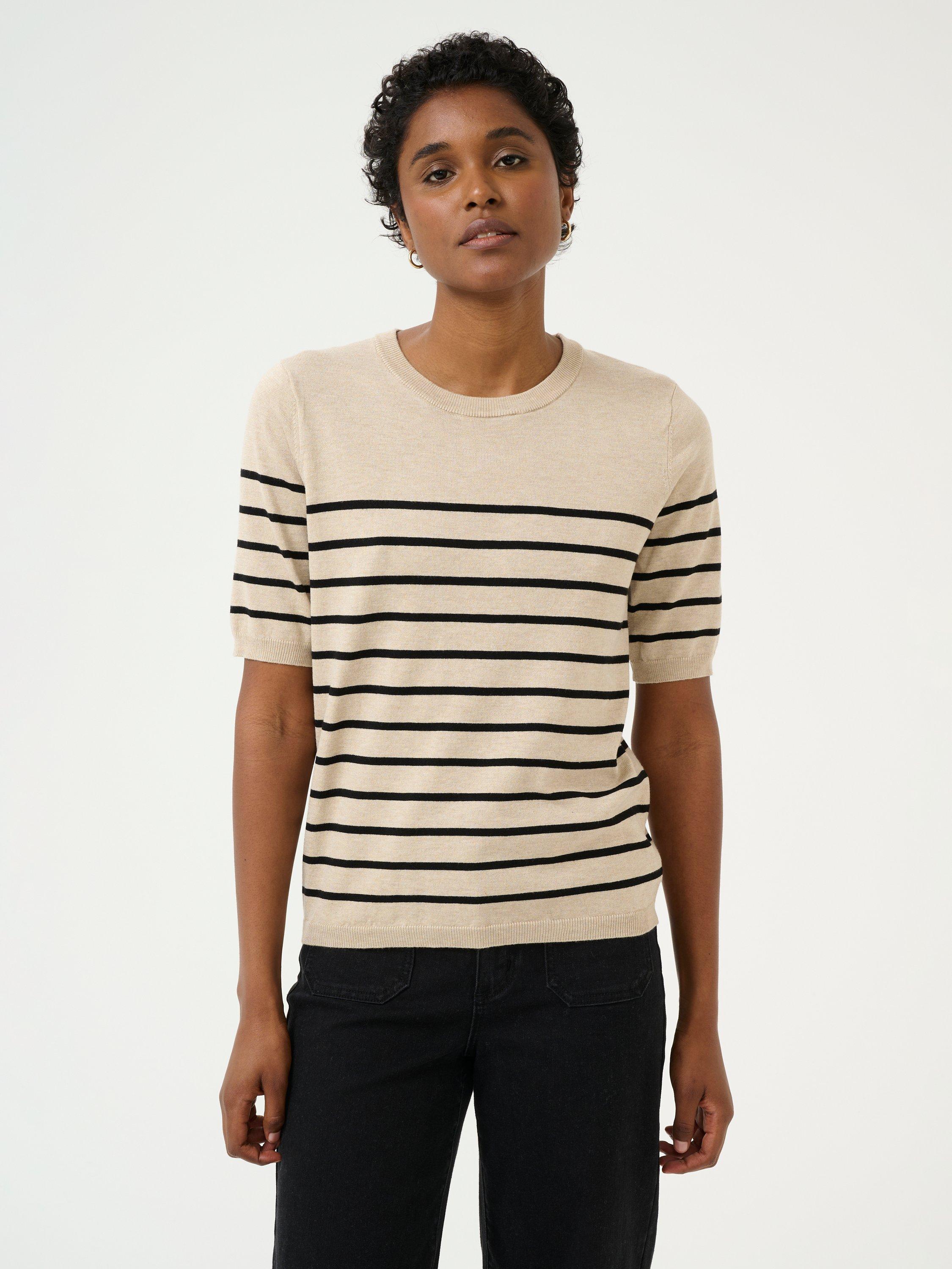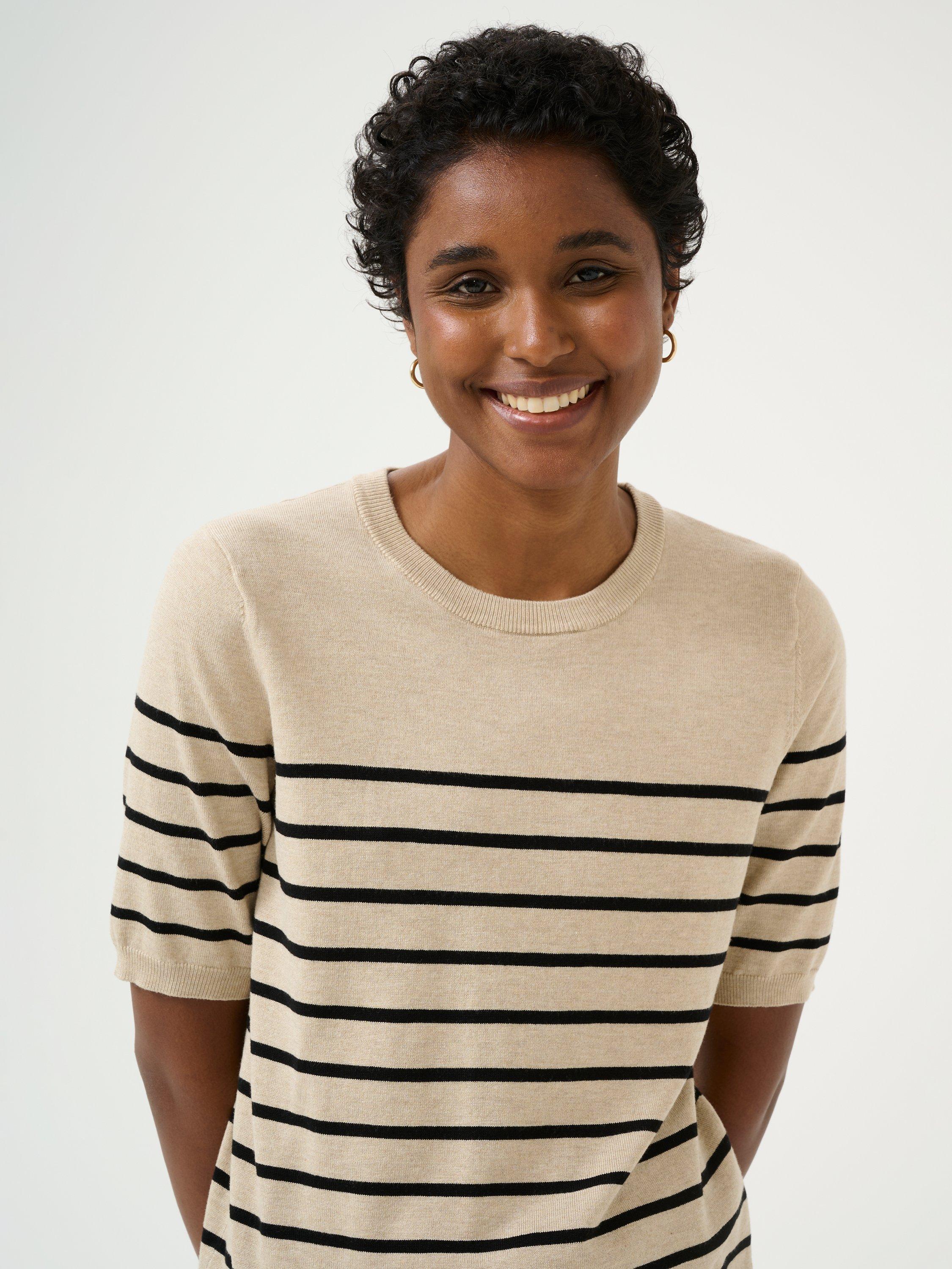 The lizza pullover is a cute everyday top with horizontal stripes. It has a crew neck and a regular fit, and all the edges are finished with a rib knit. The sleeves are cut above the elbows and they have a subtle volume. The pullover is made in a soft and tight knit, and it is cut at the hips.