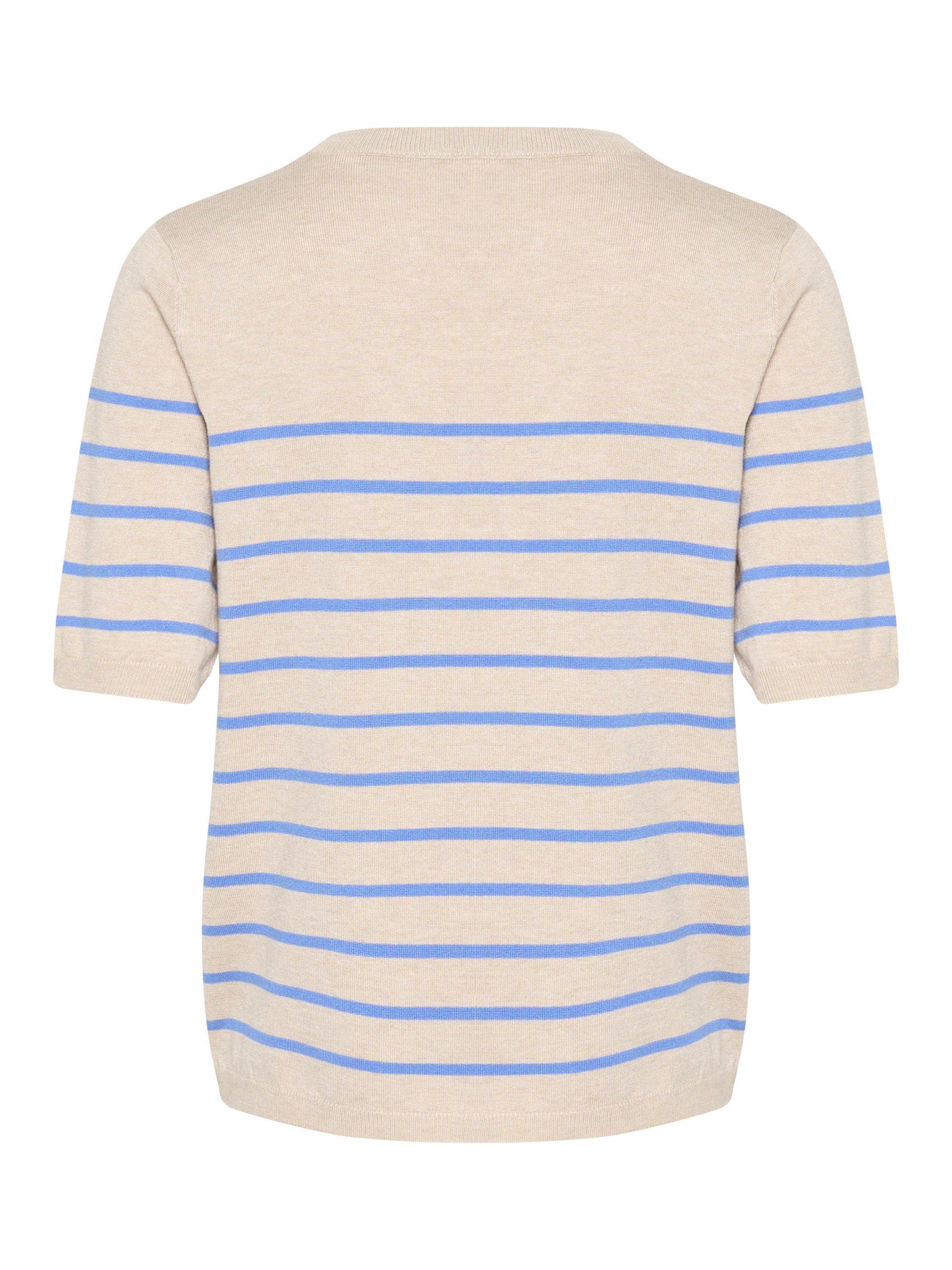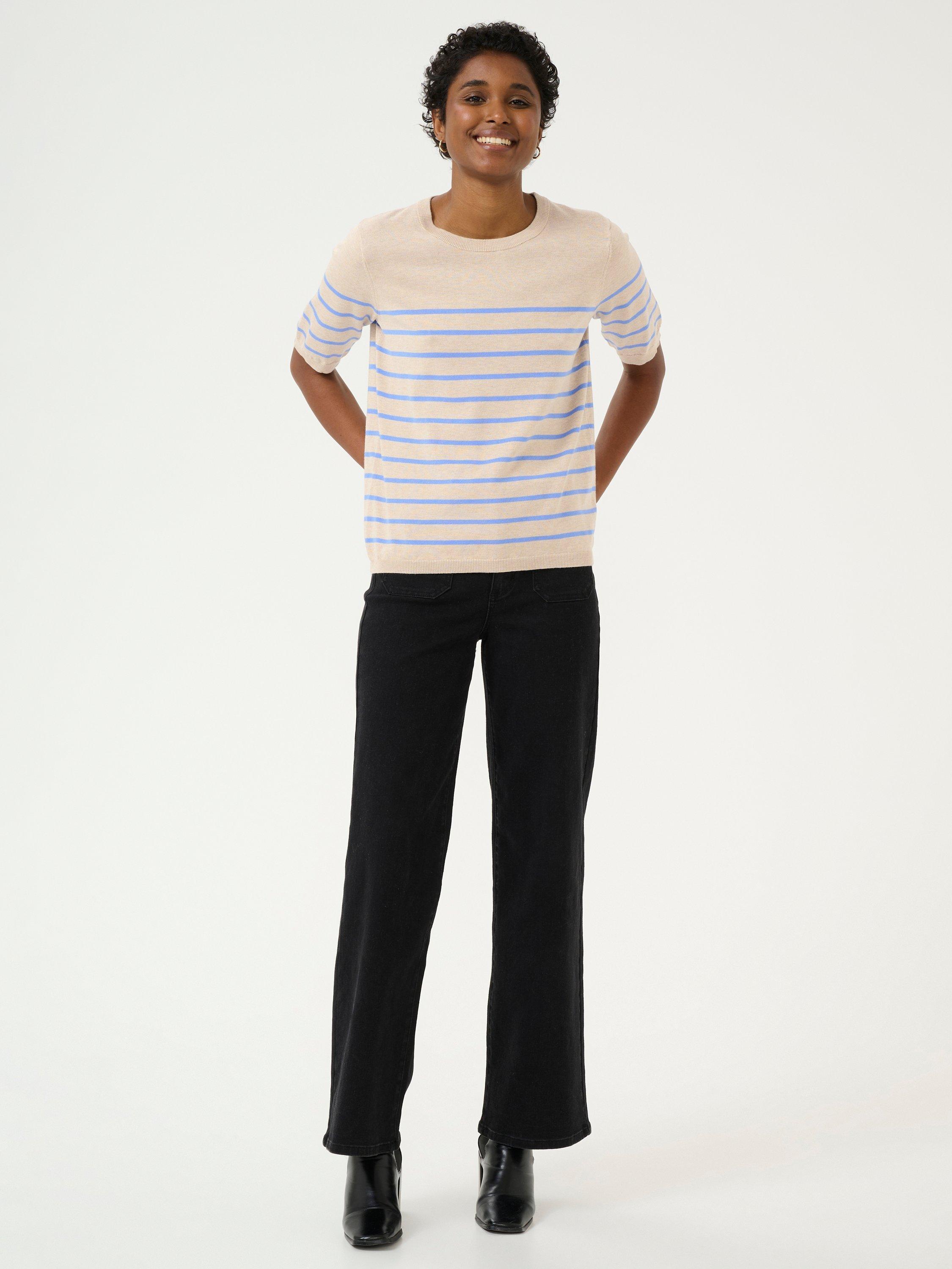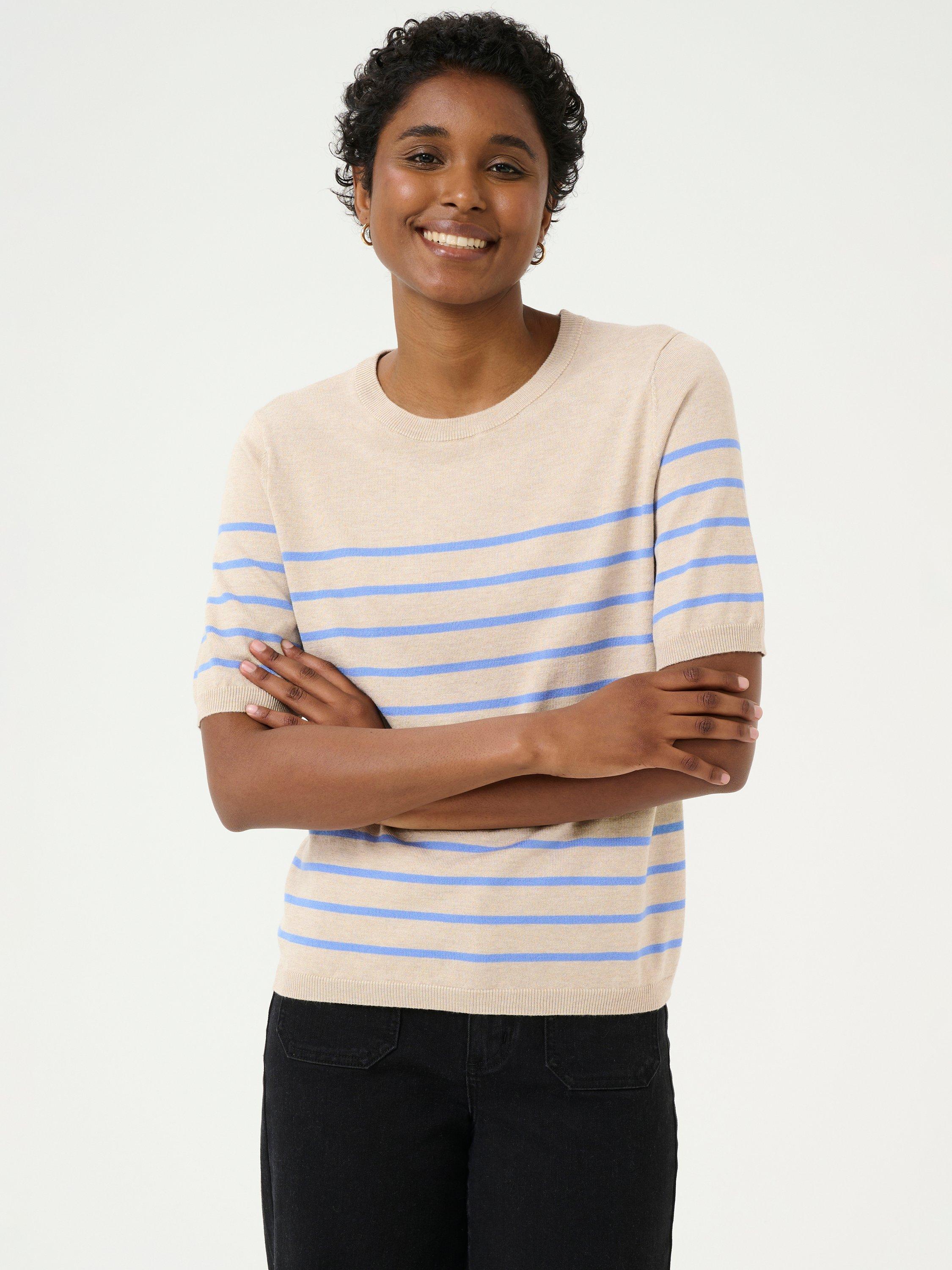 The Lizza pullover is a cute everyday top with horizontal stripes. It has a crew neck and a regular fit, and all the edges are finished with a rib knit. The sleeves are cut above the elbows and they have a subtle volume. The pullover is made in a soft and tight knit, and it is cut at the hips.