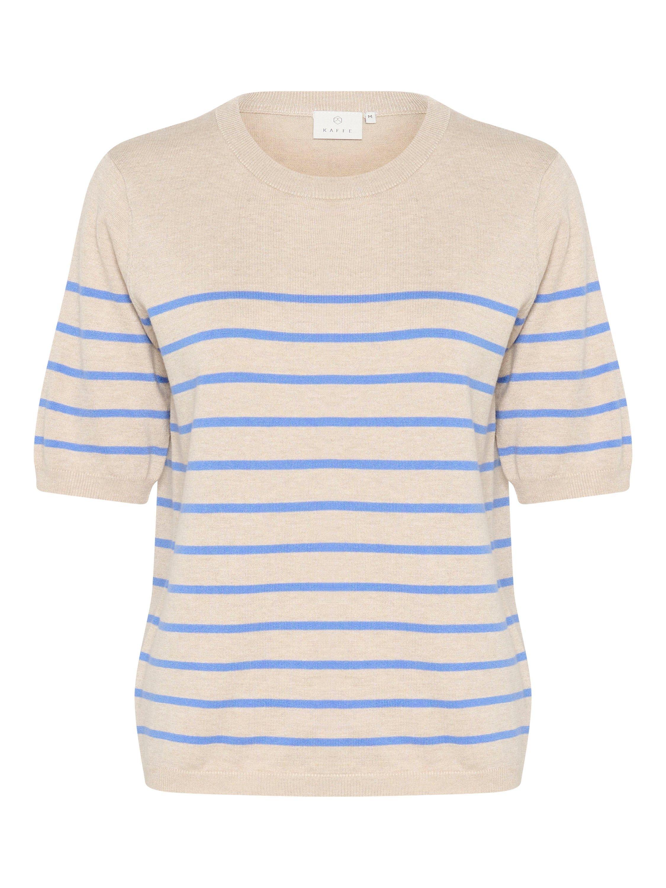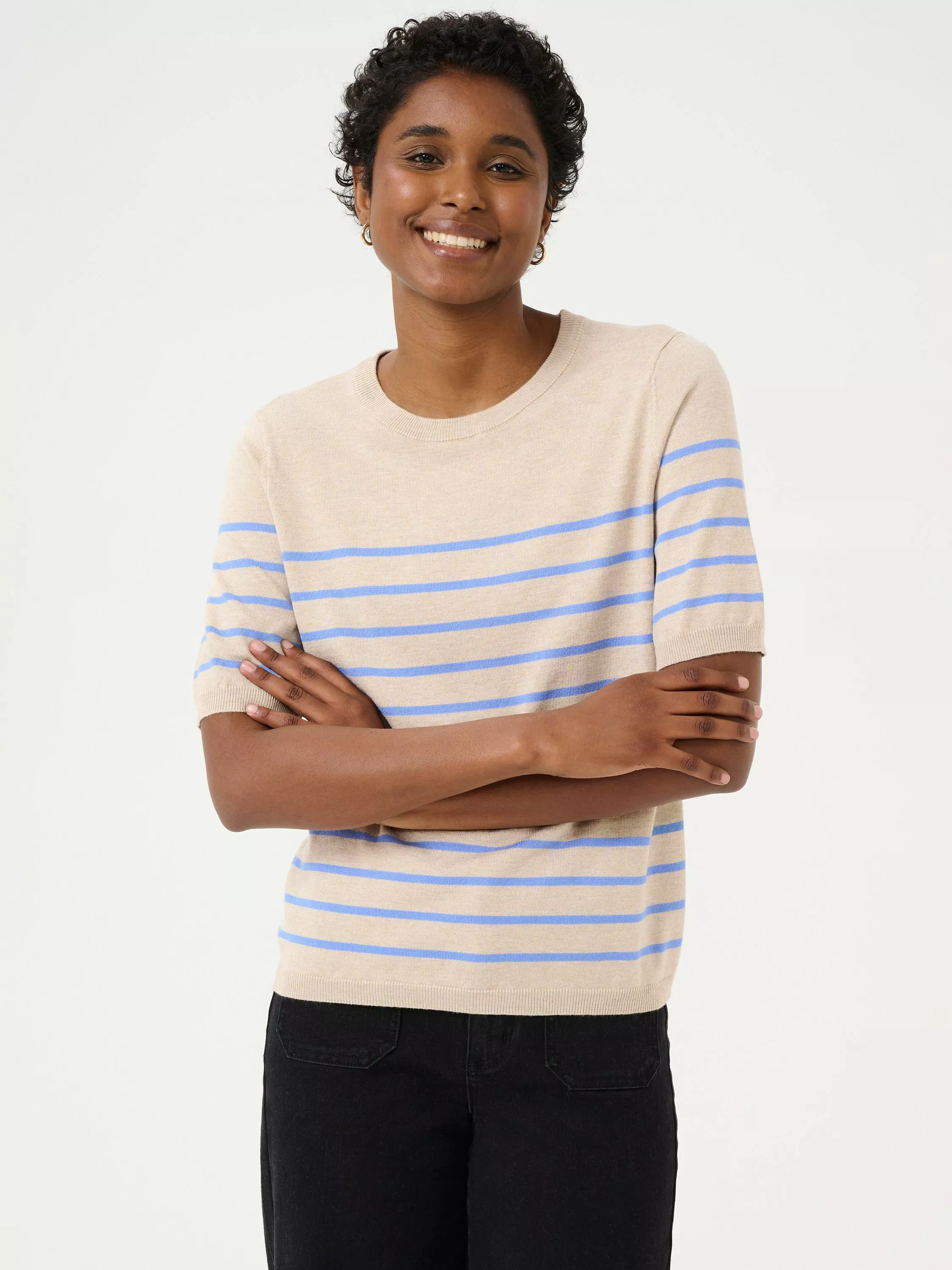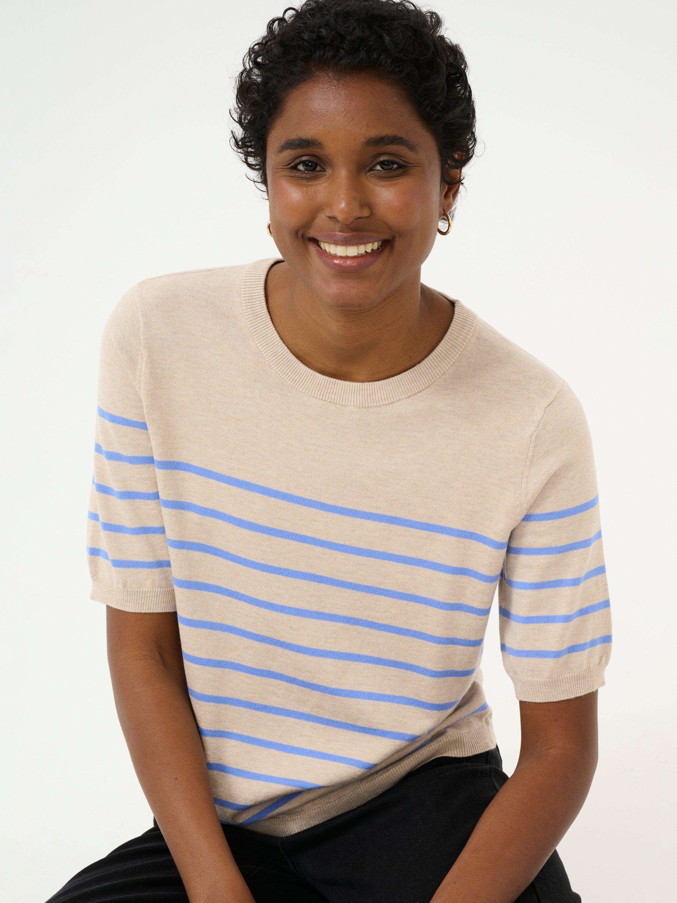 The Lizza pullover is a cute everyday top with horizontal stripes. It has a crew neck and a regular fit, and all the edges are finished with a rib knit. The sleeves are cut above the elbows and they have a subtle volume. The pullover is made in a soft and tight knit, and it is cut at the hips.