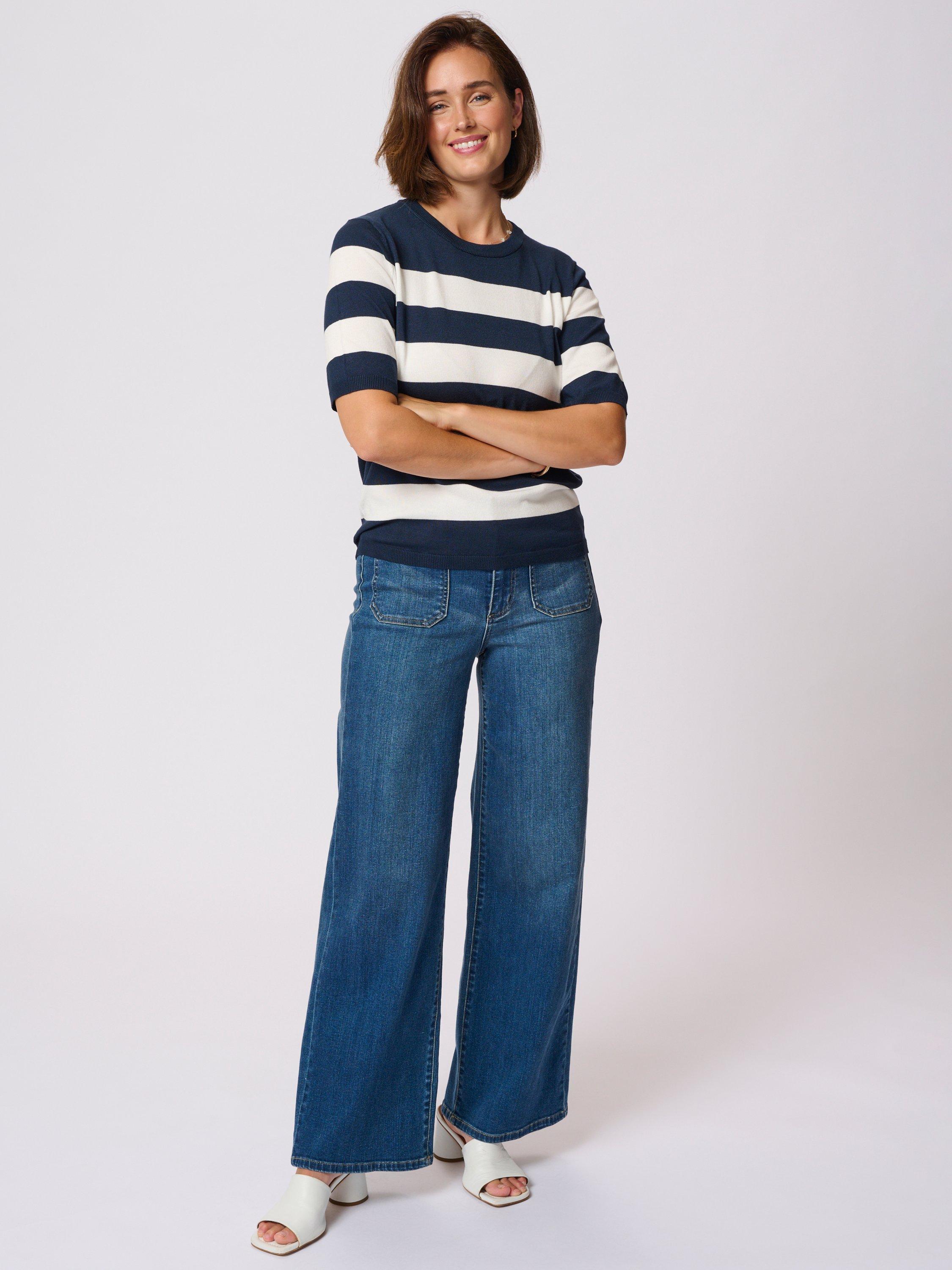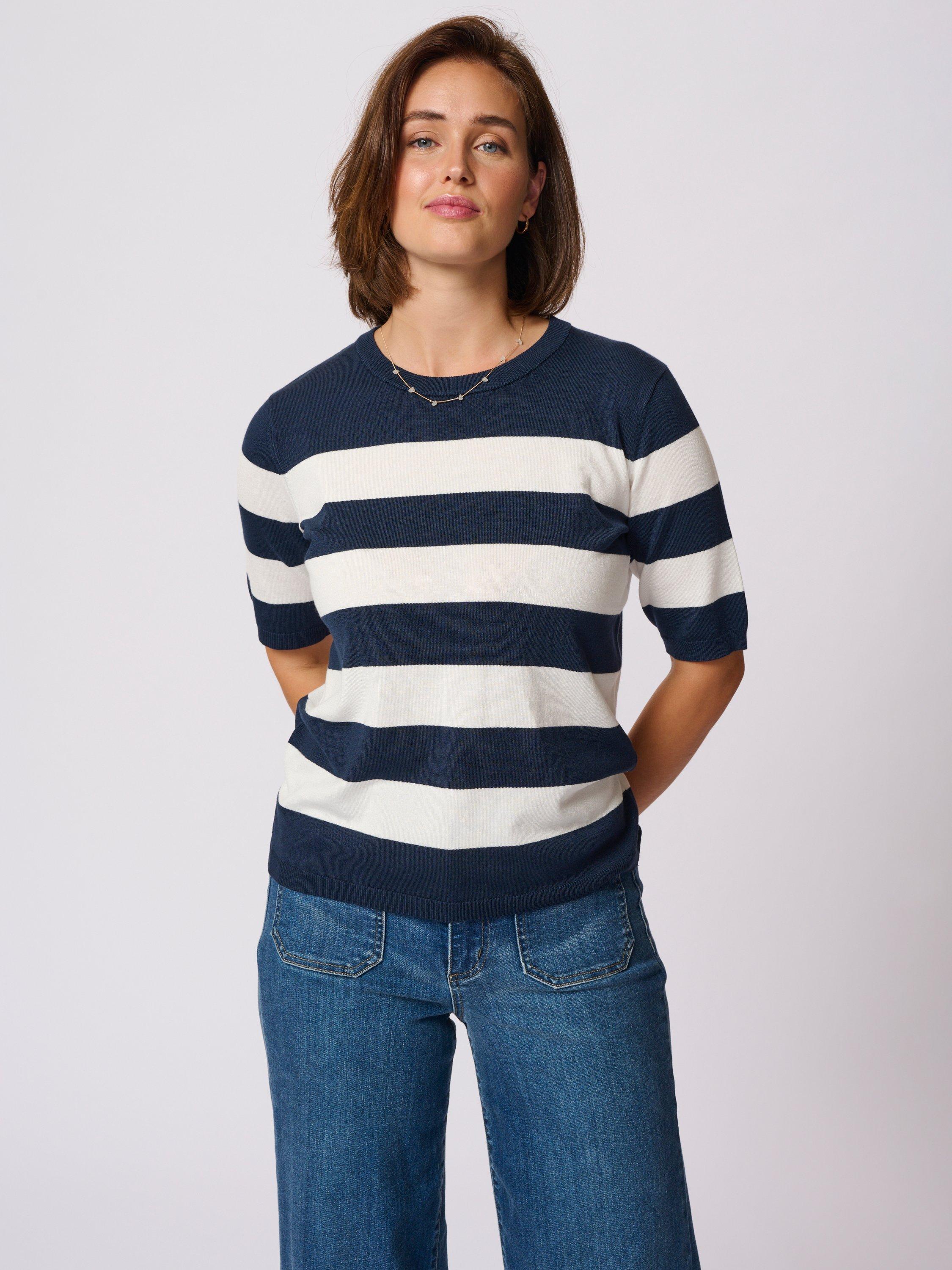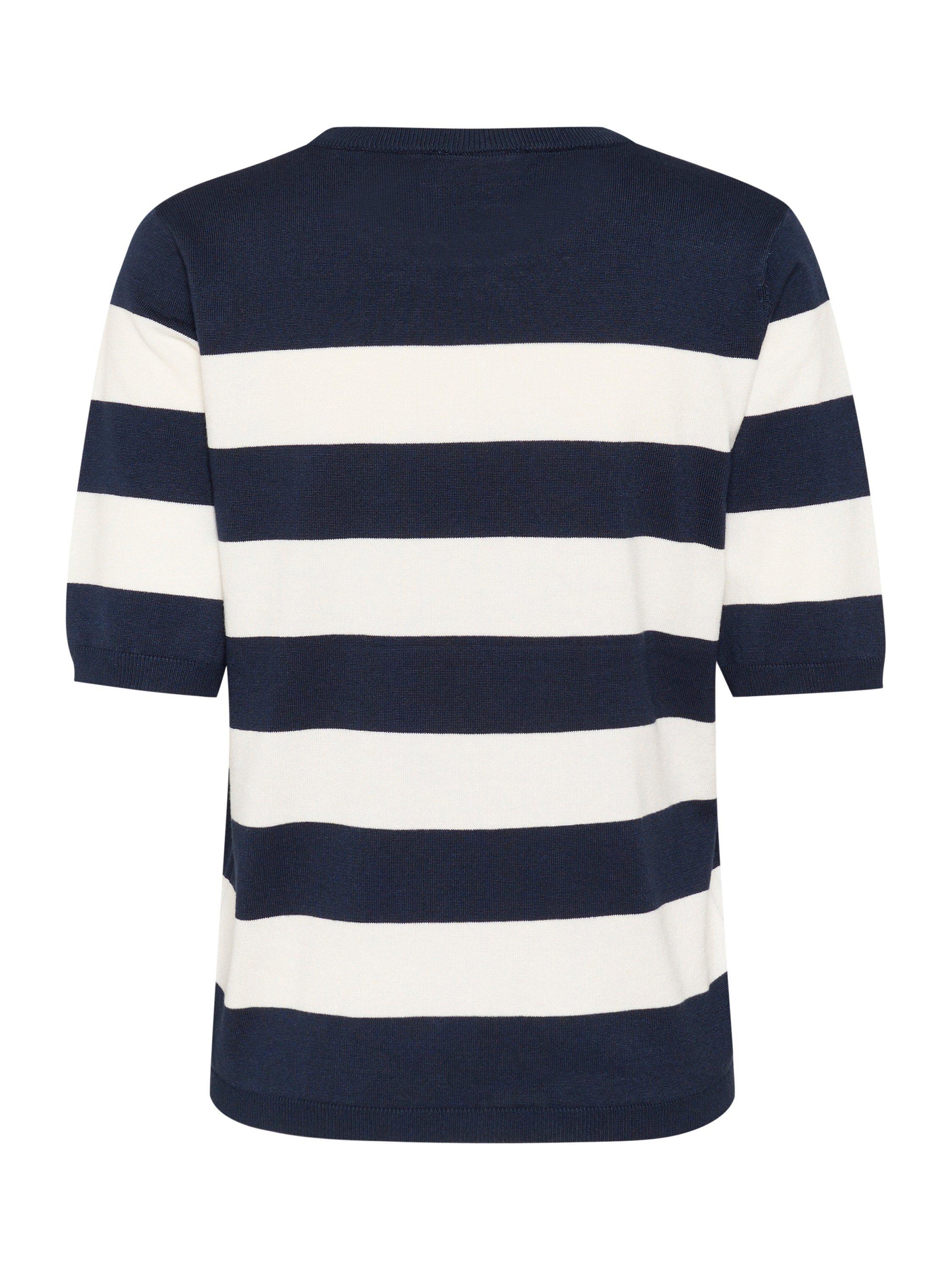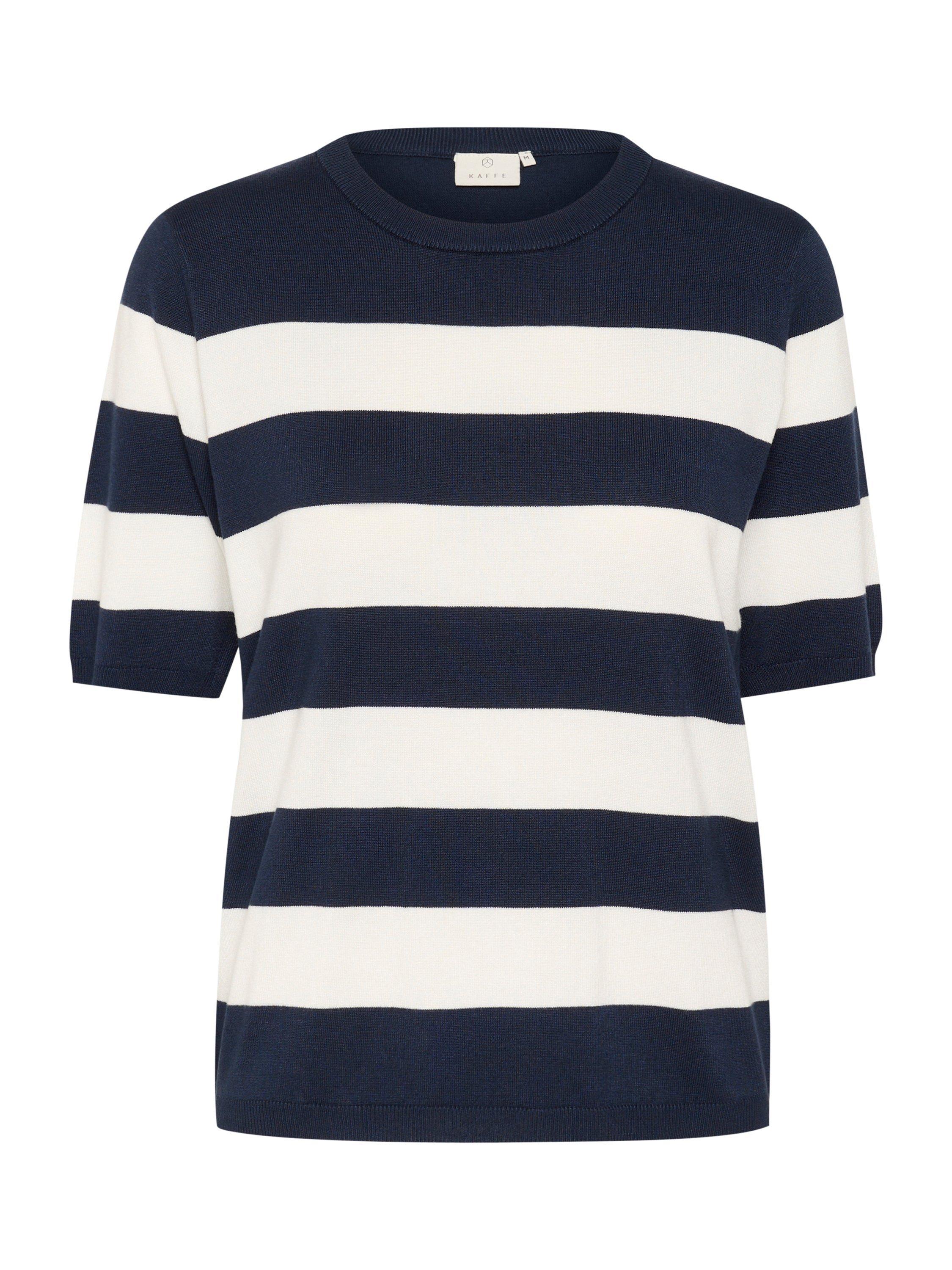 The lizza pullover is a cute everyday top with horizontal stripes. It has a crew neck and a regular fit, and all the edges are finished with a rib knit. The sleeves are cut above the elbows and they have a subtle volume. The pullover is made in a soft and tight knit, and it is cut at the hips.