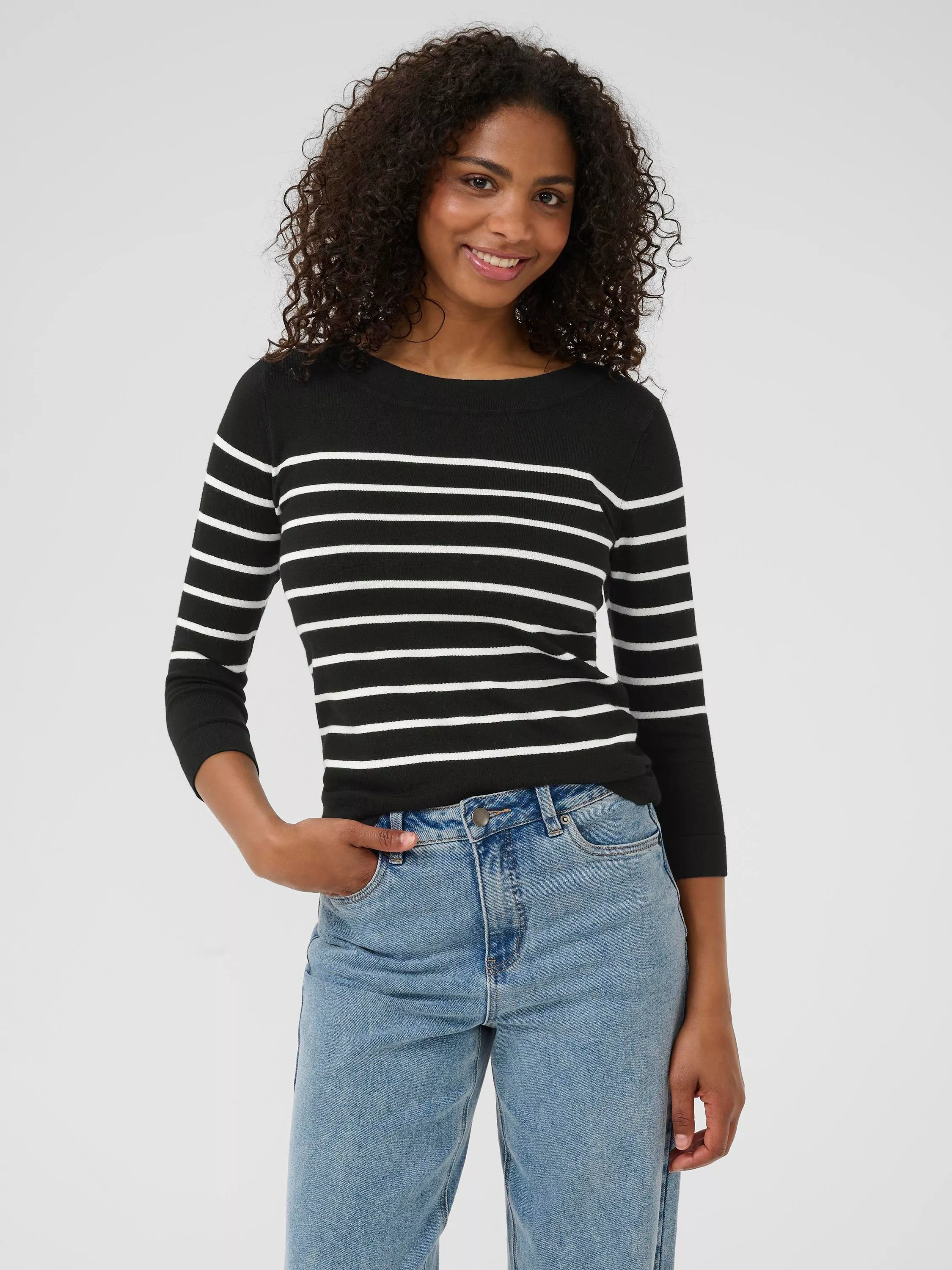 This KAFFE jumper pairs three quarter sleeves with a boat neckline and bold stripes, blending comfort and style for your day.