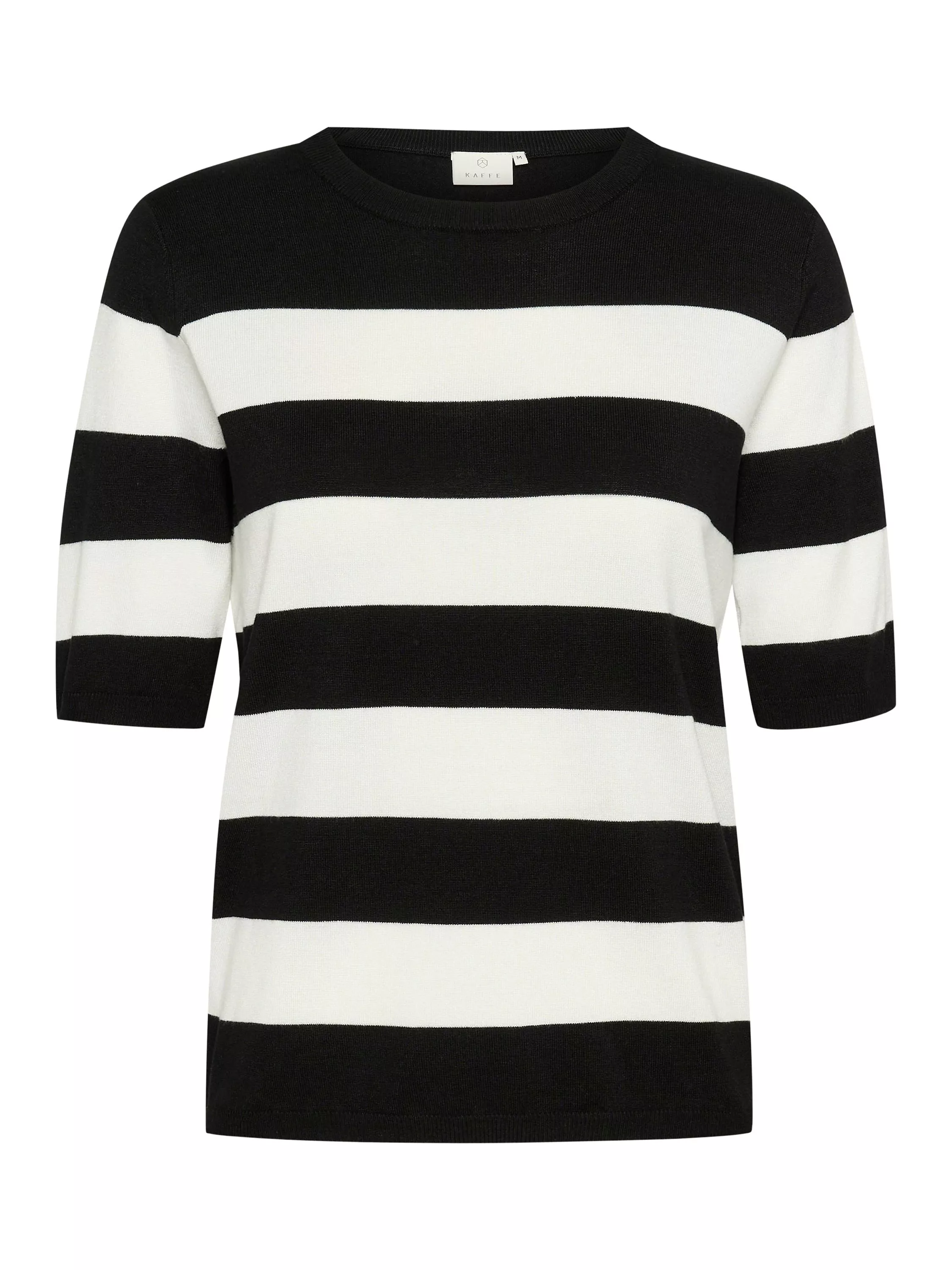 The lizza pullover is a cute everyday top with horizontal stripes. It has a crew neck and a regular fit, and all the edges are finished with a rib knit. The sleeves are cut above the elbows and they have a subtle volume. The pullover is made in a soft and tight knit and it is cut at the hips.