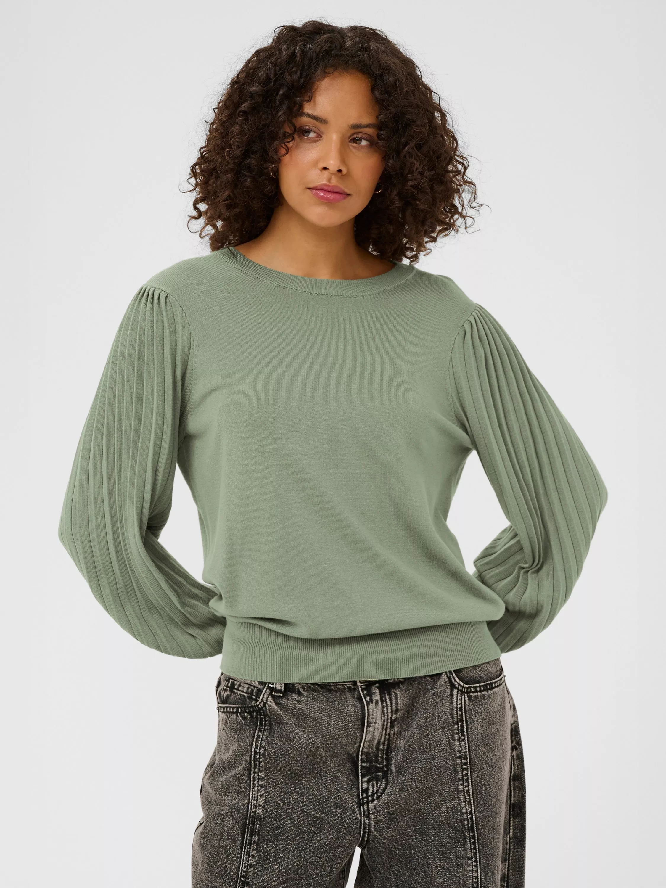 The Lone pullover is a beautiful, knitted pullover that will instantly elevate your look. It has long and voluminous bishop sleeves that are made in a pleated knit fabric. The pullover has a casual fit, and both the sleeves and the body are gathered in a knitted rib edge.