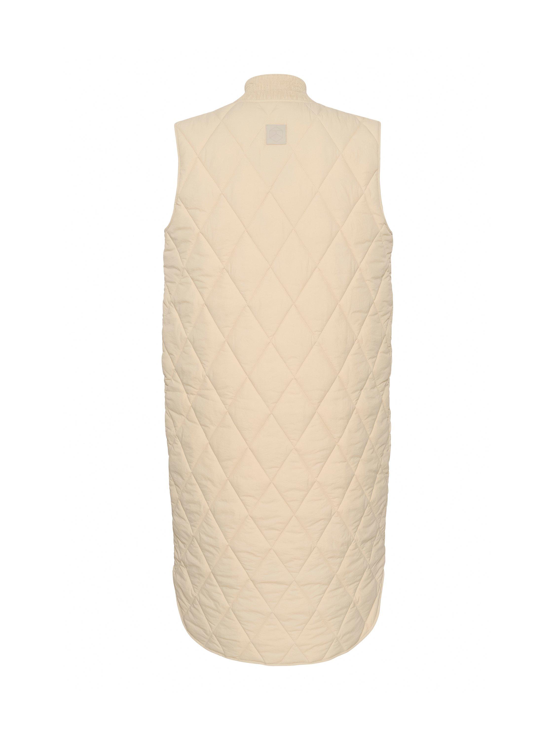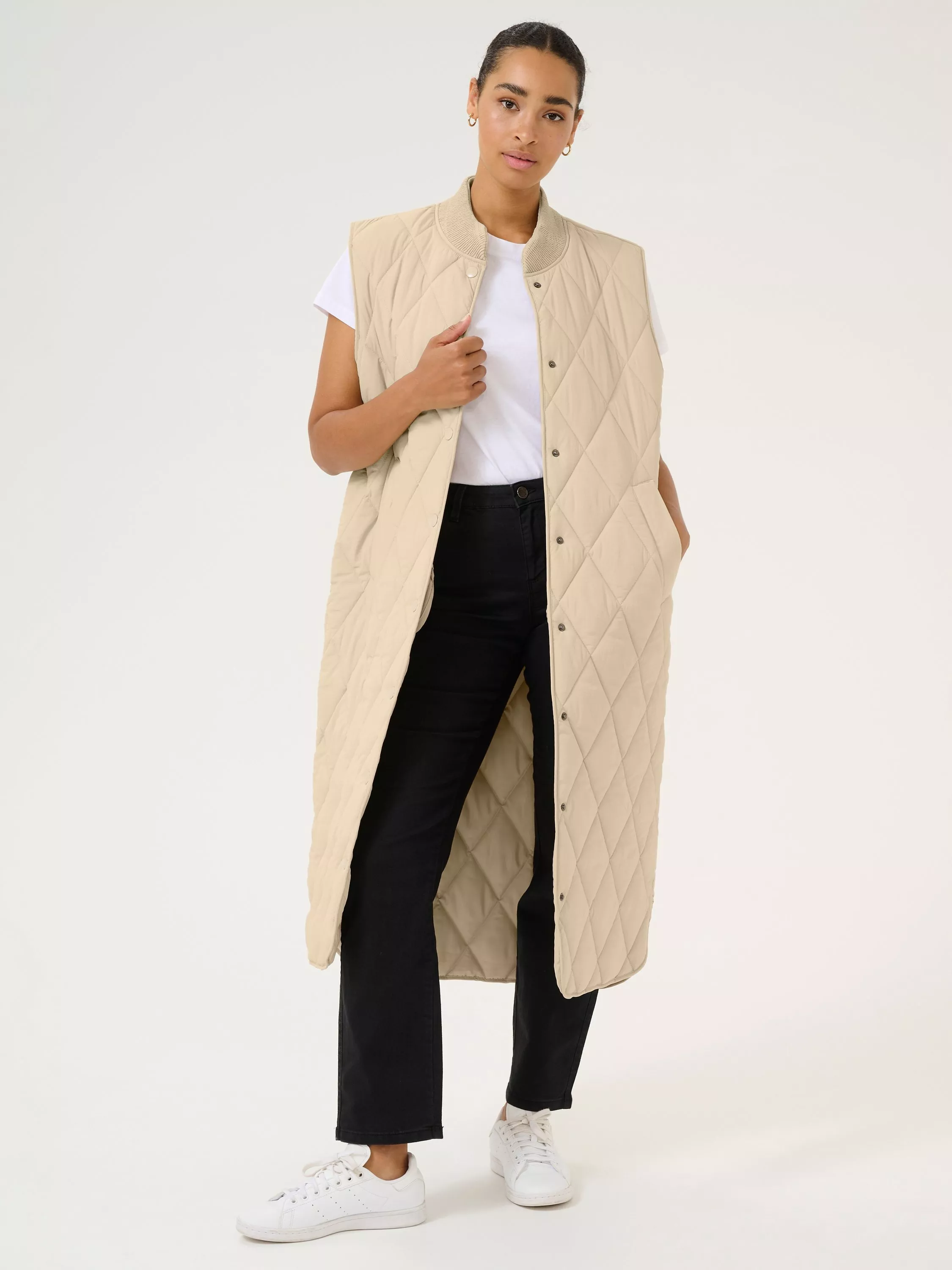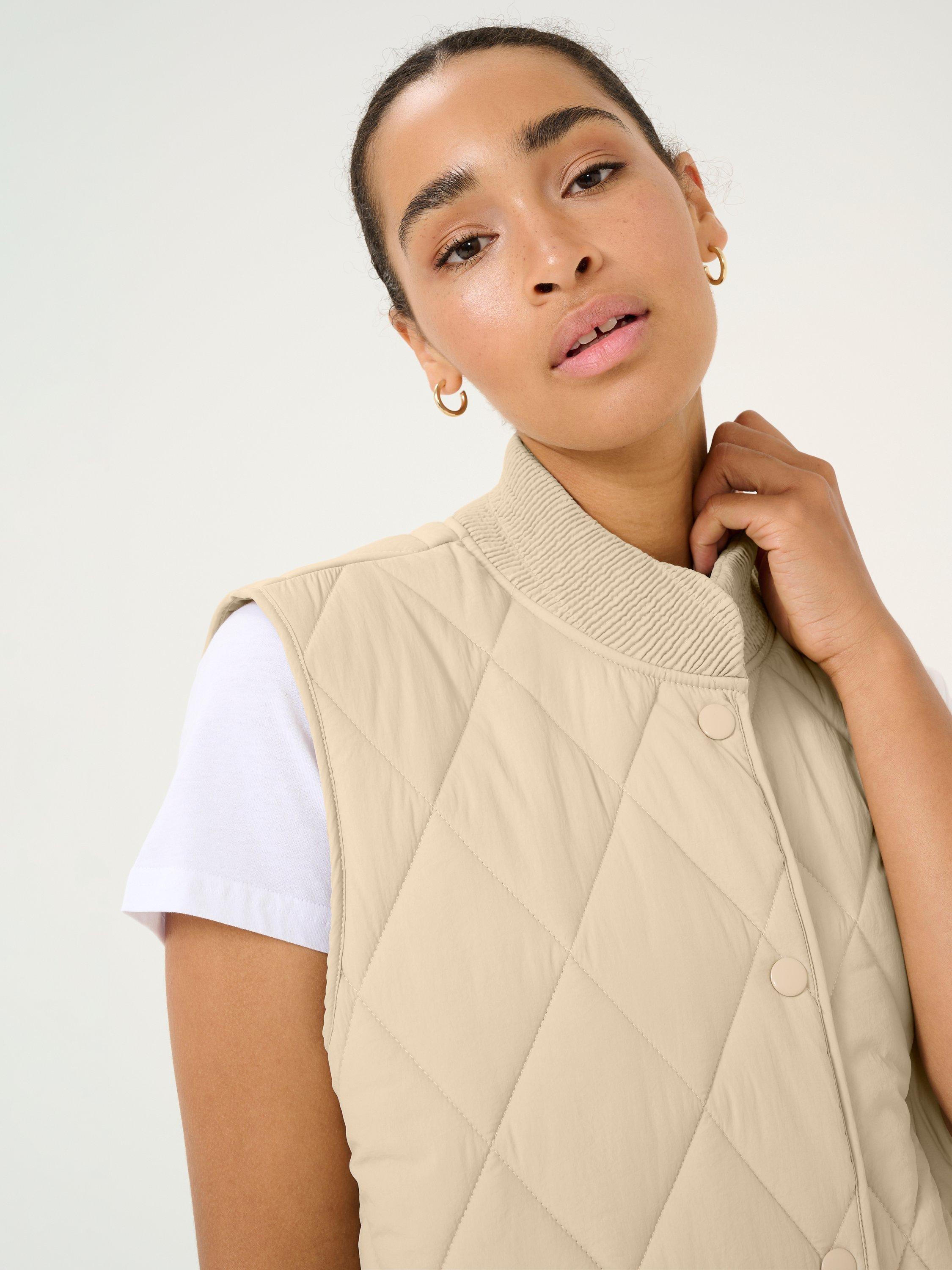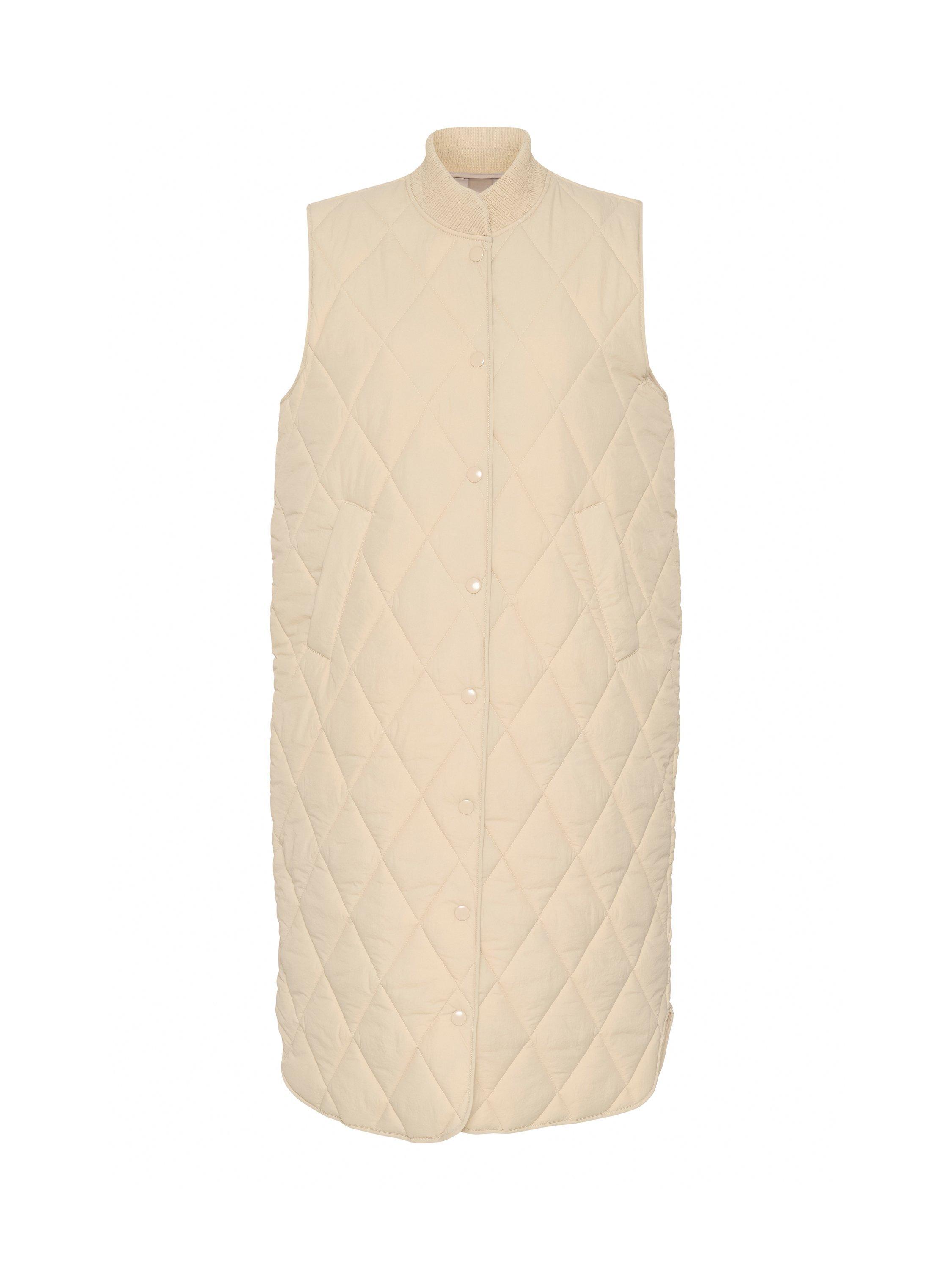 The lorena gilet is a cool and casual style, and it is the perfect choice if you need an extra layer for your outfit. It has a rib collar and buttons all down the front, and it is quilted in a diamond shaped pattern. The gilet has a regular fit and comes down to the mid-calves, and it has slanted front pockets.