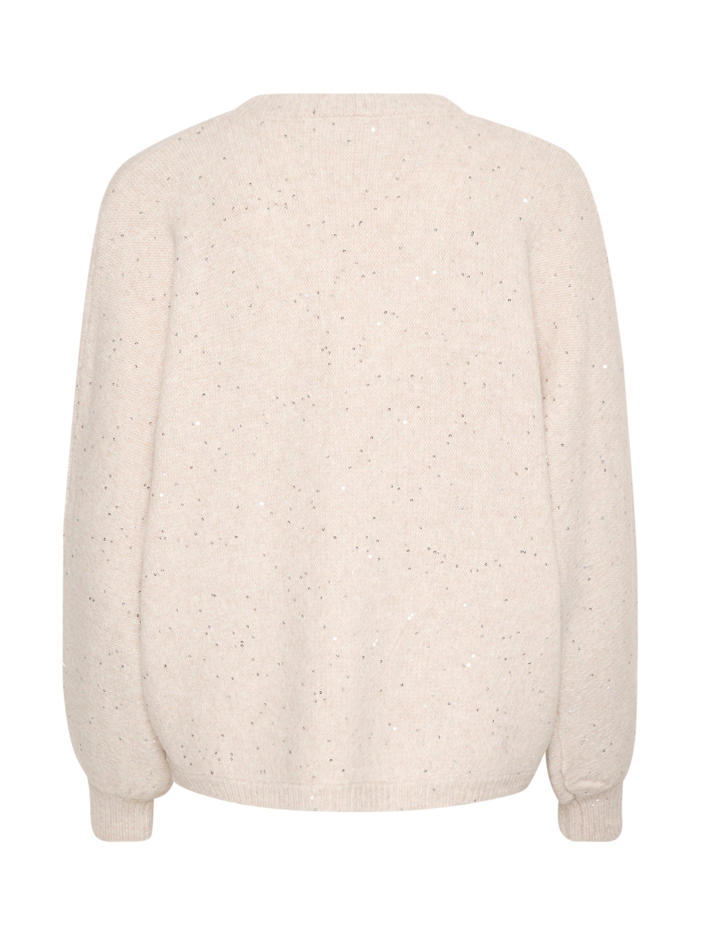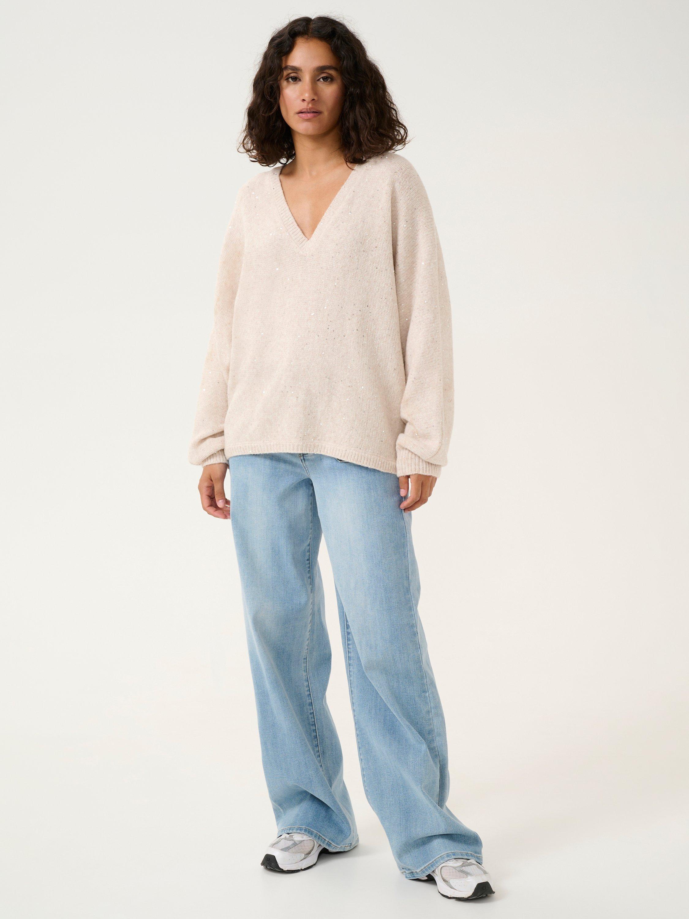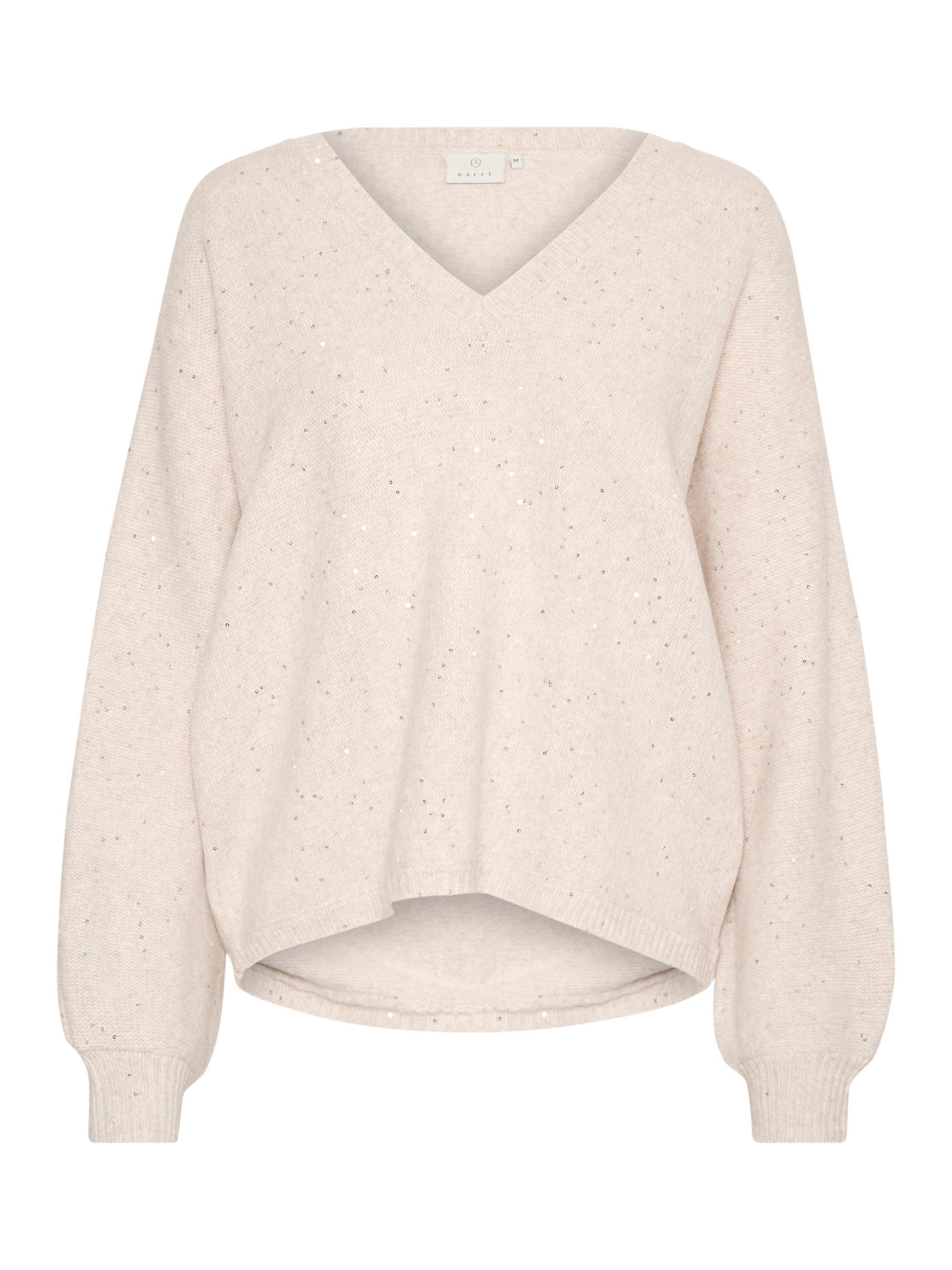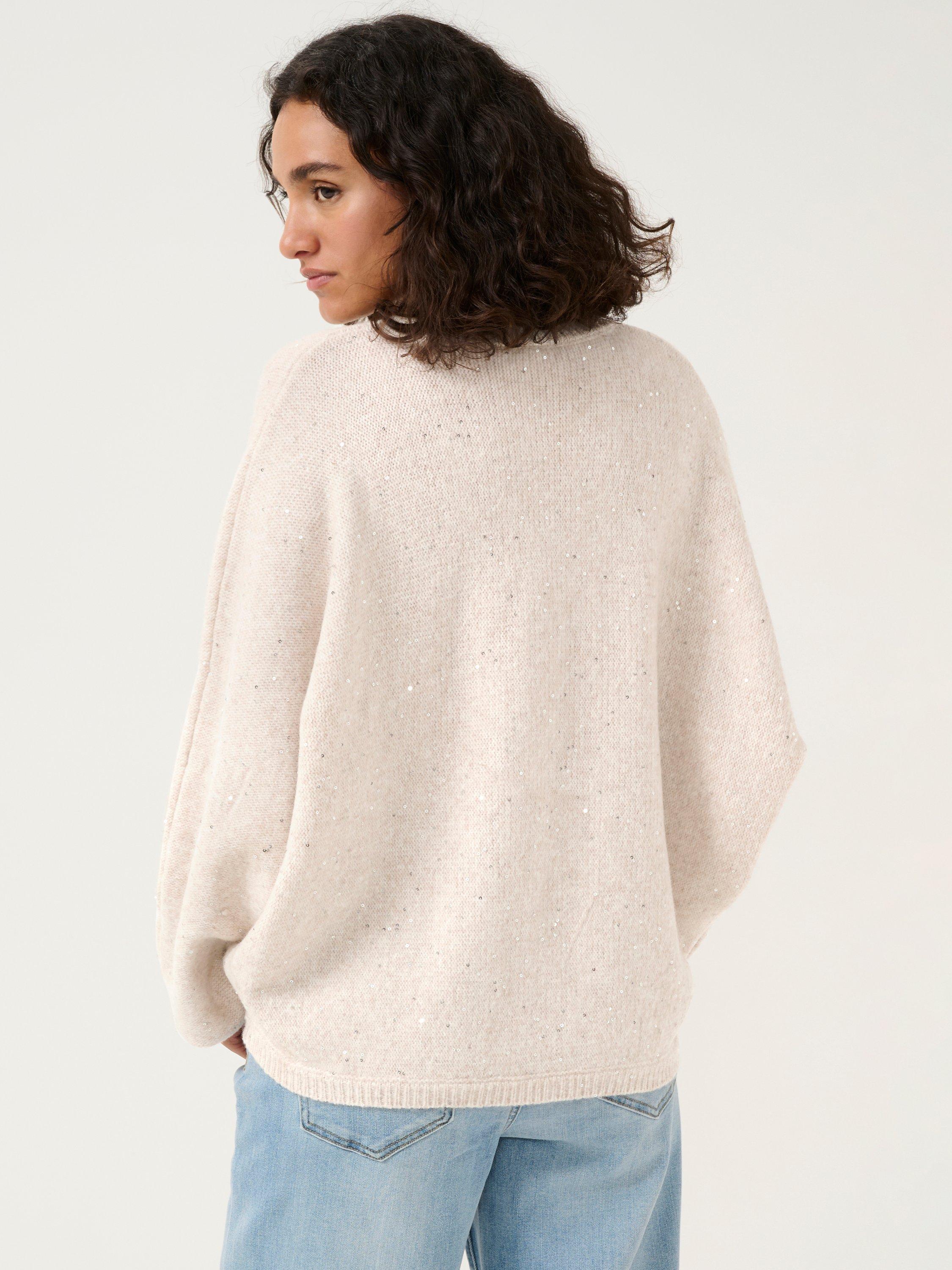 The lue pullover is a soft and feminine style - the perfect way to brigthen up your outfit this season. It has a V-neck and a loose fit, and it has sparkly sequins sprinkled all over. The sleeves are long and loose-fitting batwing sleeves, and all the edges are finished in a rib knit.