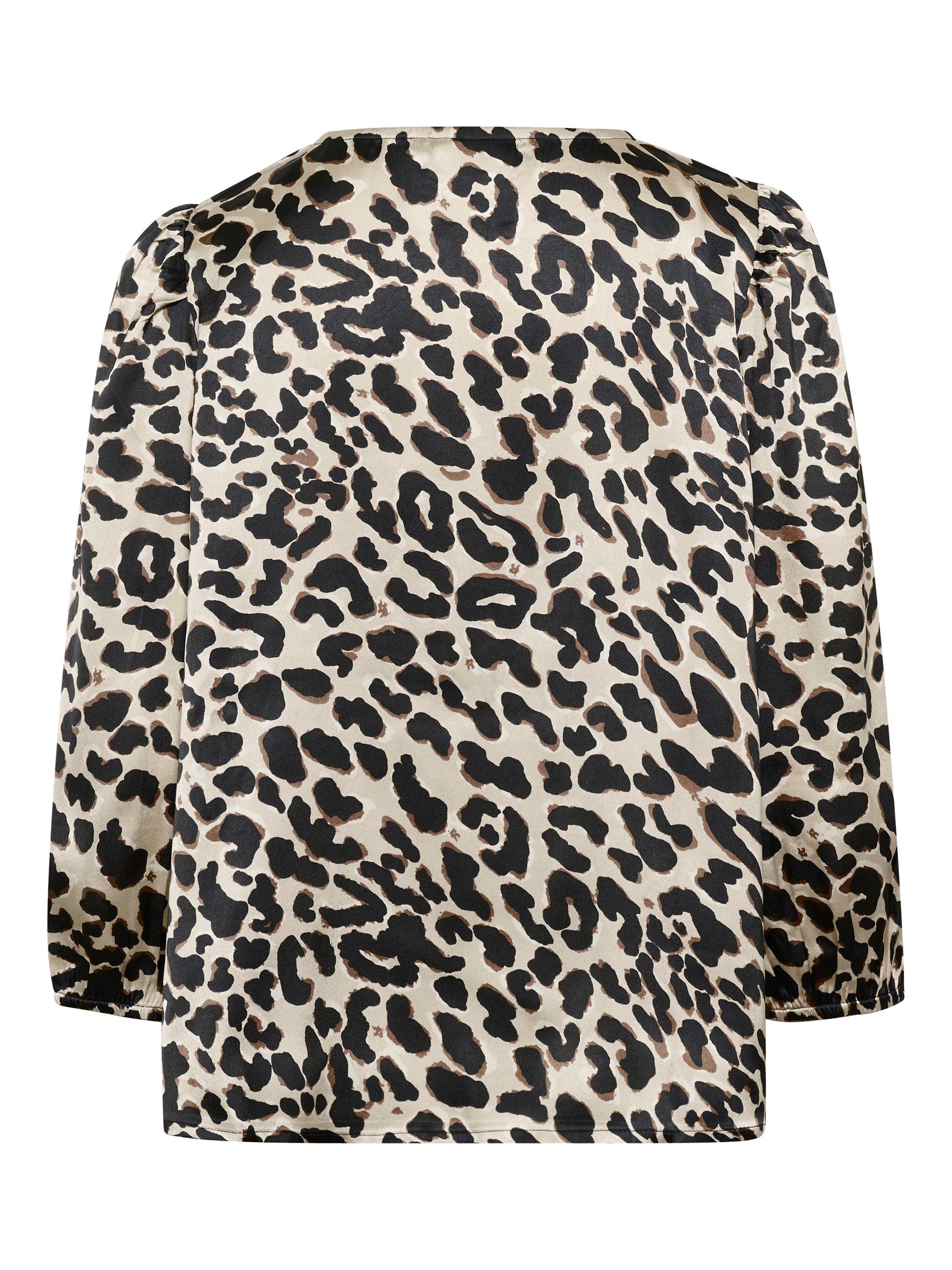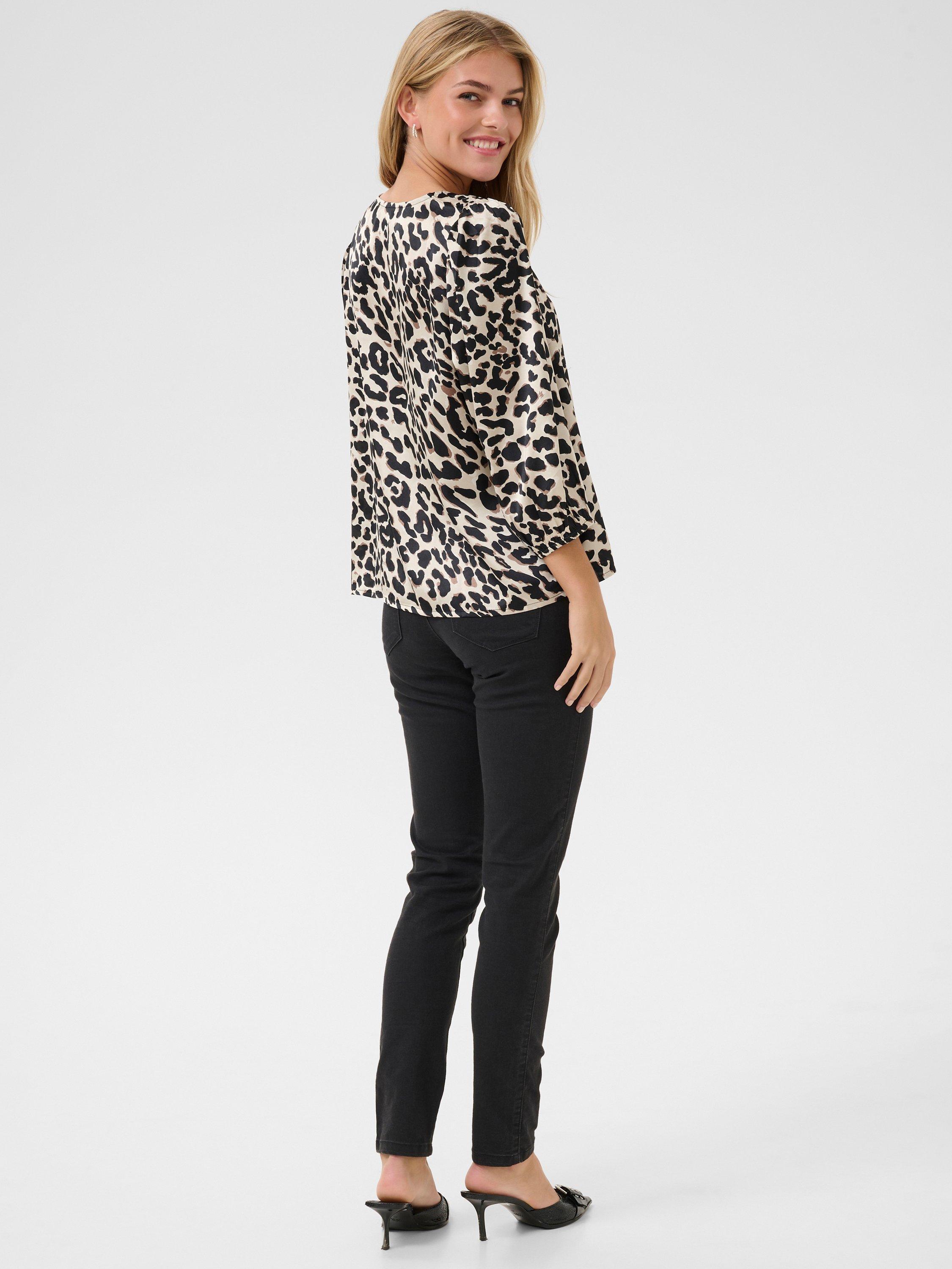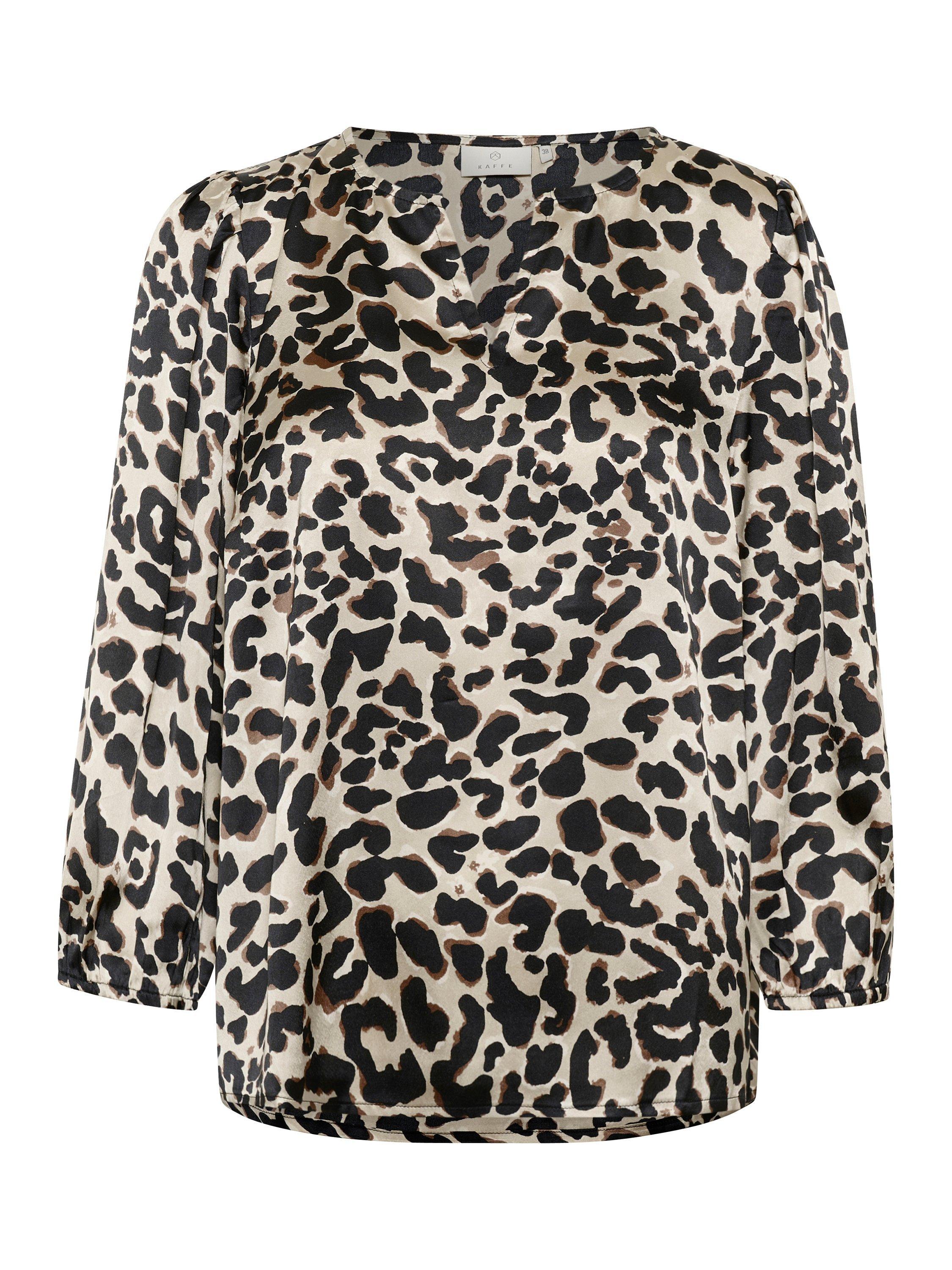 The magda blouse is a versatile top with endless styling options. It has a V-notch neck and a regular fit, and it is made in a printed sateen fabric. The sleeves are 3/4 length balloon sleeves, and they are gathered in an elastic edge.