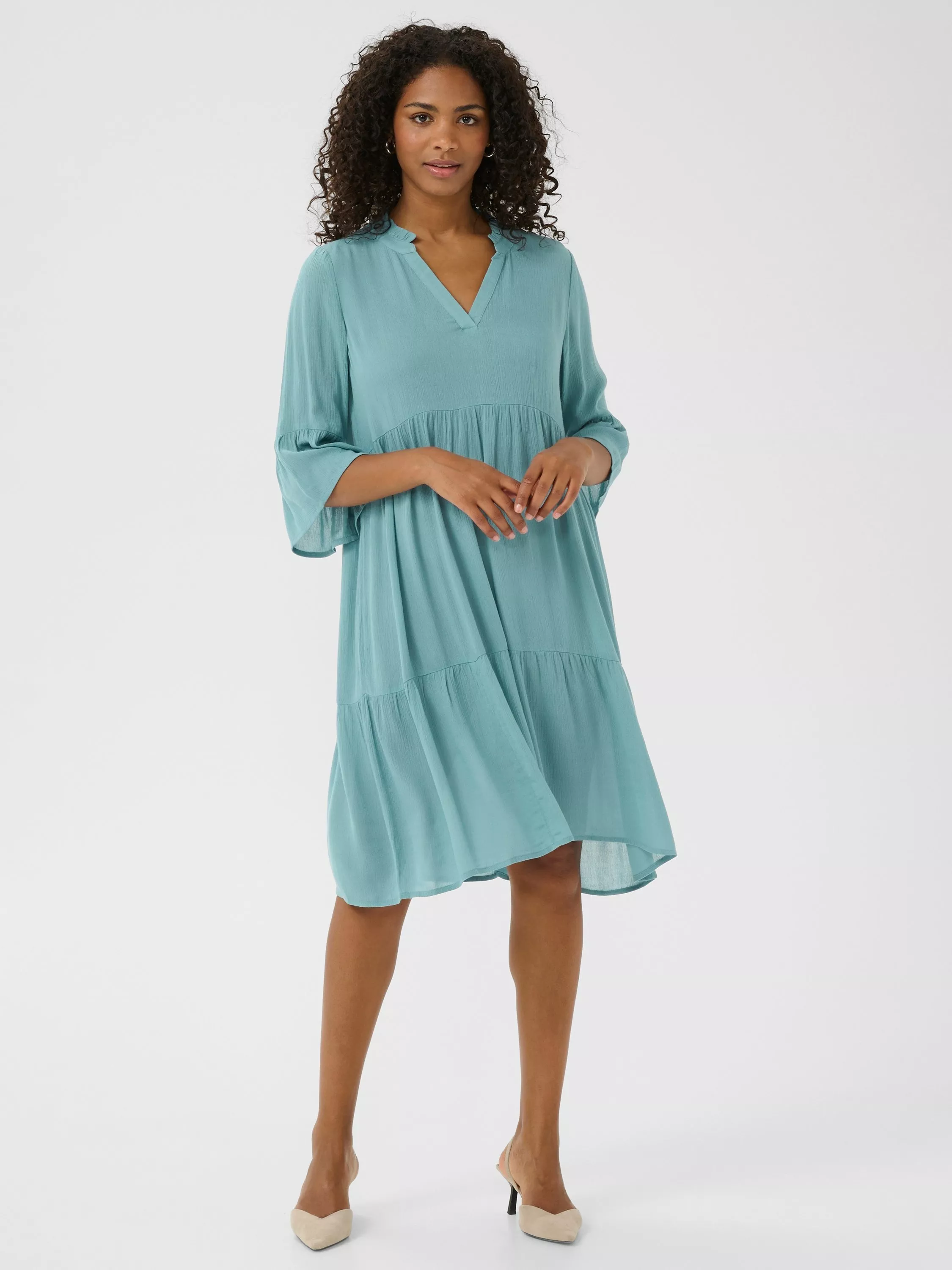 Tiered for a dramatic touch, this knee length dress from KAFFE is crafted from an airy viscose fabric. With a fuss-free but smart v-neckline and three quarter length sleeves, this style is bound to become a key addition to your line-up.