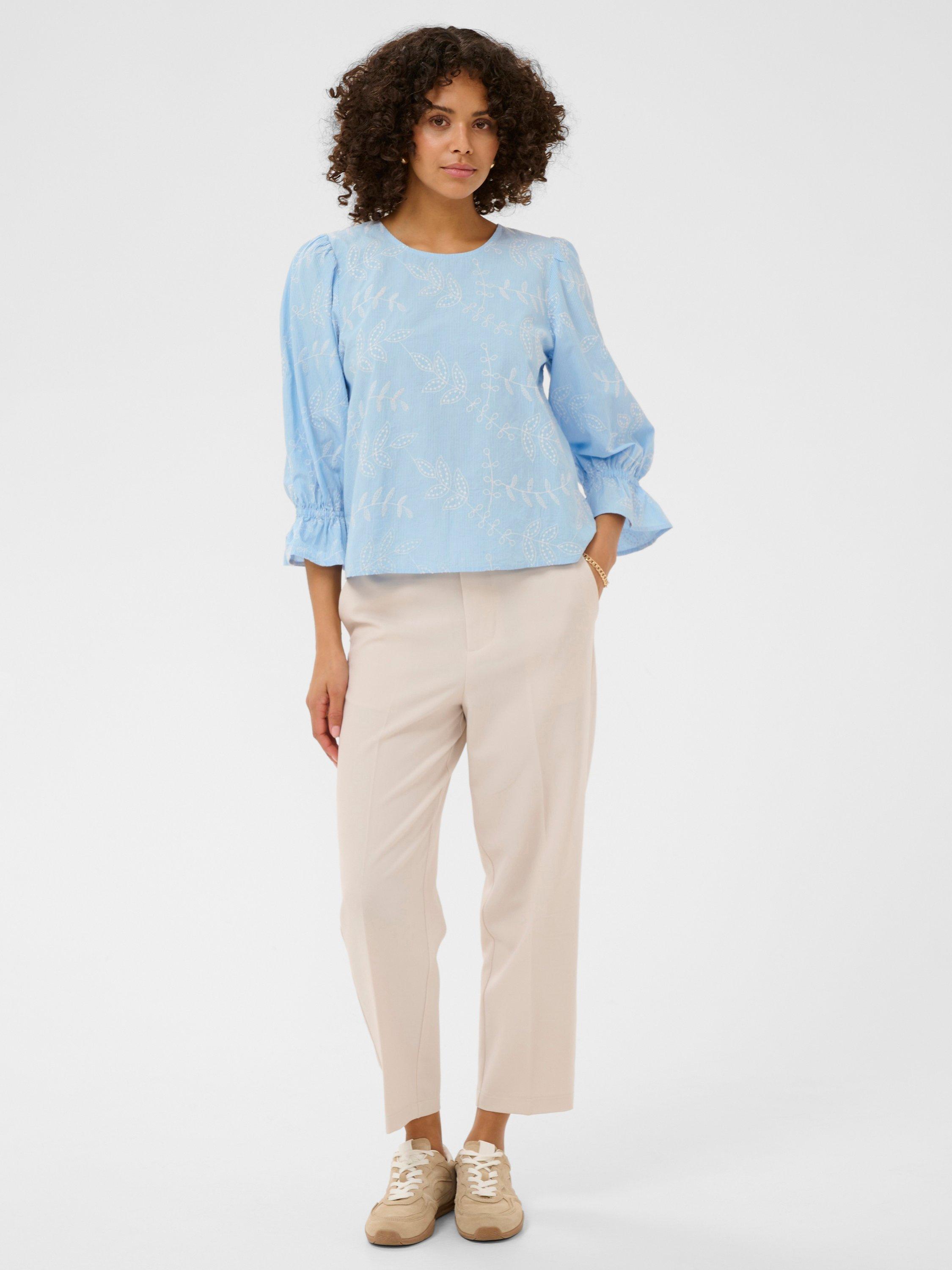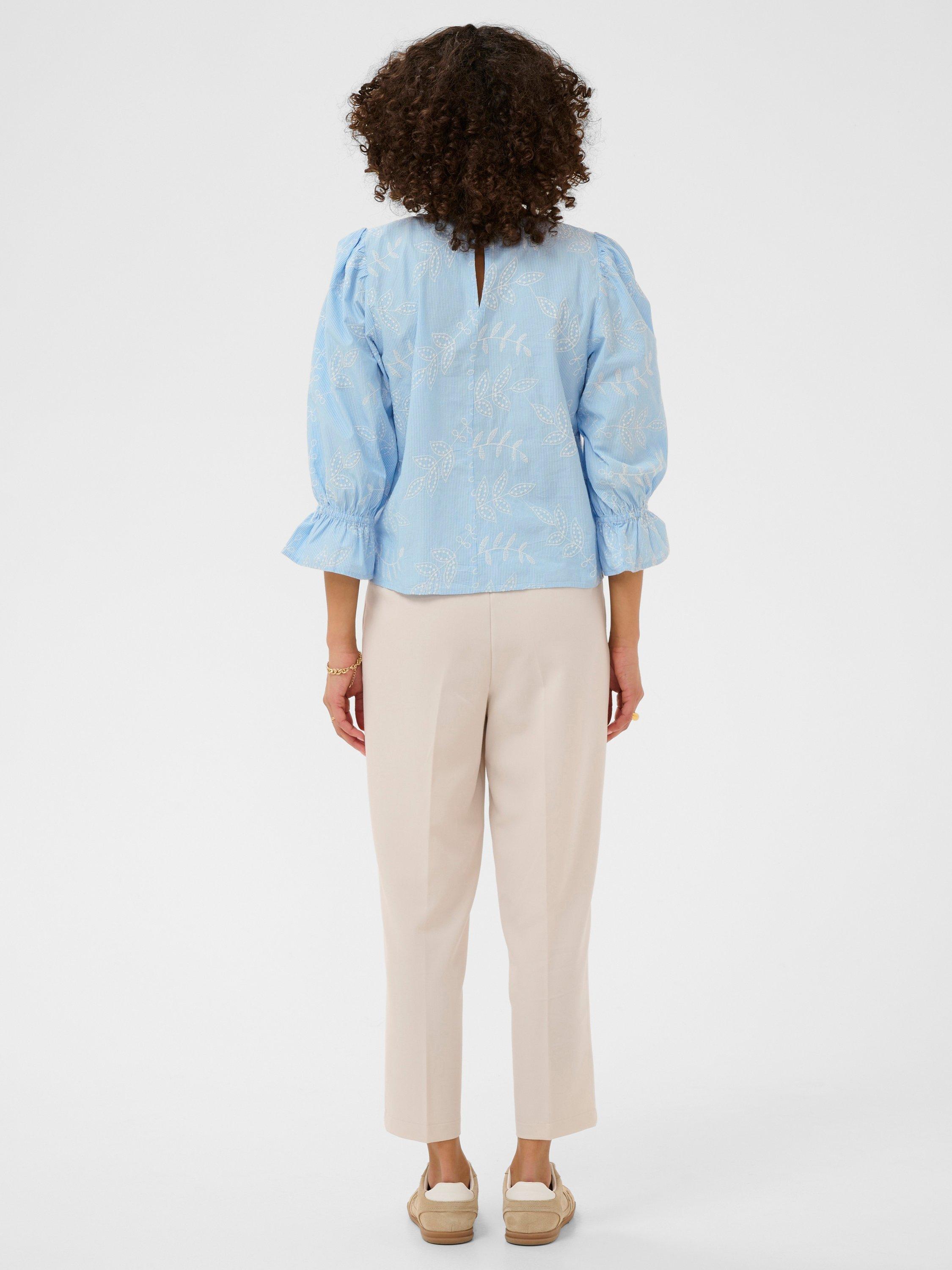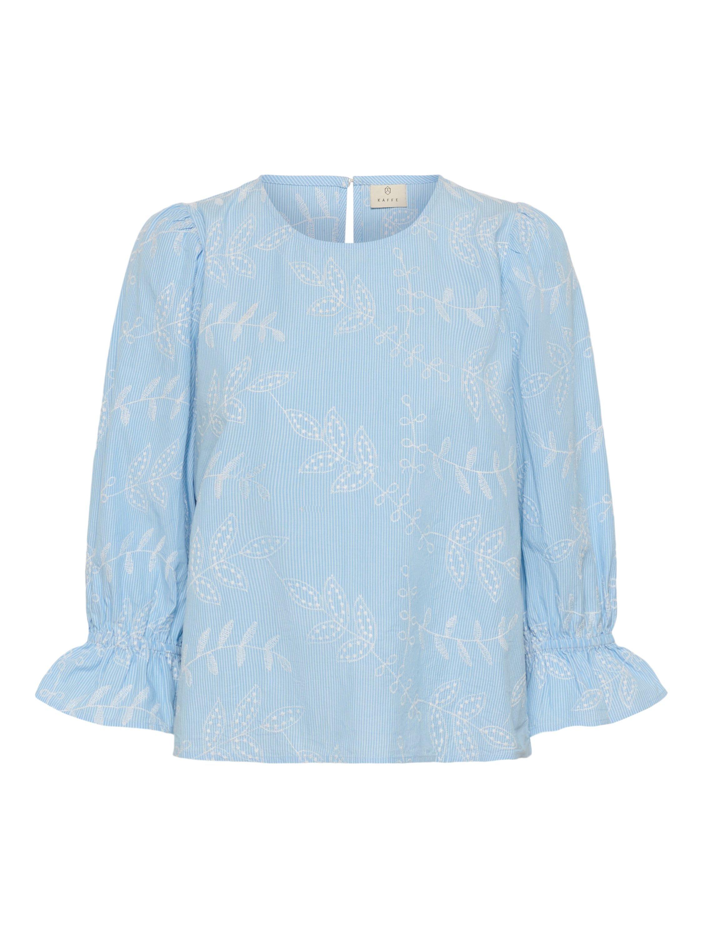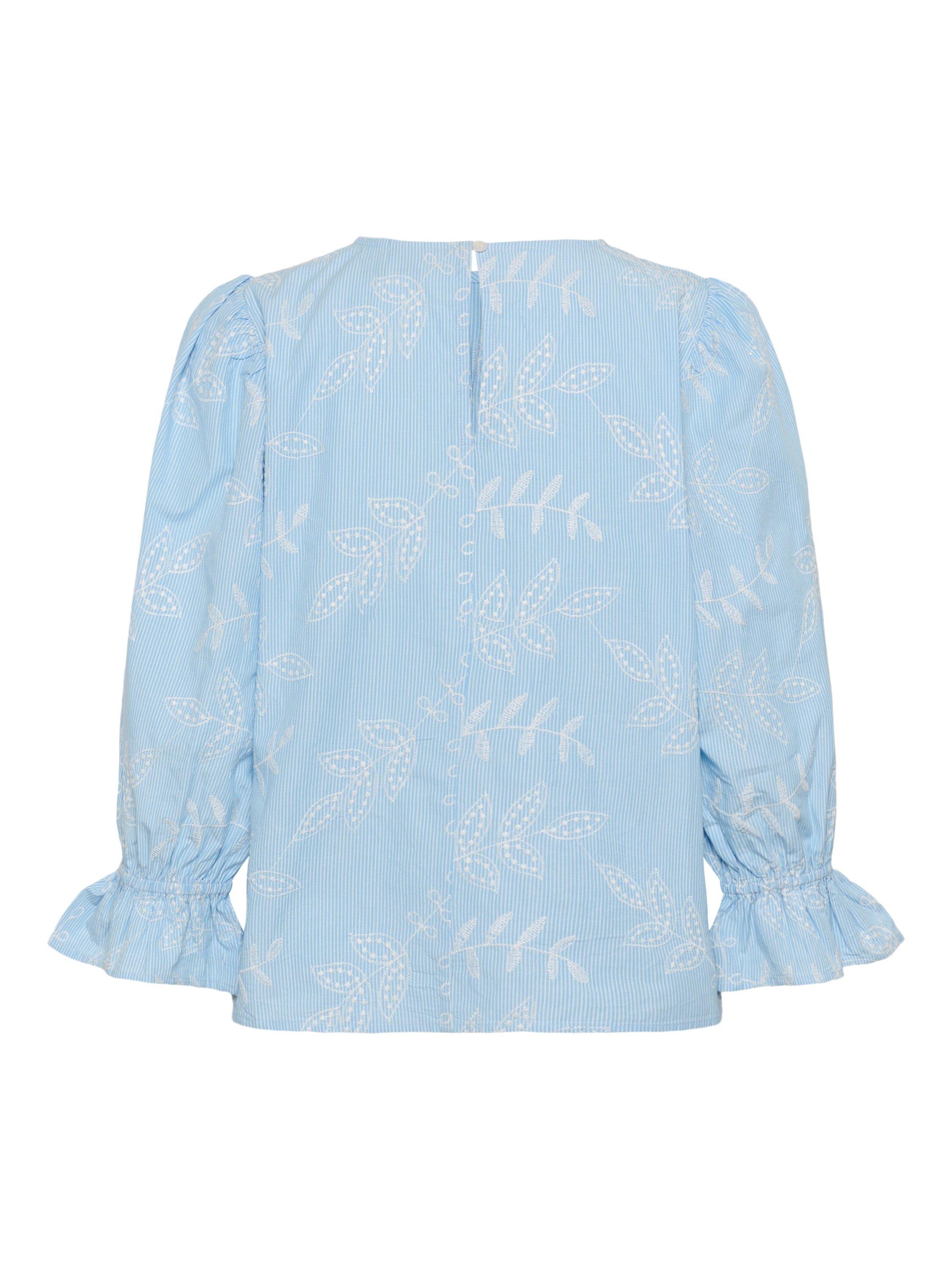 Airy embroidered blouse featuring soft puff sleeves and ruffled cuffs, offering gentle drape for graceful daytime style from brunch to the office.