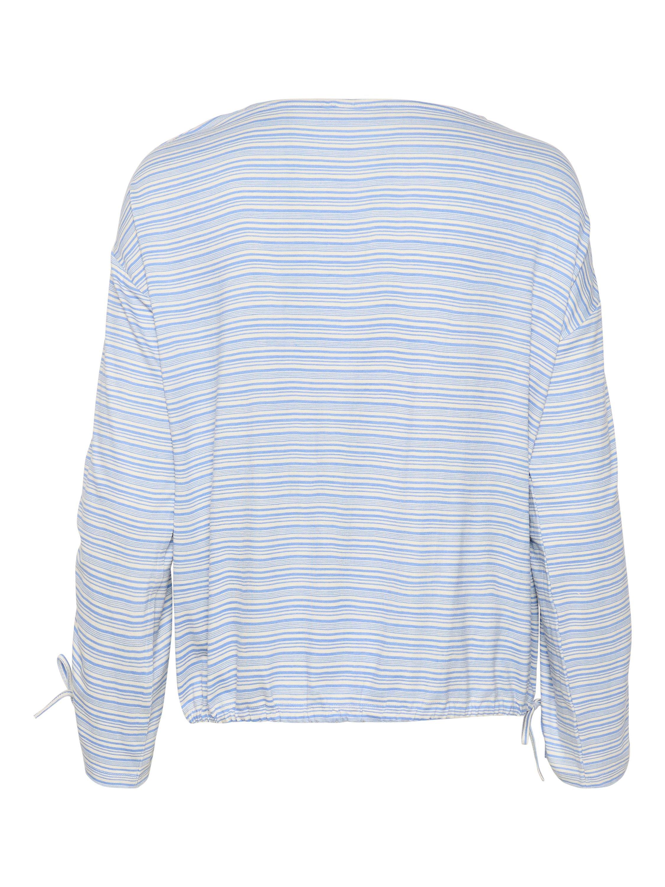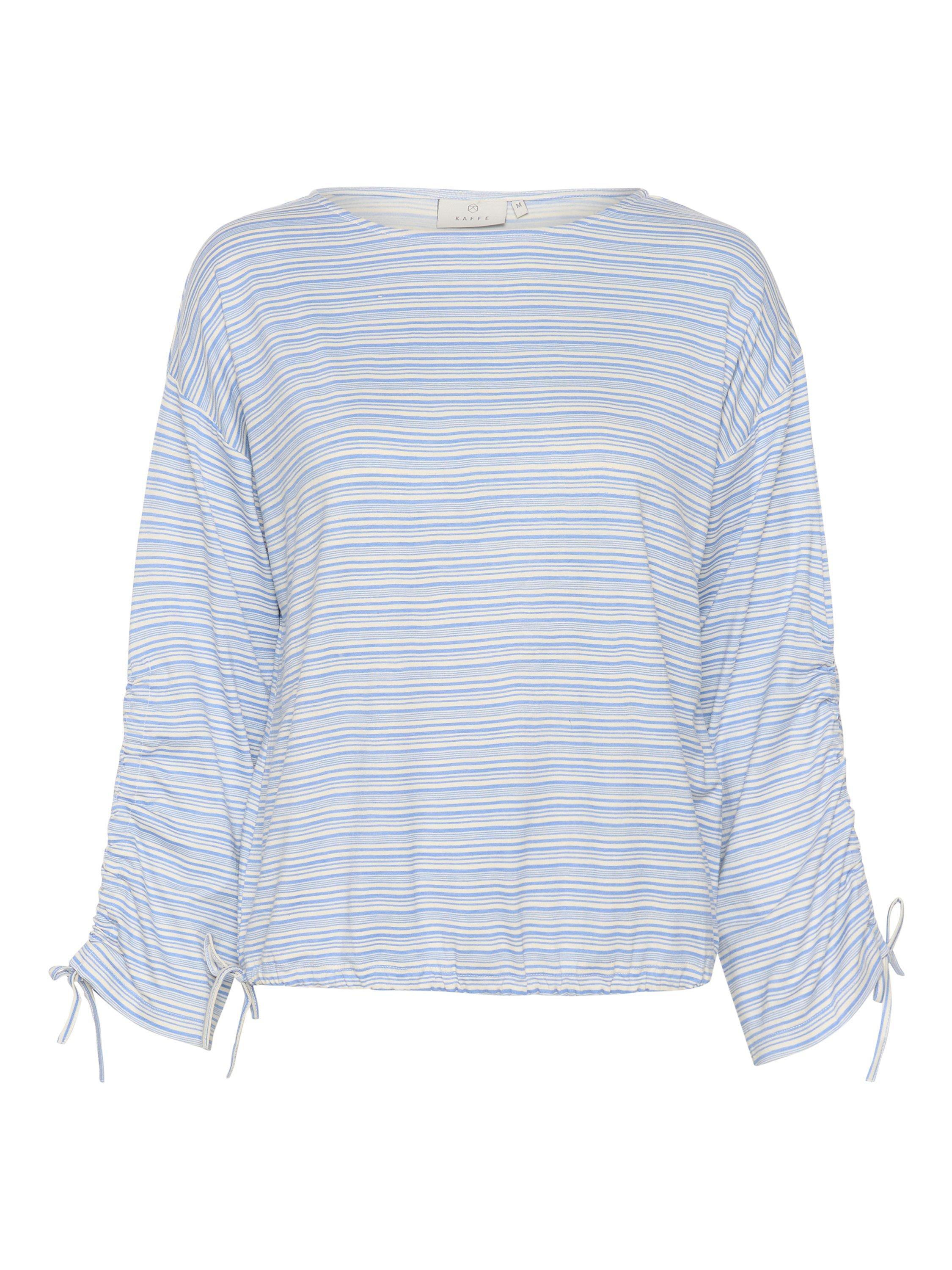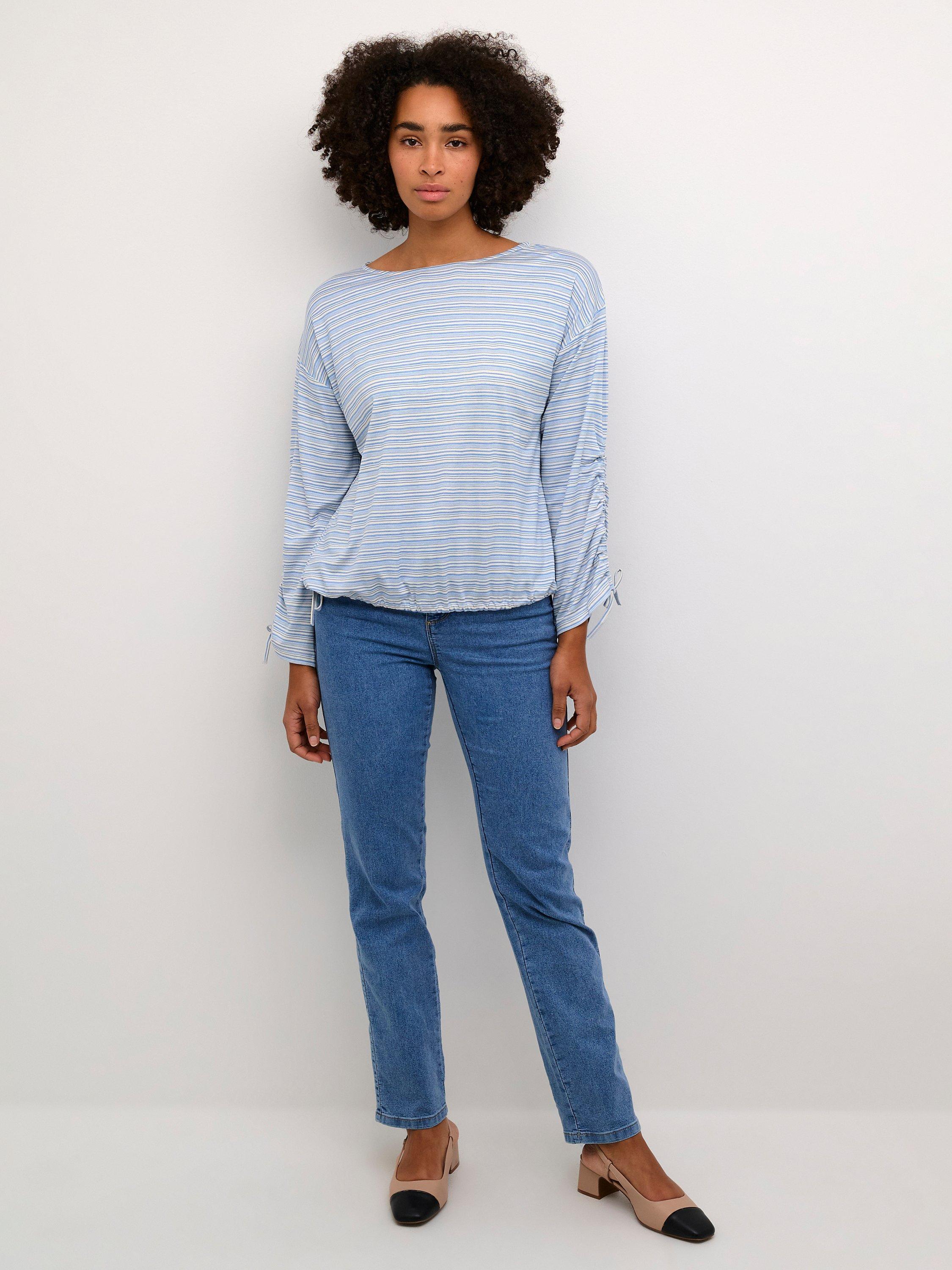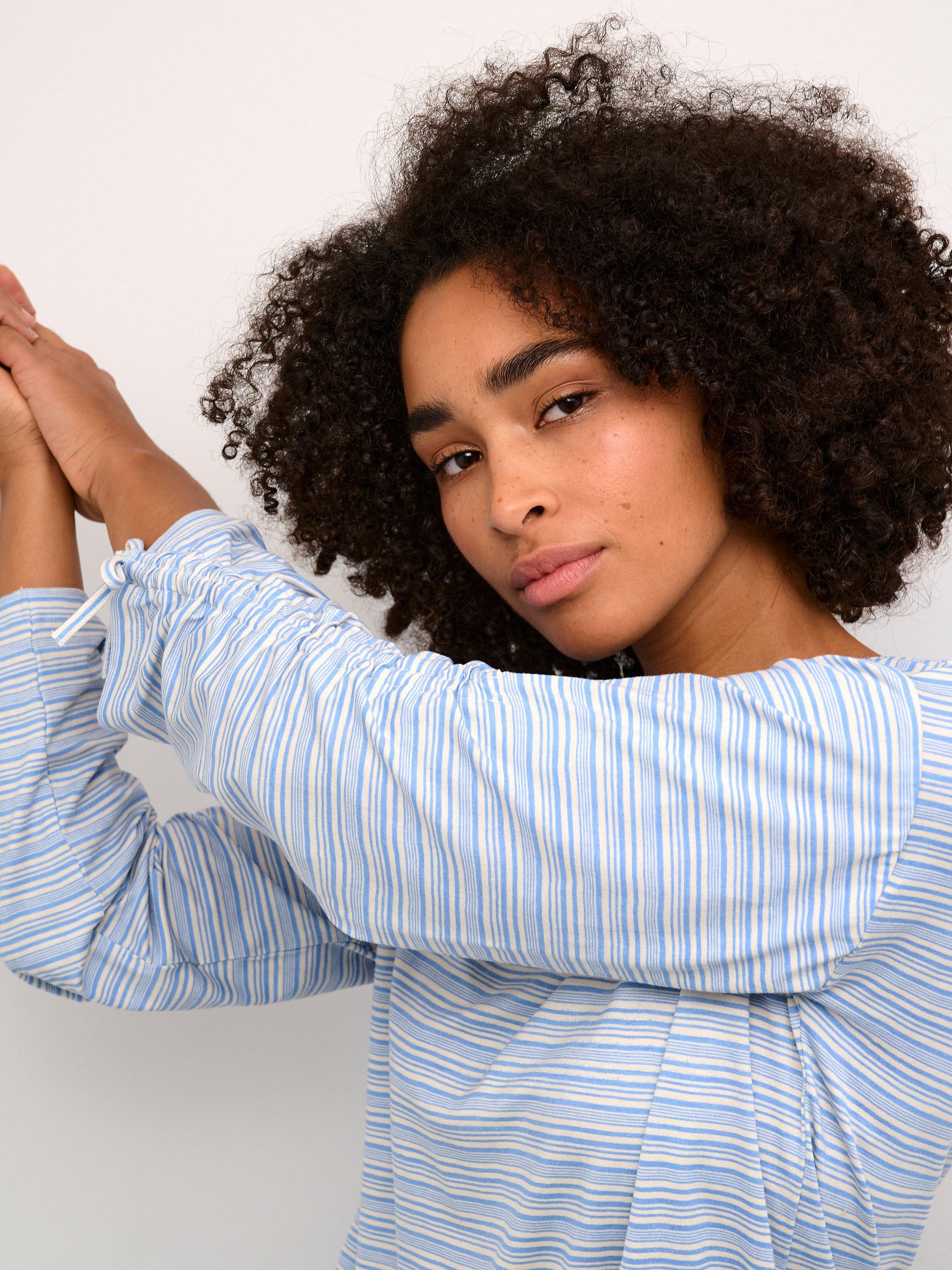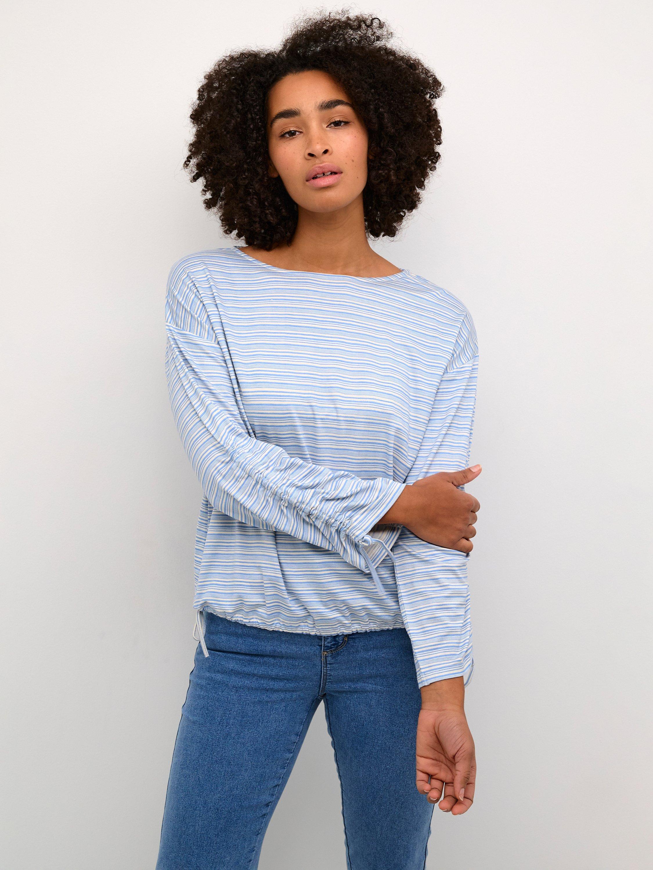 The mathilde blouse is a casual top in a soft jersey fabric. It has a boat neck with a regular fit and drop shoulders, and it has a drawstring hem that gives it a subtle volume. The sleeves are long with a wide fit, and from the elbow down they have drawstrings.