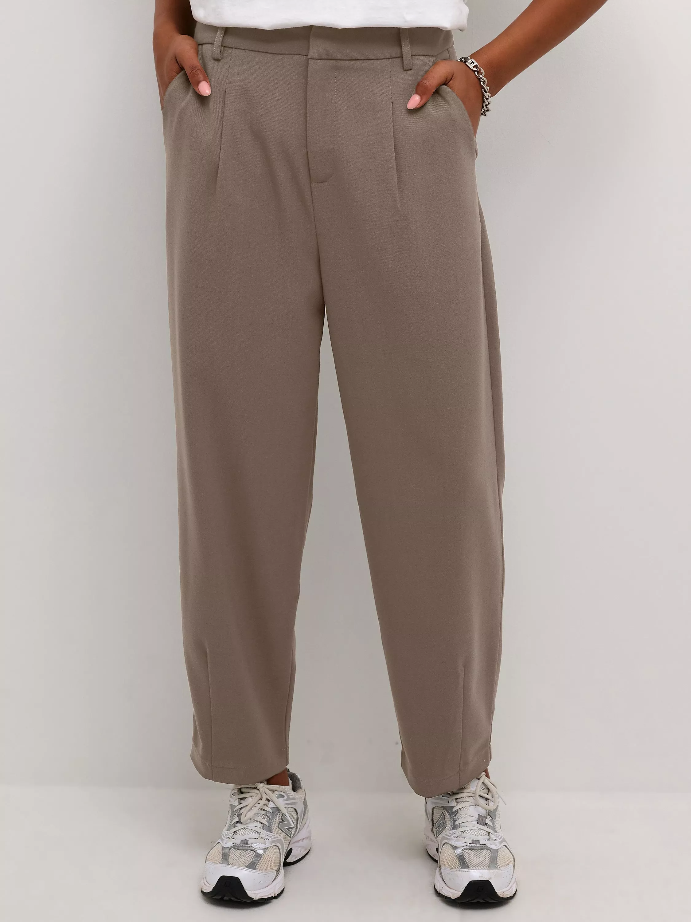 The merle trousers are a casual pair of suit trousers with cropped legs that are cut right below the calves. The trousers are high-waisted with a regular waistband and pleats at the front. They have jetted back pockets and hidden front pockets. The fit of the trousers is regular with tapered legs.