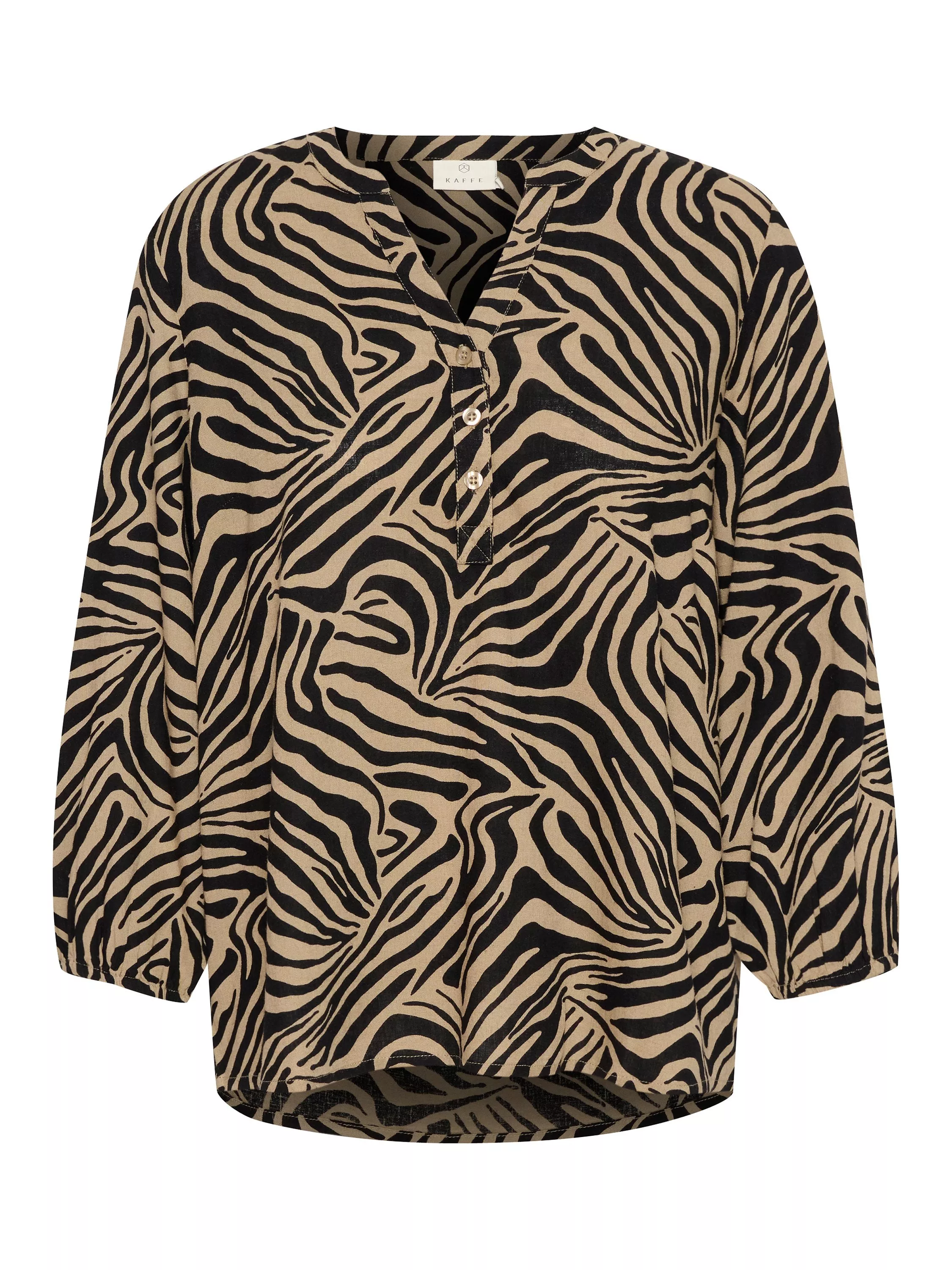 The milia blouse is a cute everyday top that you can pair with anything. It has a henley neck with buttons and a band collar, and it has a regular fit. The sleeves are 3/4 length with a loose fit, and they are gathered in an elastic edge. The blouse is cut at the hips and has a rounded hem.