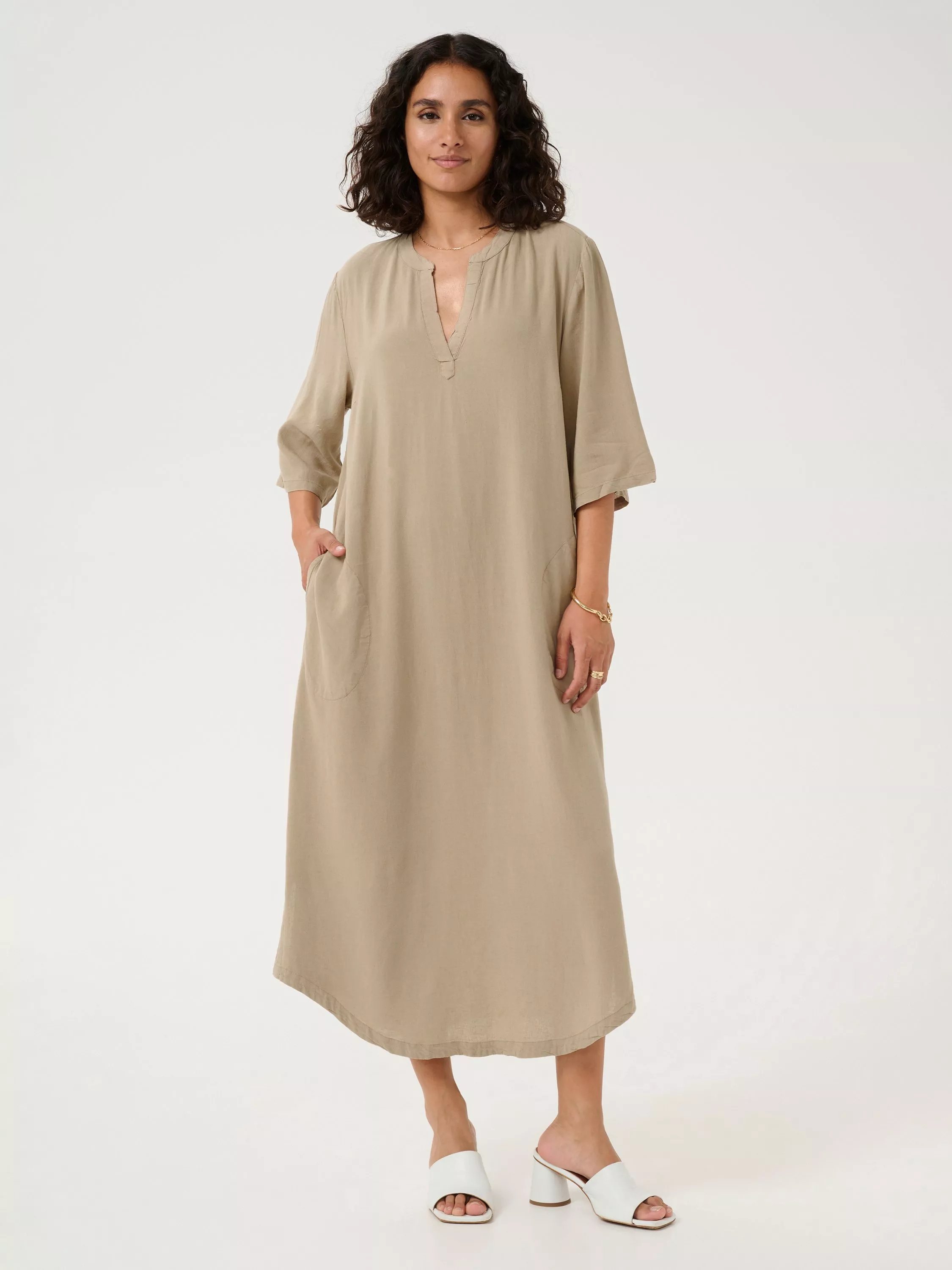 The Milia Kaftan Dress hits just the right notes of casual elegance. A relaxed fit, this midi-length dress includes lightweight linen in the fabric, and features elbow-length sleeves and a V-neckline.