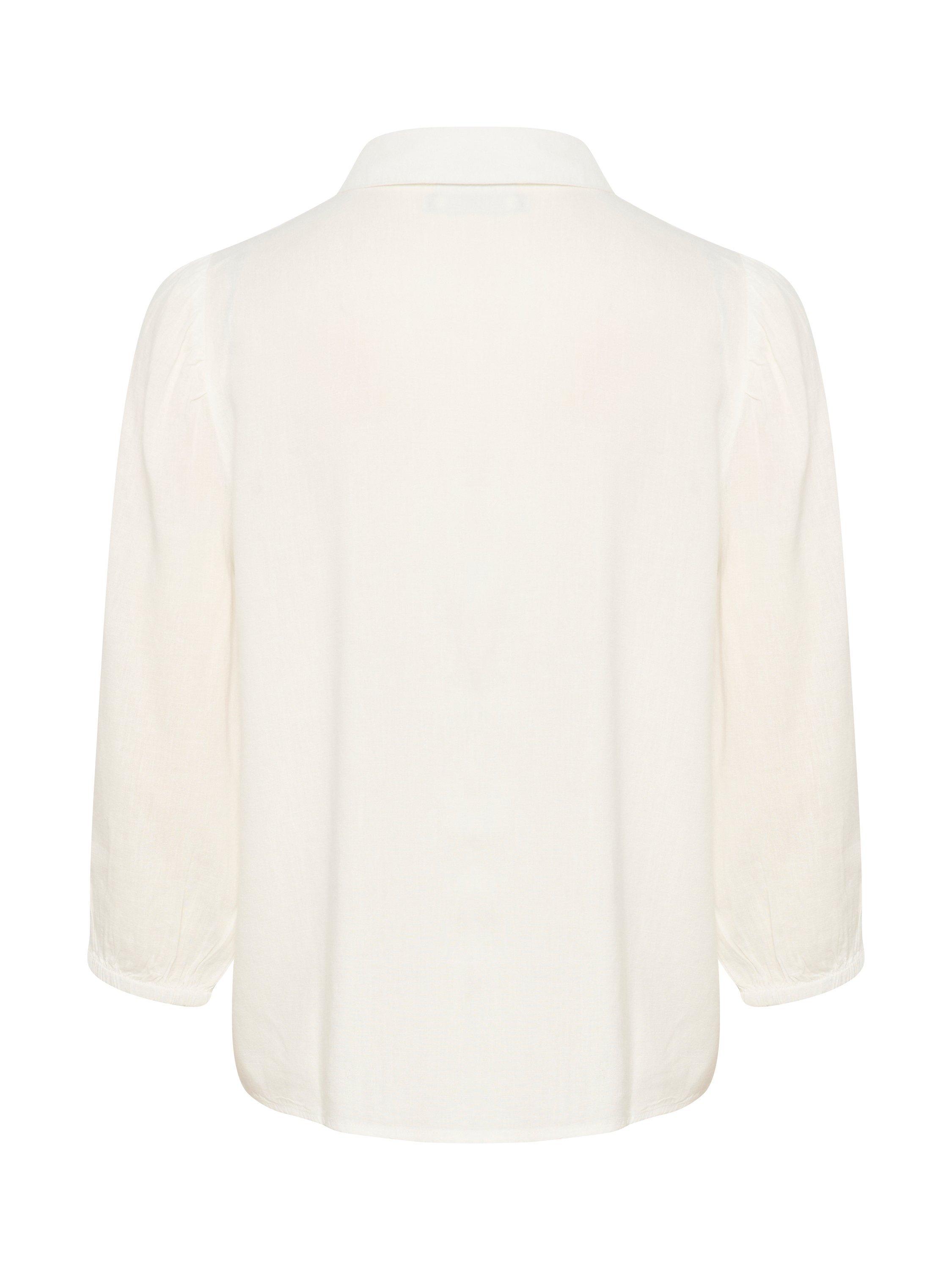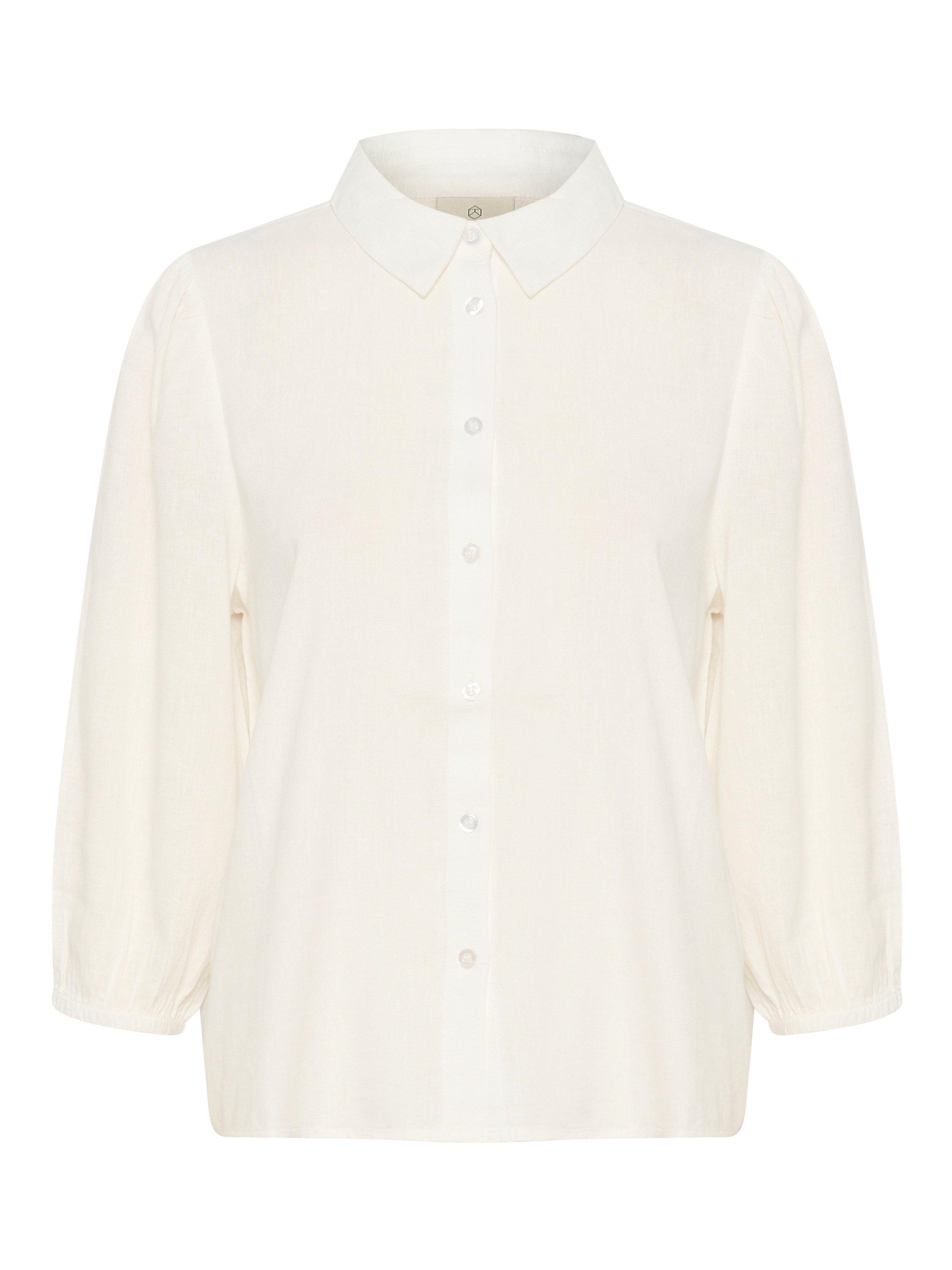 The milia shirt is a timeless style in a light linen blend. It has a spread collar and buttons all down the front. The sleeves are 3/4 length with a casual fit and they are gathered in an elastic edge. The shirt has a regular fit and it is cut at the hips.