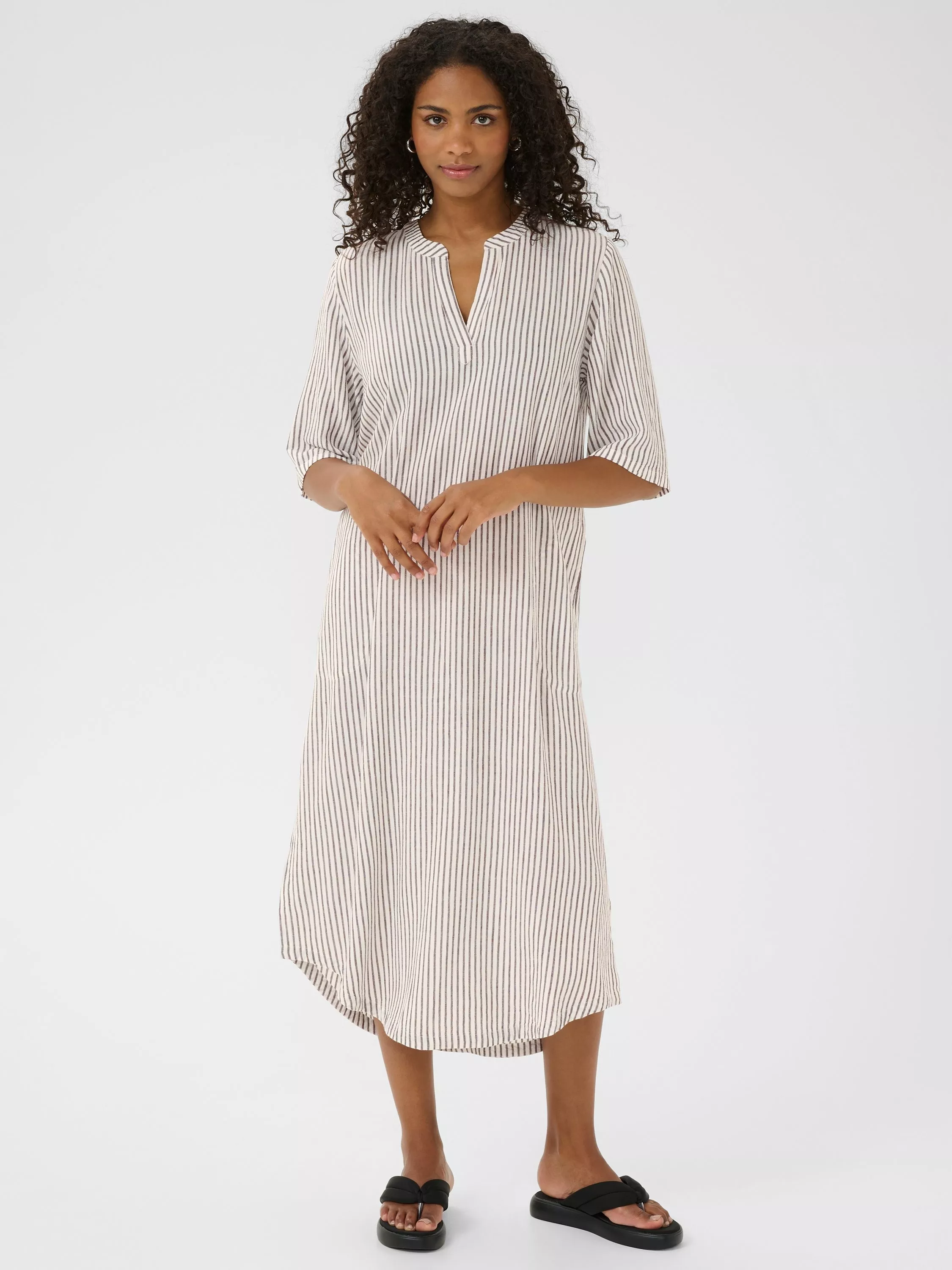 Designed in an easy to wear tunic style, this mid-length kaftan dress from KAFFE is crafted from an airy viscose blend. With a v-neckline and short sleeves, this style comes in a relaxed fit with a chic chalk/fudge stripe pattern.