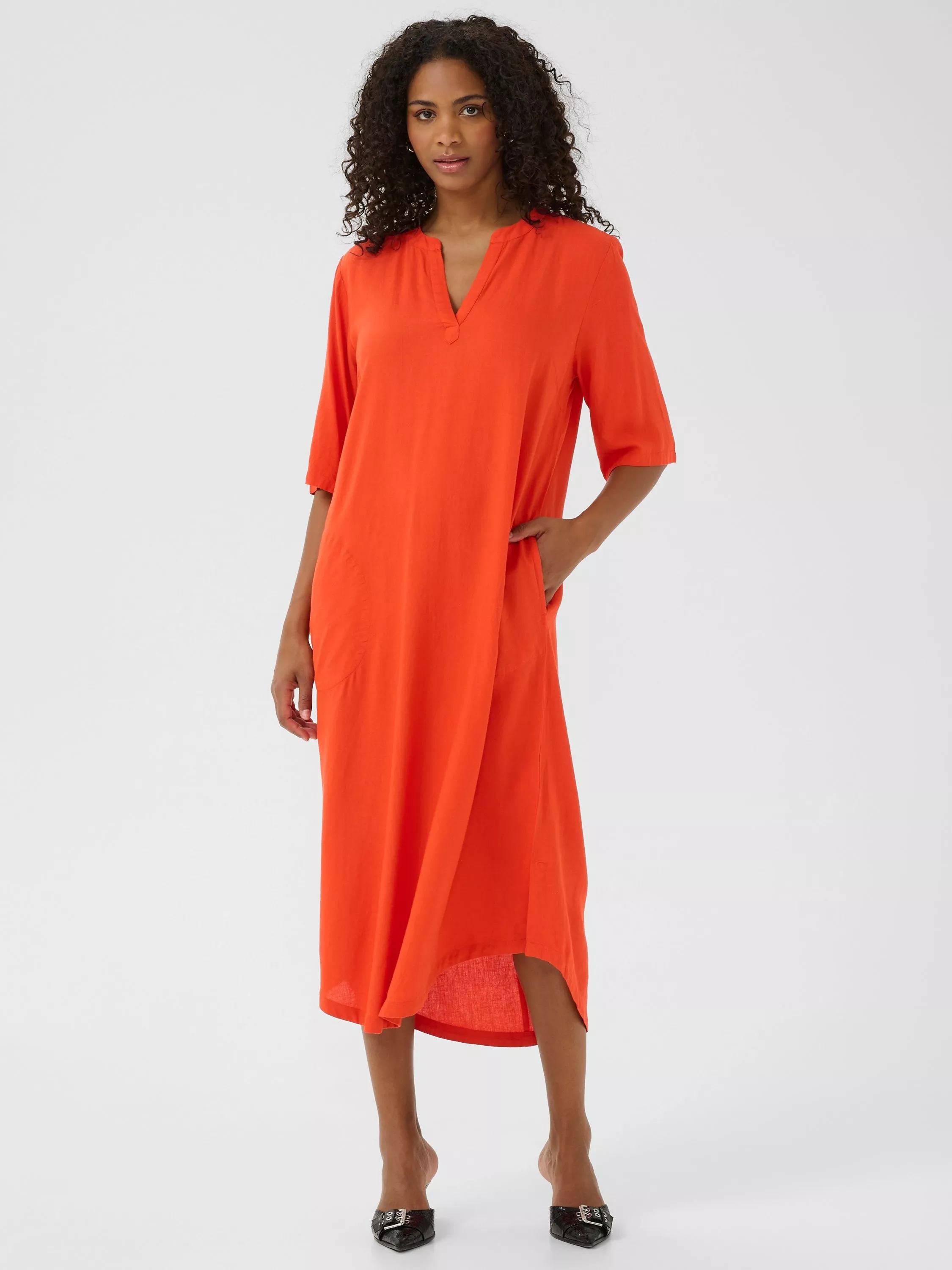 In an easy to wear A-line shape, this mid-length dress from KAFFE is crafted from an airy viscose blend. Effortlessly flattering thanks to a fuss-free v-neckline and three quarter length sleeves, it needs no prints or accents to hold the spotlight.