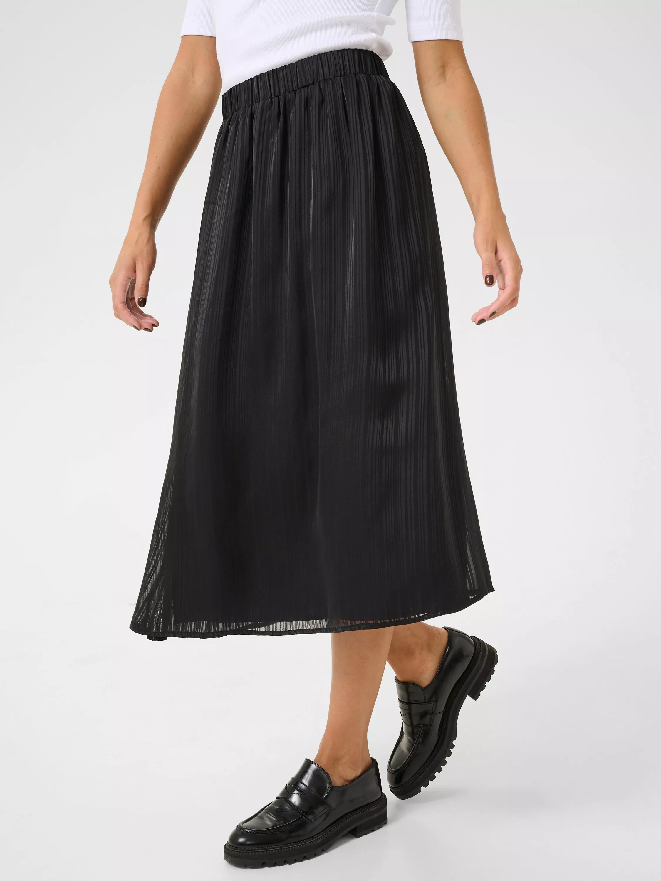 The mille midi skirt is a versatile and feminine style that you can wear on any occasion. It is high-waisted with an elastic waistband, and it has a loose and flowy fit. It is made in a chiffon fabric with a matching lining, and it is cut at the mid-calves.