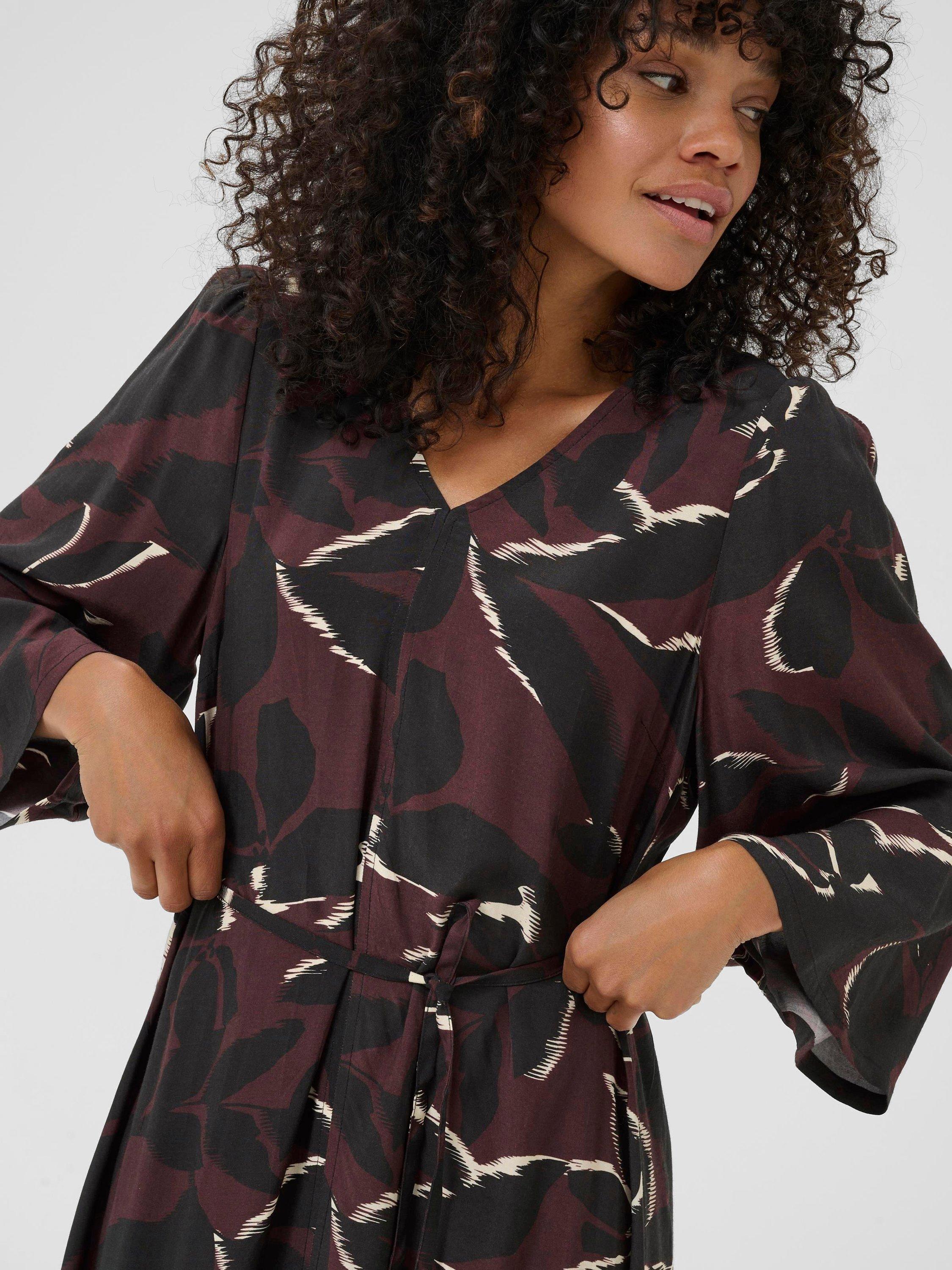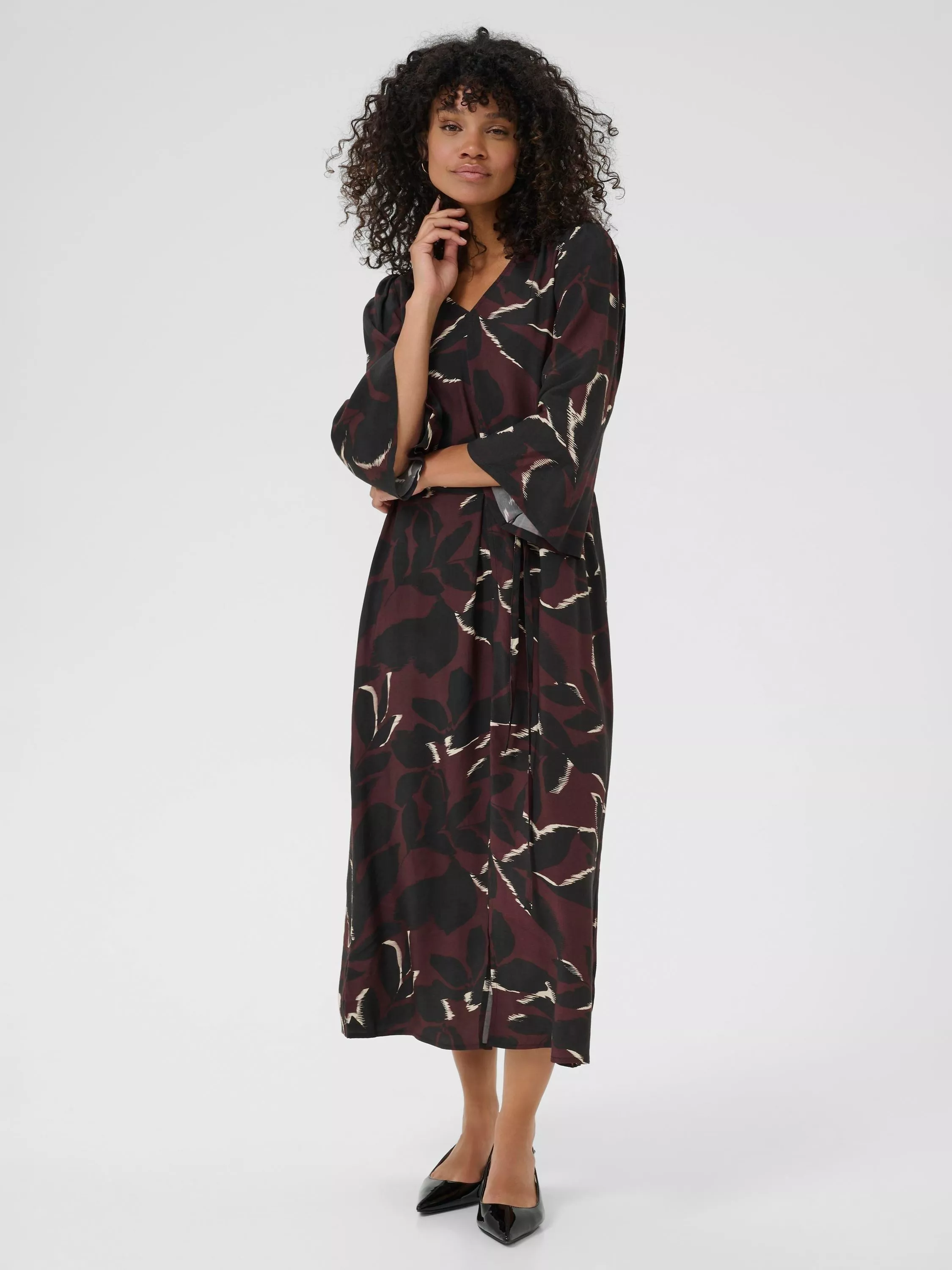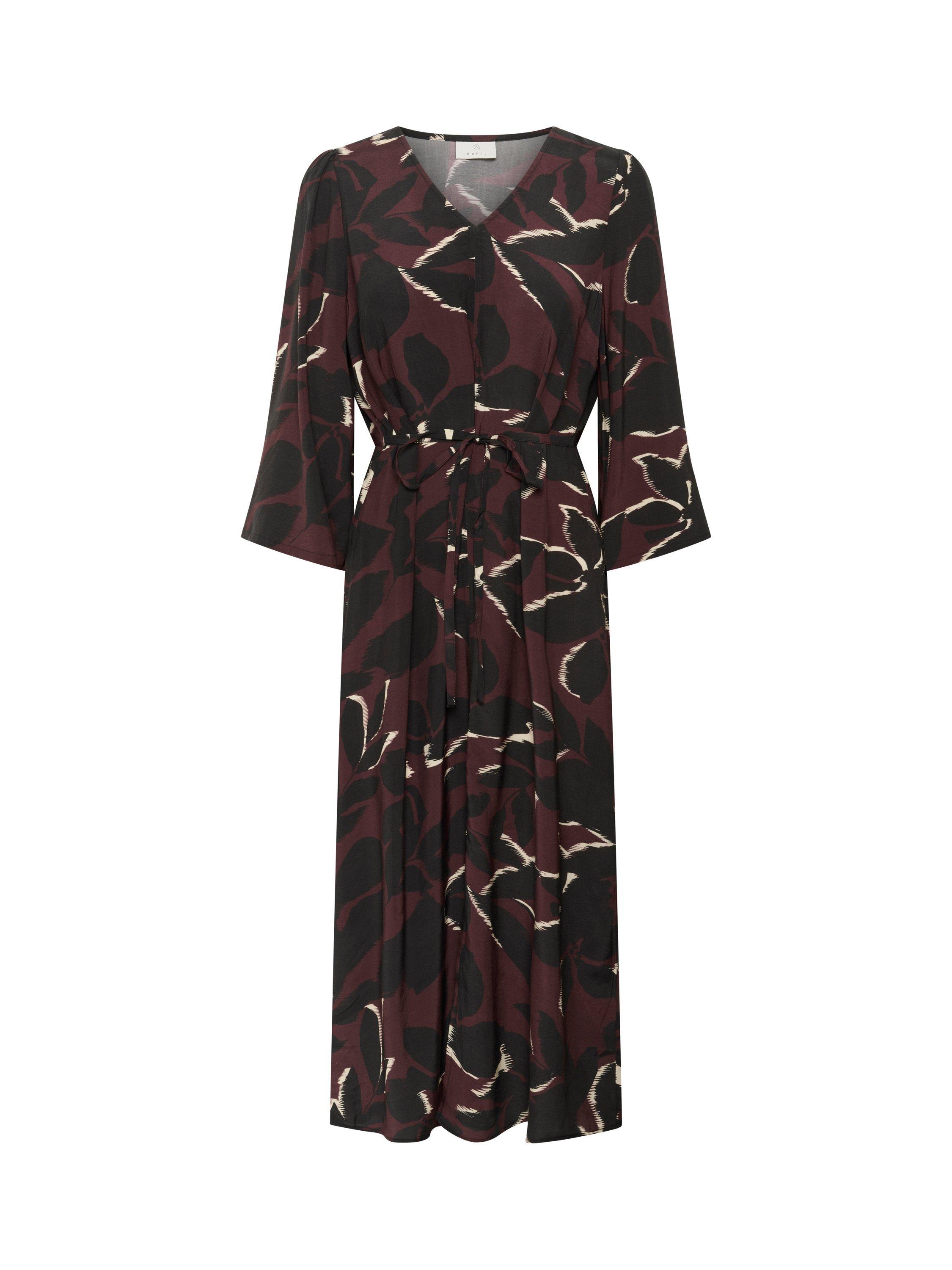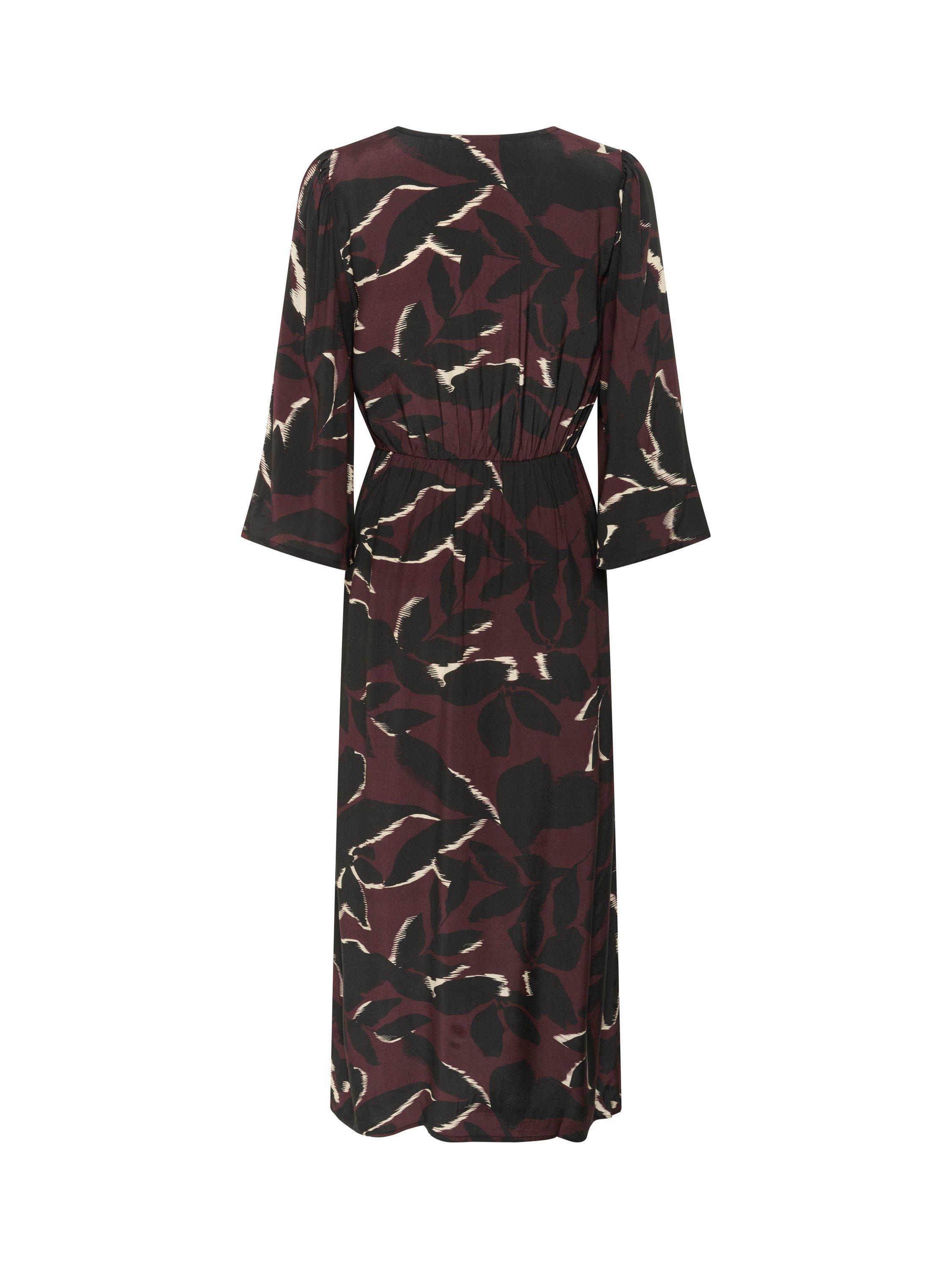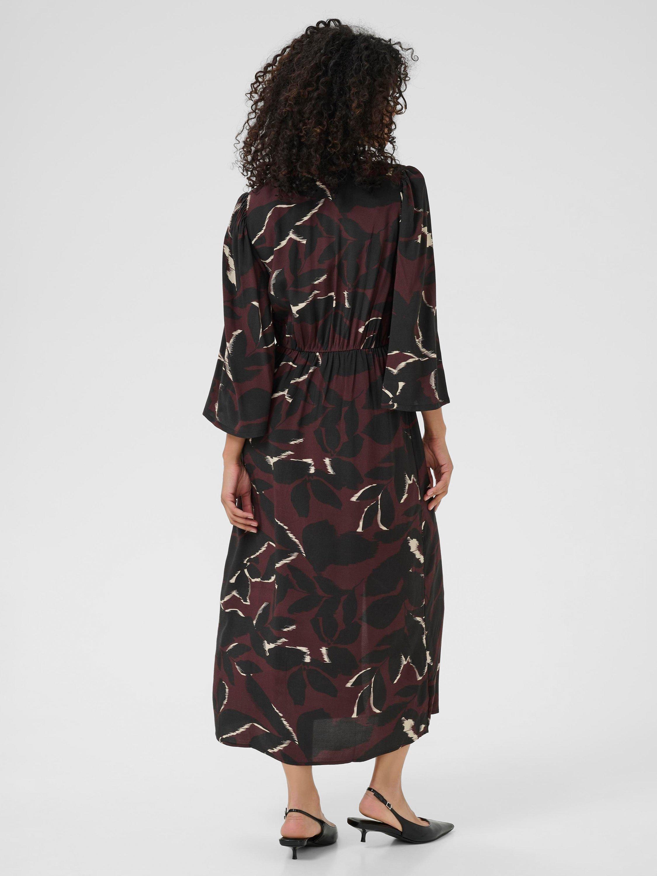 A midi A-line dress, featuring a lively leaves and trees pattern, three quarter sleeves, and a soft V-neck. Designed for comfort, it suits your daily plans whatever you're up to.