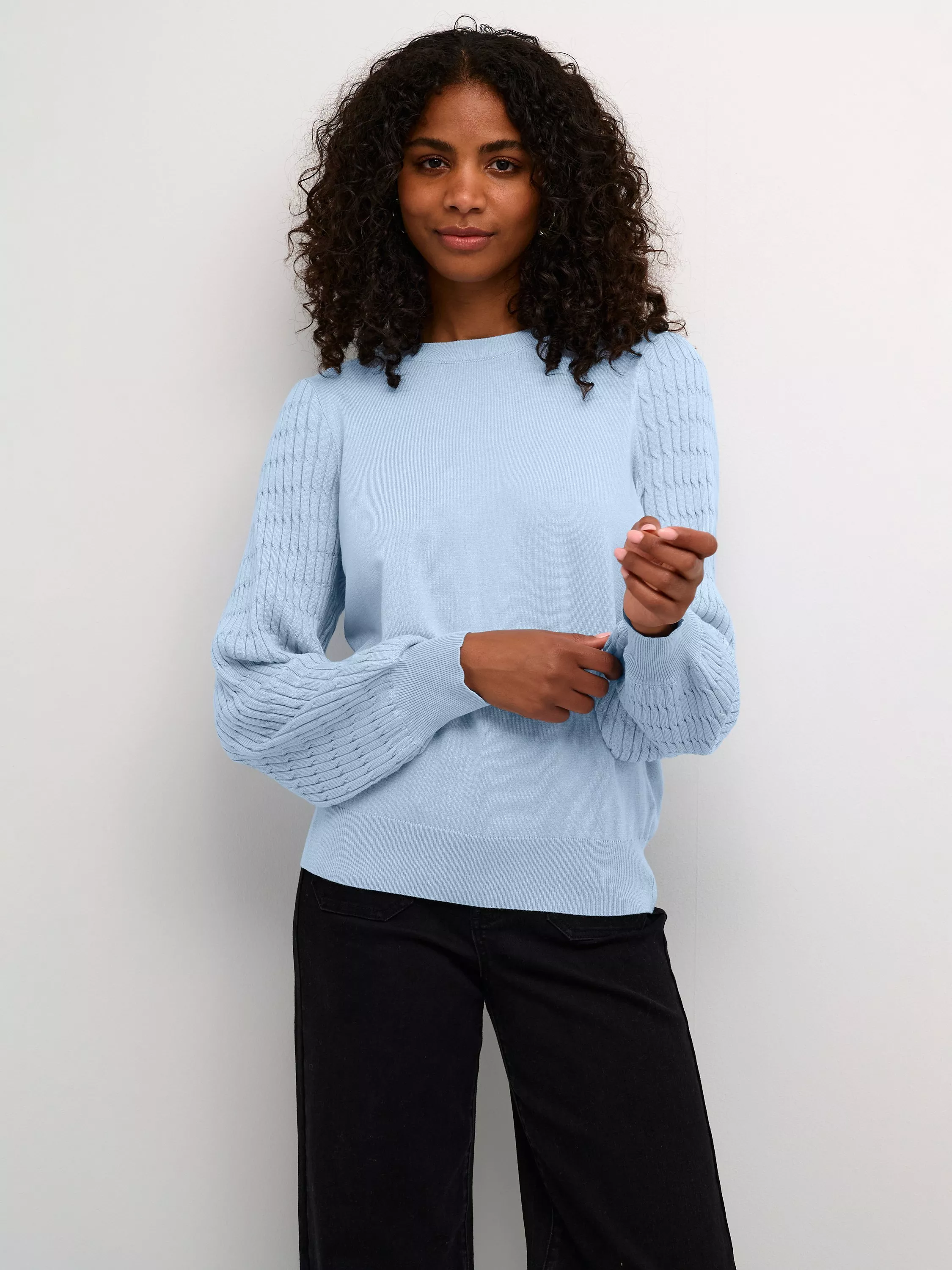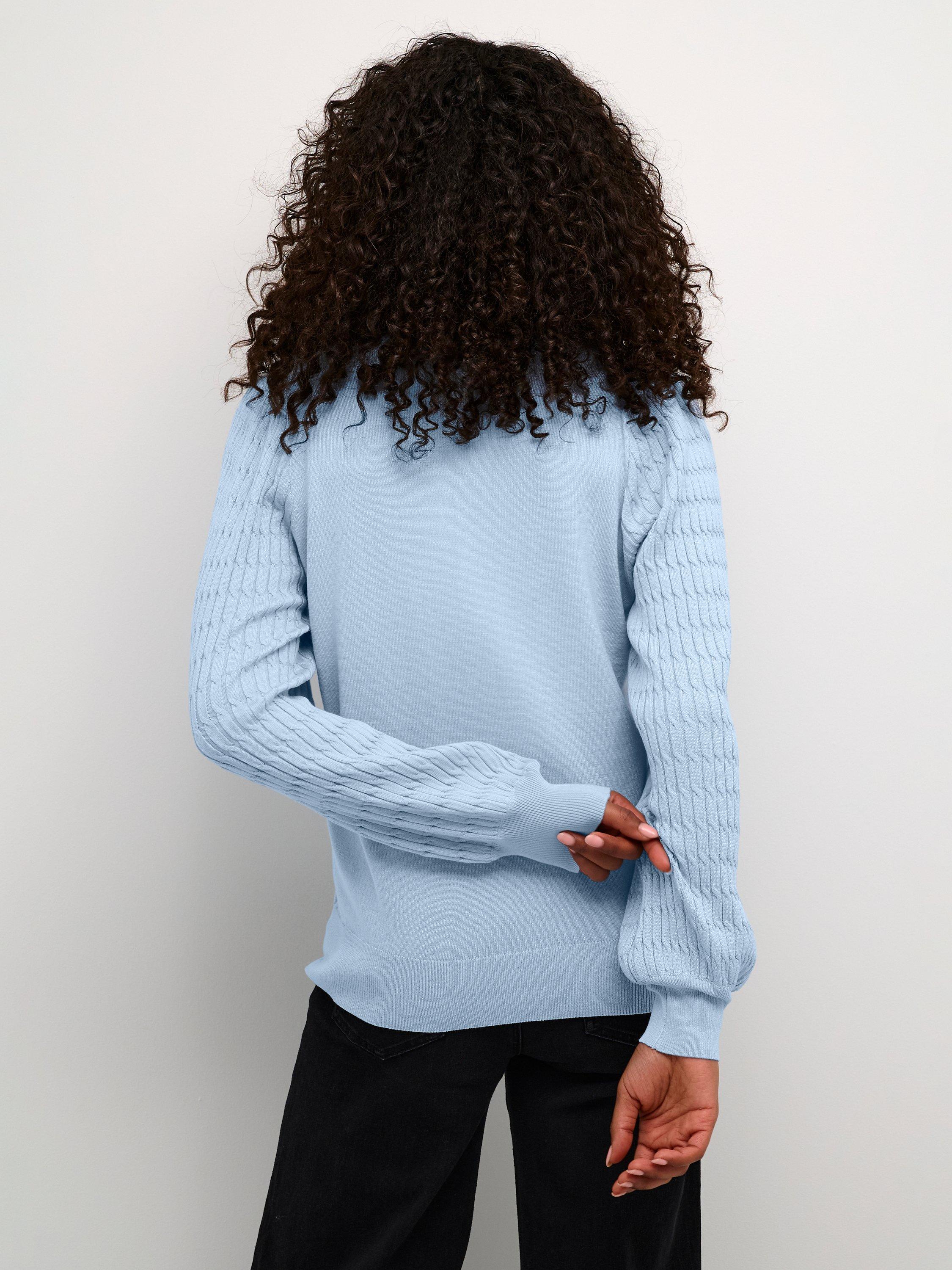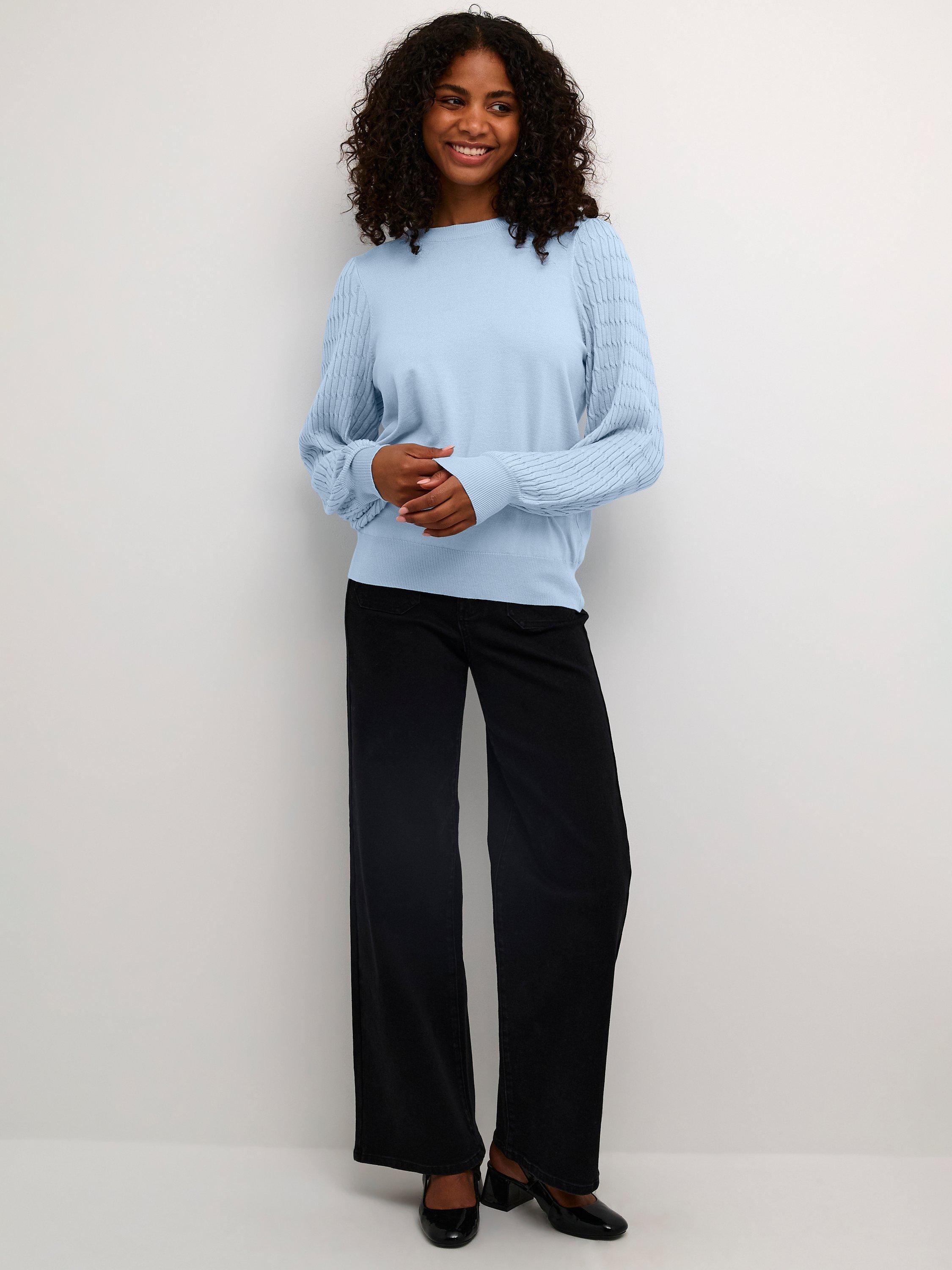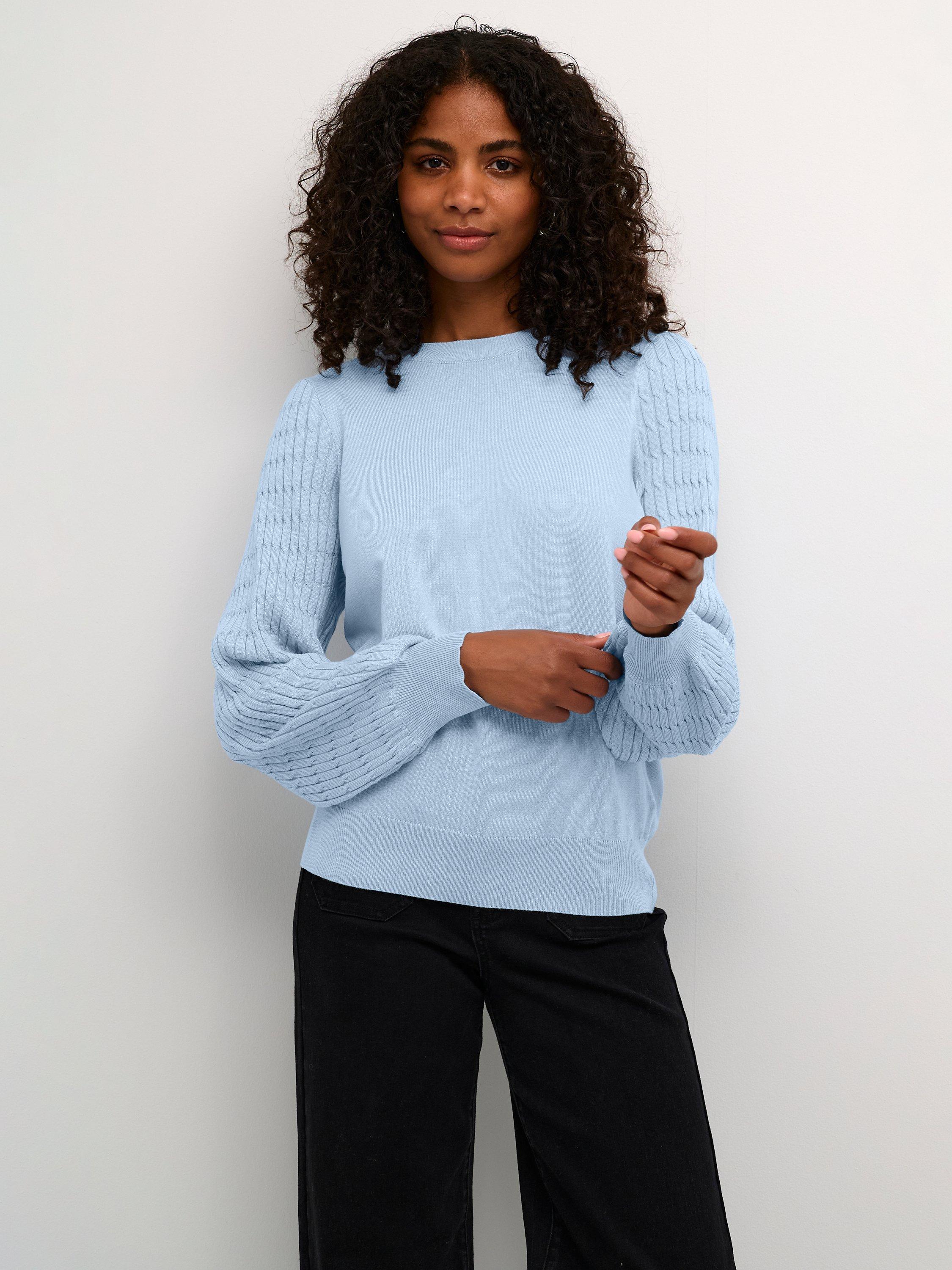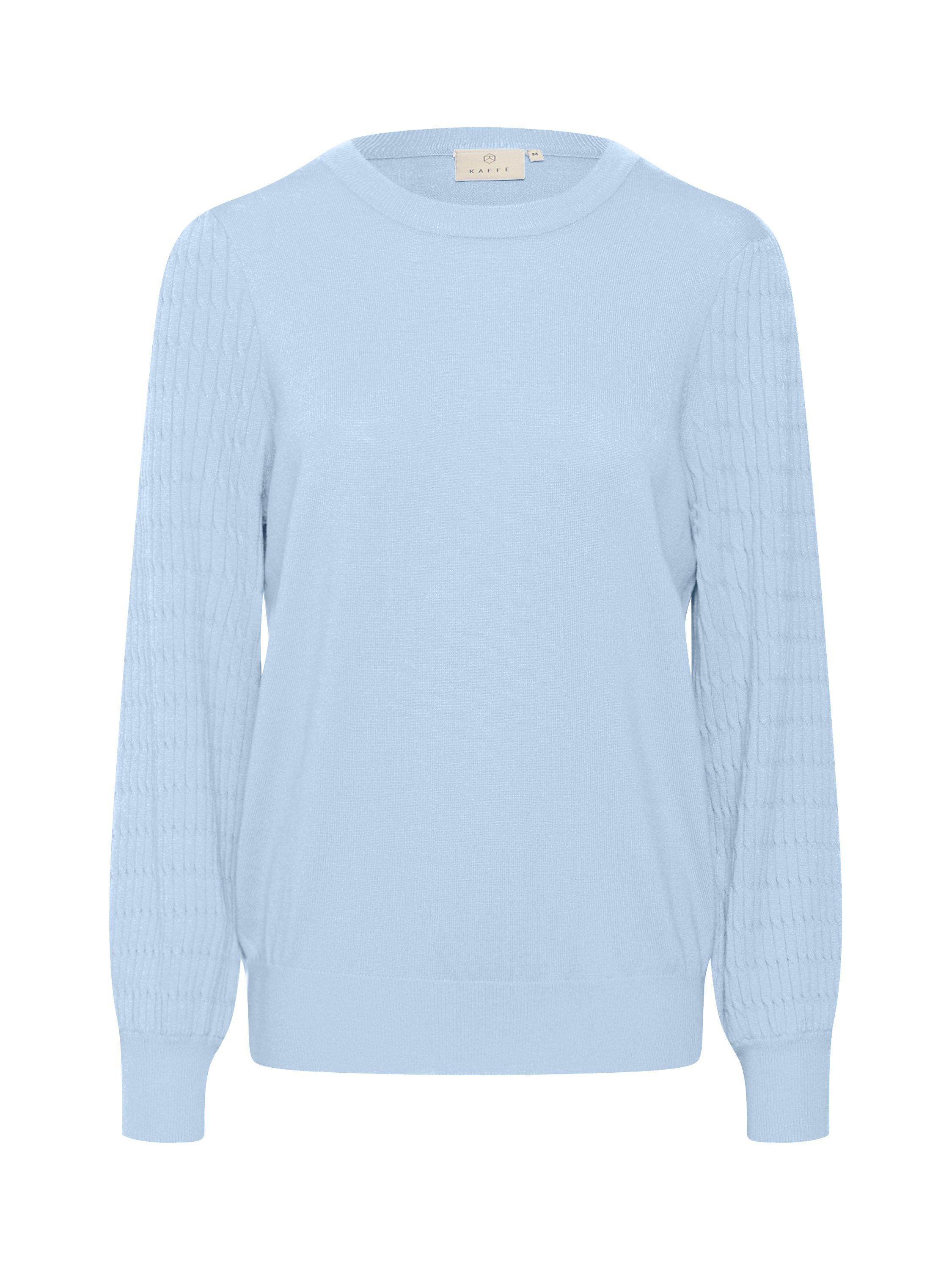 The nanna pullover is a simple knit top, that will look great with anything. It has a round neck and a regular fit, and it is cut at the hips. The sleeves are long and loose, and they are made in a patterned knit and are gathered in wide knit cuffs.