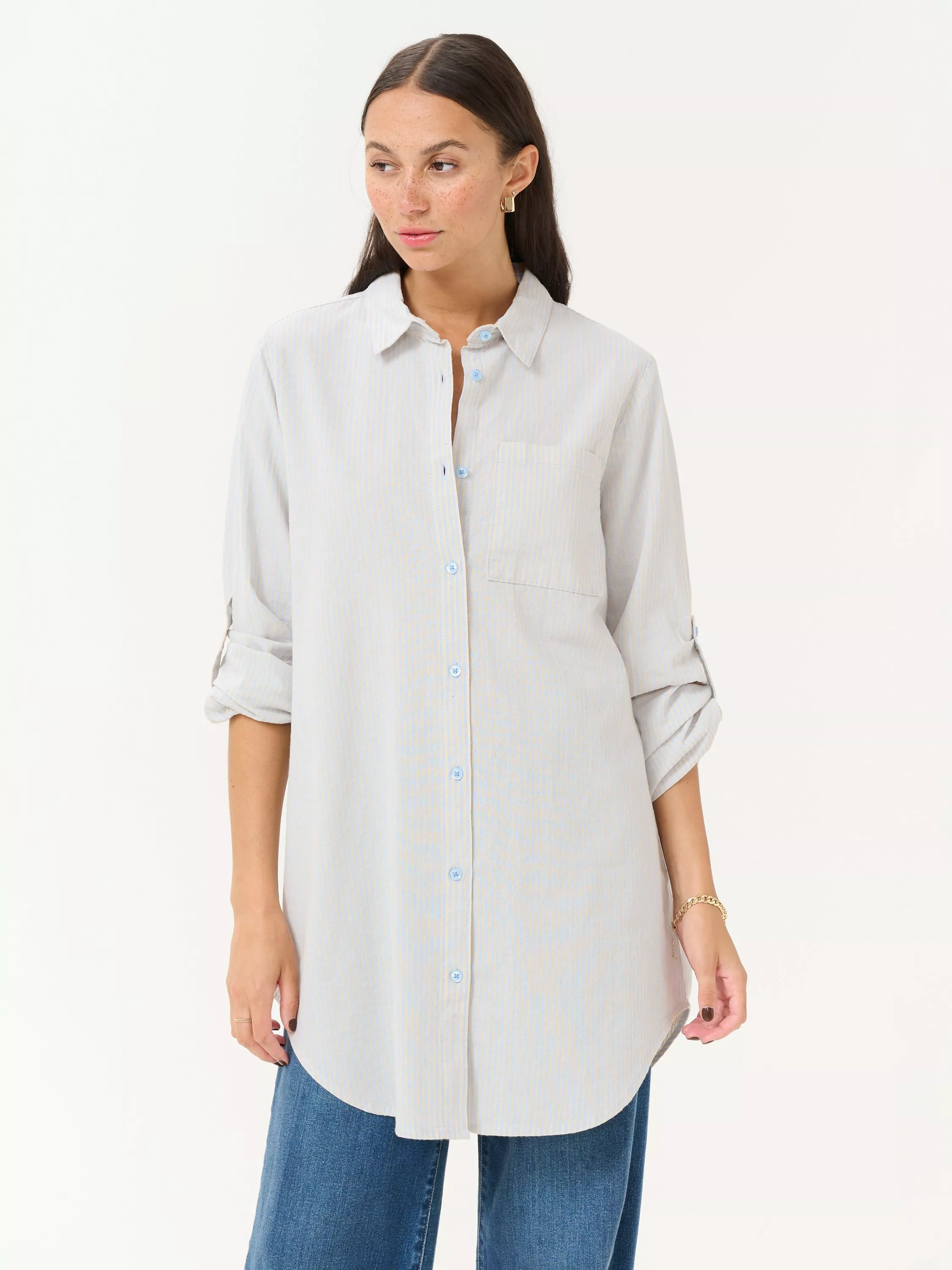 Updating your collection, this cotton longline shirt by KAFFE flatters the figure with its striped pattern. Framed with a spread collar and long loose sleeves with buttoned roll tabs, it's a relaxed and easygoing piece with lots of styling options.