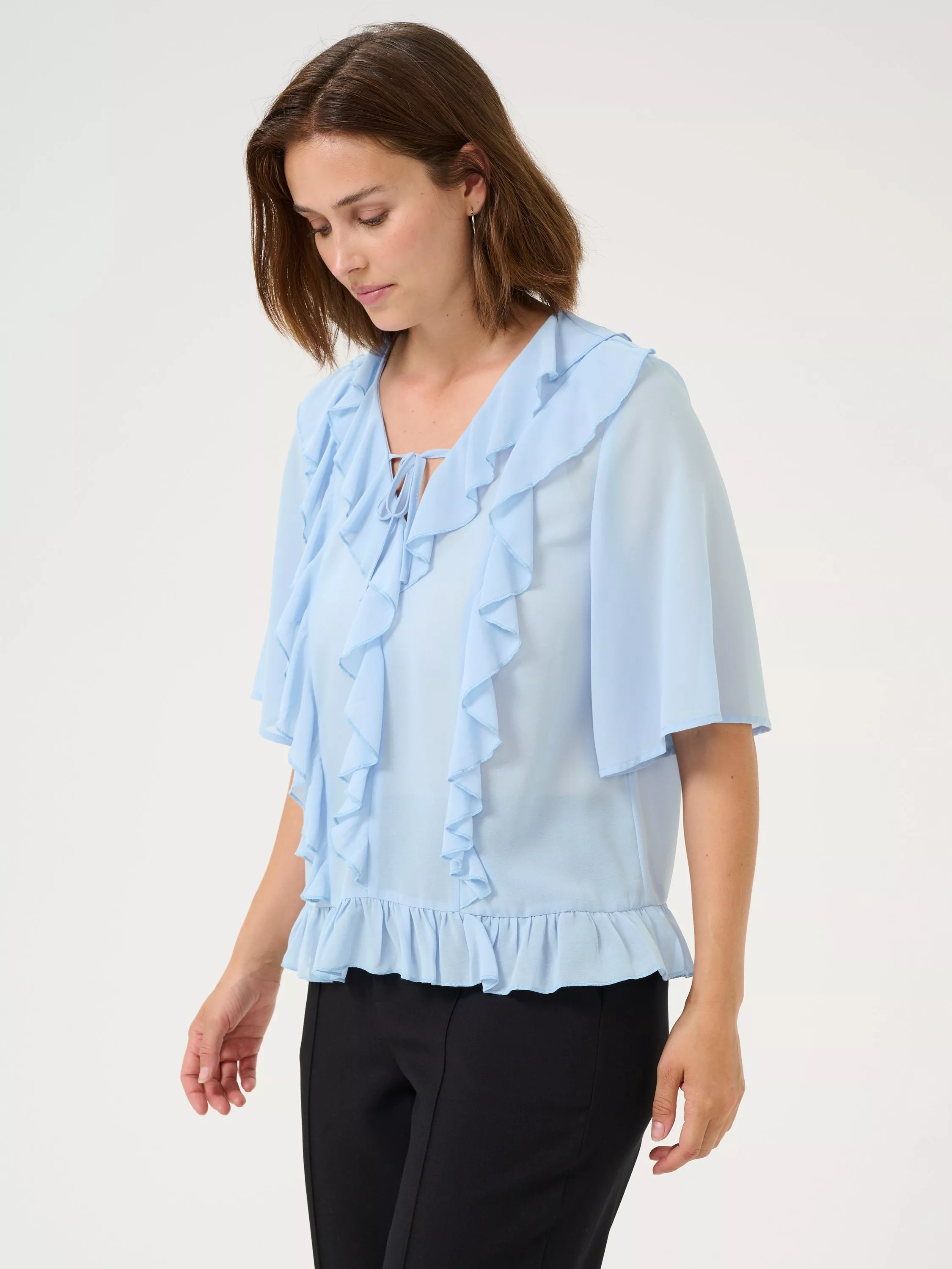 An effortless choice, this ruffled blouse from KAFFE will give your wardrobe the refresh it needs. With a flattering v-neckline and short sleeves, it is made from a soft semi-sheer fabric.