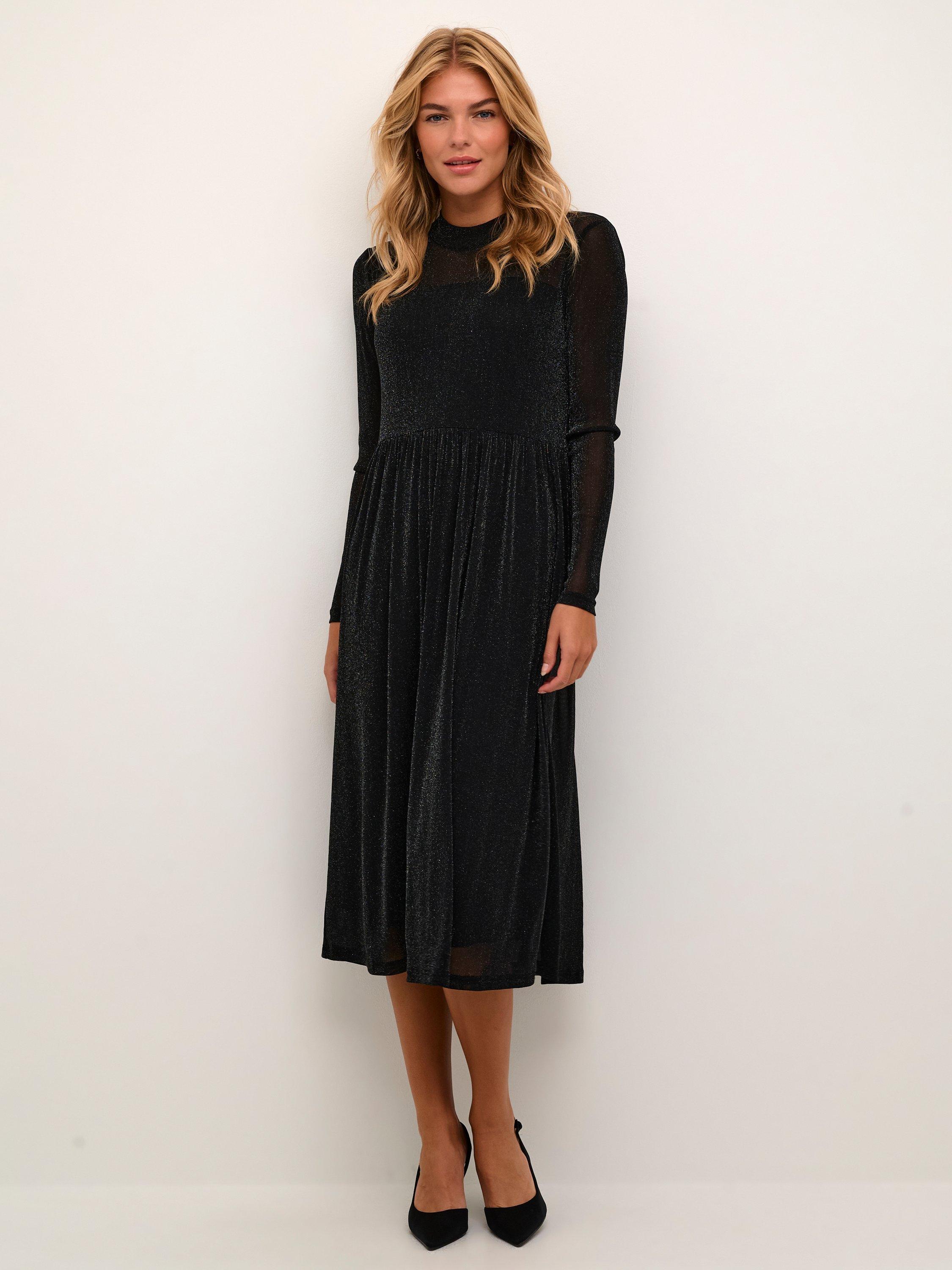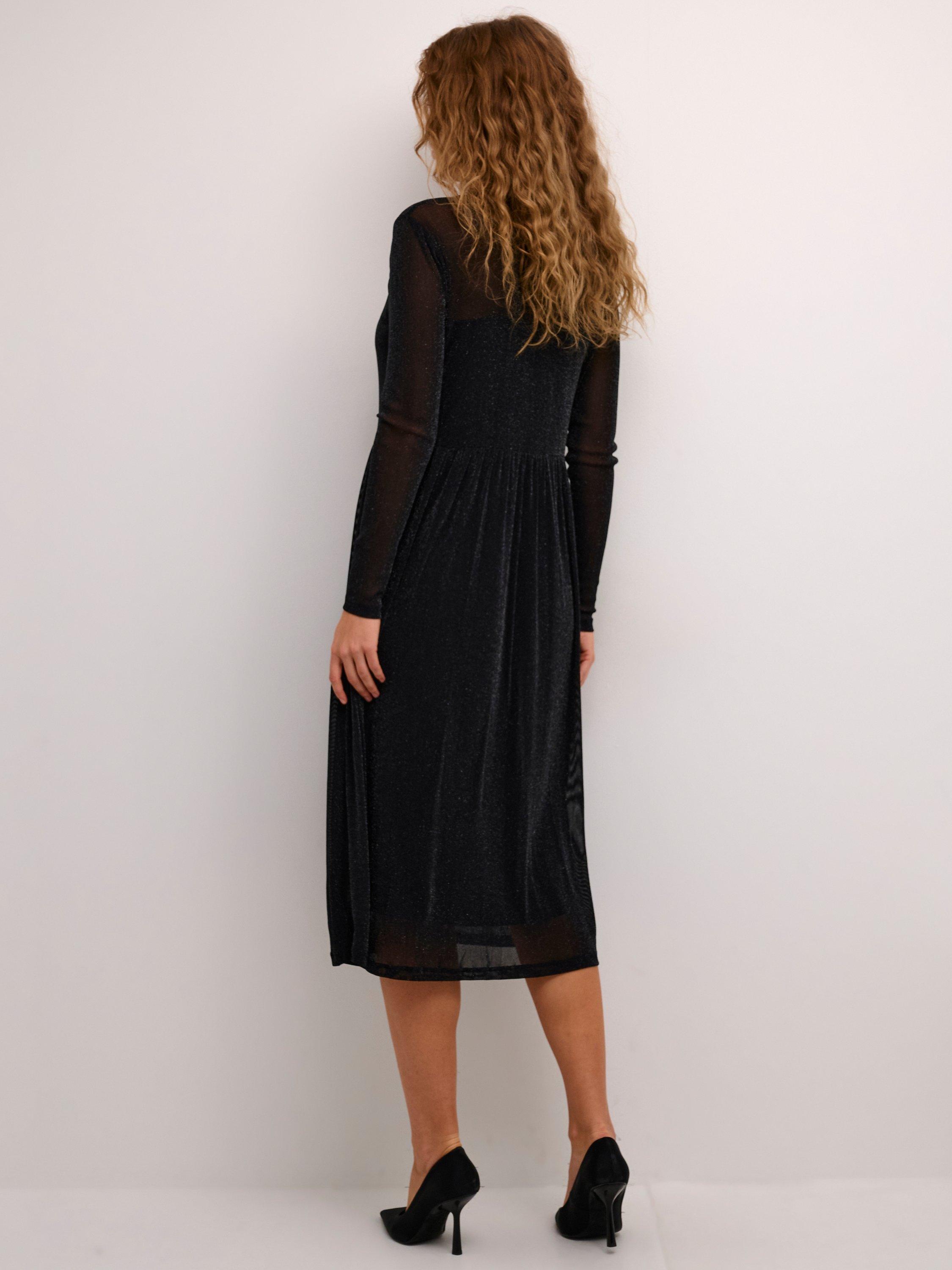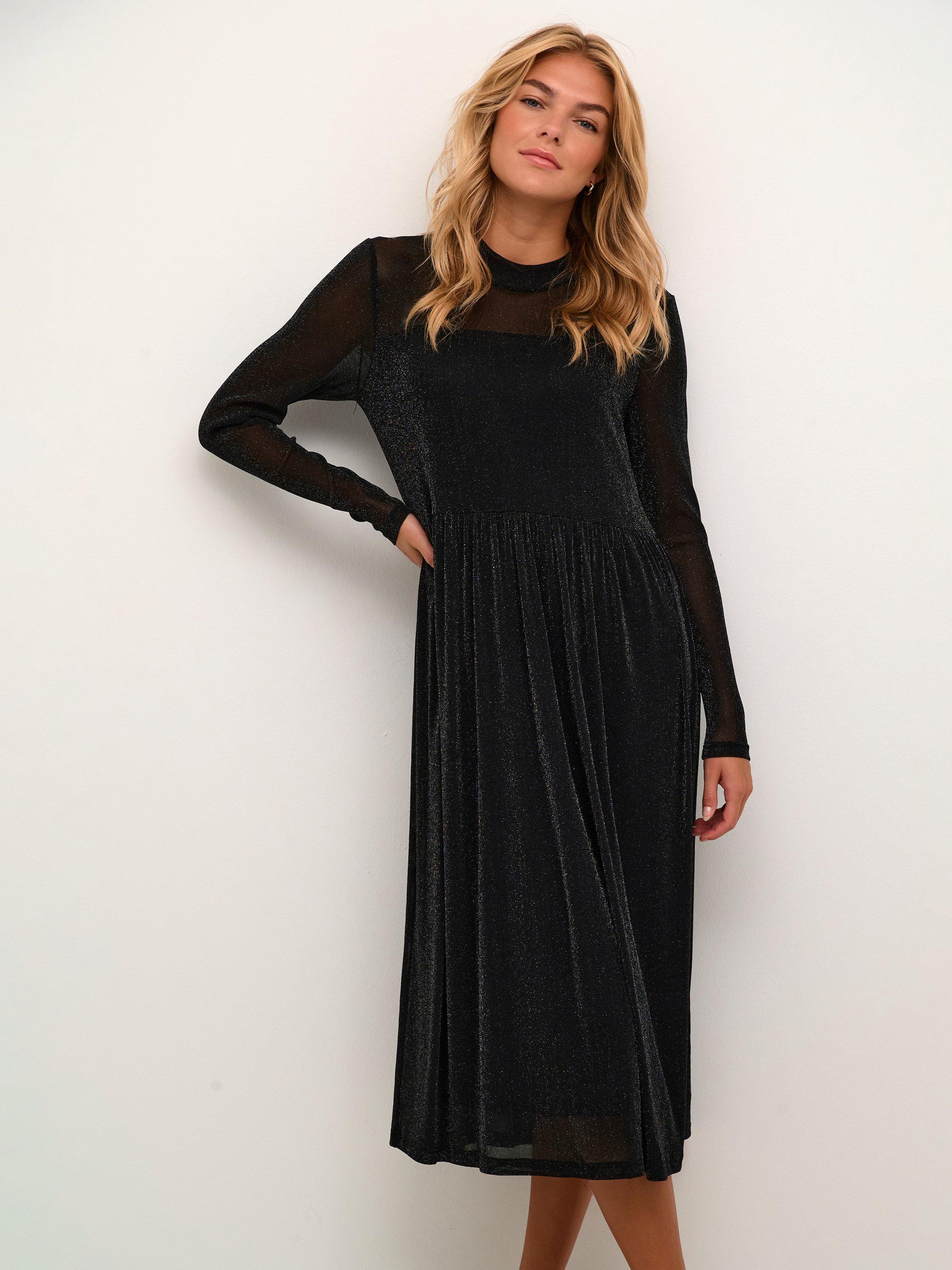 The olga dress is a sparkly and flattering mesh dress, that will brighten up any event. It has a round neck and a fit and flare silhouette, and it is made in a stretchy glitter mesh. The sleeves are long with a slim fit, and the dress comes down to the mid-calves and has a strapless lining.