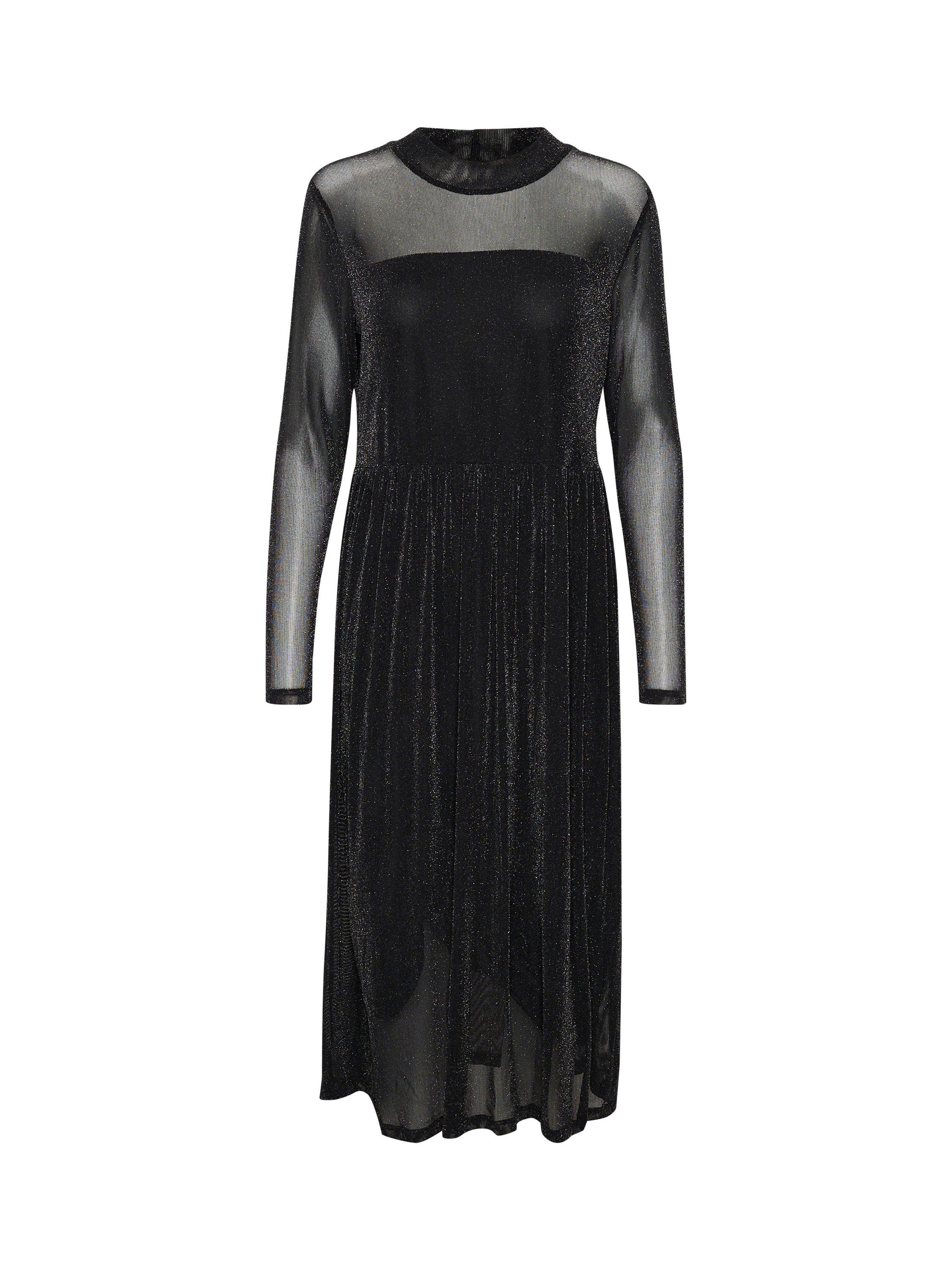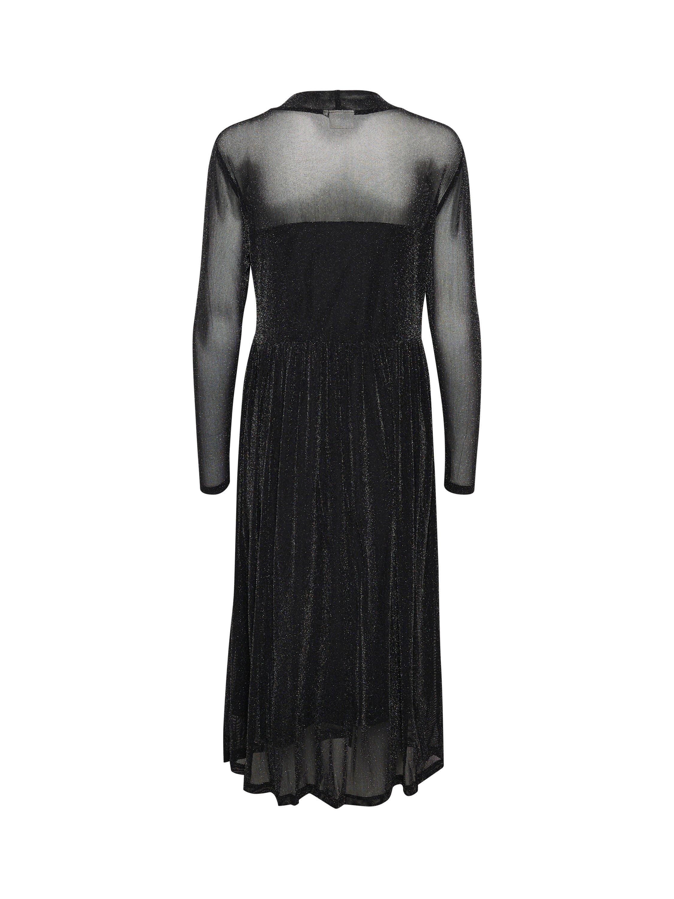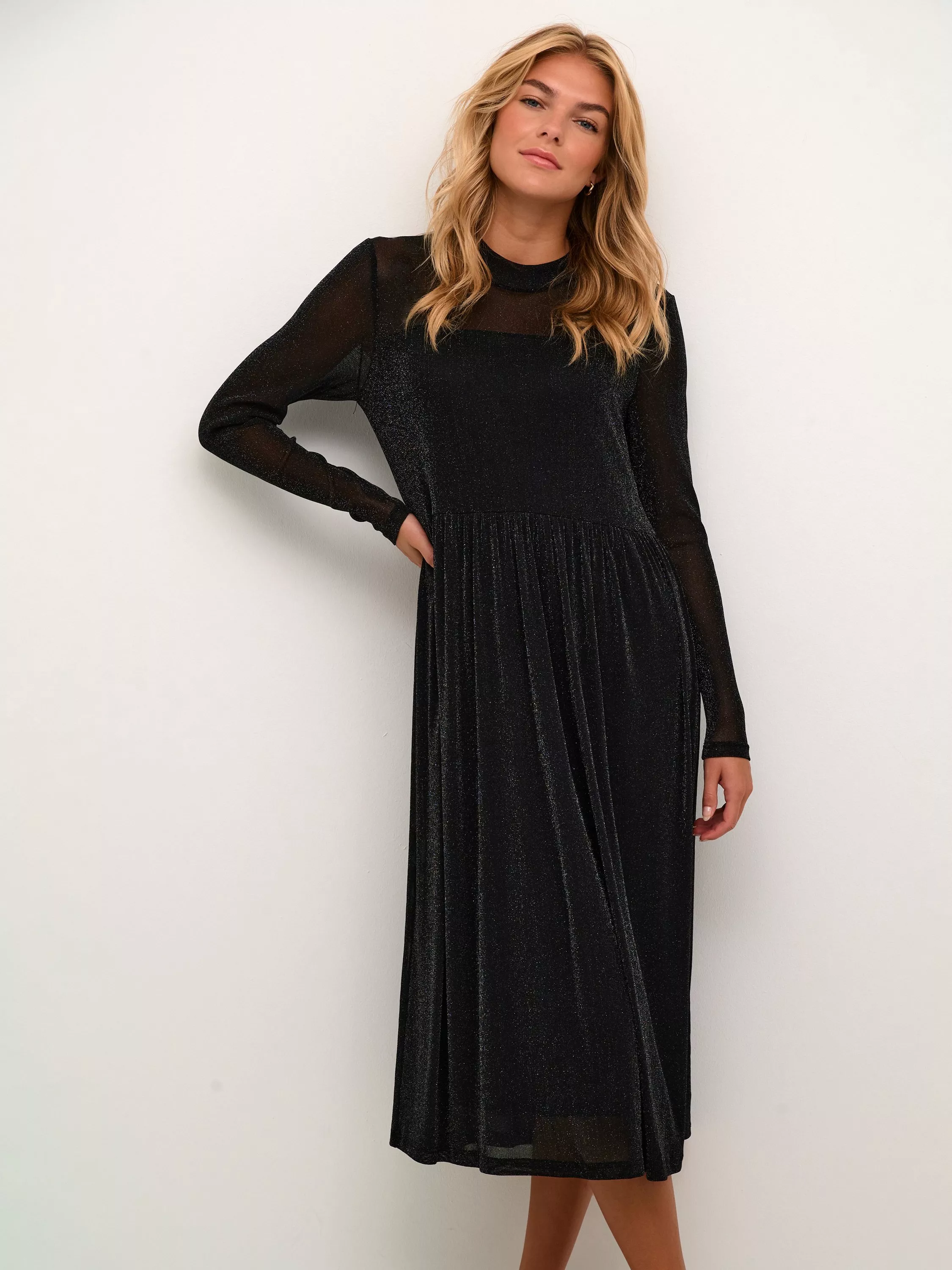 The olga dress is a sparkly and flattering mesh dress, that will brighten up any event. It has a round neck and a fit and flare silhouette, and it is made in a stretchy glitter mesh. The sleeves are long with a slim fit, and the dress comes down to the mid-calves and has a strapless lining.