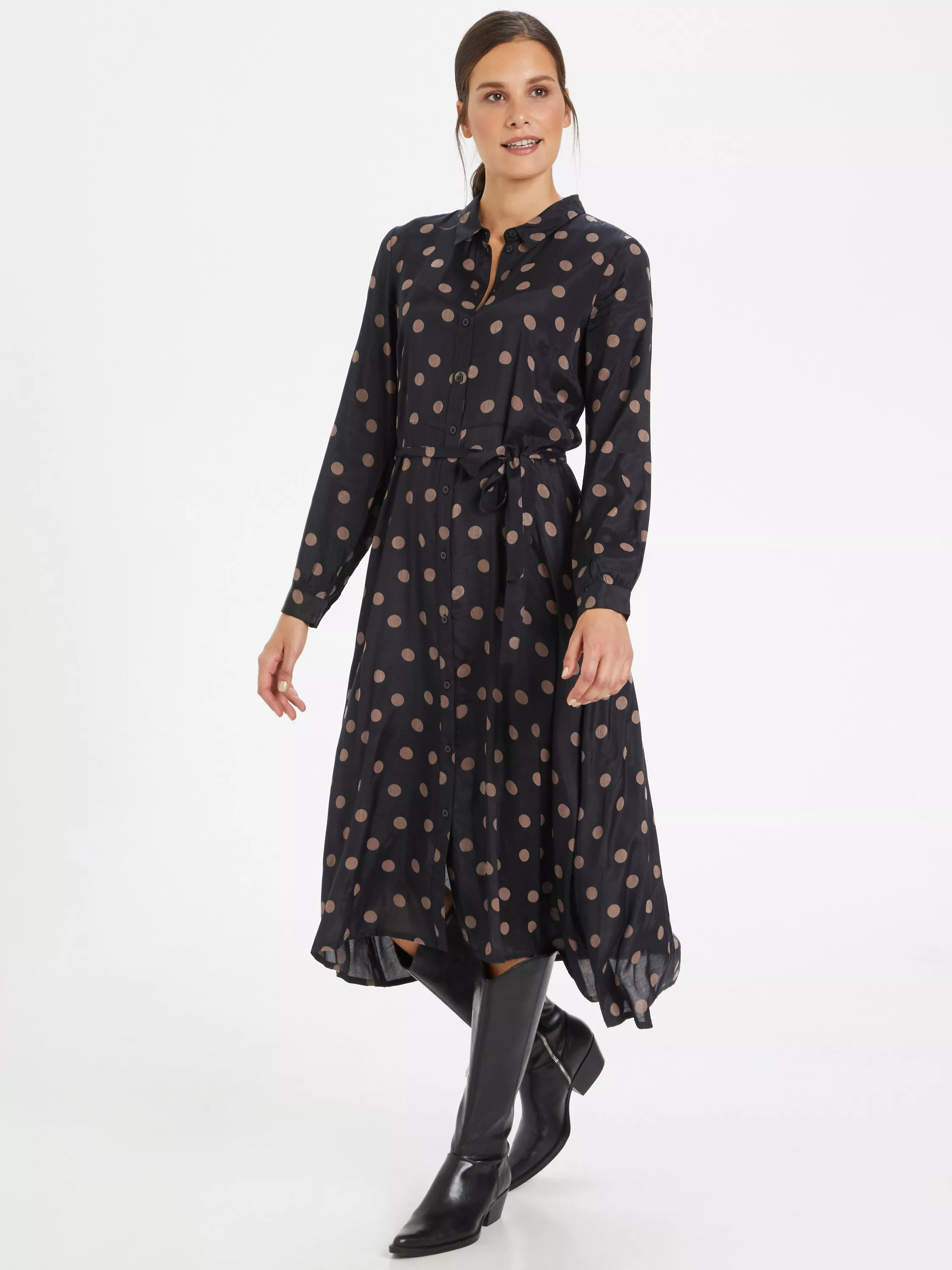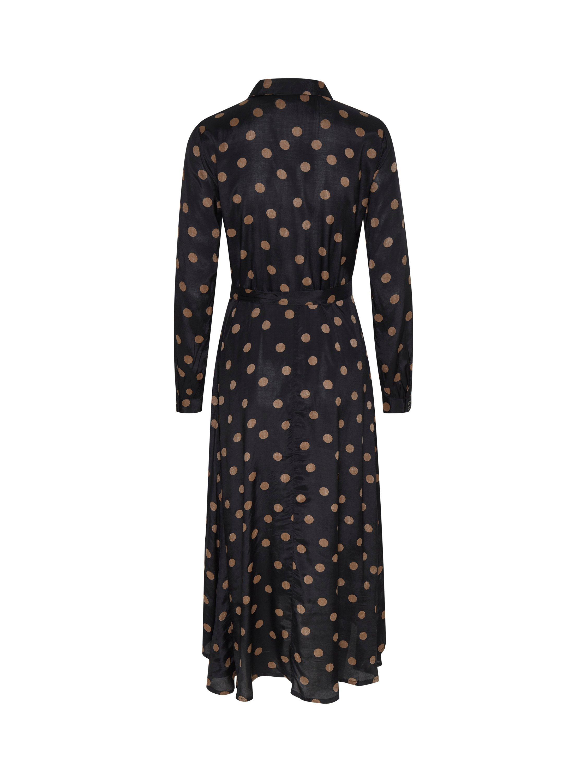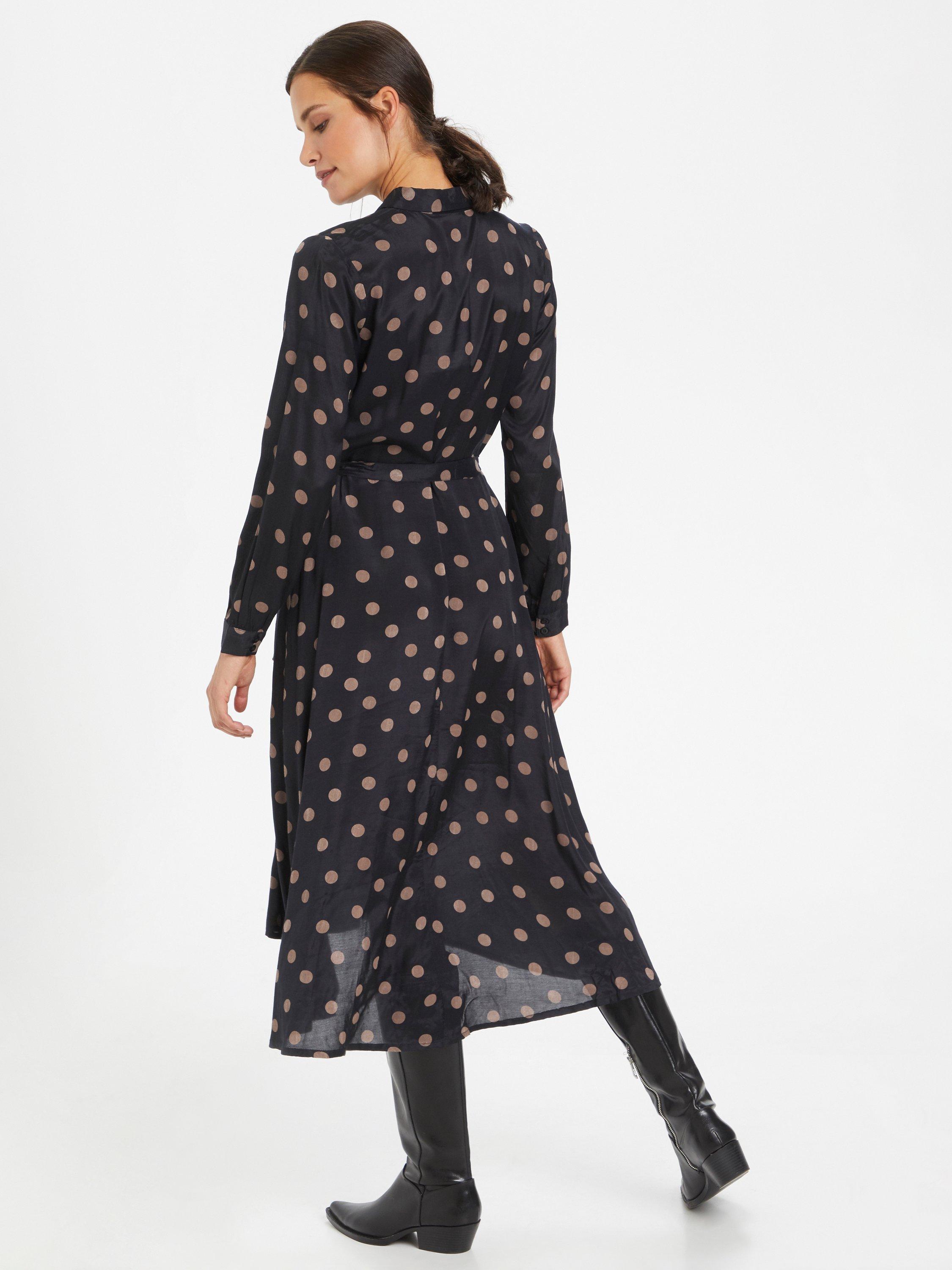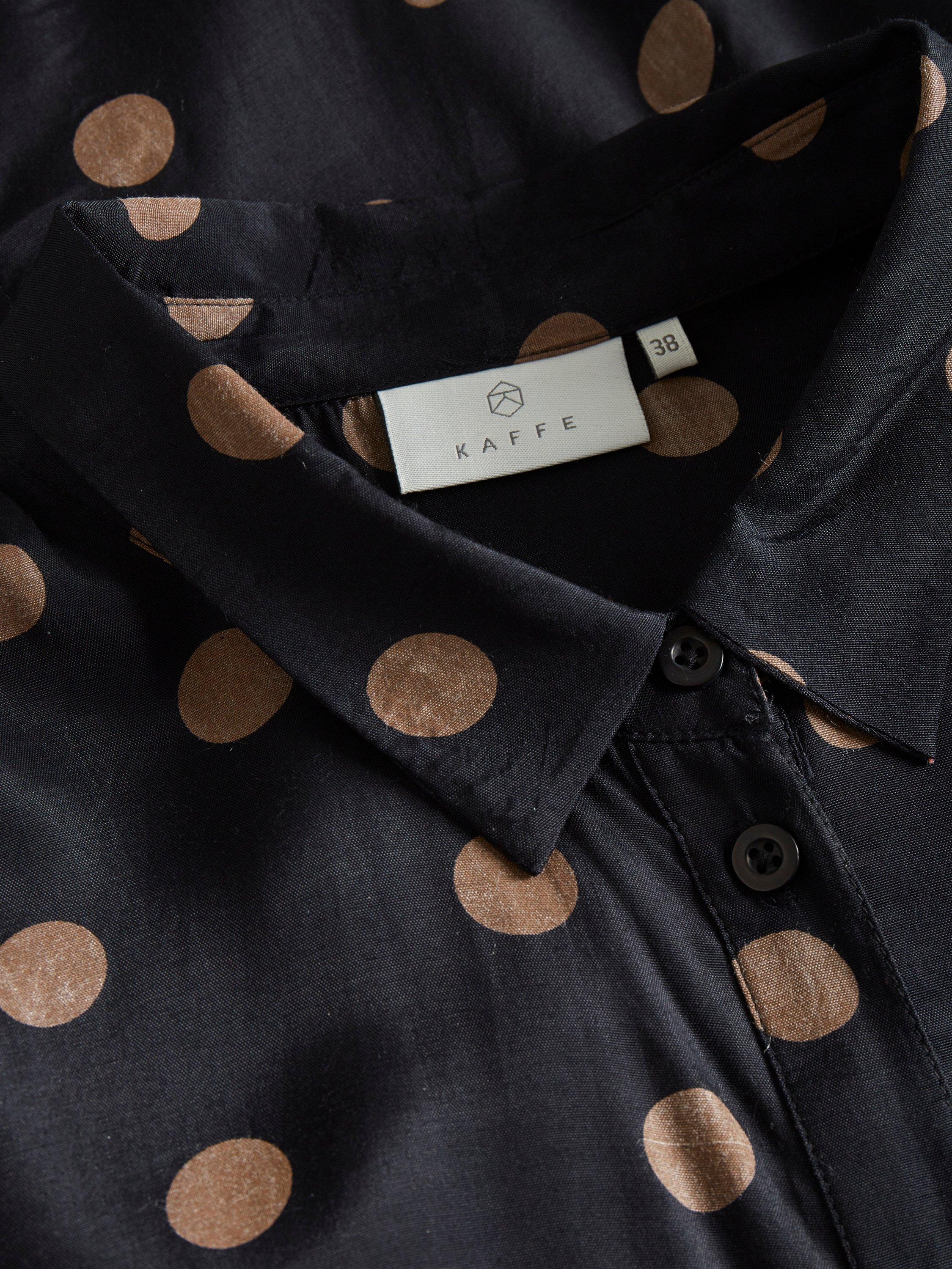 This cute dot dress from KAFFE has long sleeves and midi length with flowy bottom. It has a classic collar and buttons on the front. Its tie waist beautifully flatters your figure. The long tunic with a sleek sheen is minimalistic and elegant. The back is slightly longer.