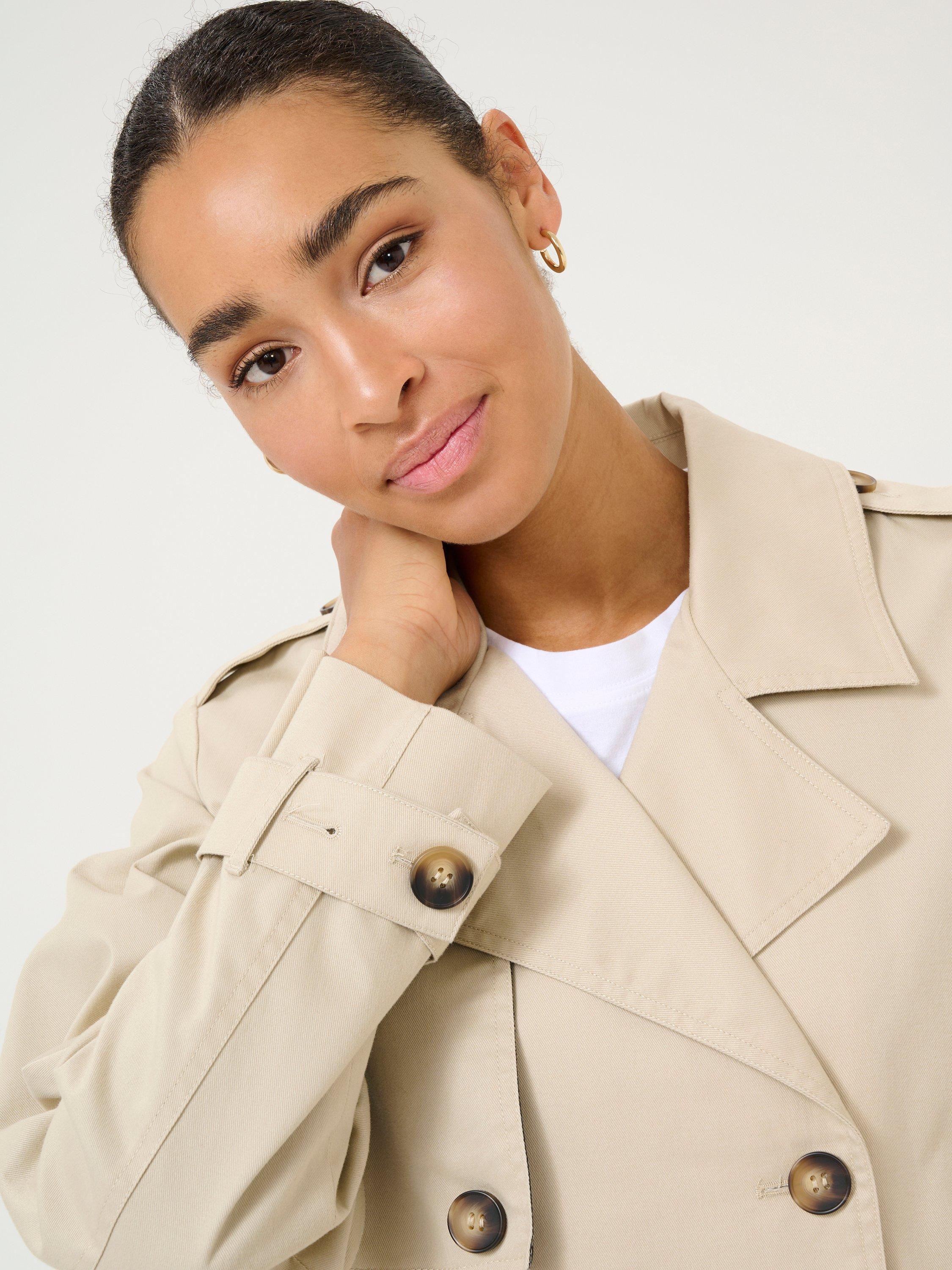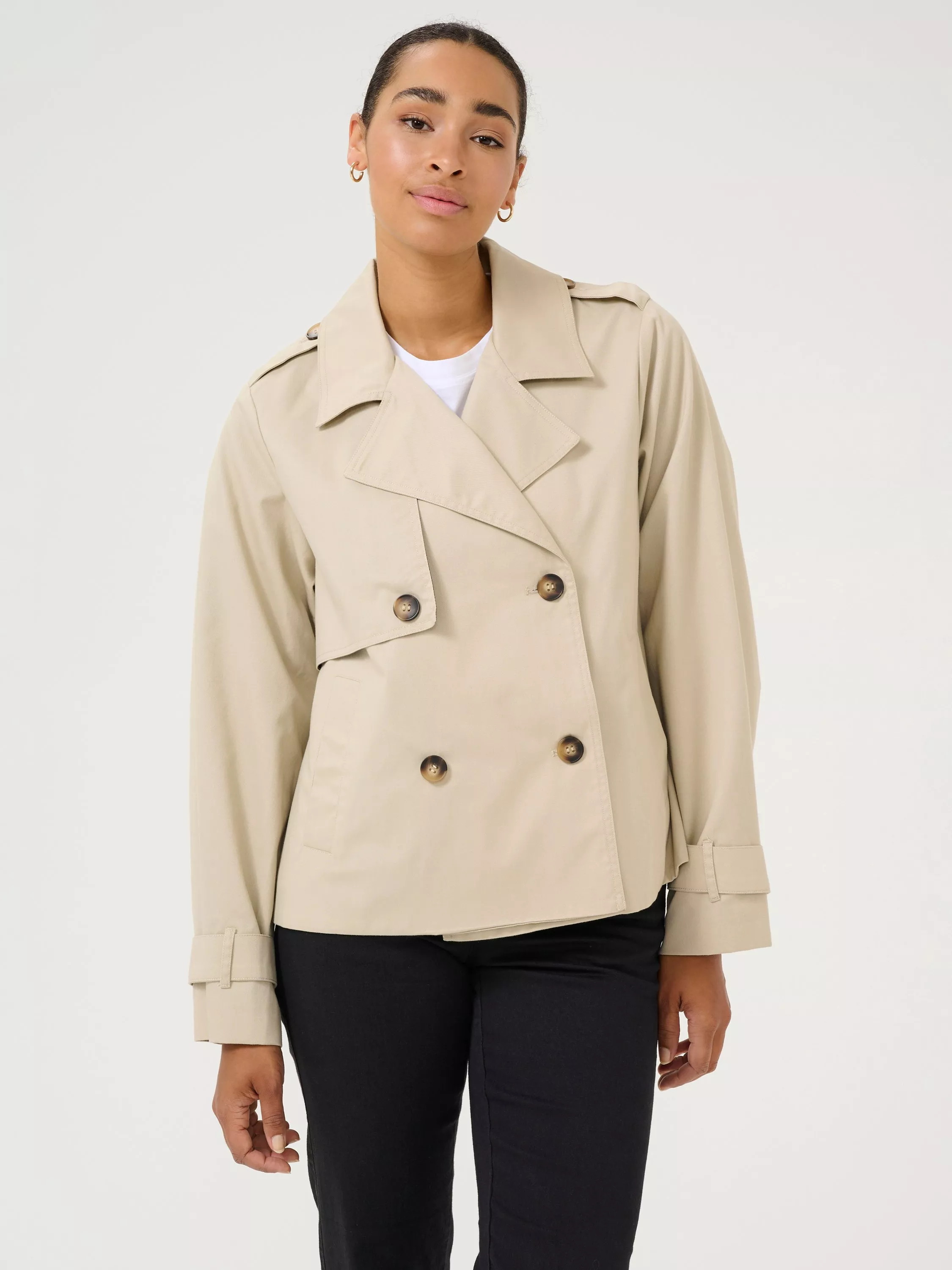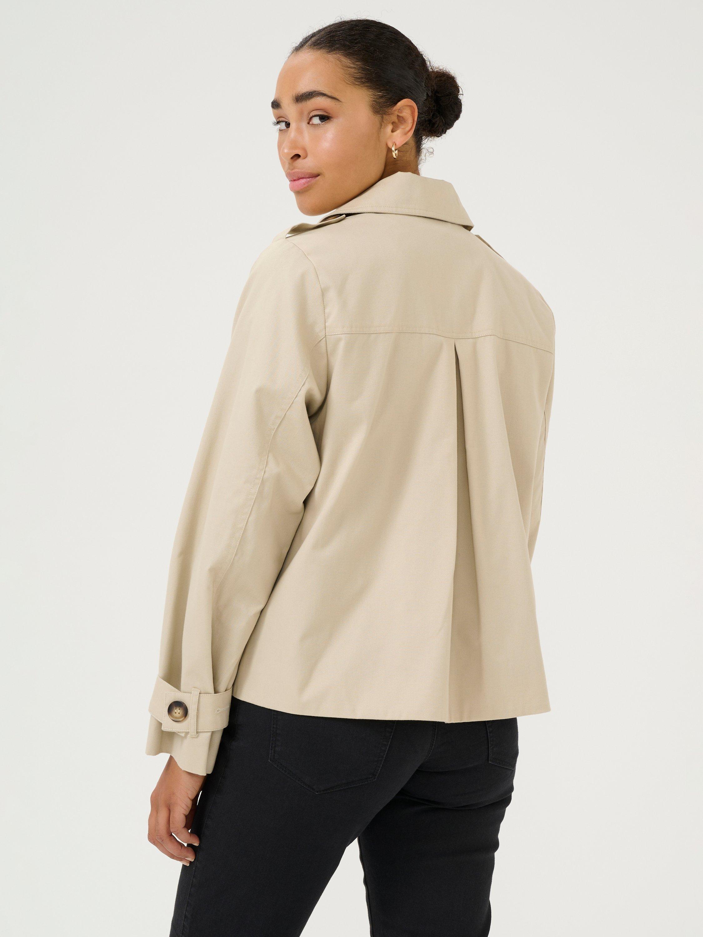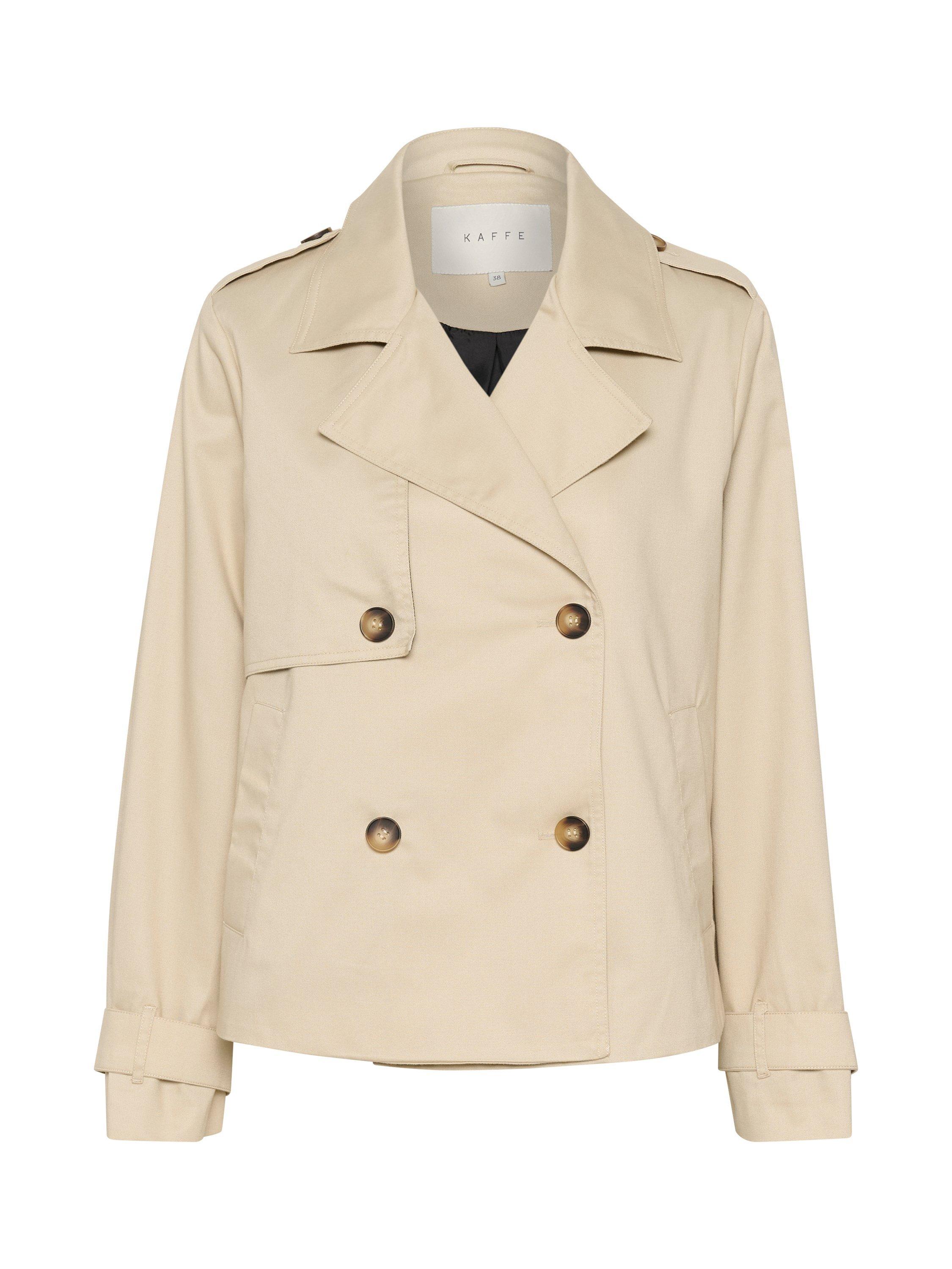 The patricia jacket is a timeless piece of outerwear that will look great with any outfit. It is double-breasted with a notch lapel and a regular fit, and it has buttoned shoulder tabs and a wind flap on the right side. The sleeves are long with buttoned sleeve tabs, and the jacket has slanted front pockets and is cut at the hips.