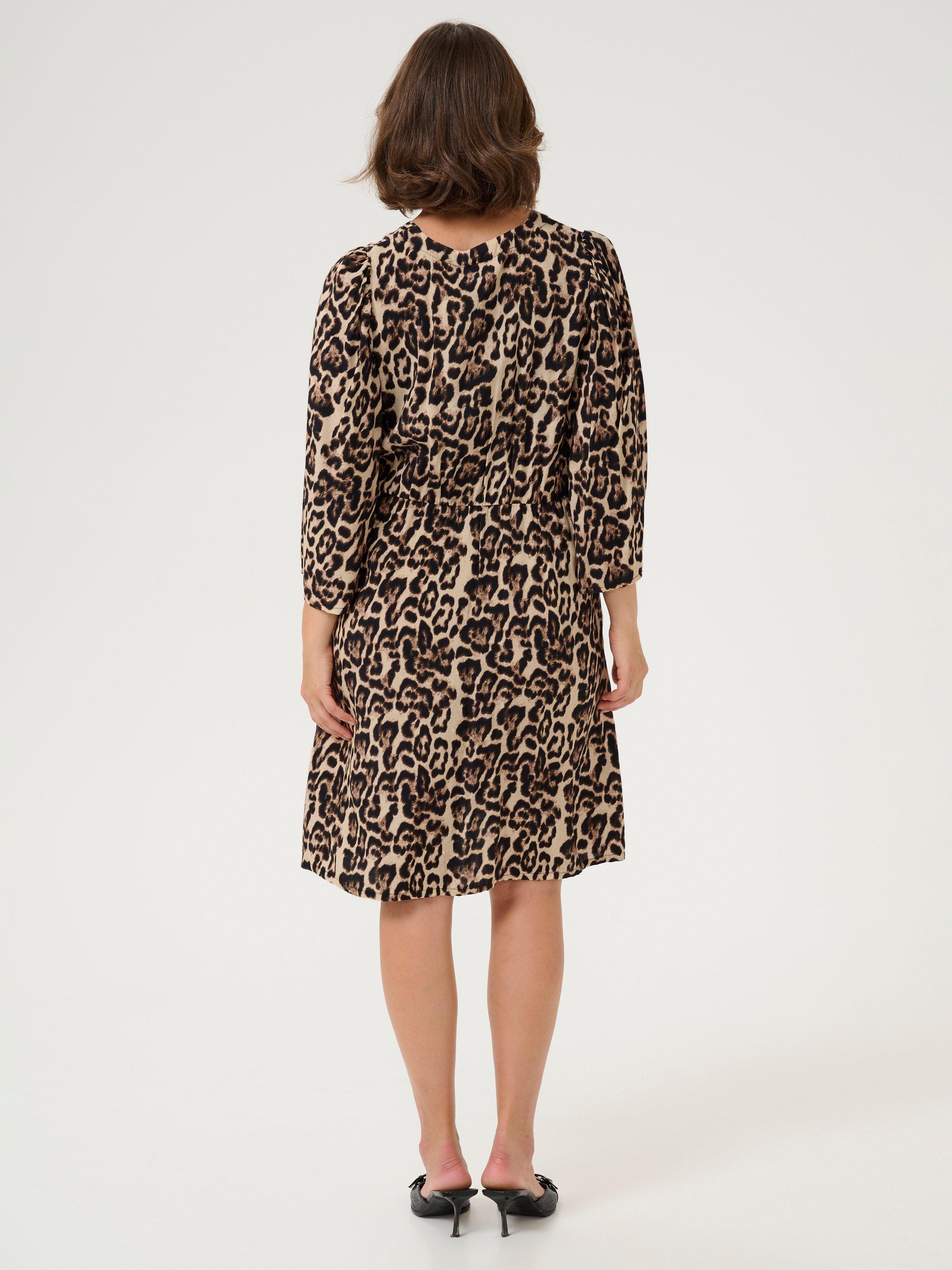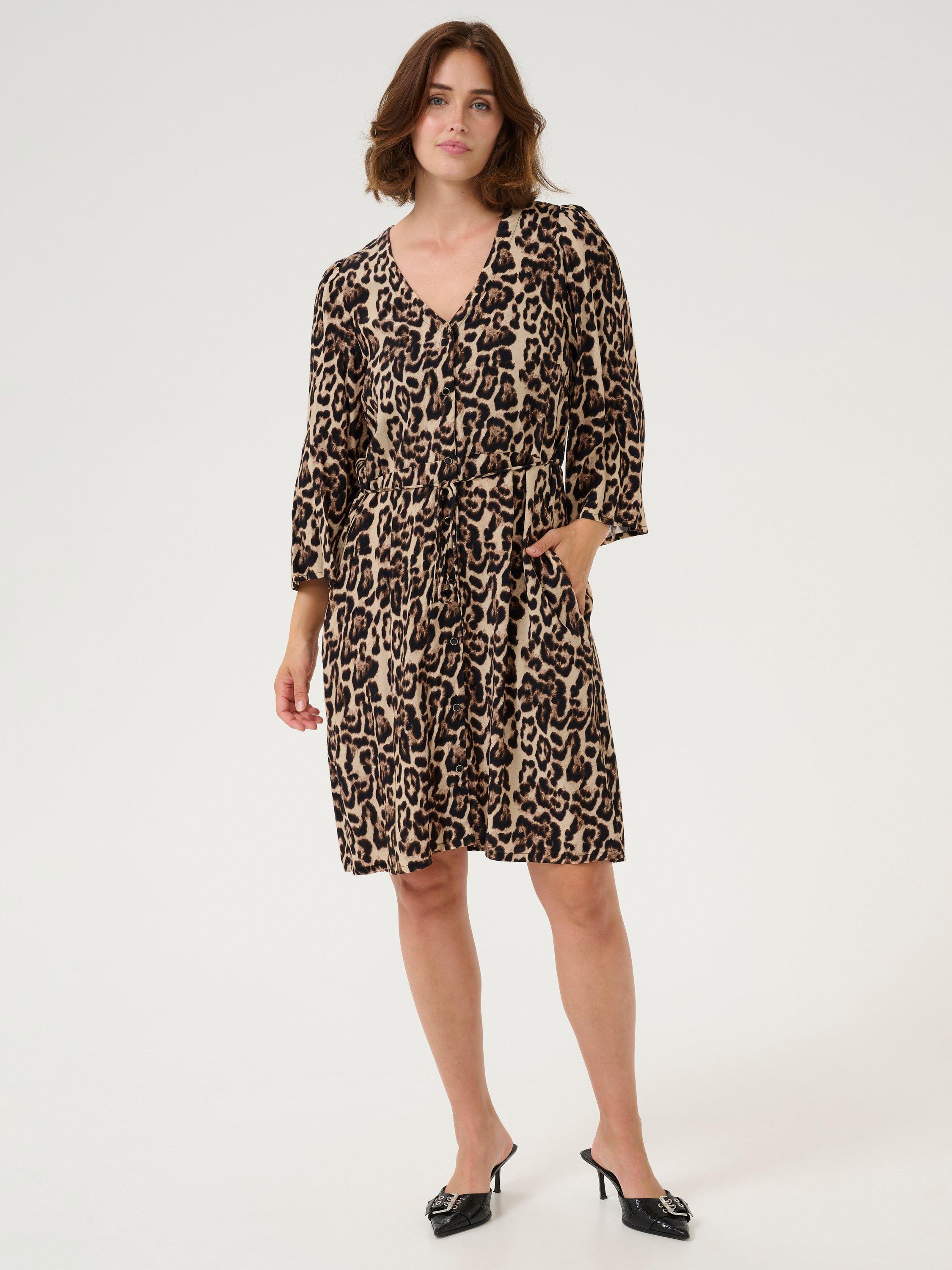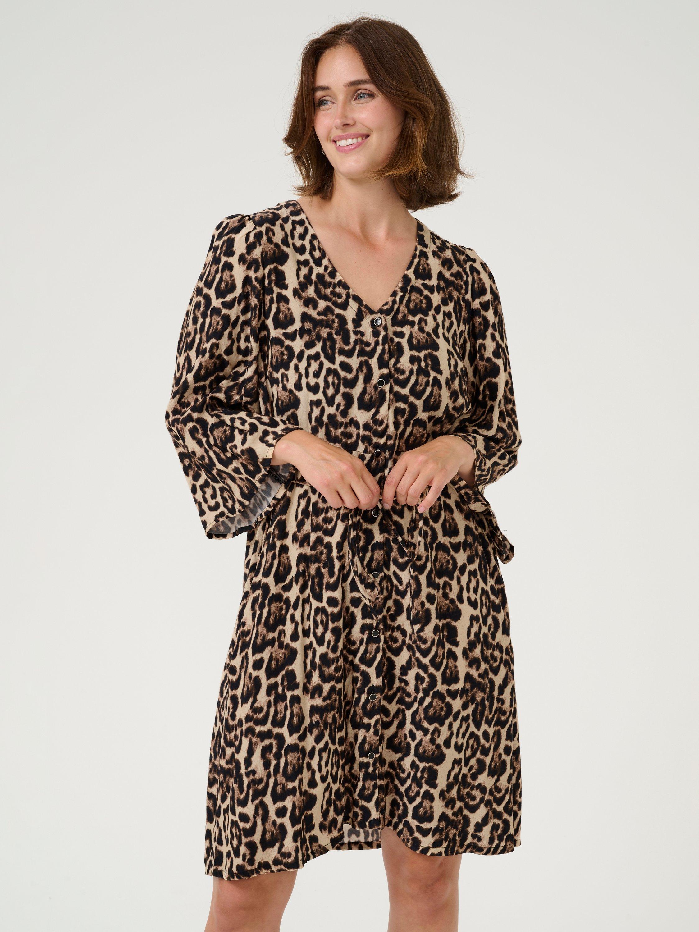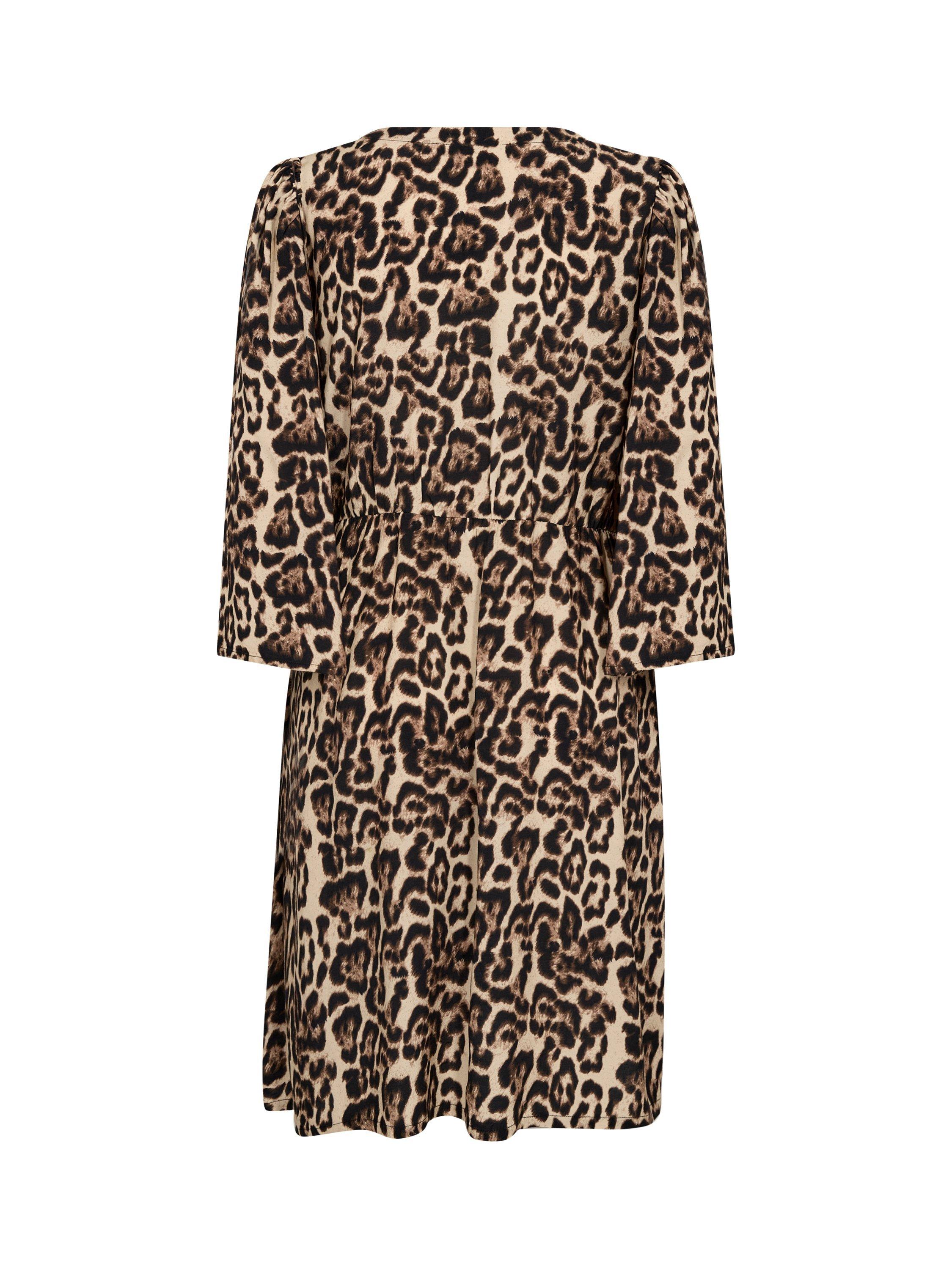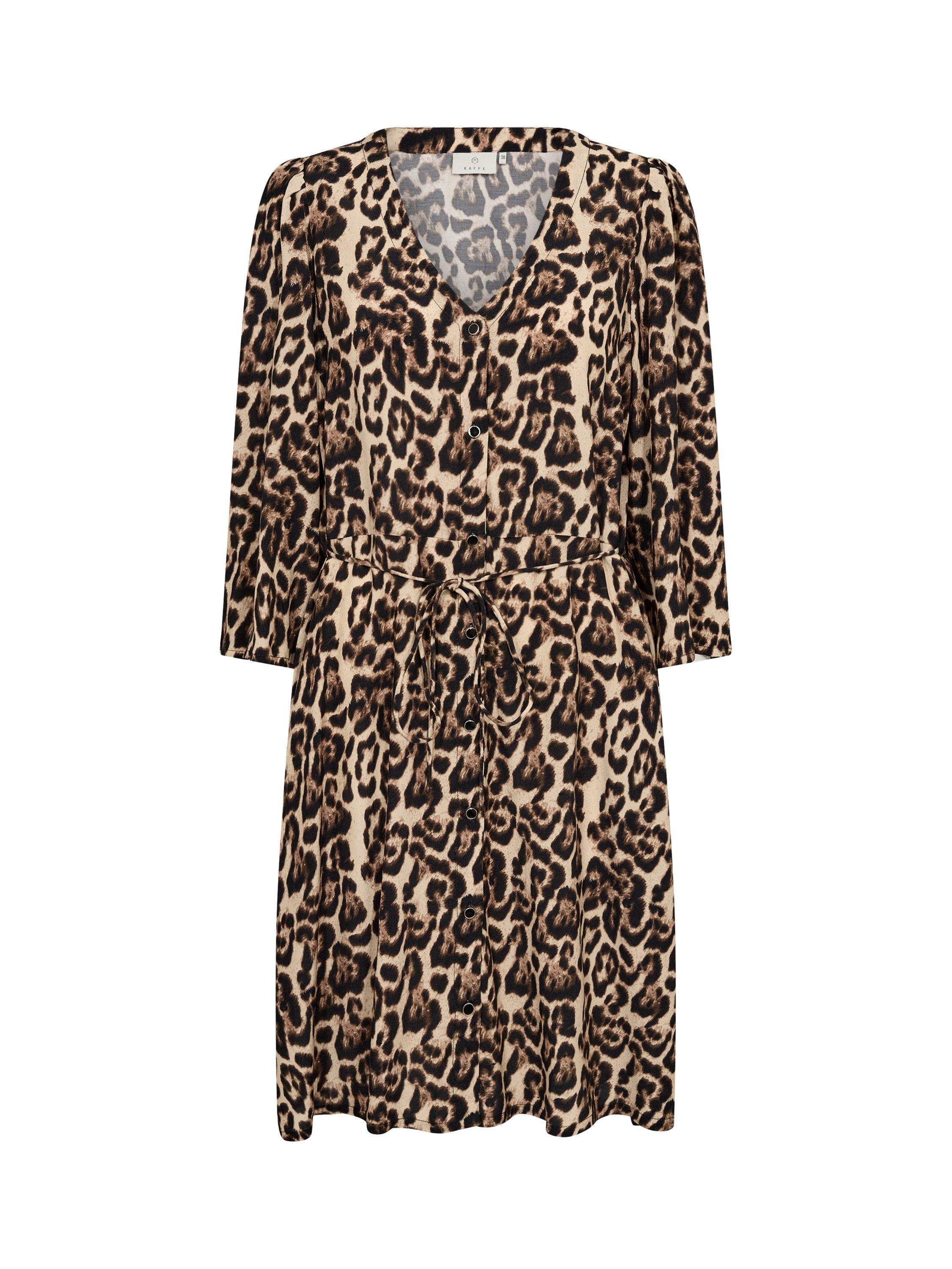 In a fit and flare with thanks to a self-tie belt detail at the waist, this knee length dress from KAFFE is crafted from an airy viscose fabric. With a universally flattering v-neckline and full-length sleeves, this style has a can't go wrong leopard print.