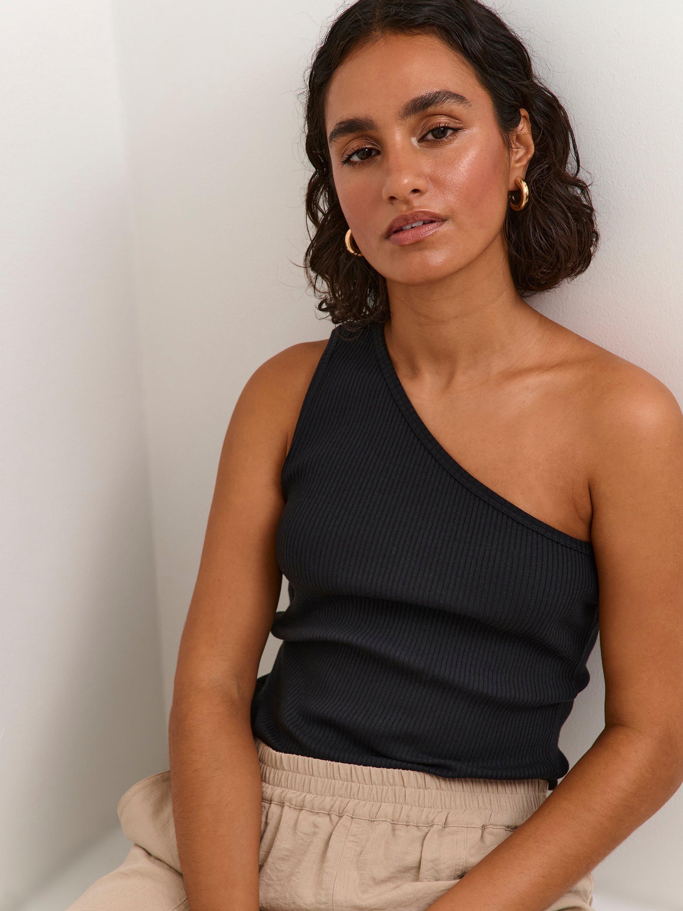 The Pia top is a simple style in a soft and stretchy rib jersey. It is a one-shoulder top with a diagonal neckline and it has a slim fit. The top is cut at the hips, and it's guaranteed to add a cool touch to any outfit.