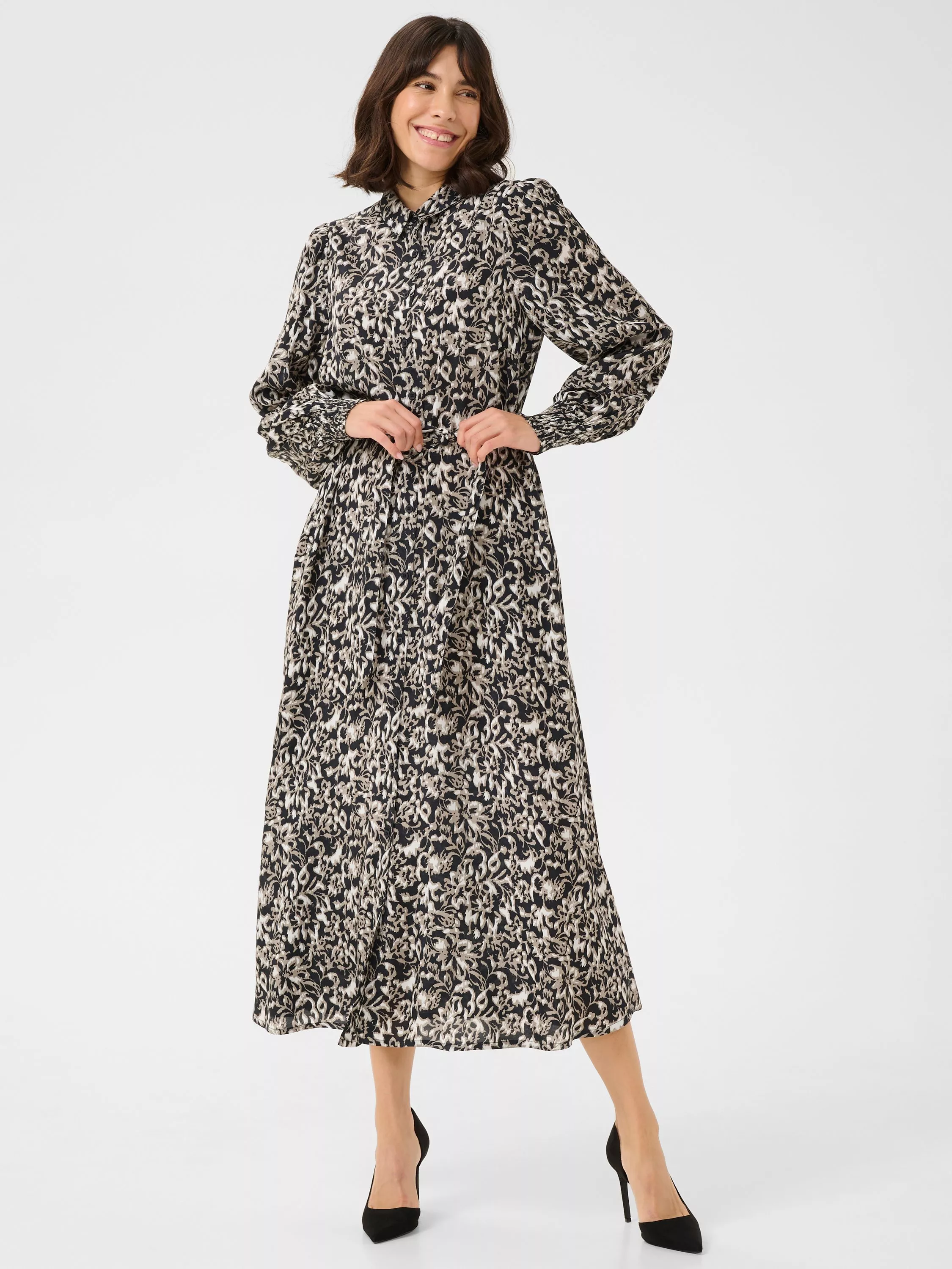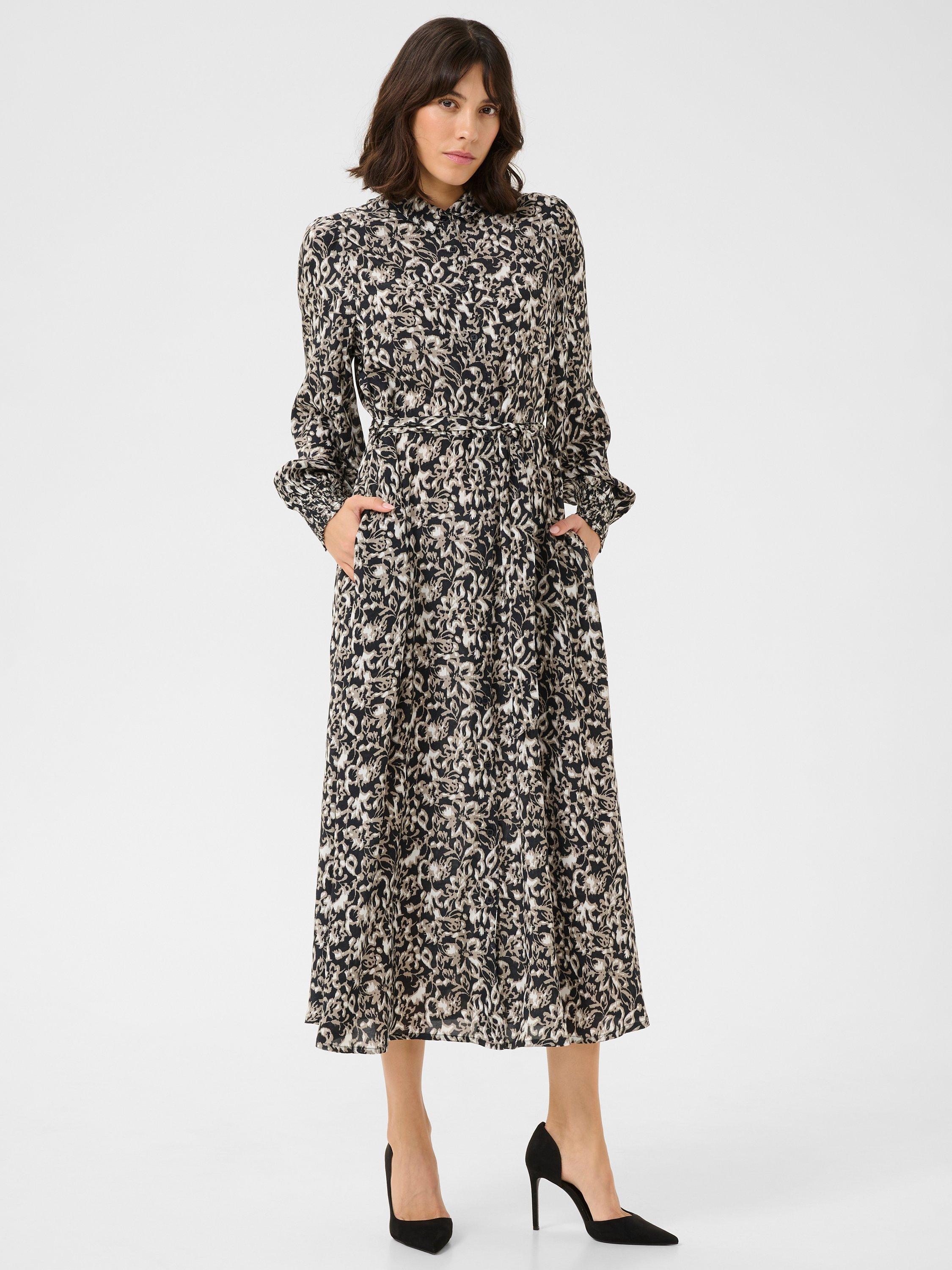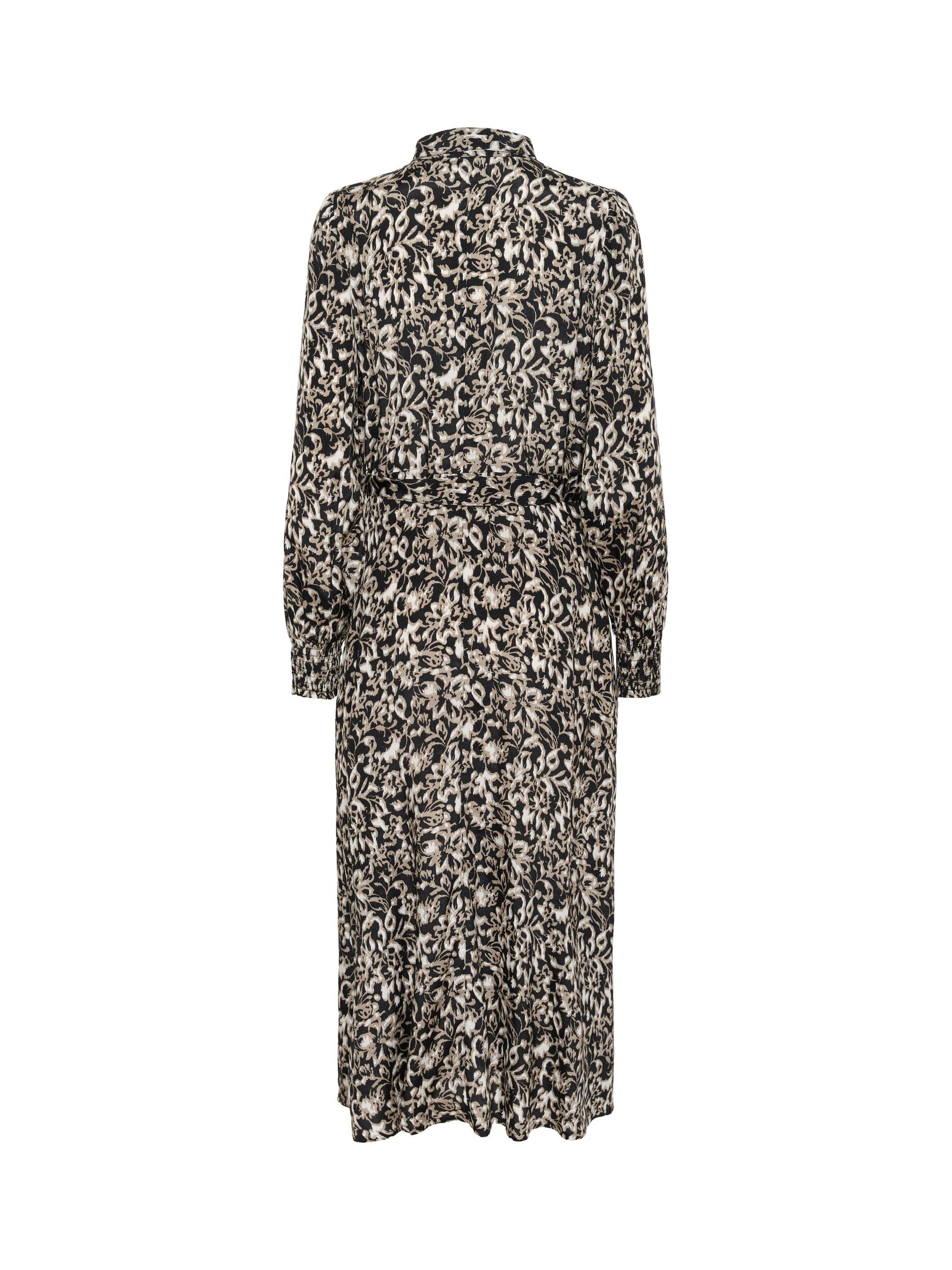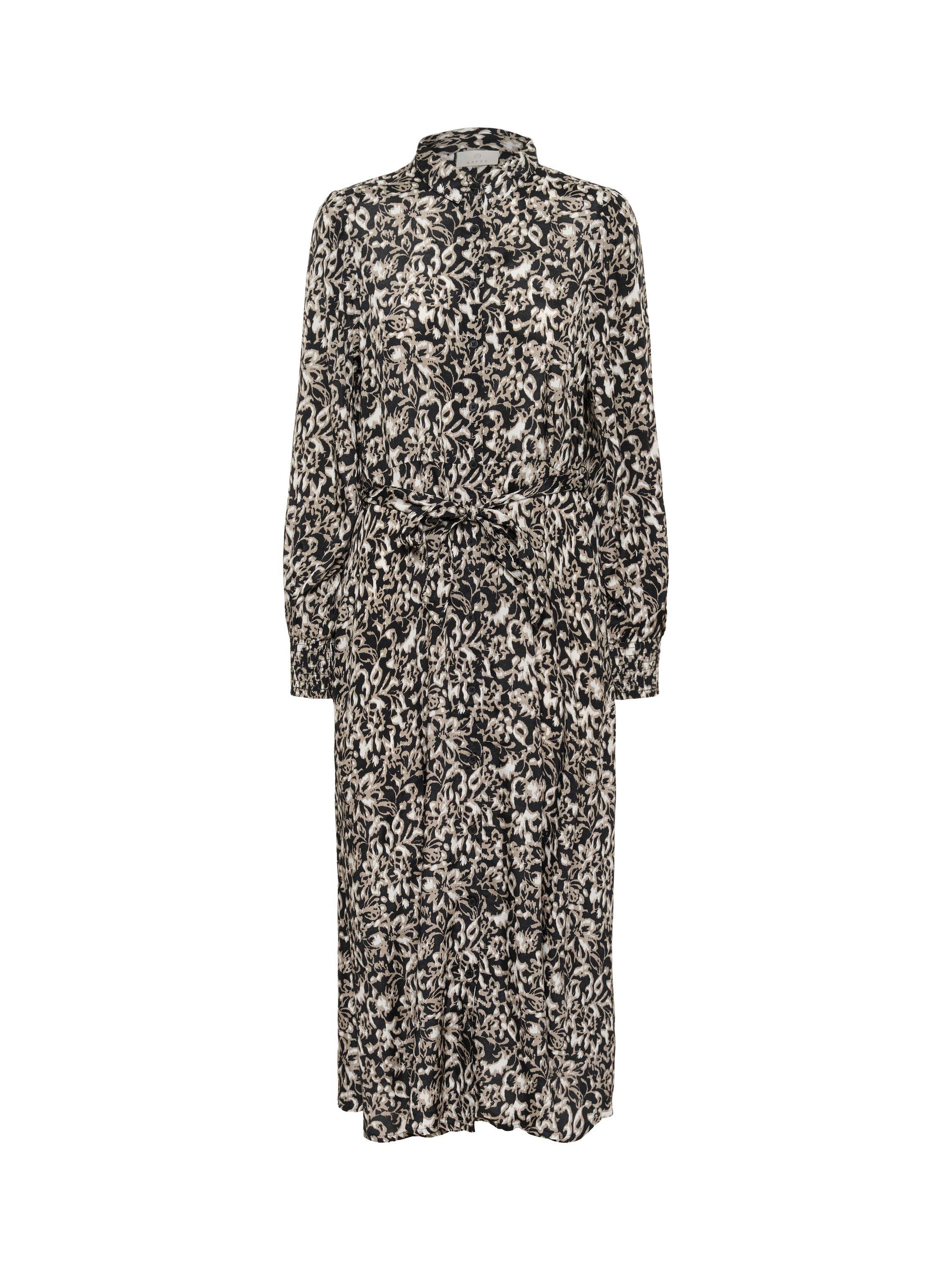 The pollie dress is an elegant shirt dress in a beautiful print. It has a spread collar and button fastening, and it comes down to the ankles. The sleeves are long and loose bishop sleeves with buttoned cuffs. The dress has a regular fit with a tying belt at the waist, and it has practical side pockets.