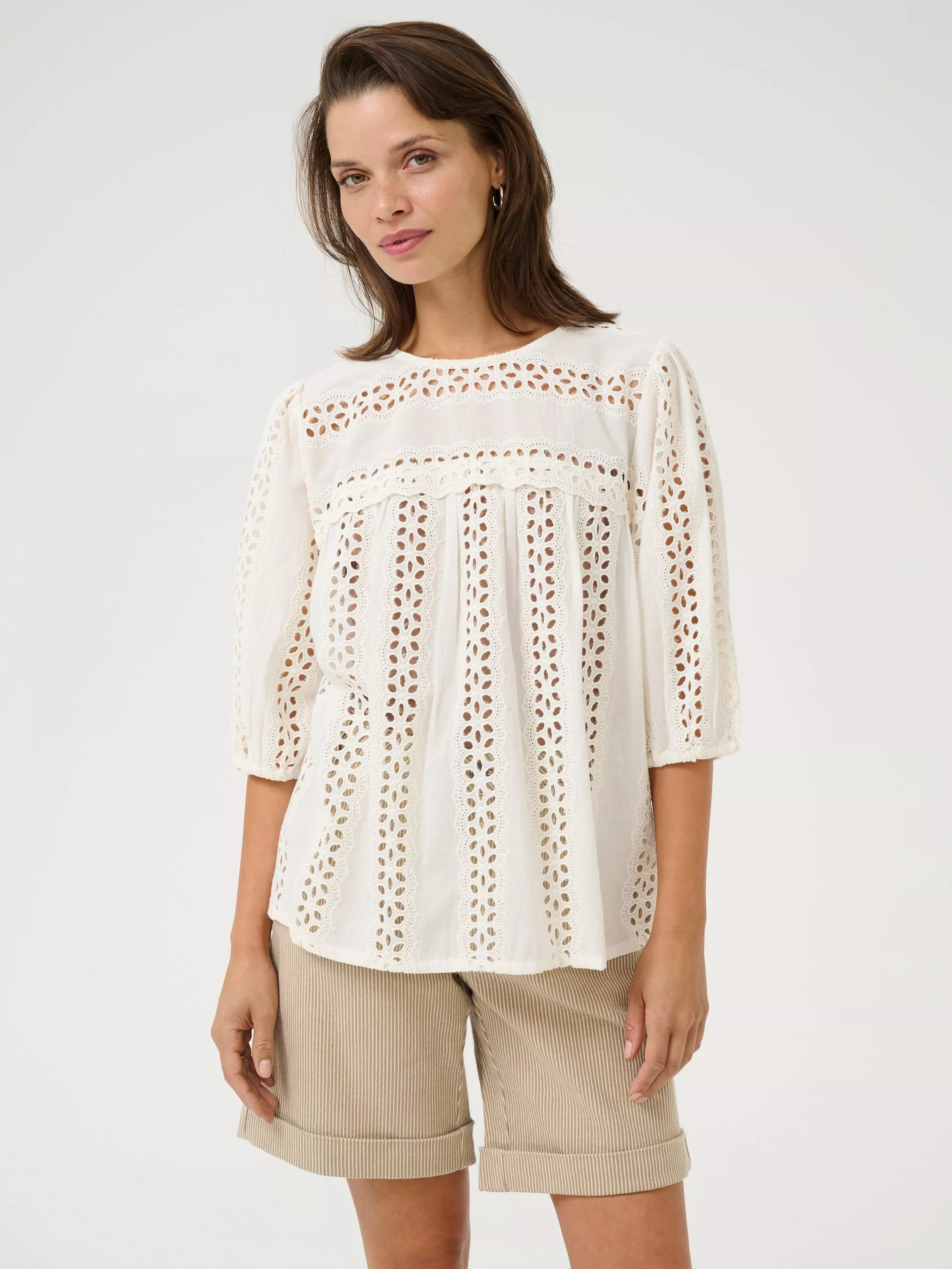 Perfect for both casual and formal occasions, this blouse from KAFFE allows for endless styling opportunities. Cut with a round neckline and three-quarter length sleeves, it's made from soft and breathable cotton with broderie anglaise embroidery.