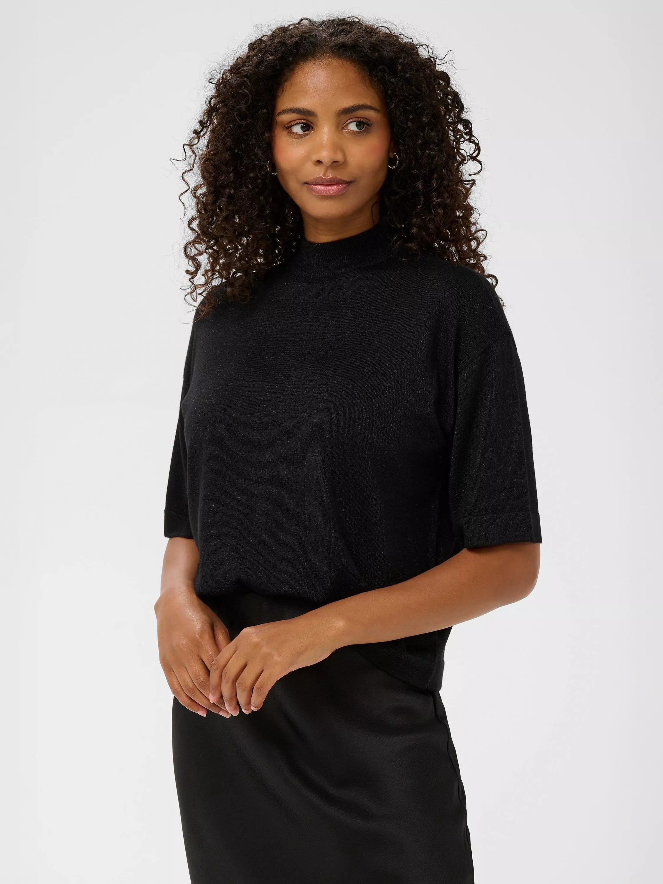 A fine knit jumper from KAFFE, featuring a high neck and elbow-length sleeves. Its subtle metallic detail adds a fresh twist, making it perfect for updating your everyday look without sacrificing comfort.