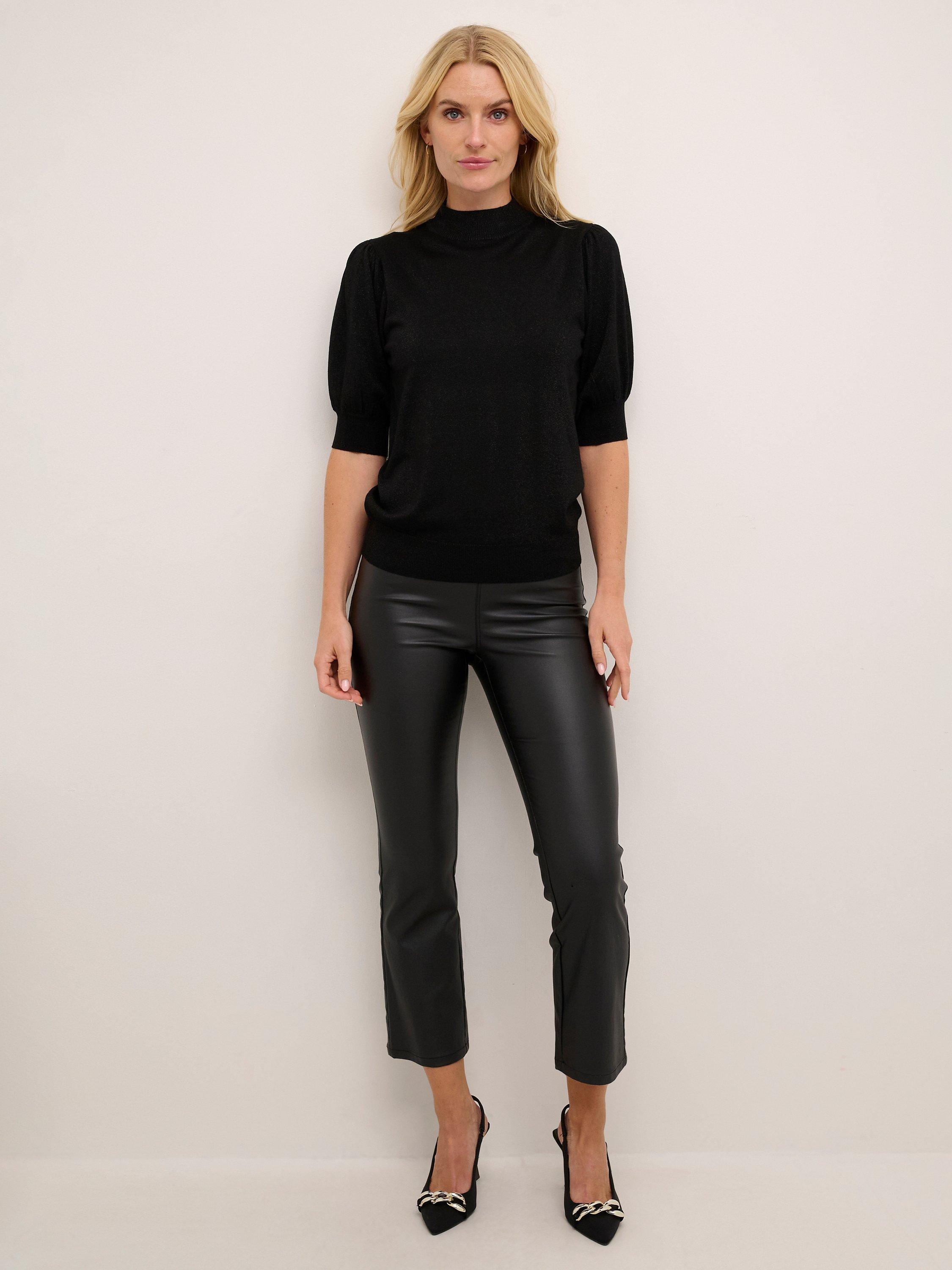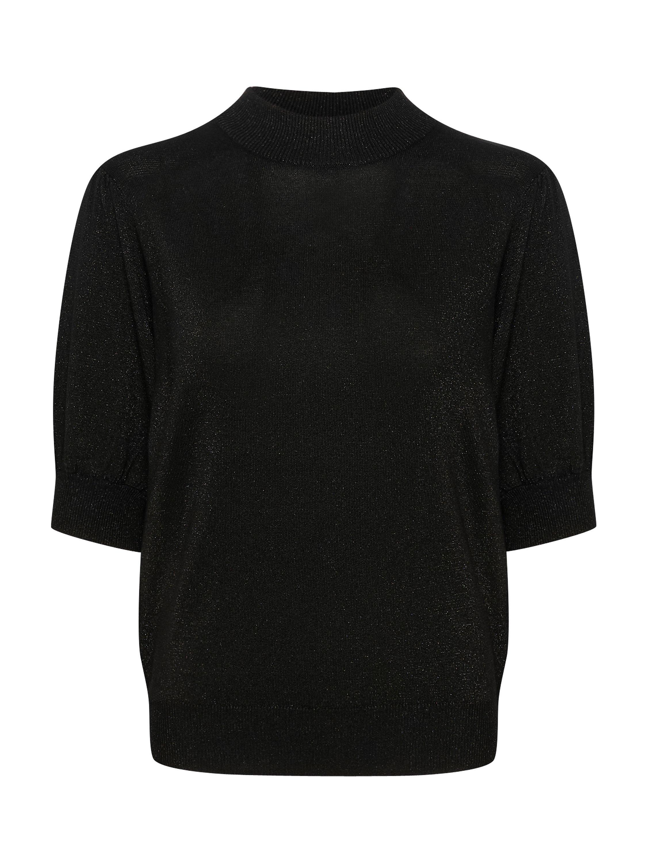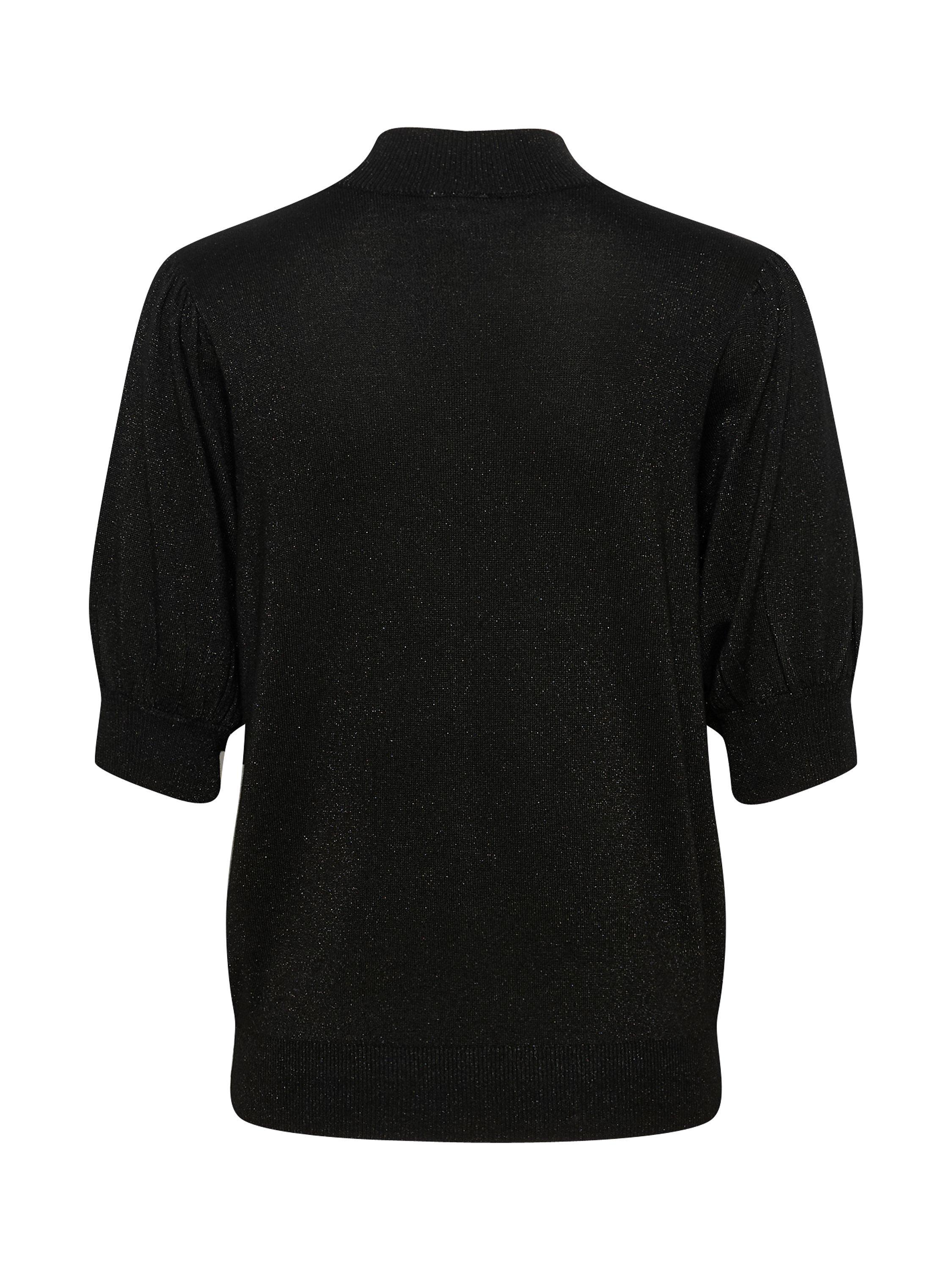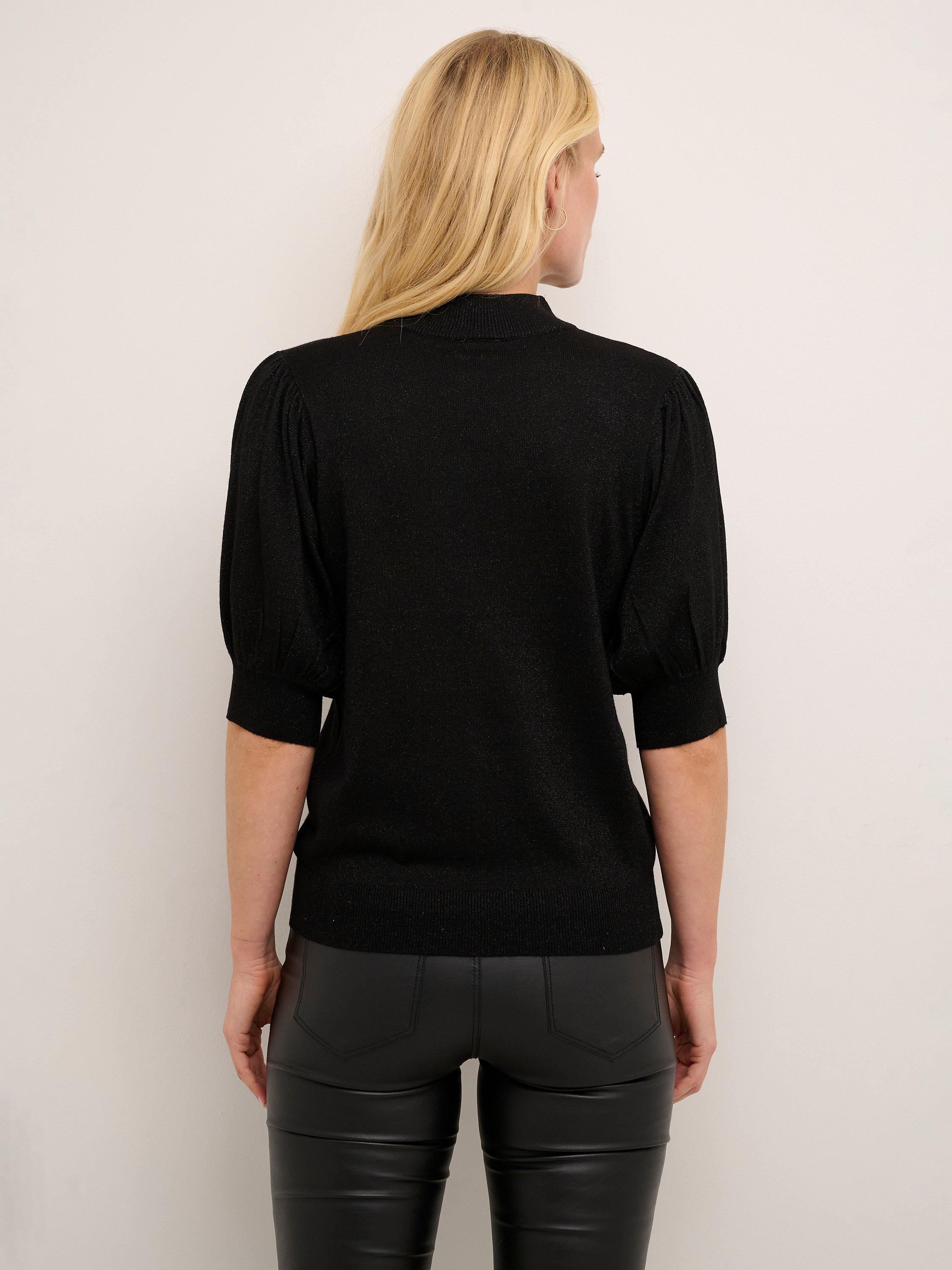 The Regina pullover is a fun and feminine style that will brighten up any day and outfit. It is made with a sparkly metallic yarn and it has short puff sleeves, that are cut right above the elbows. The pullover has a turtleneck and a casual fit, and all edges are finished with a rib knit.