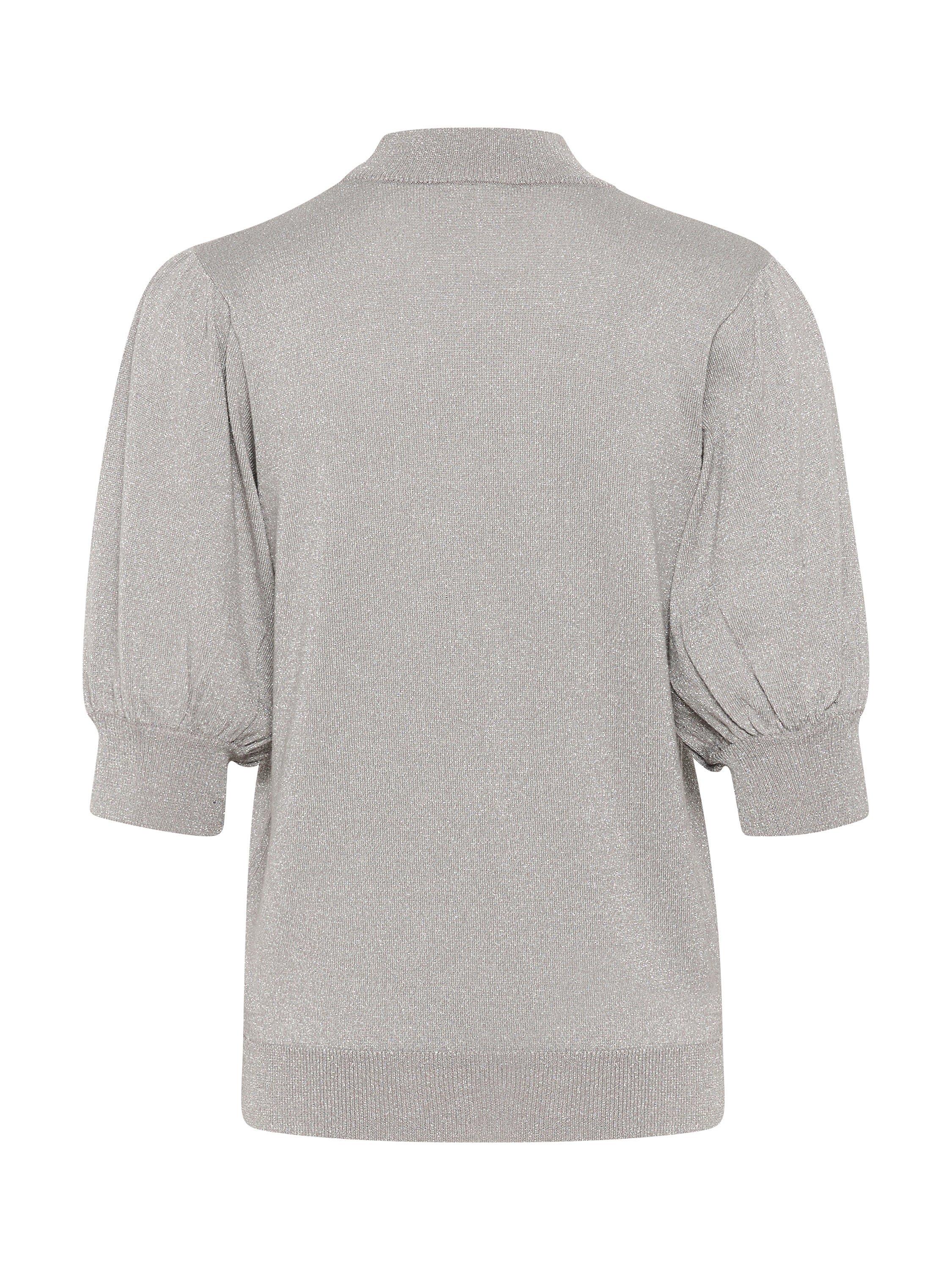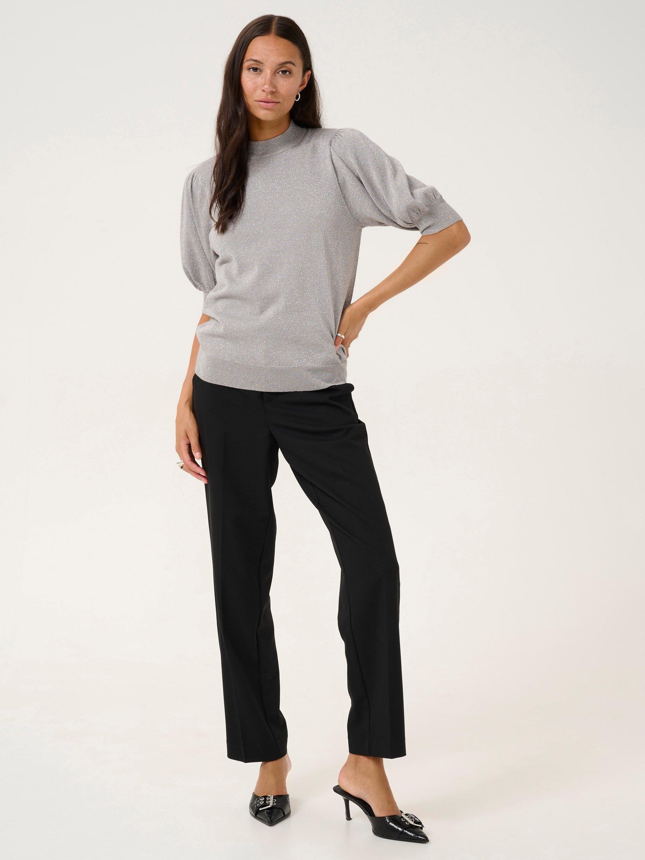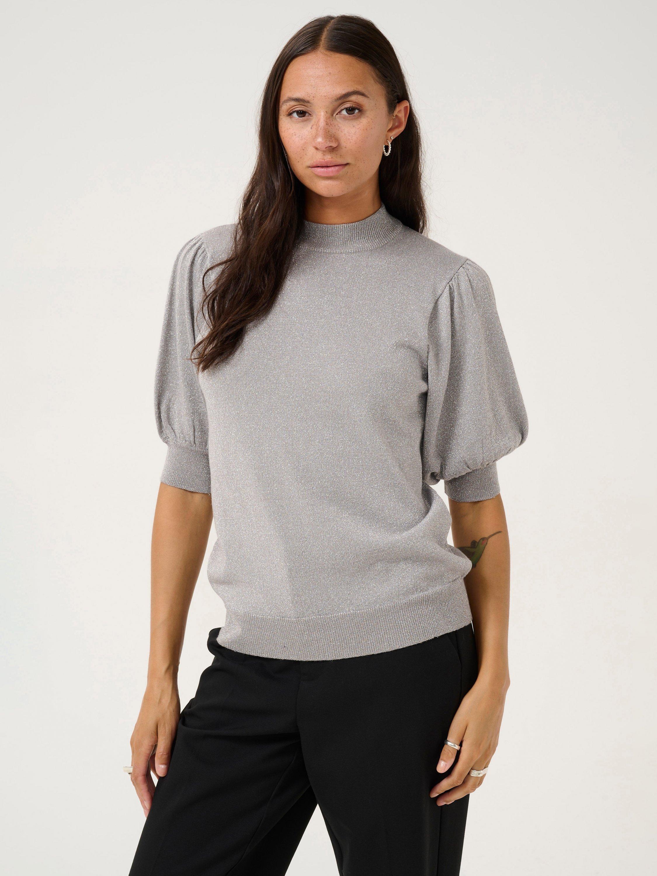 The Regina pullover is a fun and feminine style that will brighten up any day and outfit. It is made with a sparkly metallic yarn and it has short puff sleeves, that are cut right above the elbows. The pullover has a turtleneck and a casual fit, and all edges are finished with a rib knit.