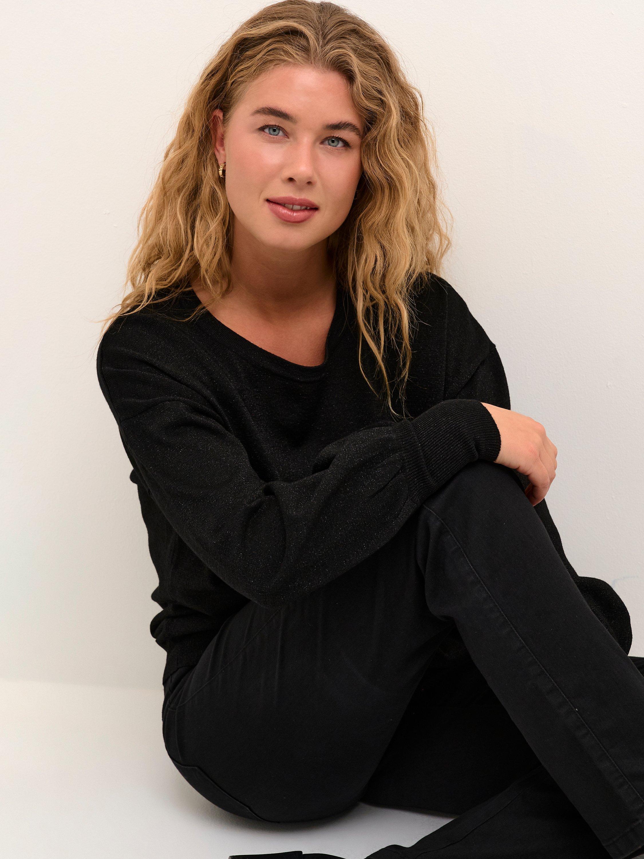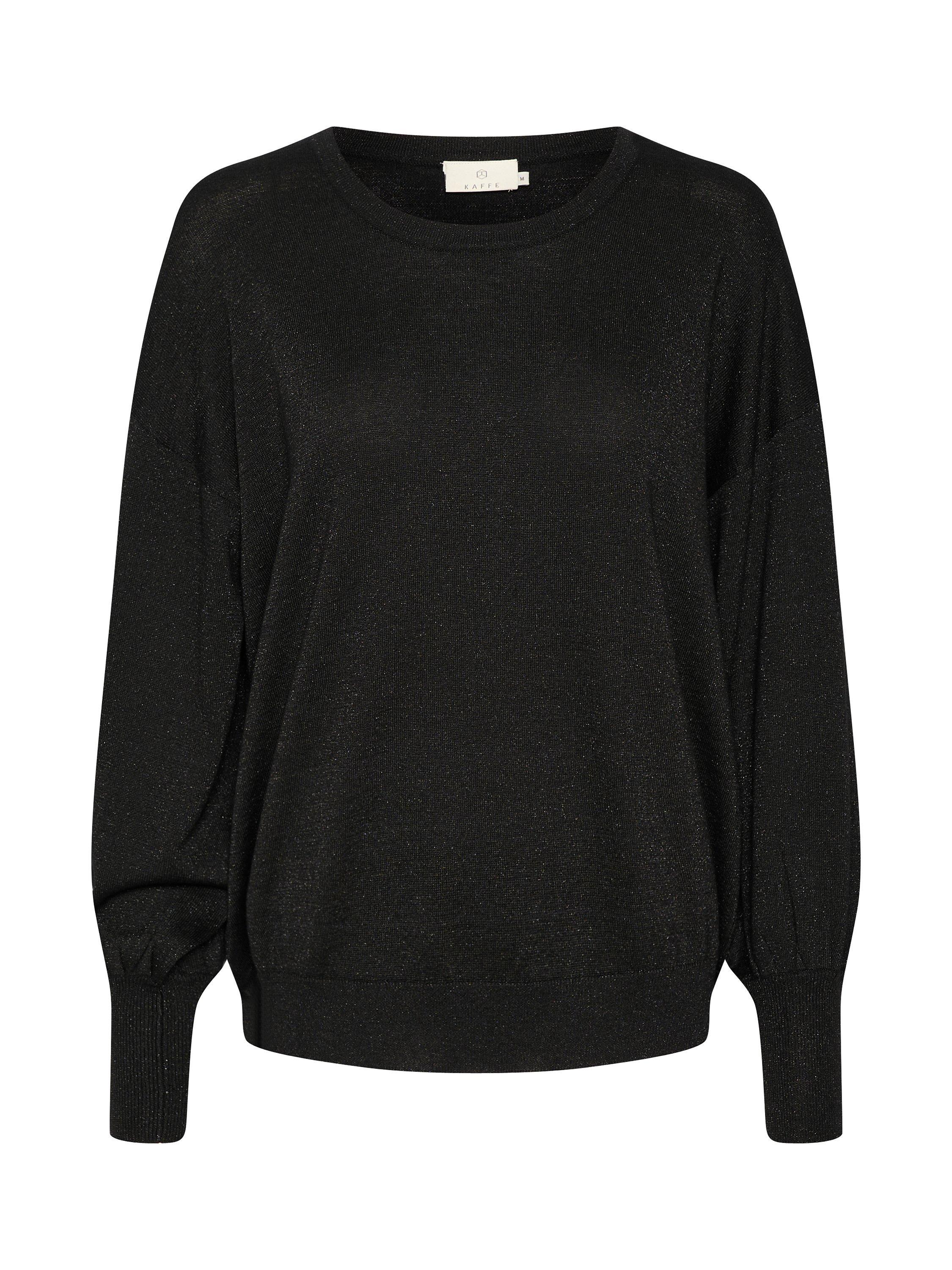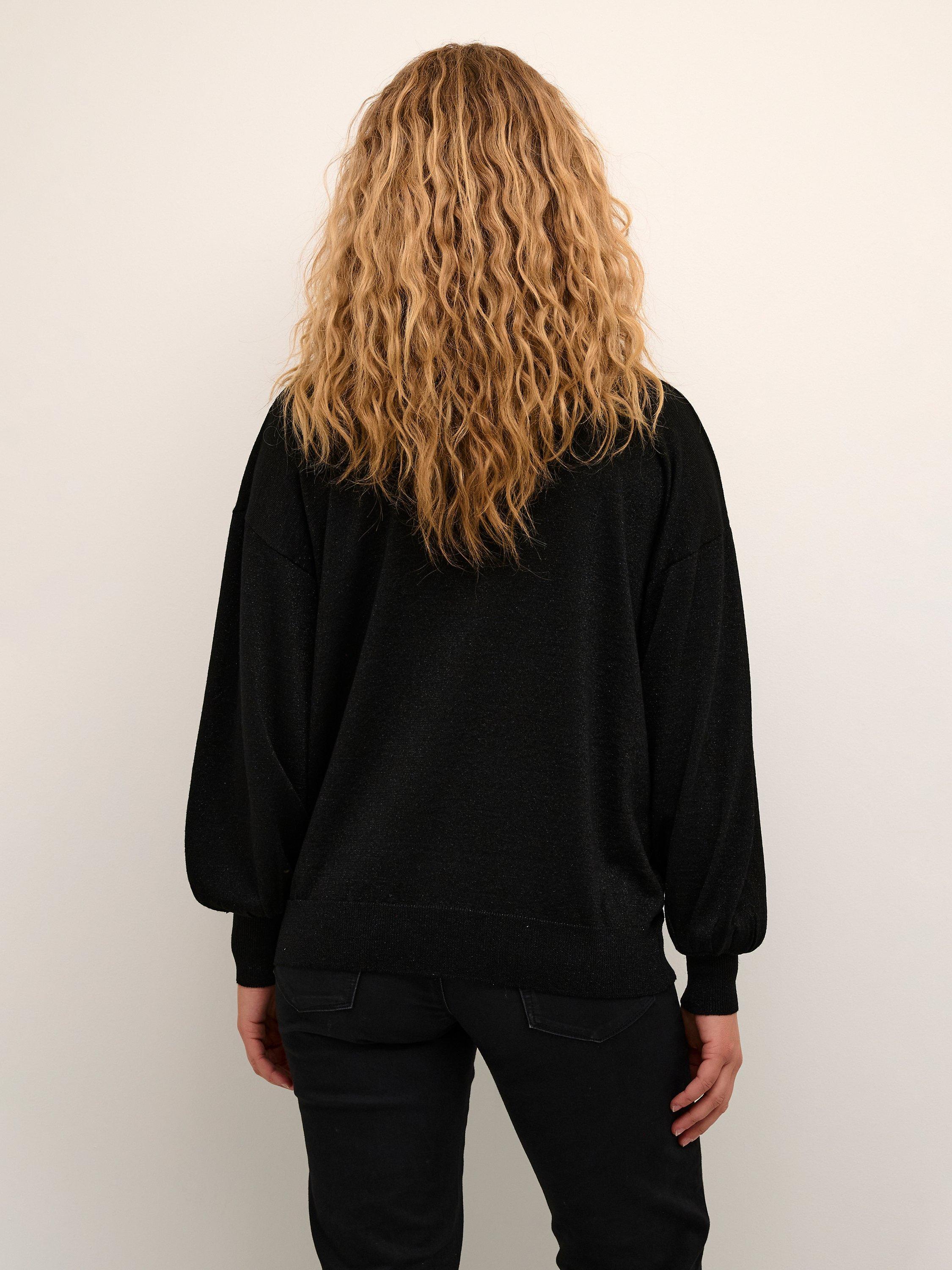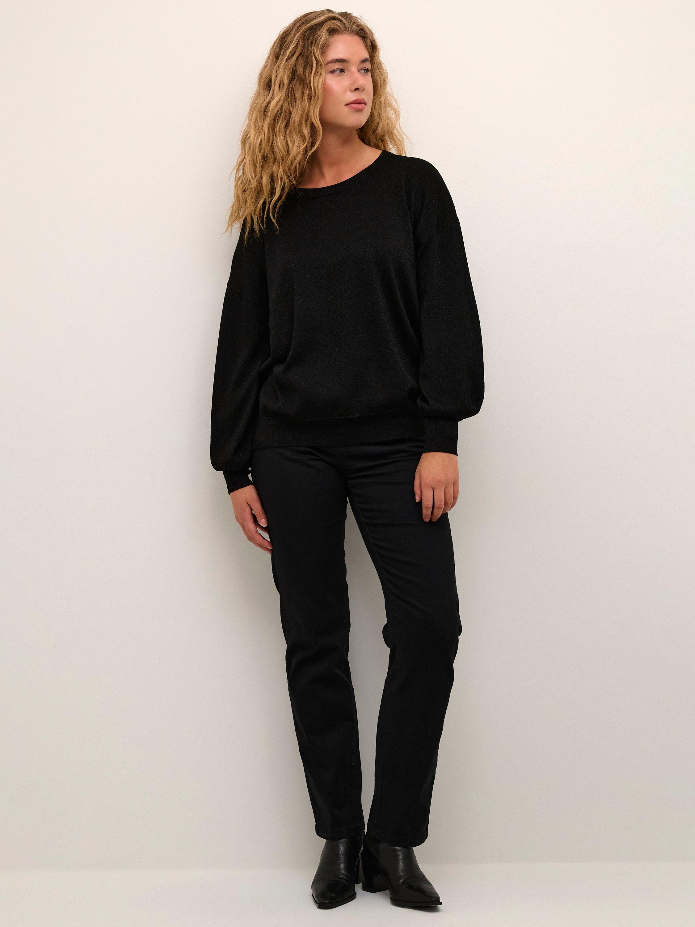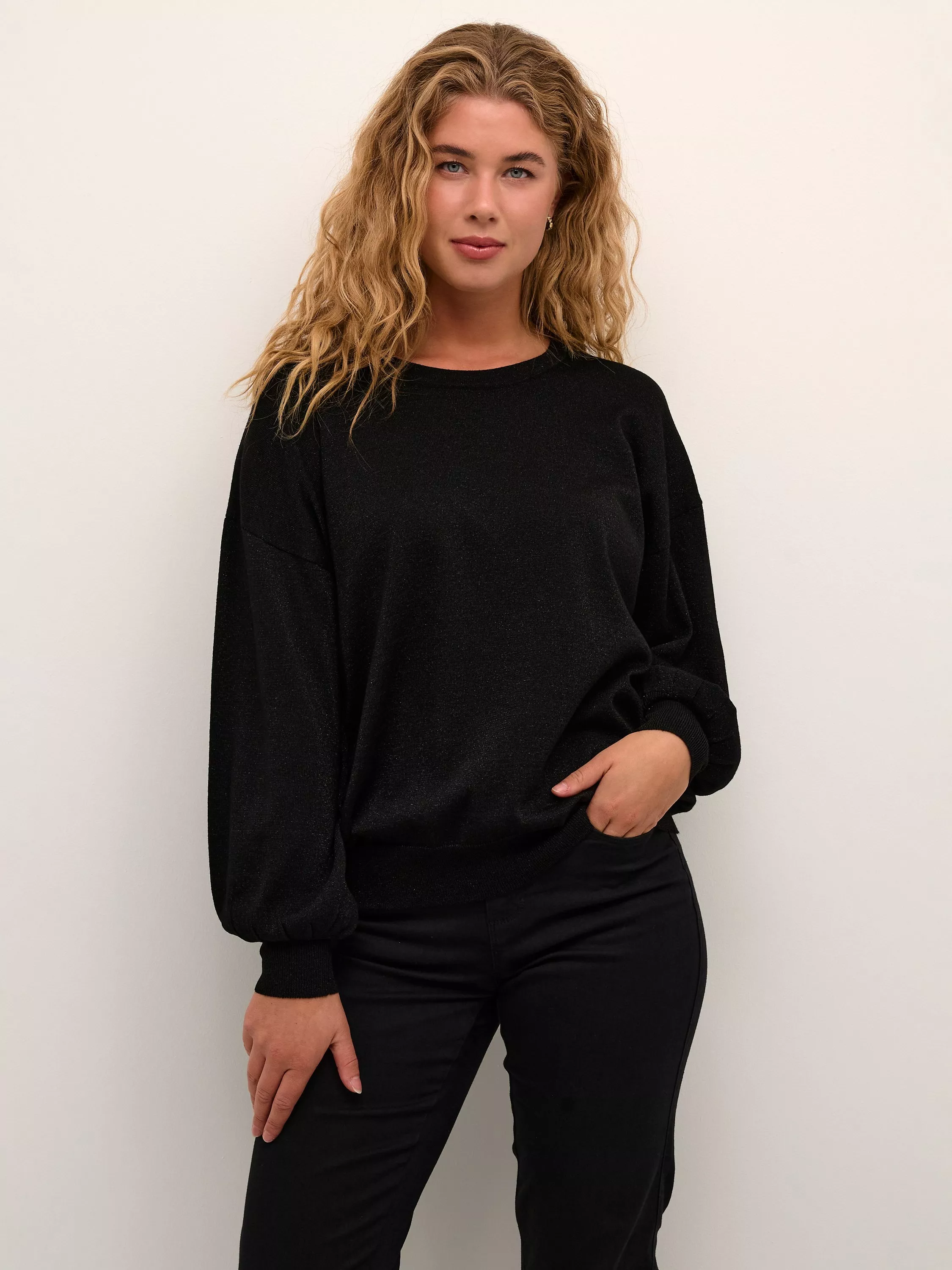The Regina pullover is an elegant knitted top in with sparkly, metallic yarn in it. It has a regular fit with a round neck, and it is gathered at the hem, which gives it a soft volume. The sleeves are long and soft bishop sleeves that are gathered in a wide cuff.