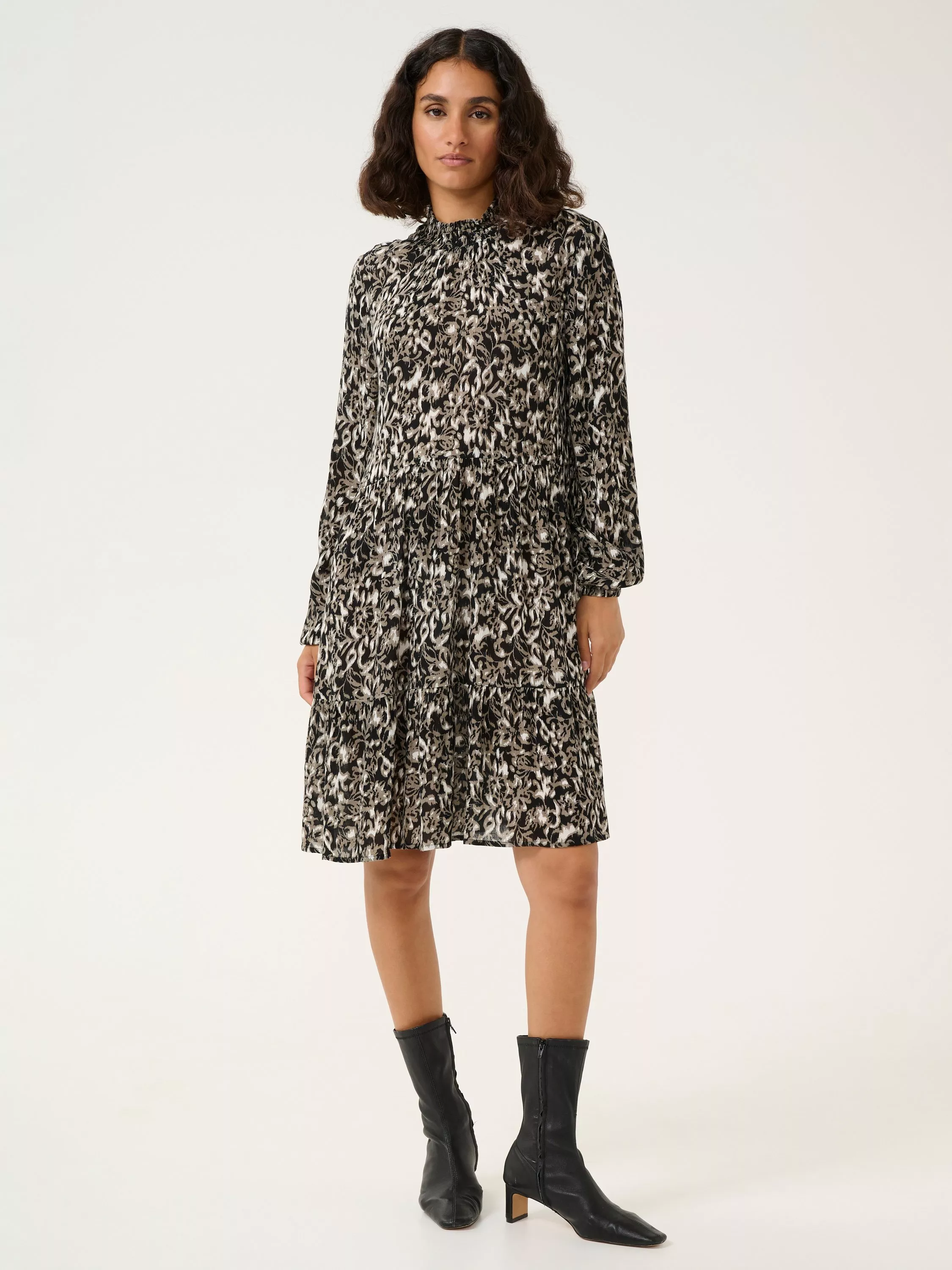 The riani dress is a cute everyday style in a lovely print. It has a high smock neck with button fastening at the back, and it has a casual A-line fit with a drop waist and flared skirt. The sleeves are long and loose with an elastic edge, and the dress is cut above the knees and has a flared hem with pleats.
