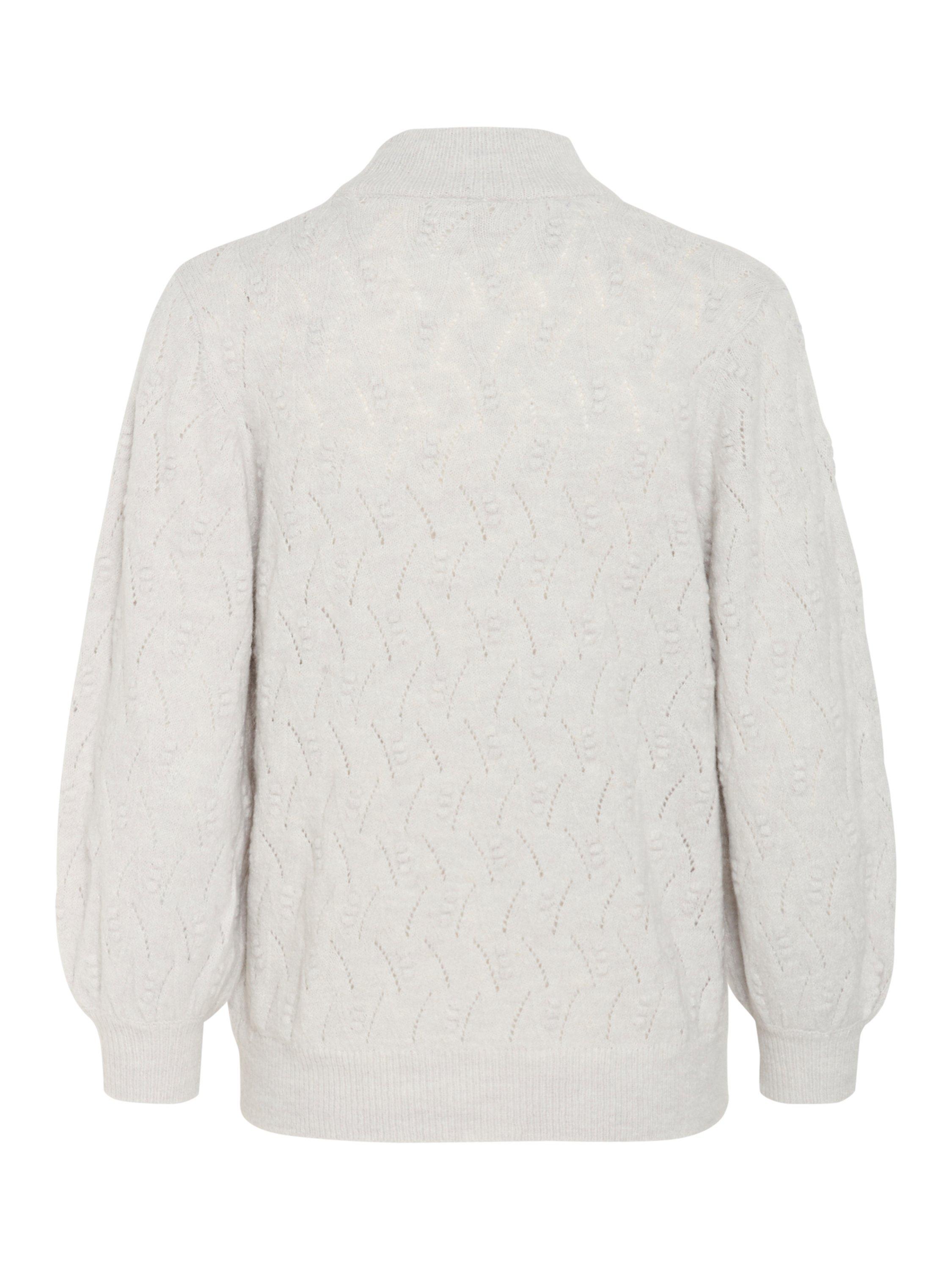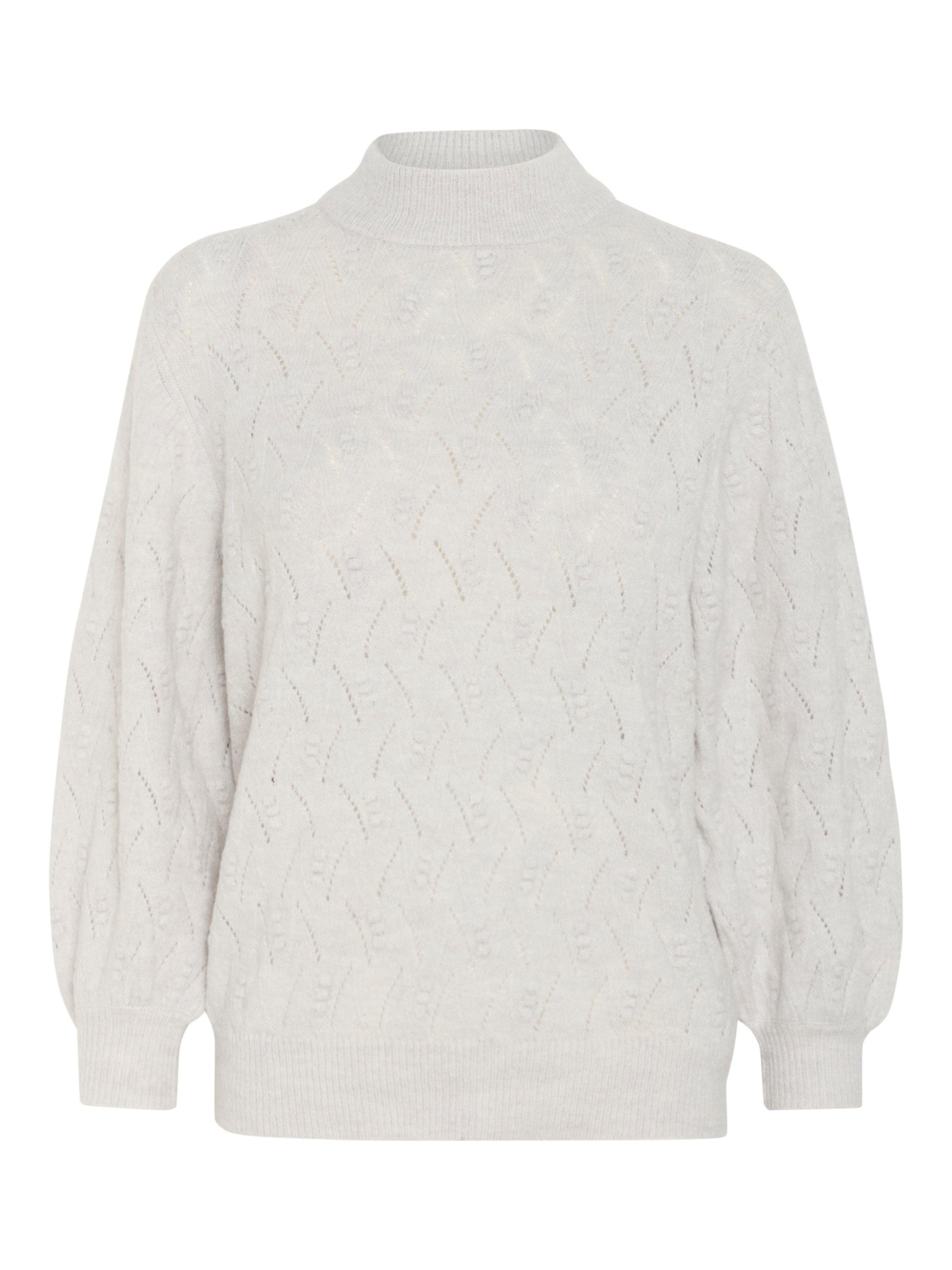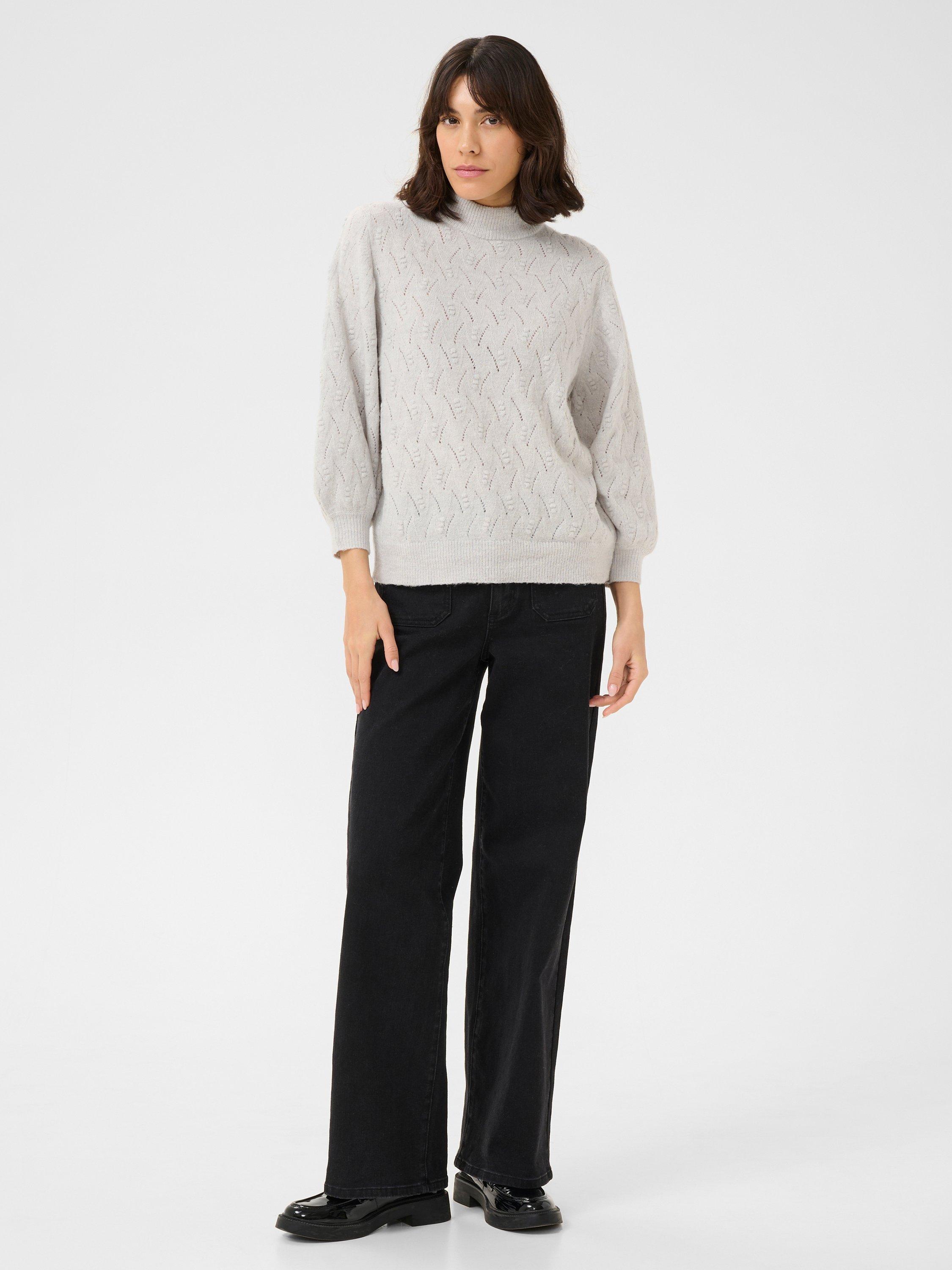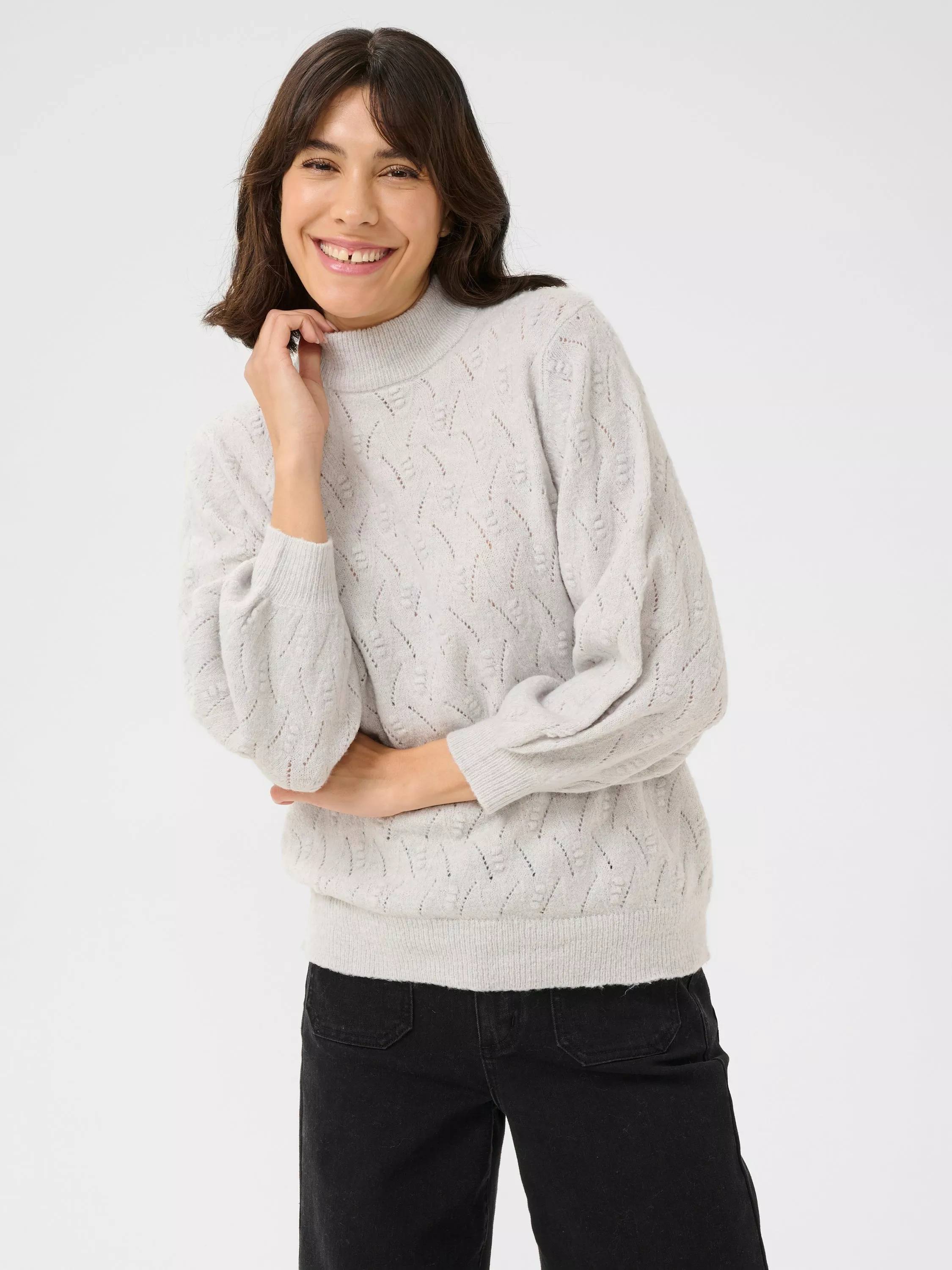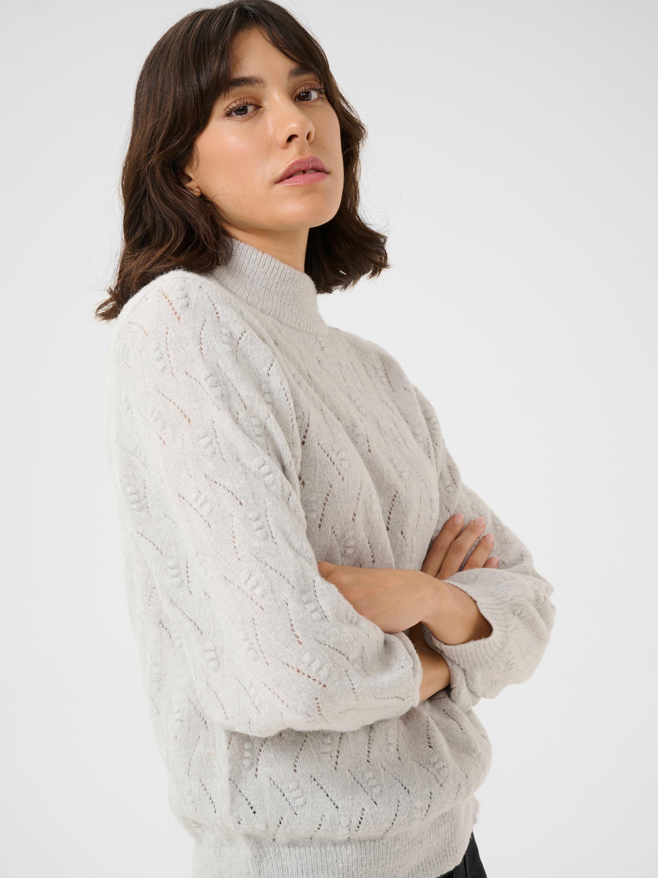 The rita pullover is a light knit with a beautiful textured pattern. It has a regular fit and a high neck, and all edges are finished with a rib knit. The sleeves are 3/4 length balloon sleeves with a subtle volume.