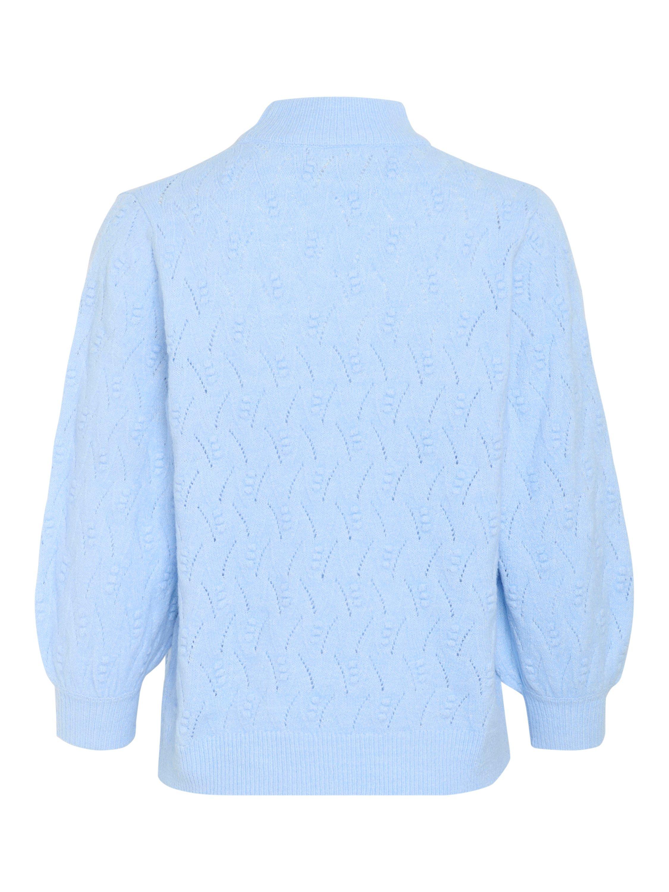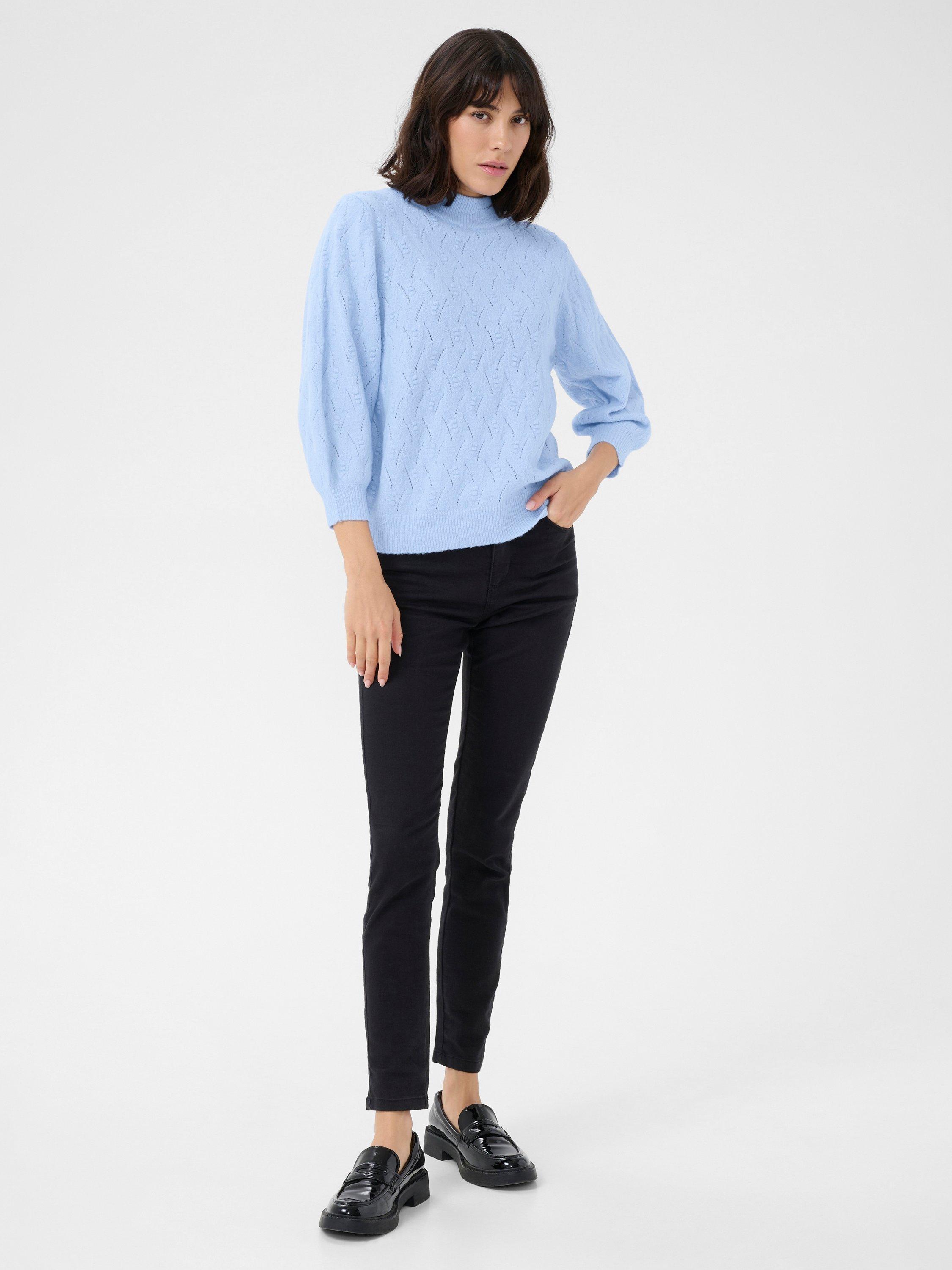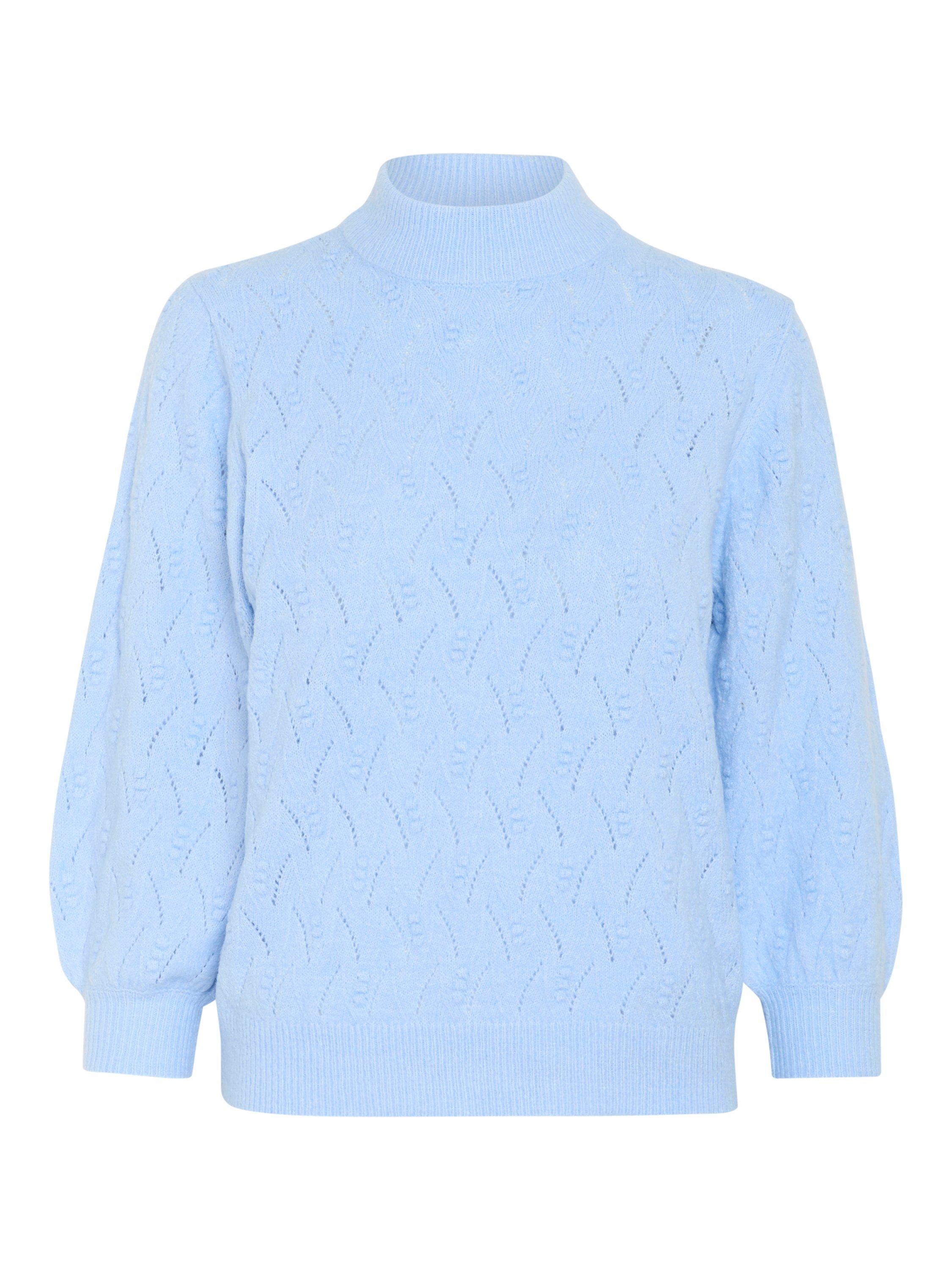 The rita pullover is a light knit with a beautiful textured pattern. It has a regular fit and a high neck, and all edges are finished with a rib knit. The sleeves are 3/4 length balloon sleeves with a subtle volume.