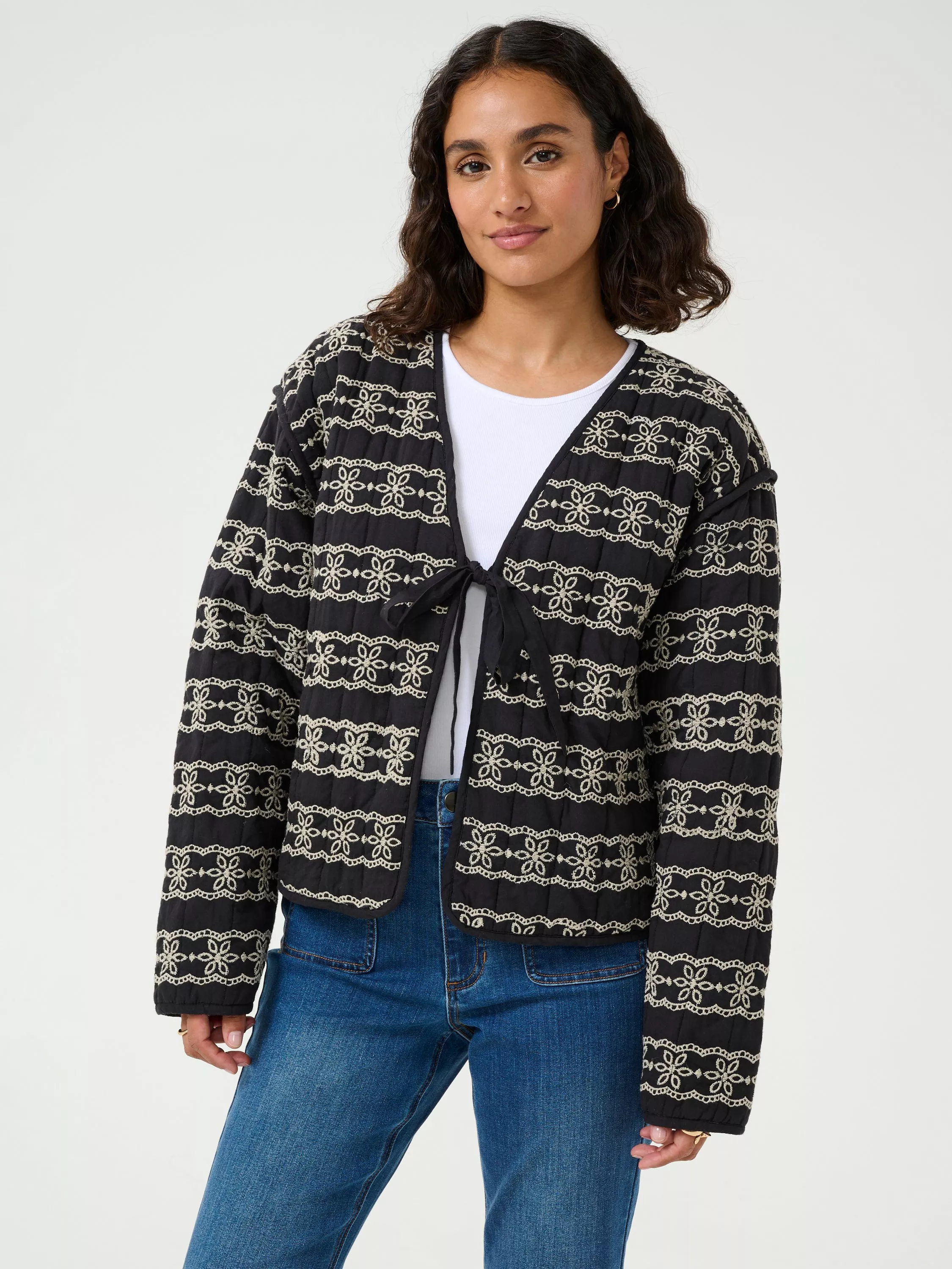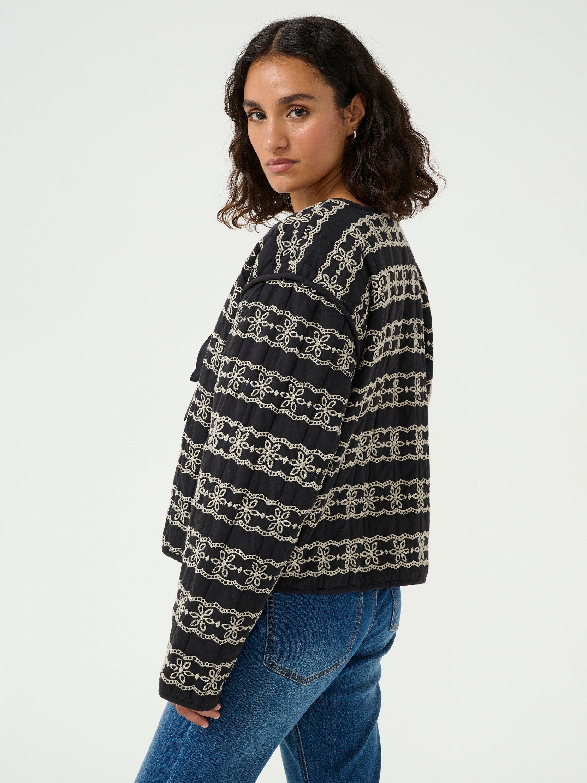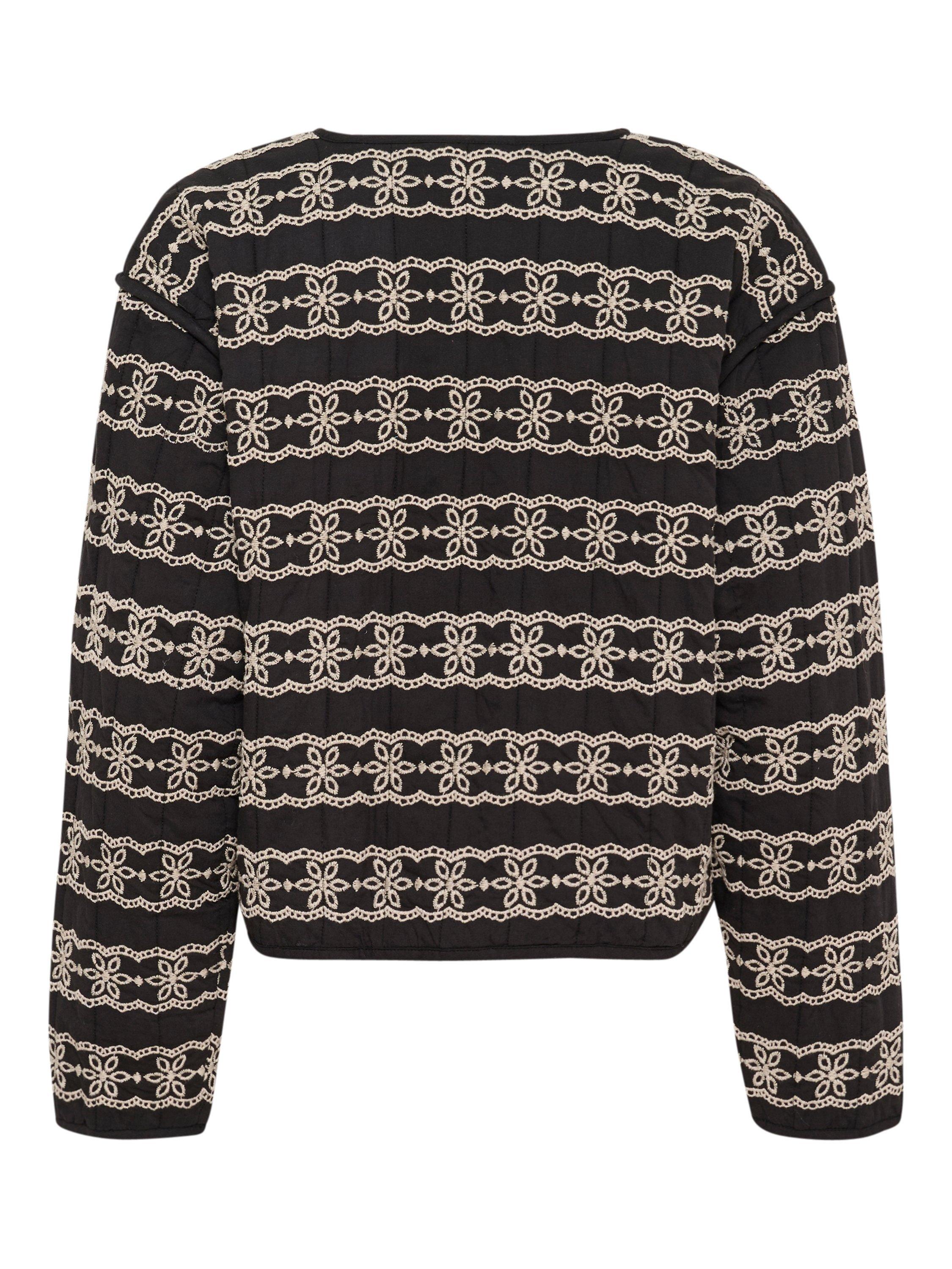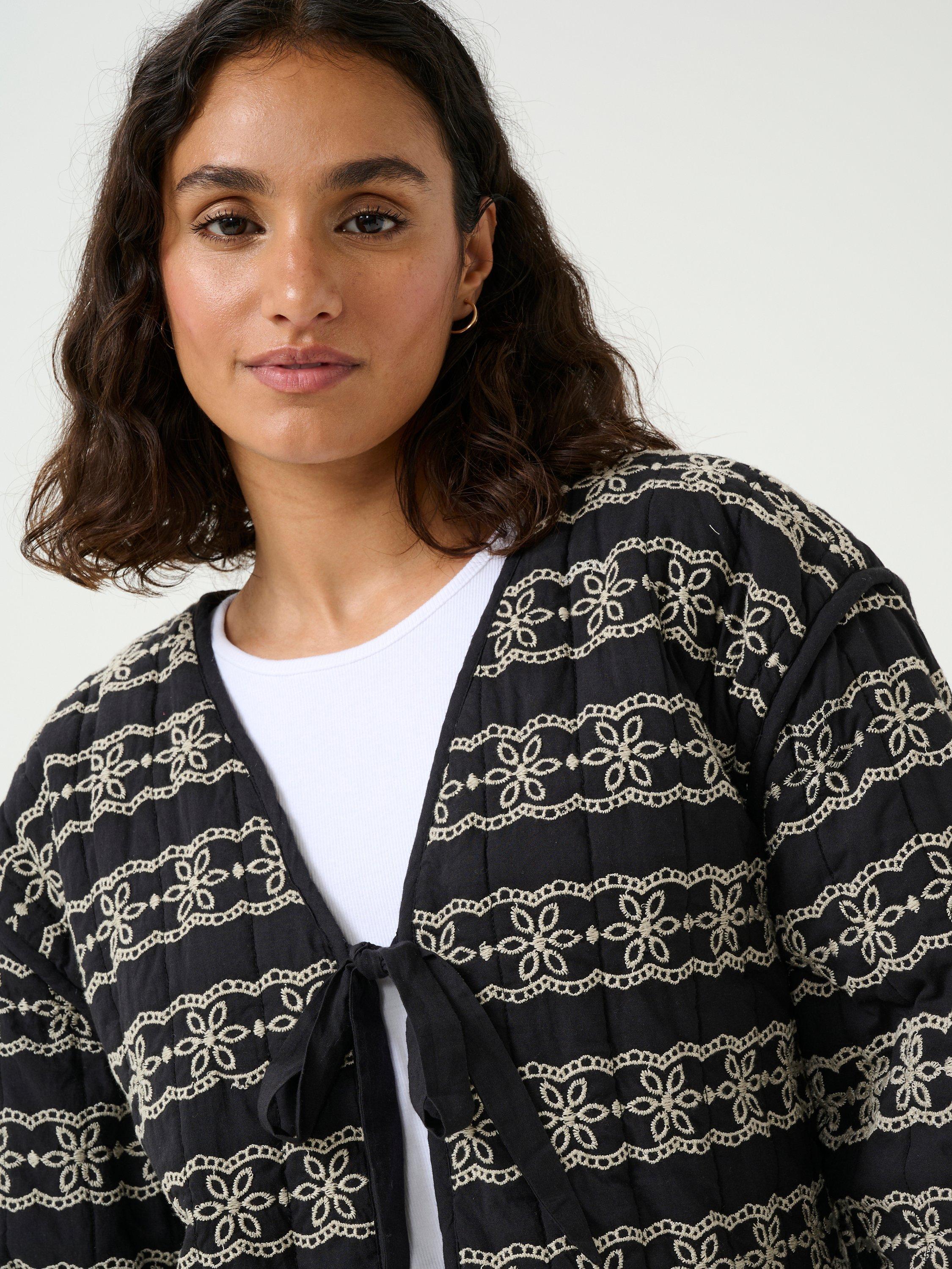 Made using pure cotton for a soft yet breathable feel, it offers a stylish blend of black and white embroidery, perfect for layering in cooler seasons.