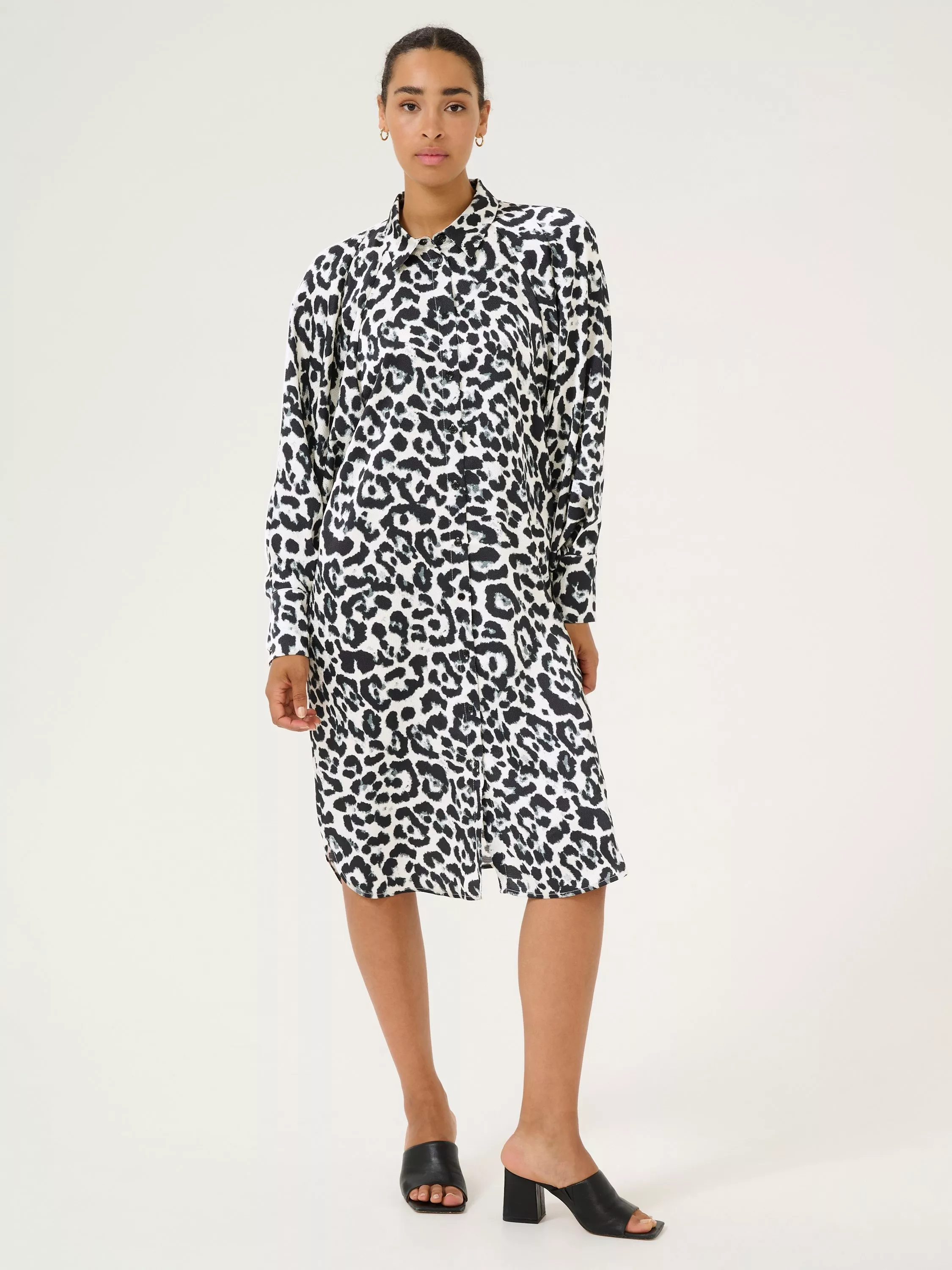 The roxy shirt dress is a casual style in a bold print. It has a spread collar and button fastening, and it has a loose and relaxed fit. The sleeves are long and voluminous with buttoned cuffs, and the dress is cut at the knees.