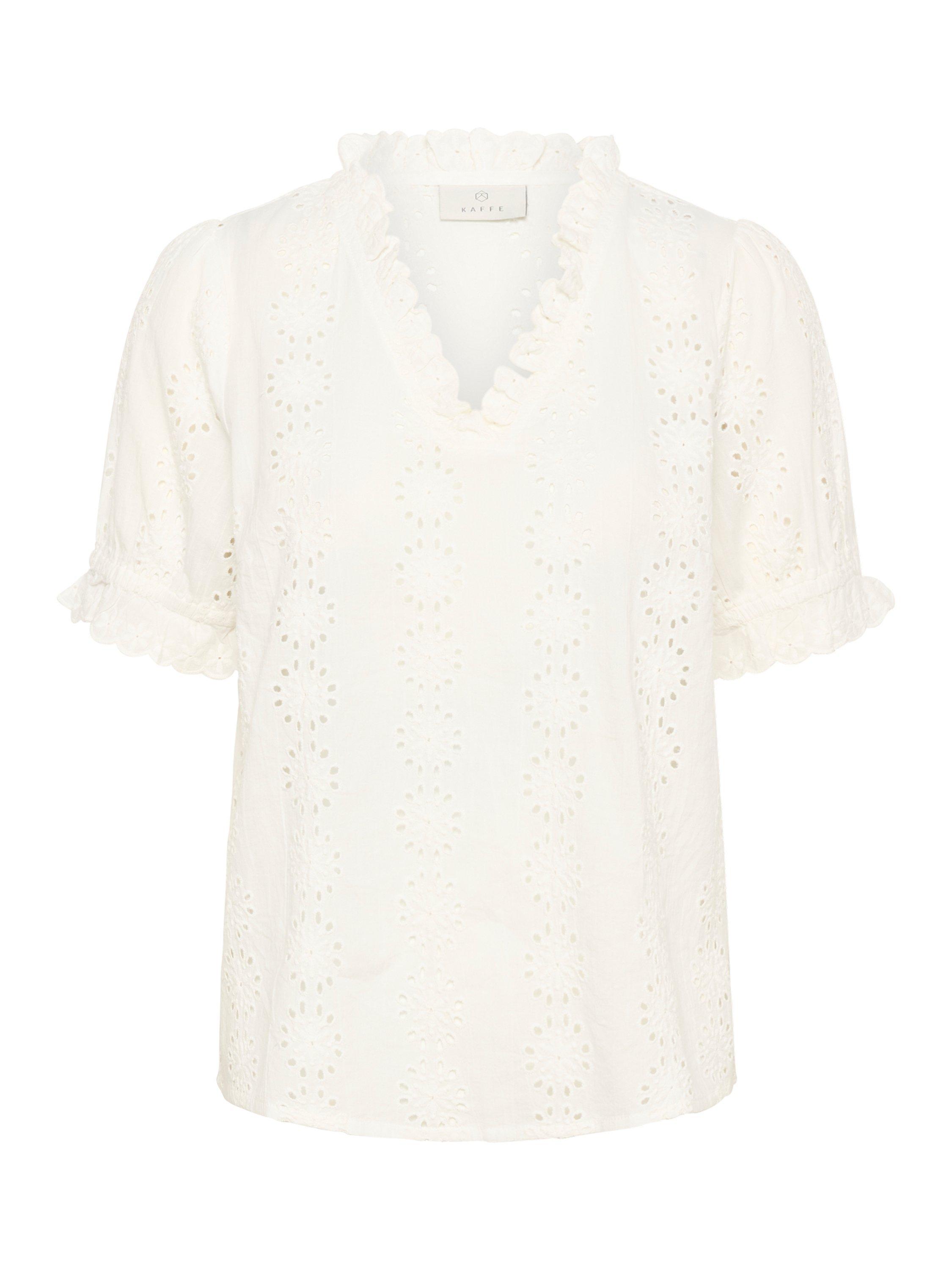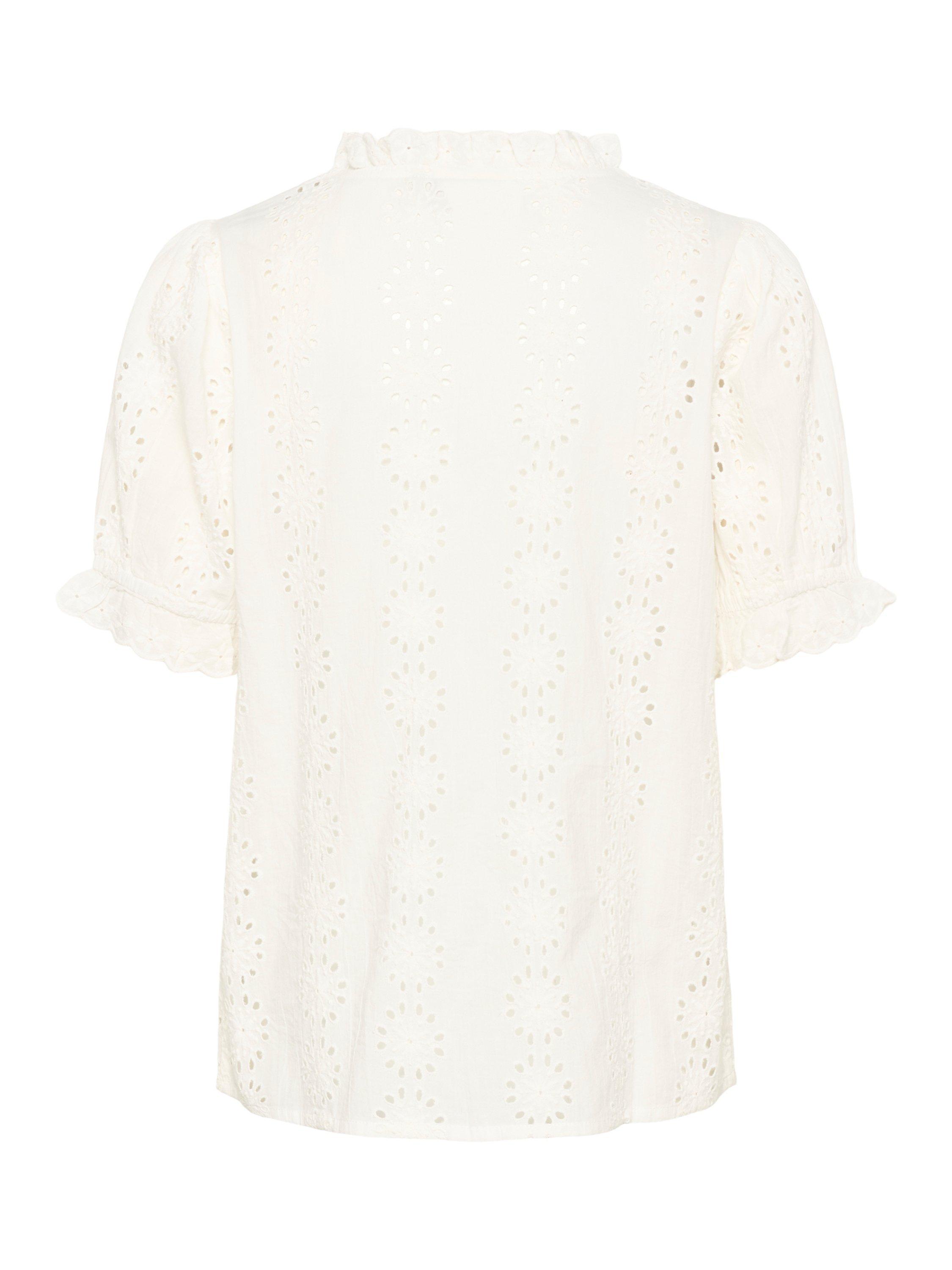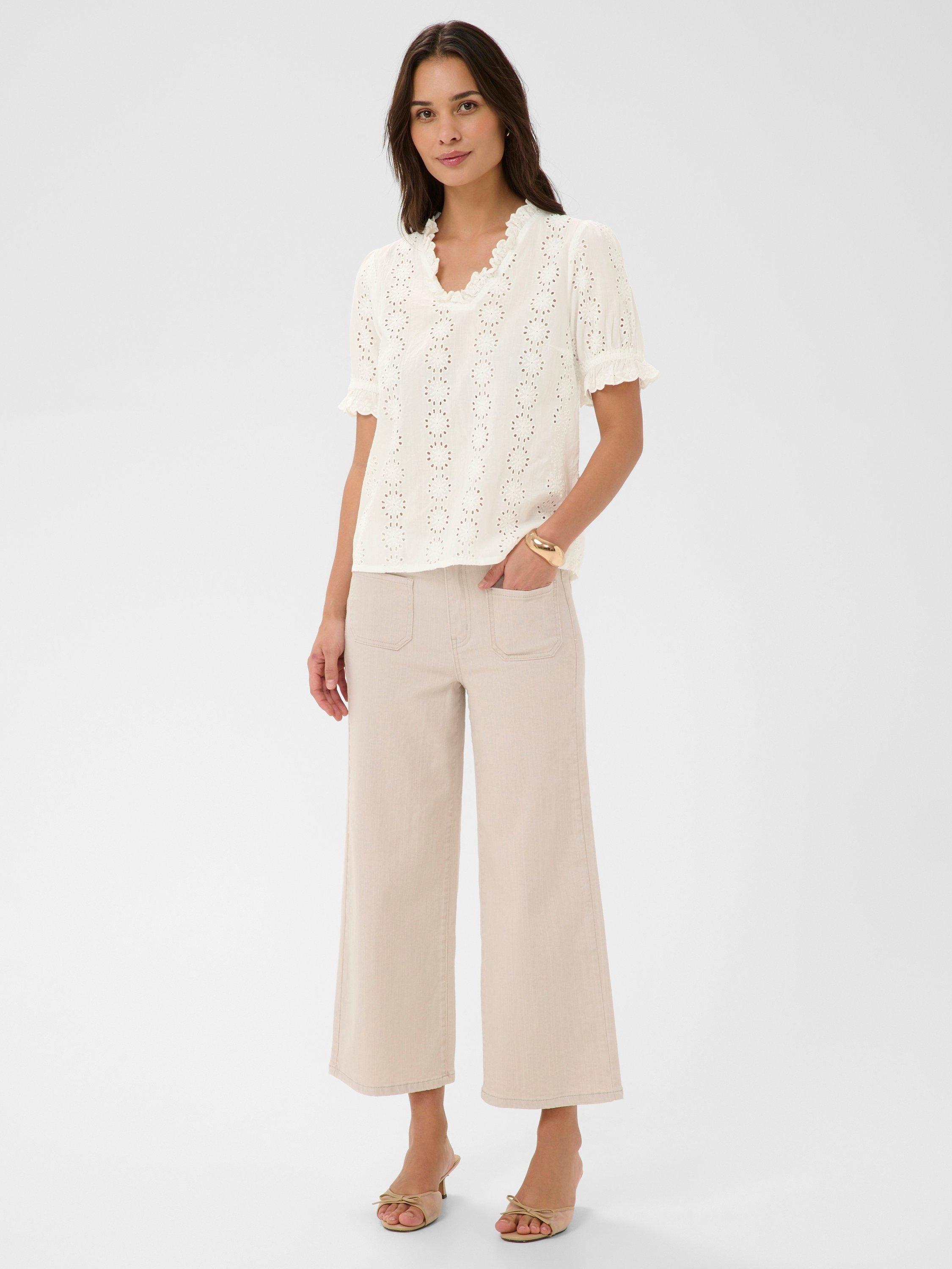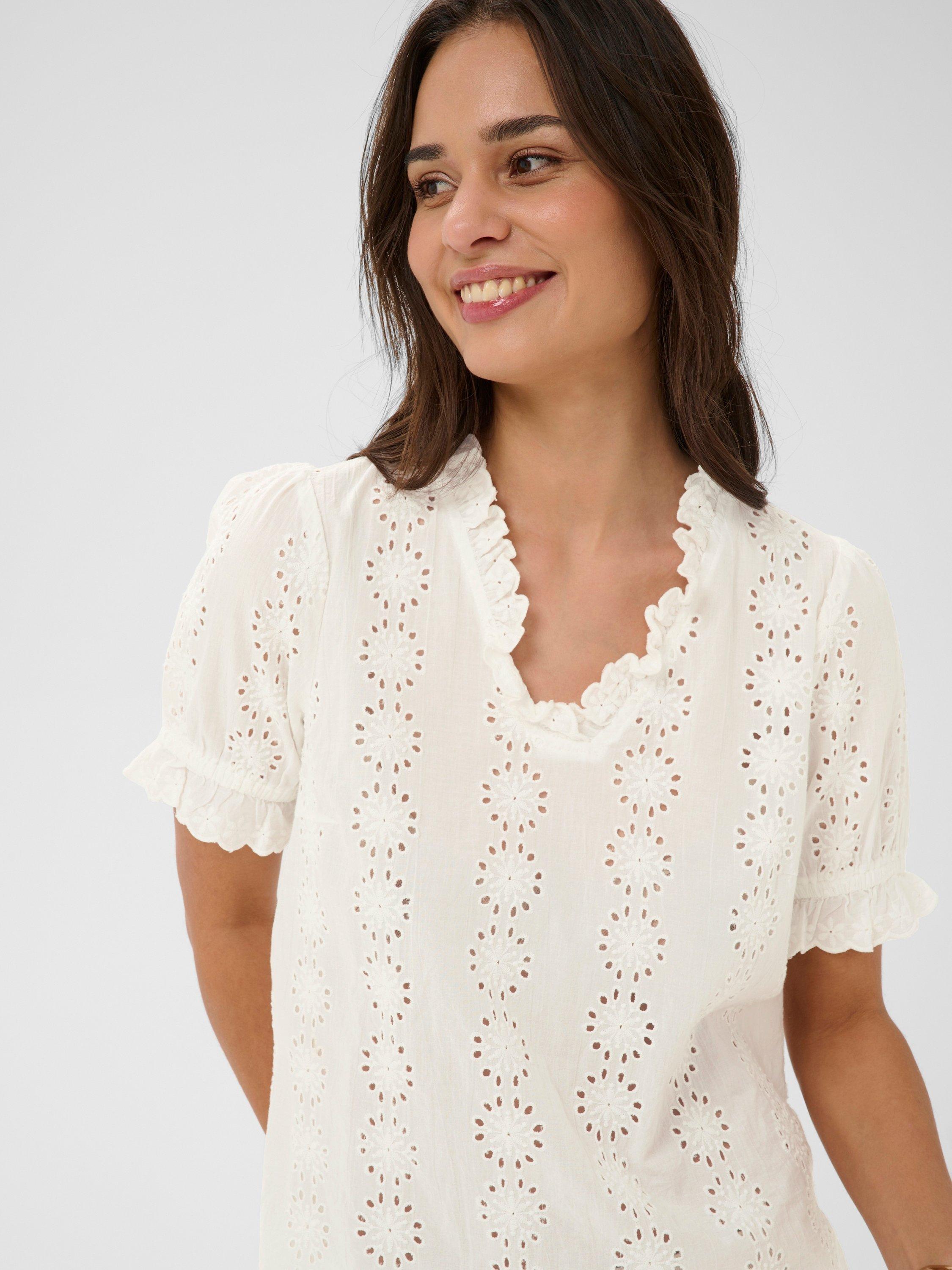 A breezy ruffle V-neck blouse featuring delicate eyelet detail, soft drape, and a flattering relaxed silhouette, ideal for sunlit weekends and carefree city strolls.