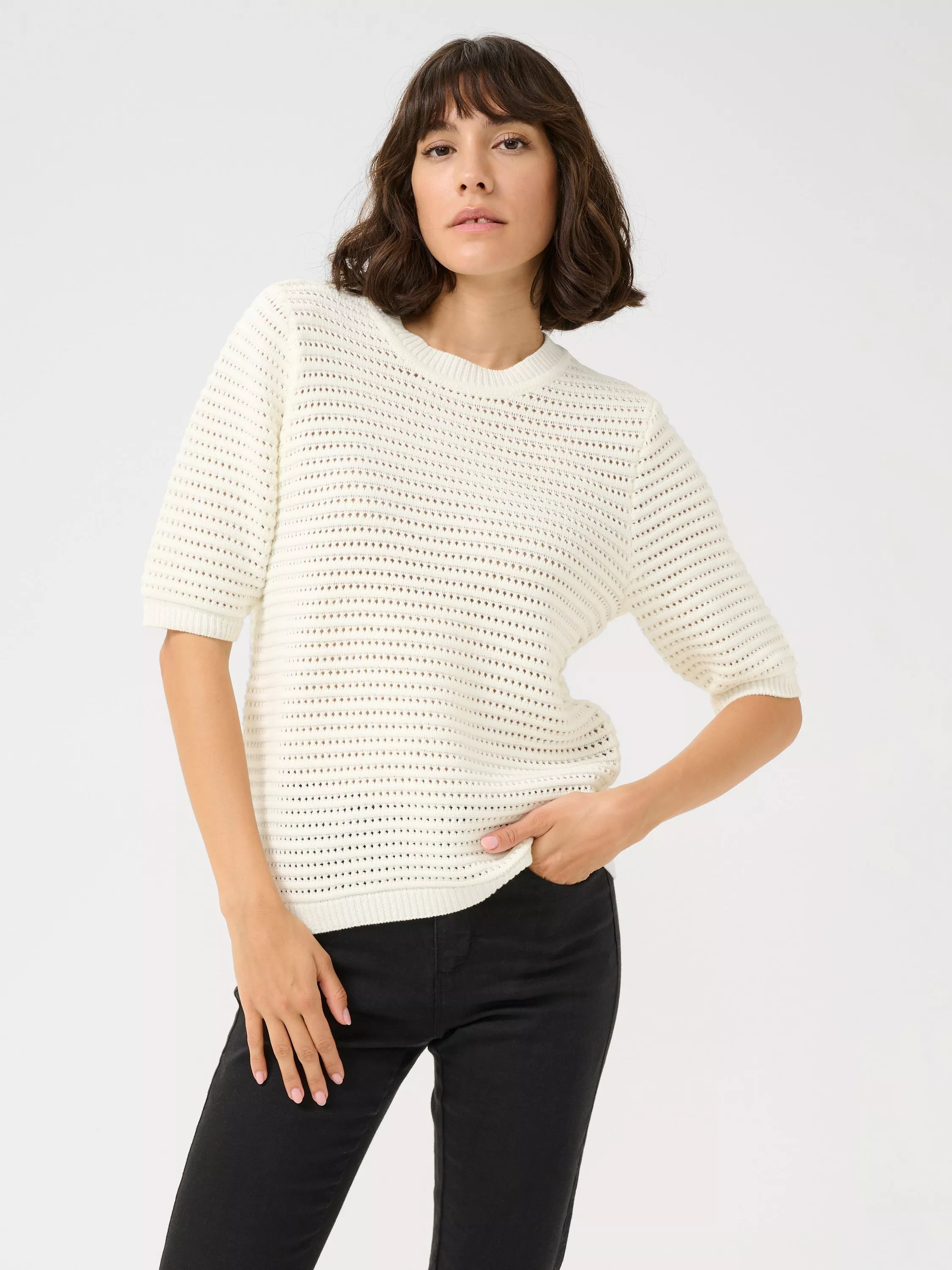 The ry pullover is a casual and easy-to-style top in a soft cotton blend. It has a crew neck and a regular fit, and it is made in a textured knit. The sleeves are half-length with a wide fit, and the pullover is cut at the hips.