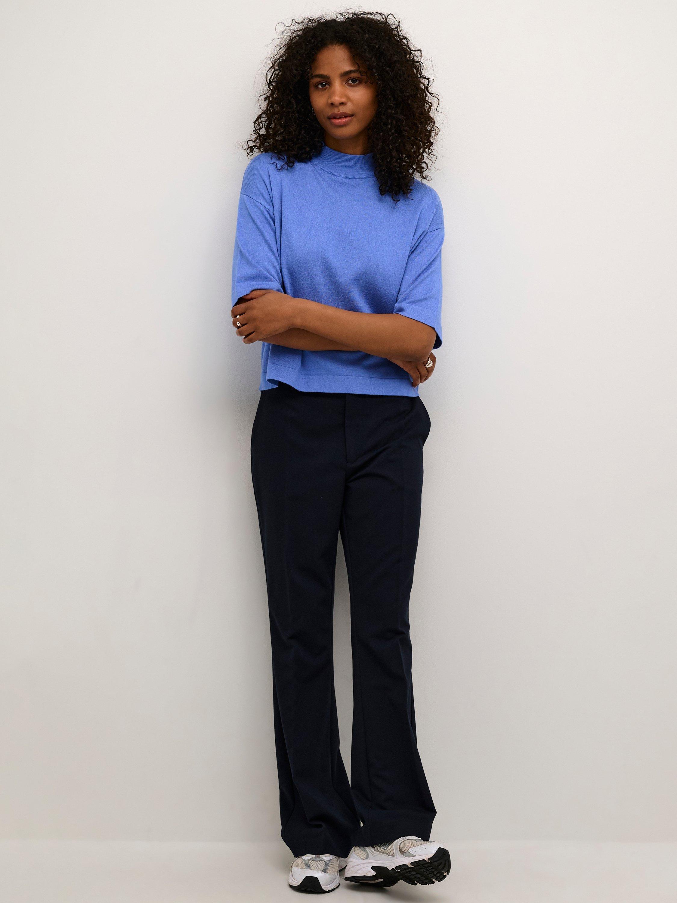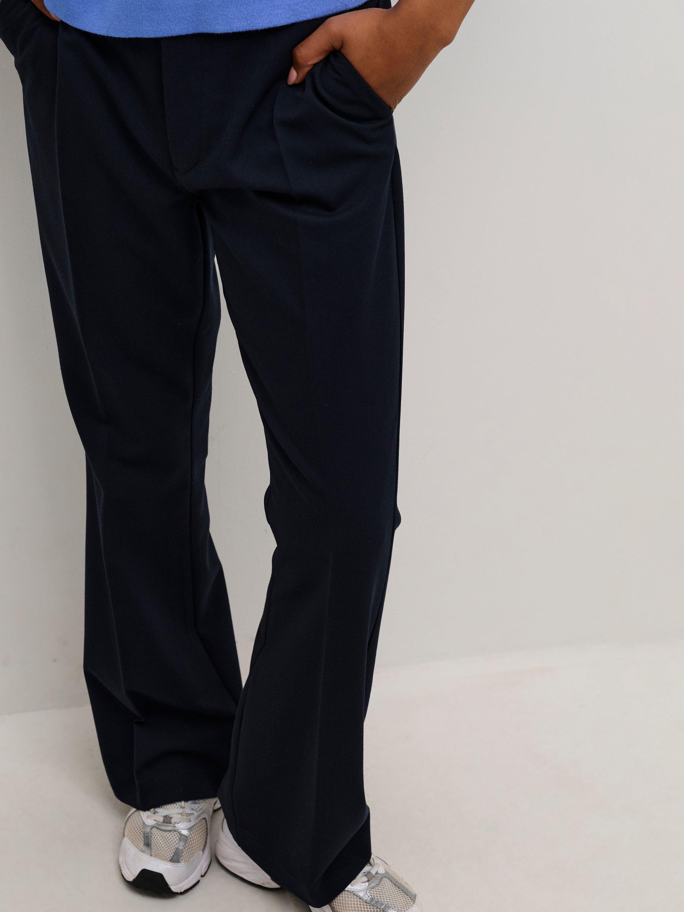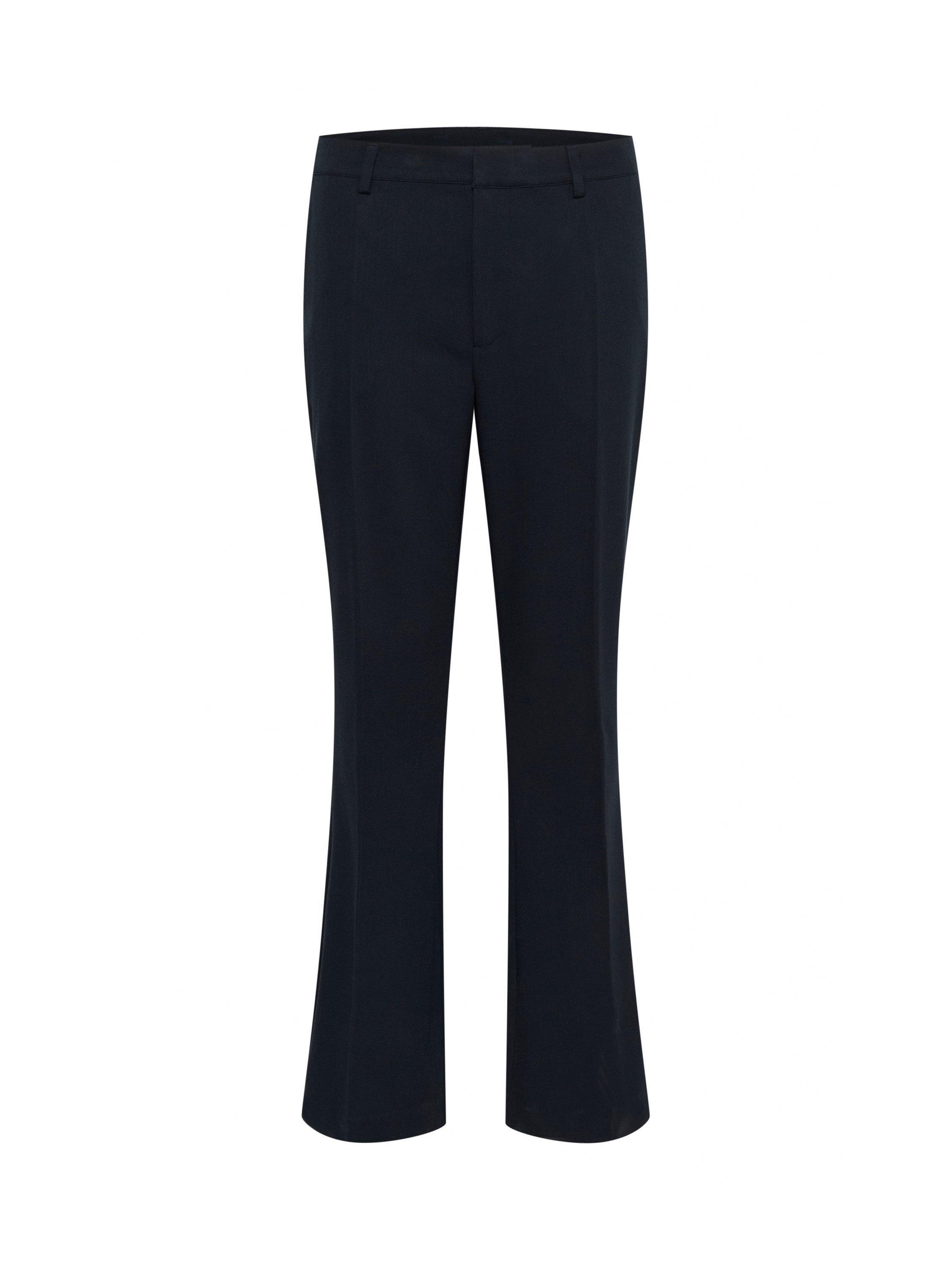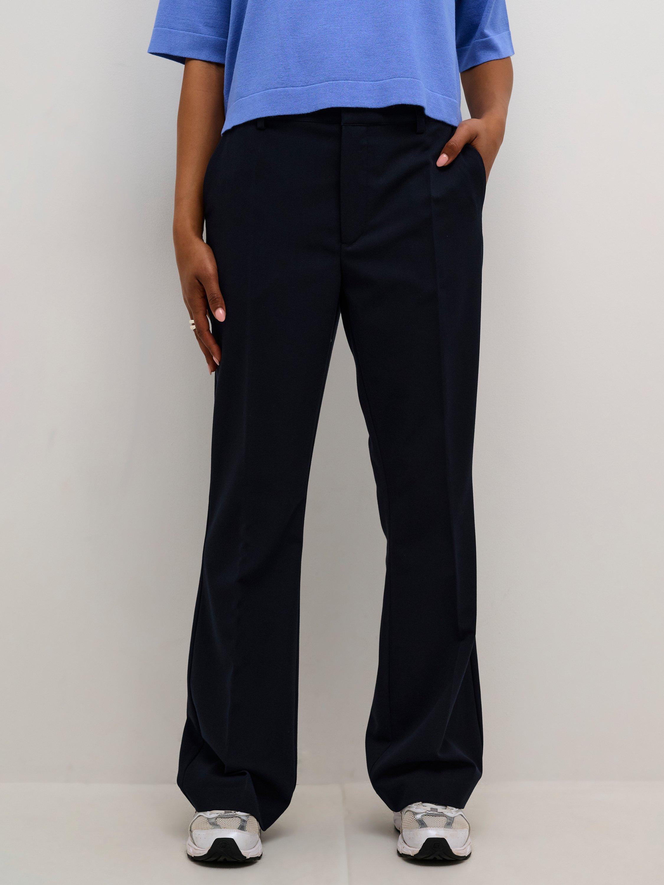 The sakura trousers are a timeless pair of trousers, that will look great with anything from a simple top to a feminine blouse. They have a midrise waist with a zipper fastening, and they have a regular fit. The legs are flared, and the trousers have seamed side pockets and welted back pockets.