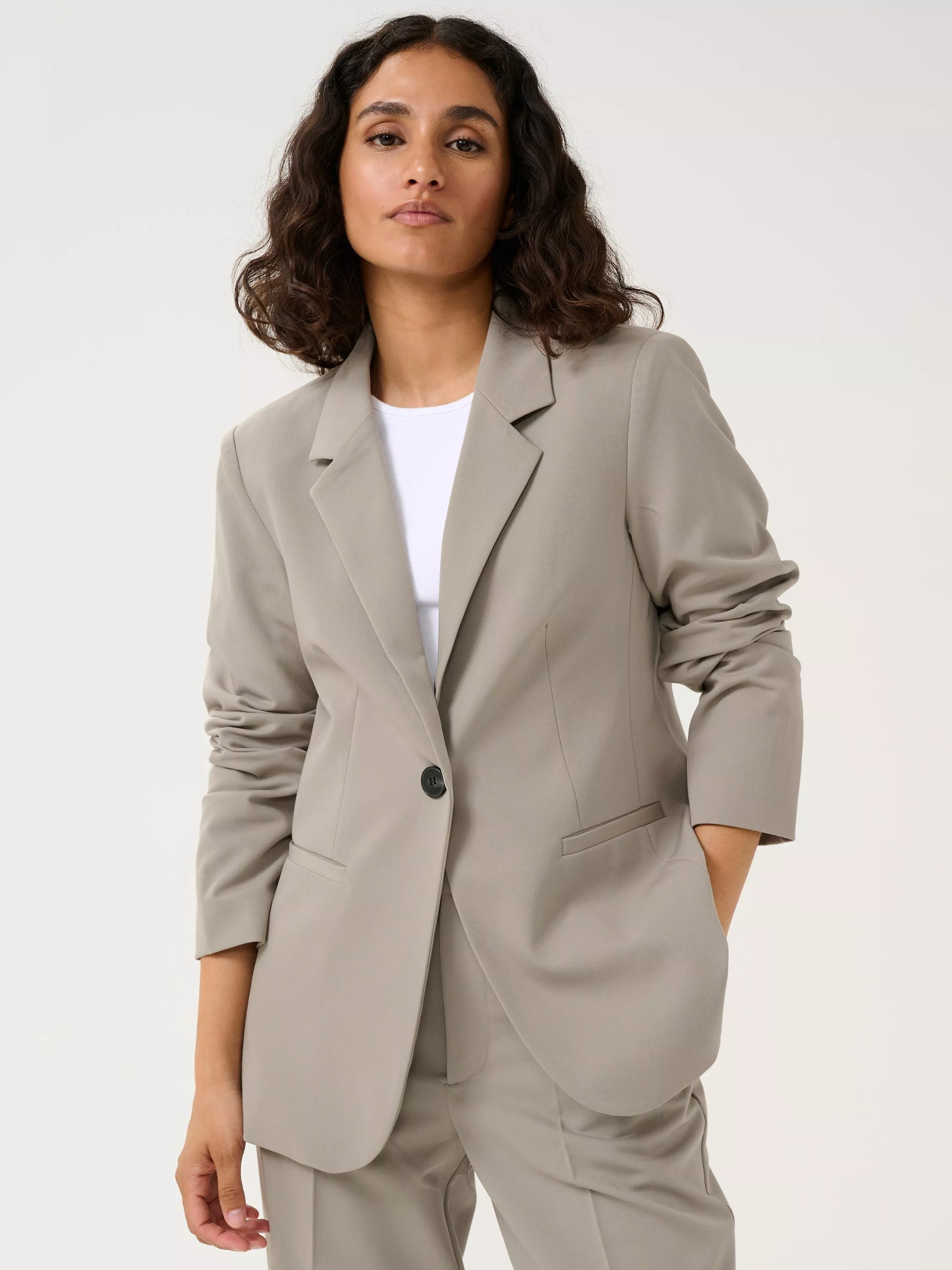 The sakura blazer is a classic and stylish blazer with a tailored fit. It is single-breasted with a single button fastening at the waistline. It has a notch lapel and welted front pockets. The blazer has rounded corners and a straight back hem.