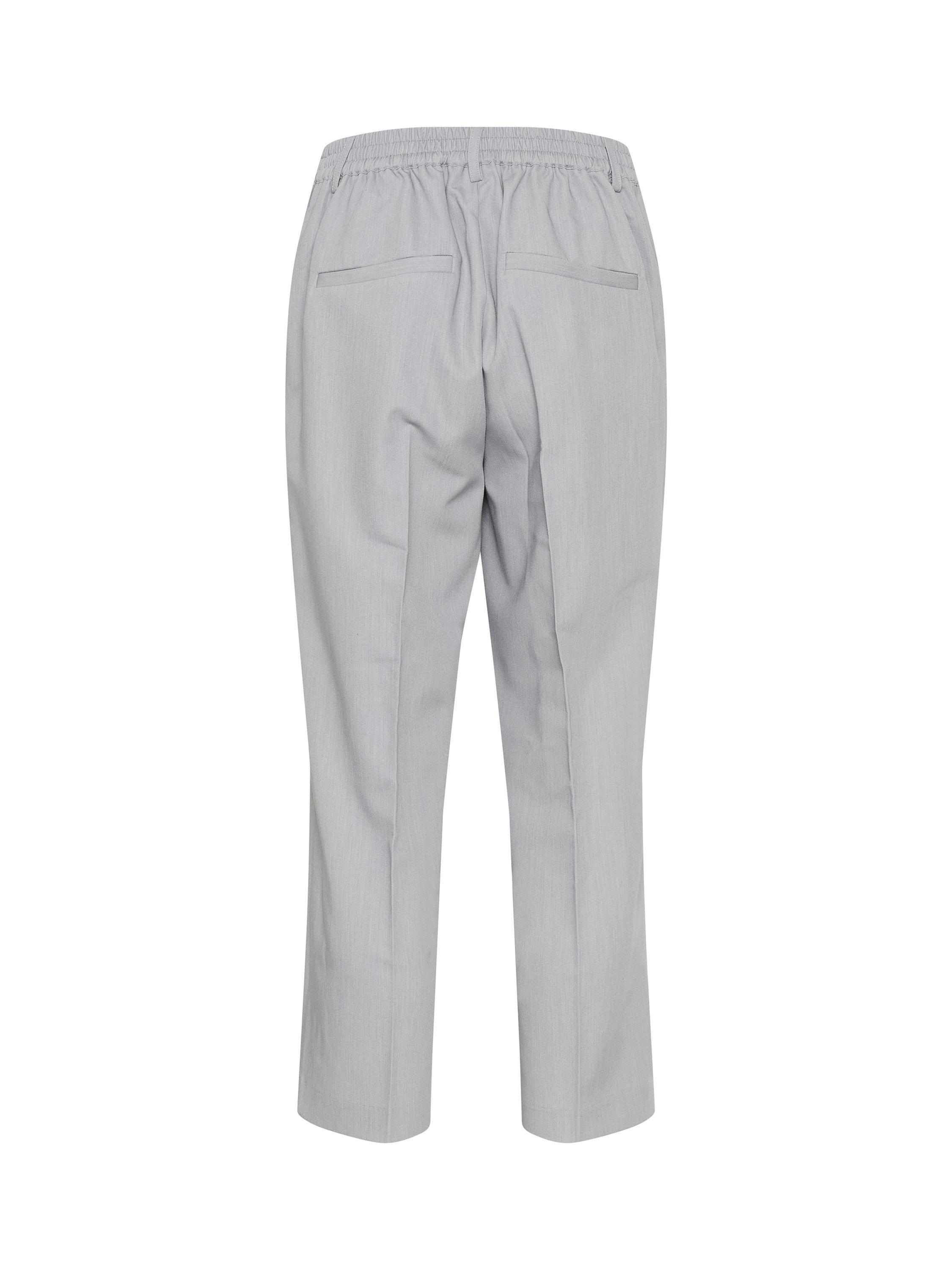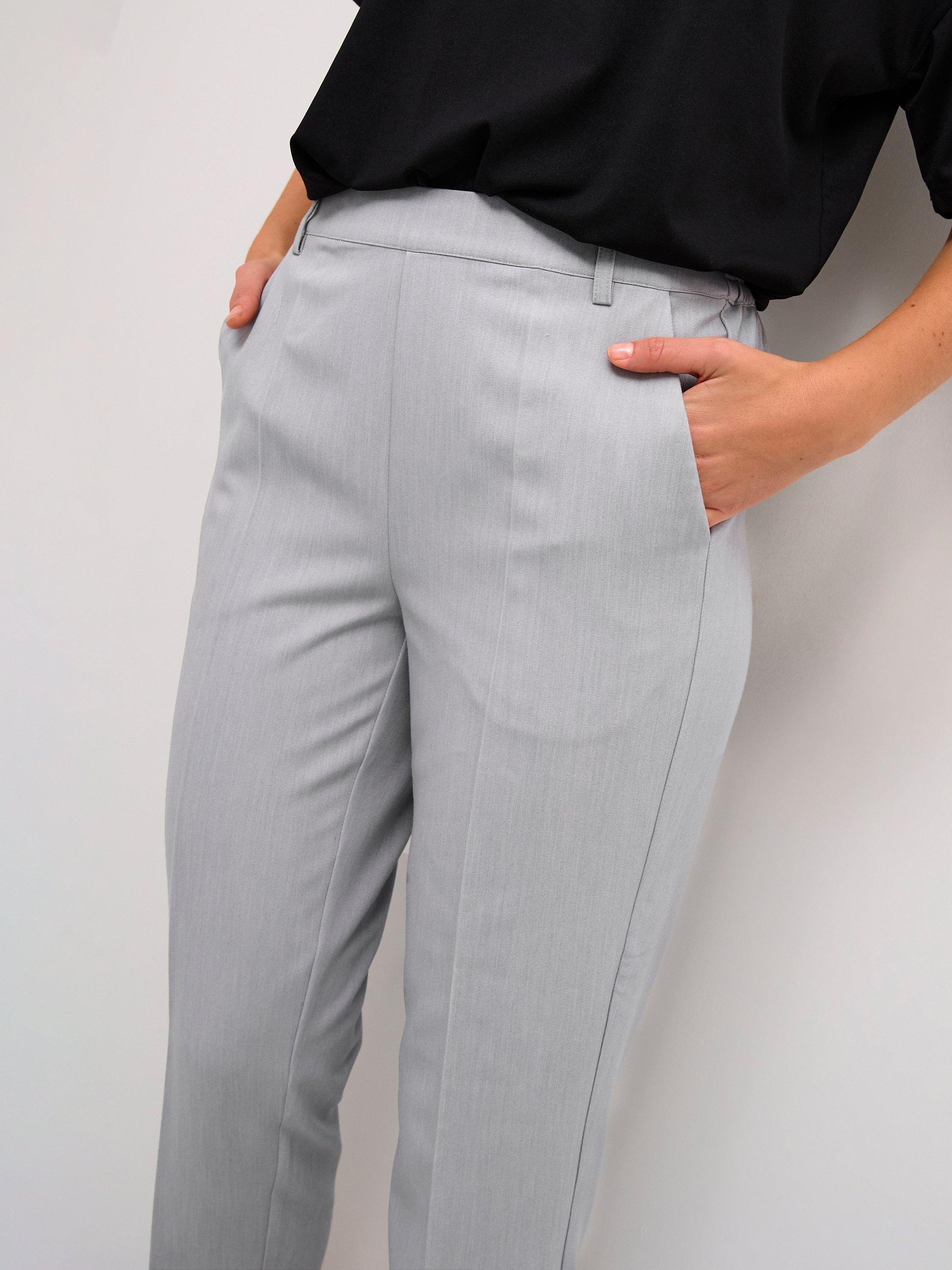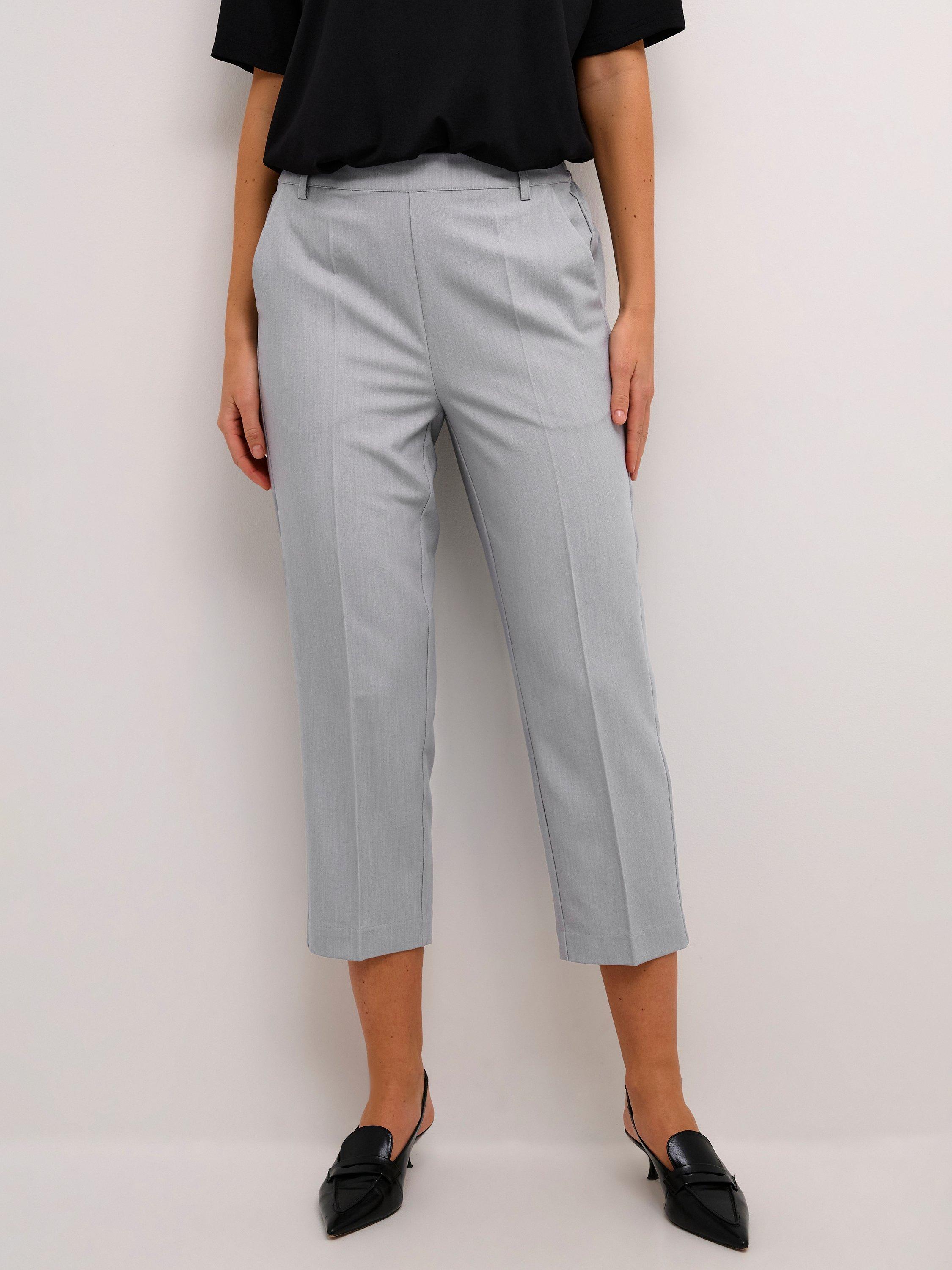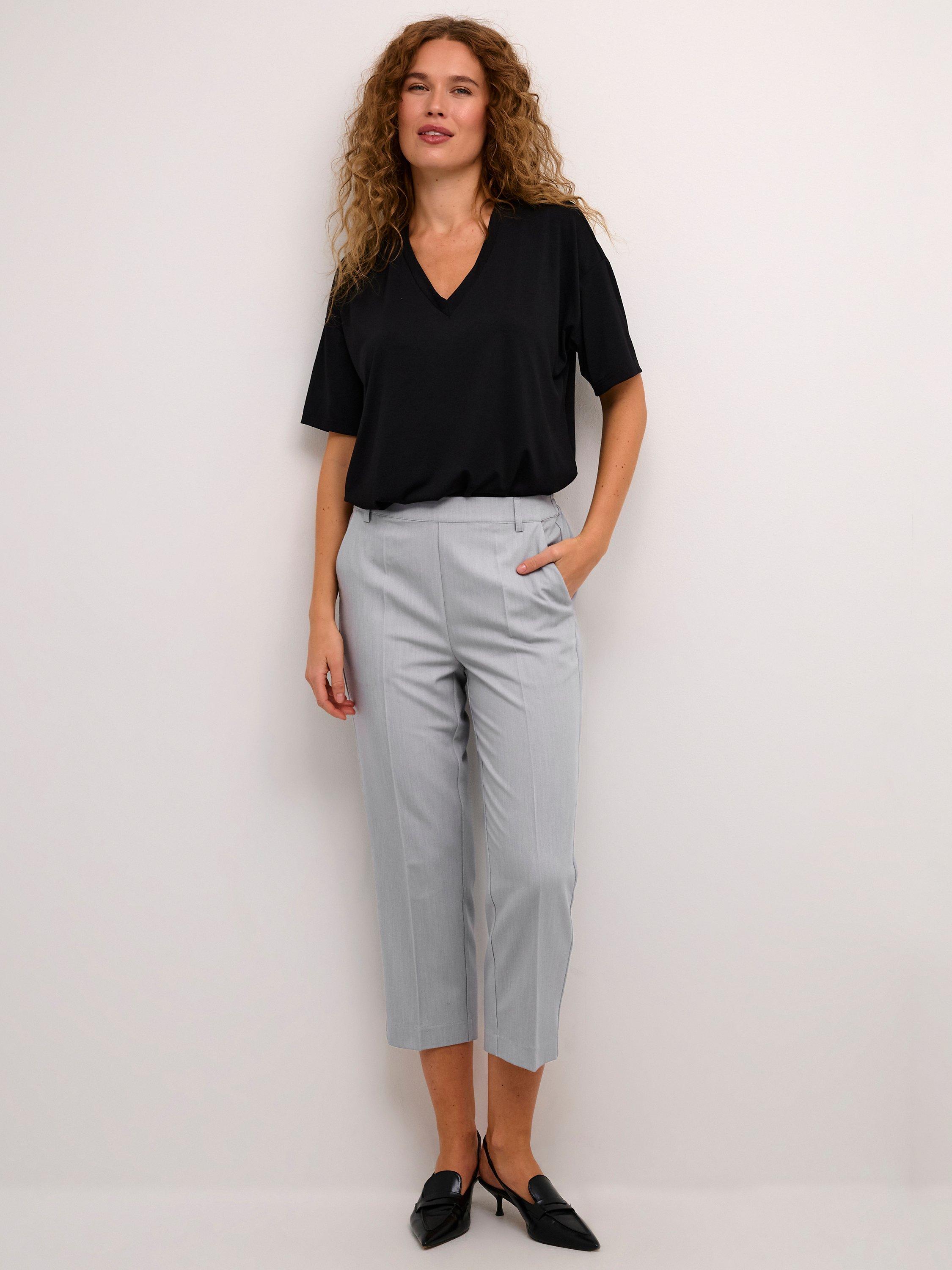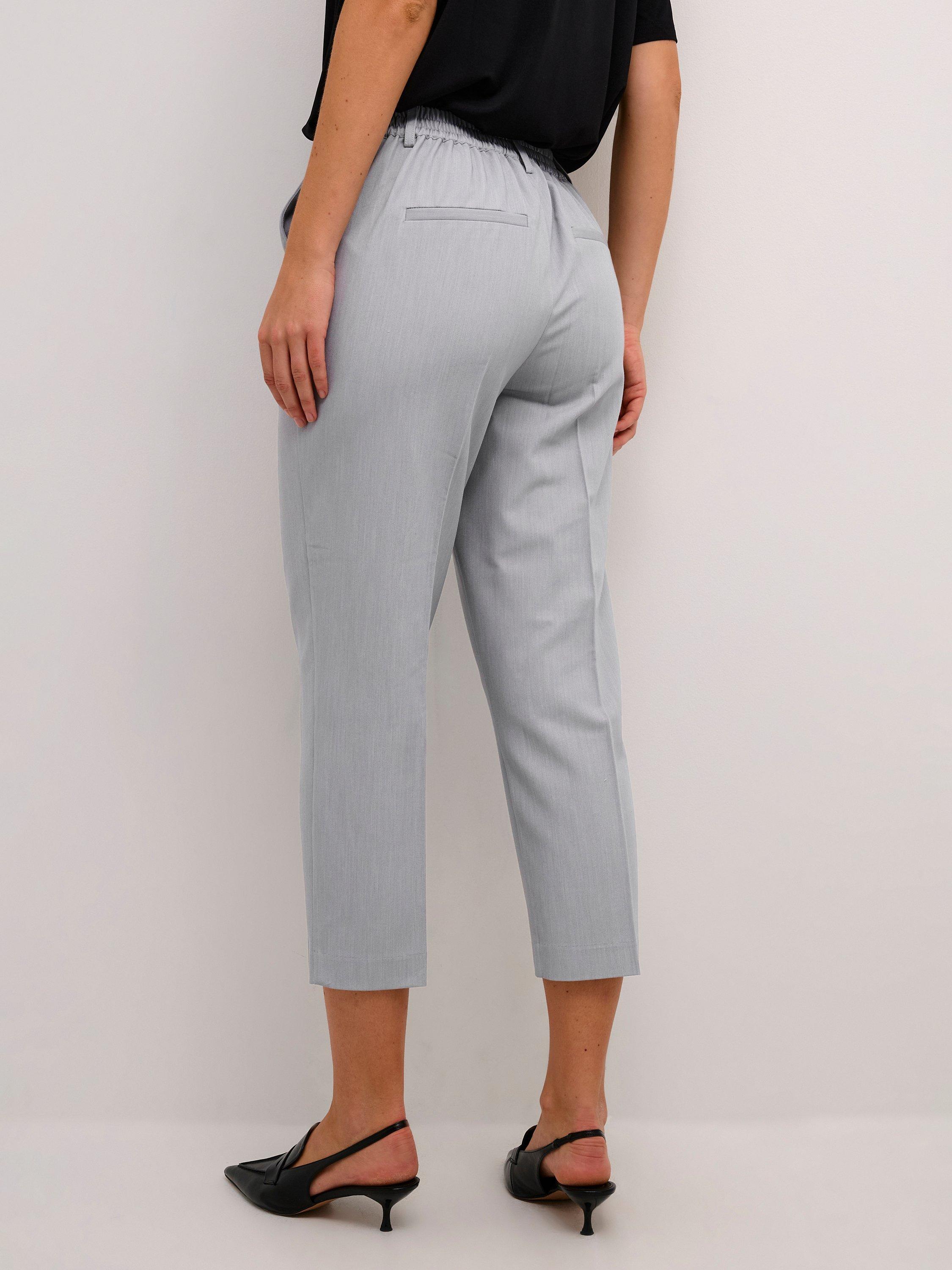 The Sakura trousers are a casual and comfortable pair of suit trousers. They have an elastic waistband with ruchings at the back and a straight waistband at the front. They are cropped right below the calves and have a regular fit. The trousers have seamed side pockets and welted back pockets.