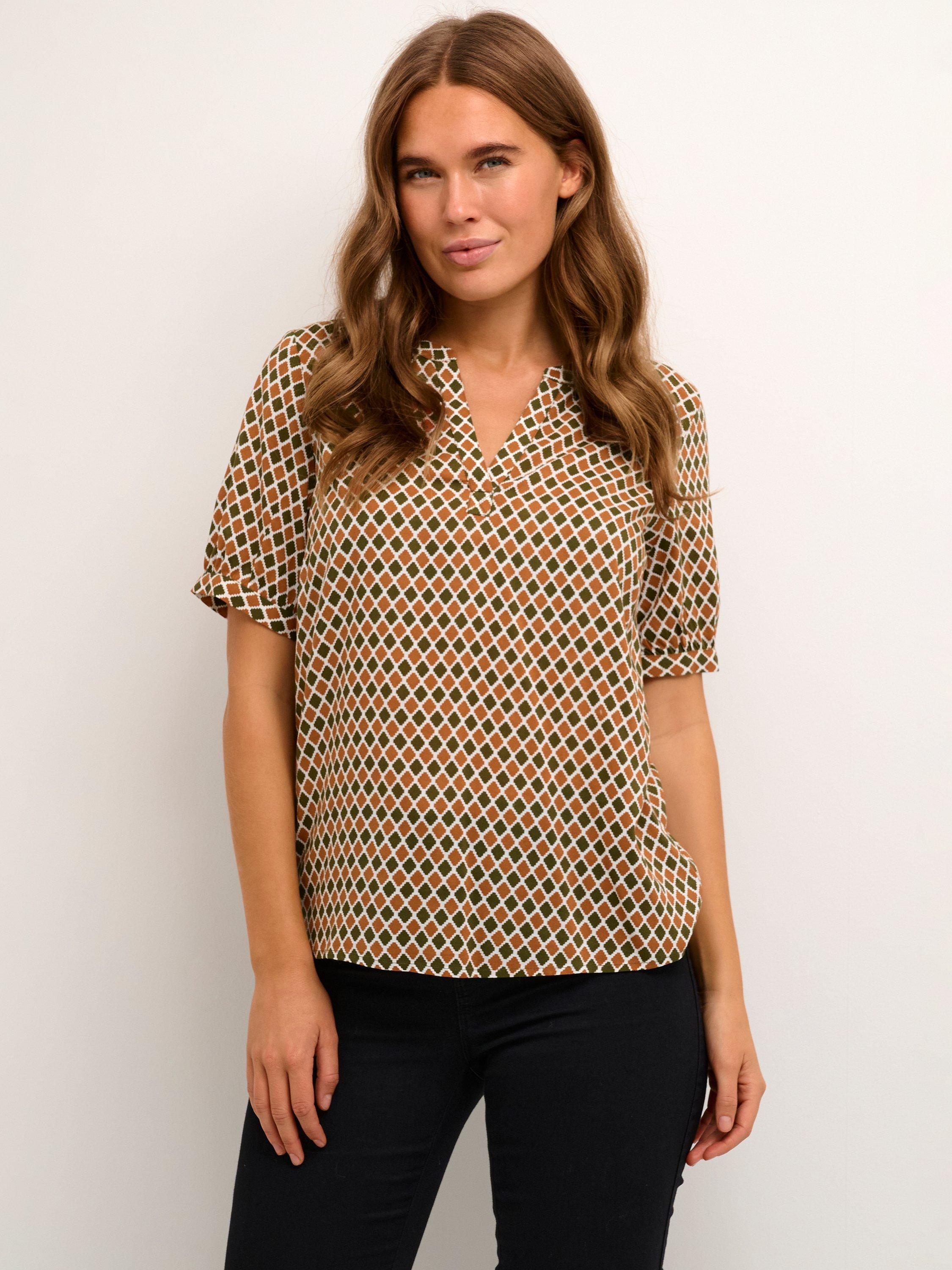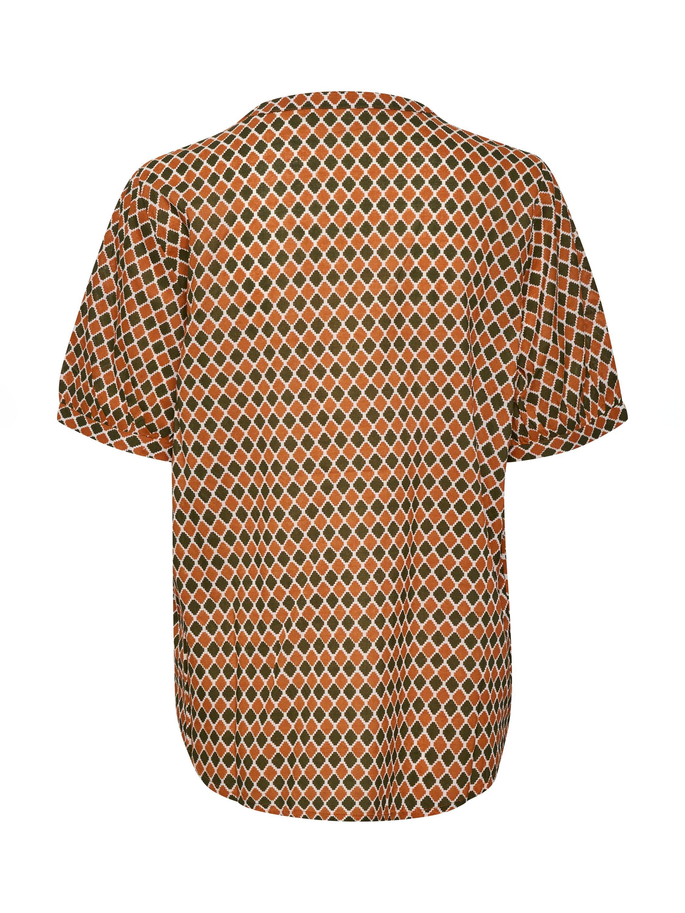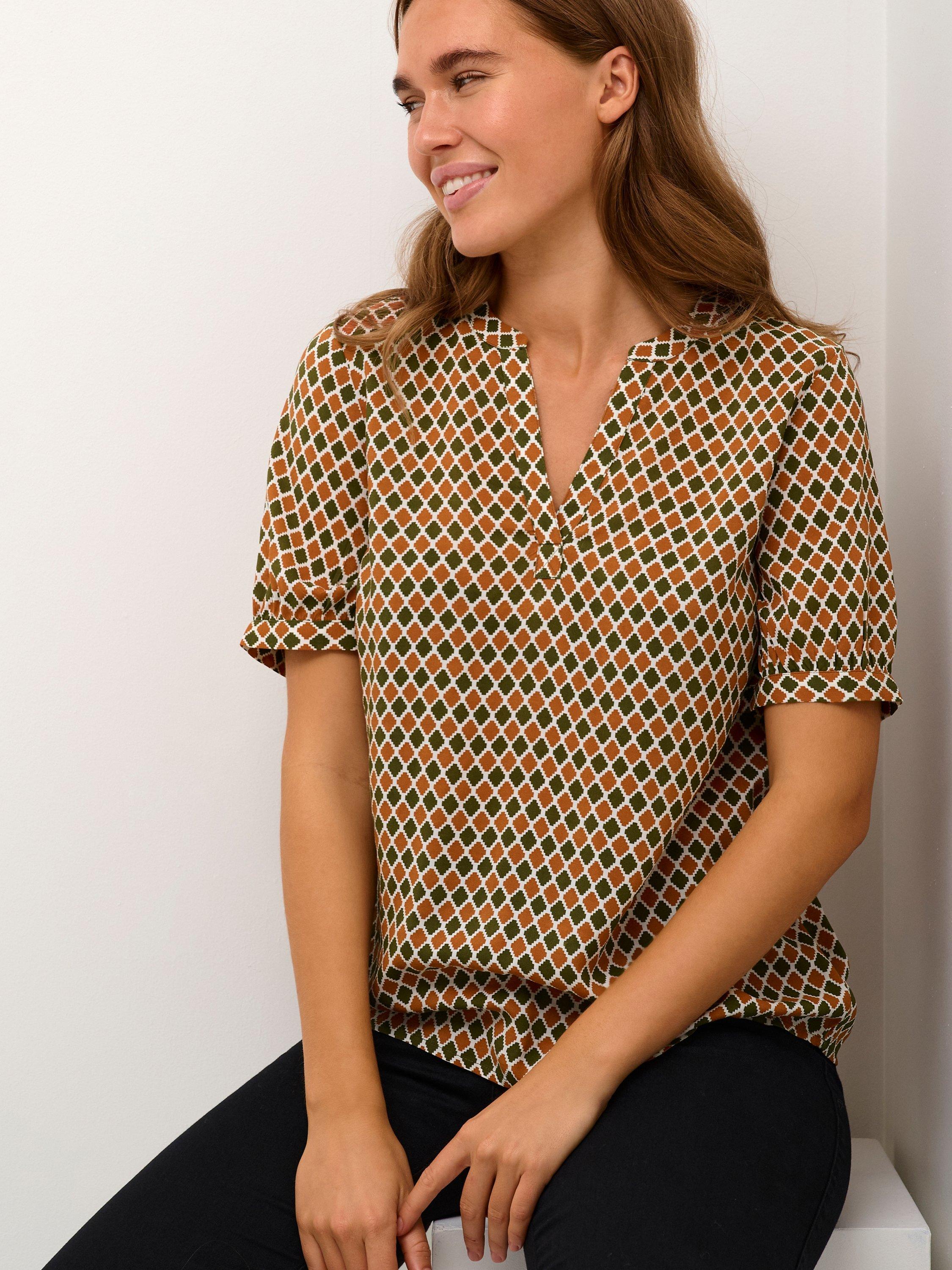 The sally blouse is a great everday top, and it will look amazing with both pants, jeans, and a skirt. It has a V-notch neck with a band collar, and it has a regular fit. The sleeves are short with a wide fit, and the blouse is made in a graphic print and is cut at the hips.
