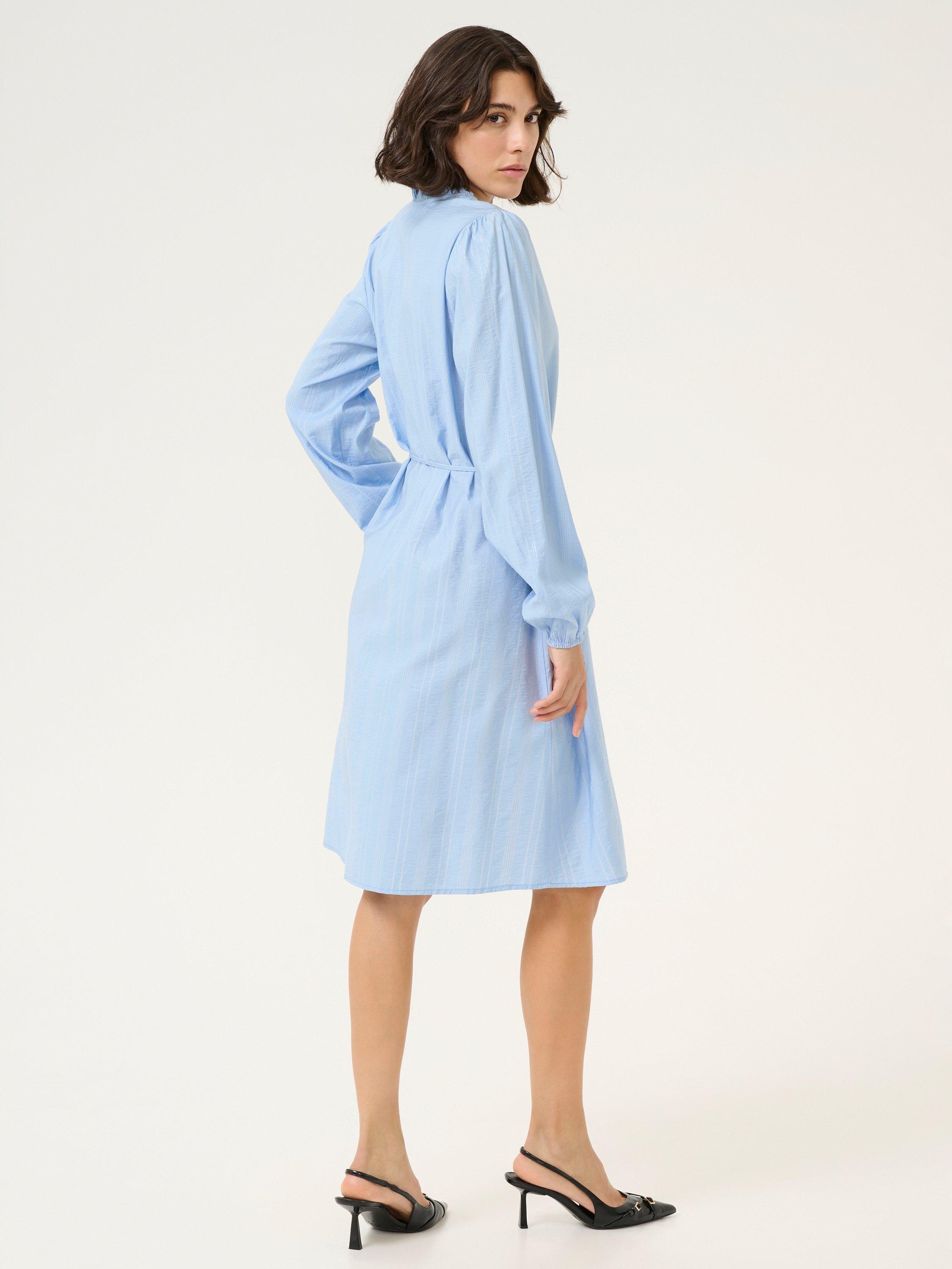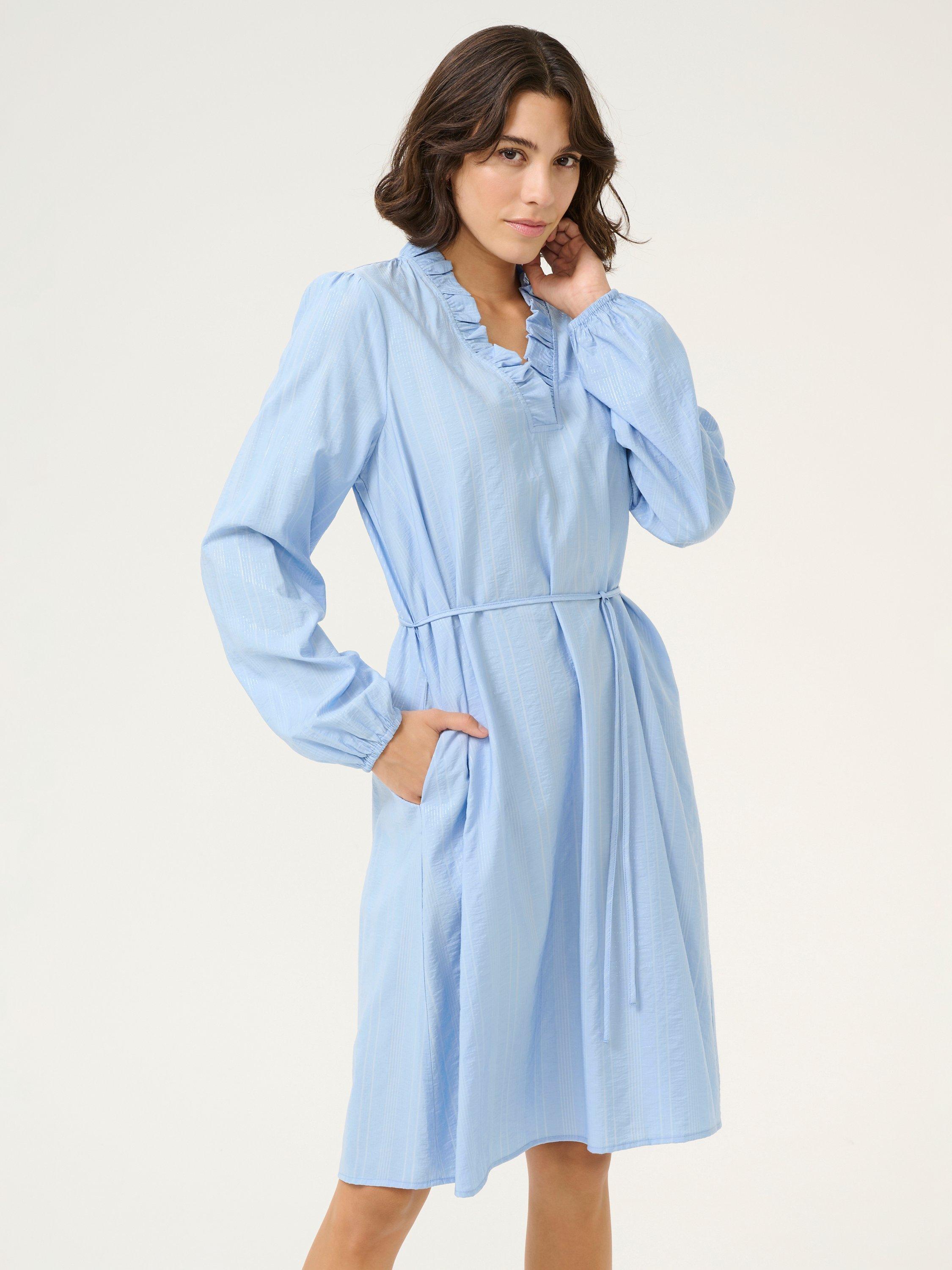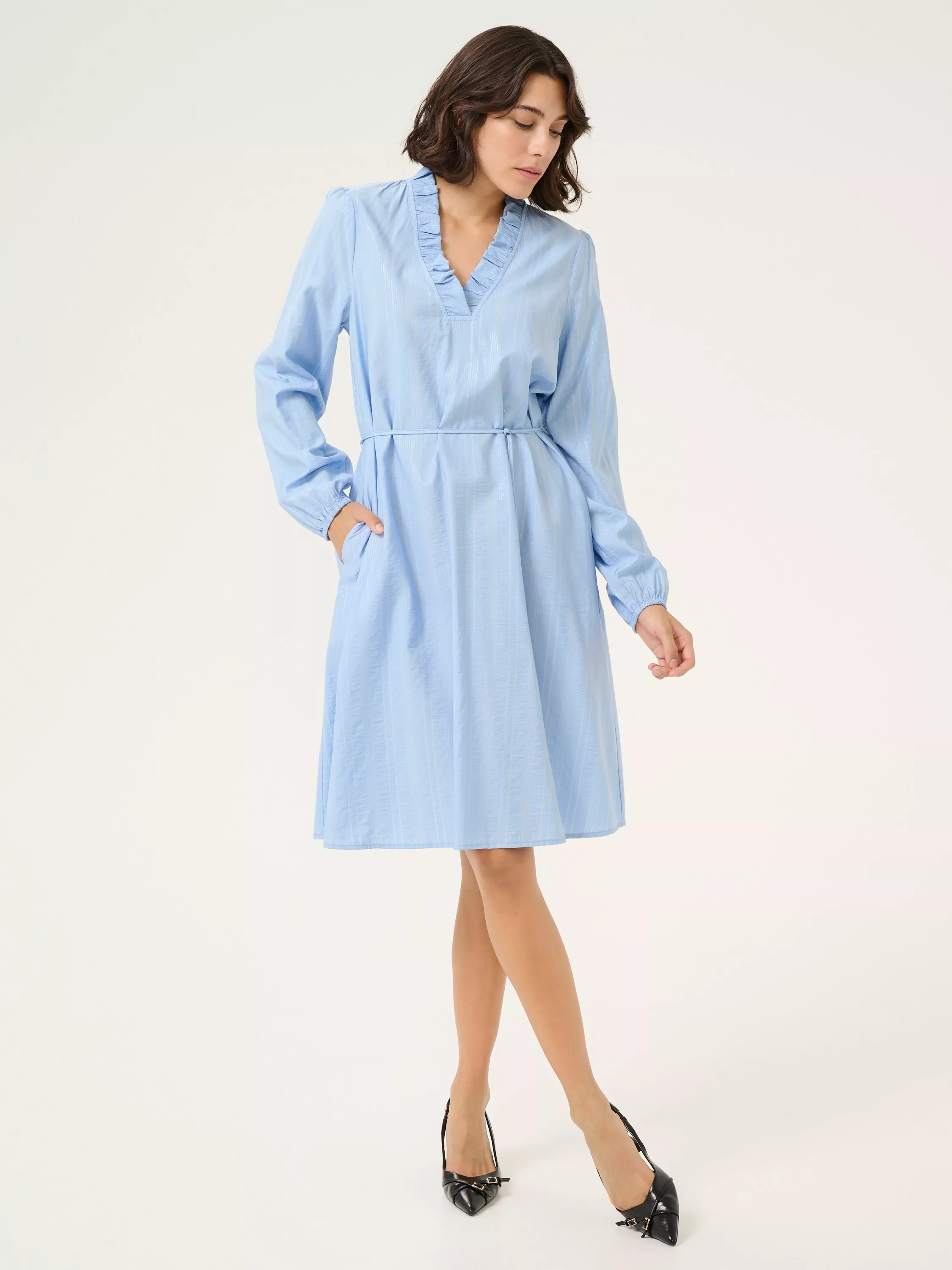 A tried-and-true favourite, this knee length dress from KAFFE features soft chambray hues and a classic A-line silhouette ideal for any occasion. With frilly v-neckline and full-length sleeves, this style is bound to become a key addition to your line-up.